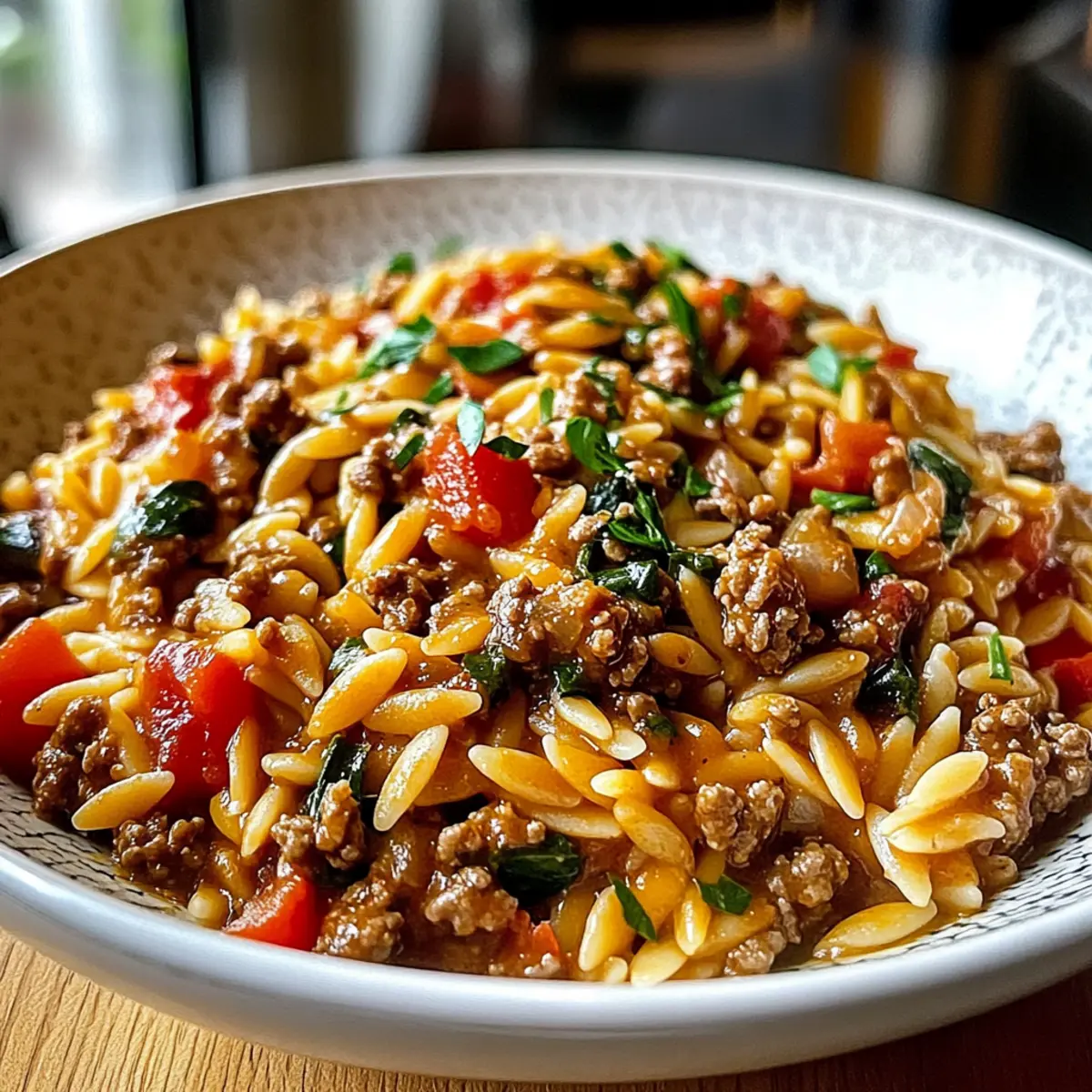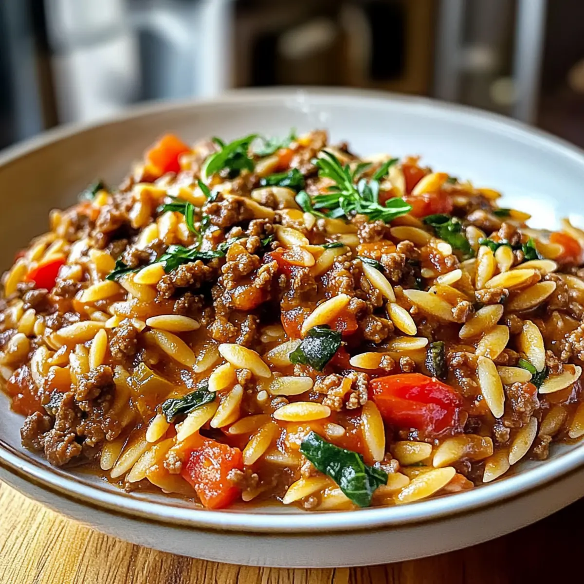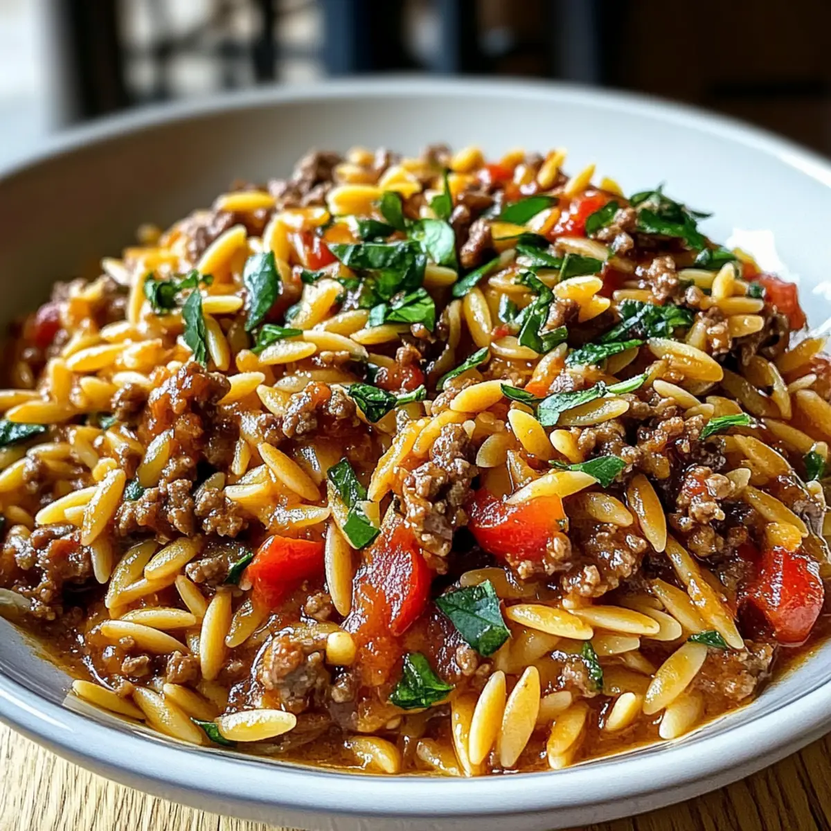 Jump to Recipe Print RecipeThe rich, savory aroma of a Ground Beef Orzo Recipe for Everyone simmering on the stove is like a warm embrace, perfect for those cozy nights in. Imagine tender orzo nestled alongside juicy ground beef and fresh greens, all mingled in a luscious, flavorful sauce. This dish isn’t just the ultimate comfort food; it’s a hassle-free way to bring the family together for a satisfying weeknight meal. With minimal prep needed, you’ll find yourself creating delicious memories rather than cleaning up after takeout. Plus, it’s adaptable—switch out ingredients based on what you have on hand! Who wouldn’t love a recipe that has the power to make even the busiest of weeknights feel special? Ready to dive into the comforting world of ground beef orzo? Let’s get started! Why is Ground Beef Orzo a Must-Try? Comforting Flavor: The unique blend of tender orzo and savory ground beef creates a dish that feels like home. Quick and Easy: With minimal prep and cooking time, this recipe is perfect for busy weeknights when you crave something hearty. Family-Friendly: Even the pickiest eaters will love this meal, making it a crowd-pleaser for everyone at the table. Versatile Ingredients: Feel free to customize with your favorite vegetables or pasta alternatives, just like in a classic Fried Rice dish. Meal Prep Quality: Leftovers store well, making it an excellent choice for meal prepping! You’ll have delicious lunches ready to go. A Taste of Italy: This Ground Beef Orzo recipe channels Italian comfort food, delivering warmth and flavor with every bite. Ground Beef Orzo Ingredients • Dive into this delicious Ground Beef Orzo Recipe for Everyone with the right ingredients! For the Base Ground Beef – Provides protein and savory flavor; substitute with turkey or chicken for a lighter option. Orzo Pasta – Acts as the base, offering a comforting, chewy texture; can be swapped with any small pasta shape if desired. Onion – Adds sweetness and depth; use shallots or leeks for a milder flavor. Garlic – Enhances flavor with its aromatic quality; adjust amount to taste. For the Sauce Canned Diced Tomatoes – Contributes acidity and moisture; fresh tomatoes or tomato sauce can substitute if preferred. Beef Broth – Creates a rich, savory sauce; vegetable broth works for a vegetarian version. For the Greens Fresh Spinach – Adds nutrients and a pop of color; feel free to use other greens like kale or Swiss chard. For Flavoring Italian Seasoning – Provides herby flavors; customize with fresh herbs like basil or oregano for enhanced taste. Step‑by‑Step Instructions for Ground Beef Orzo Recipe for Everyone Step 1: Prep Ingredients Begin by gathering all your ingredients for the Ground Beef Orzo recipe. Dice the onion and mince the garlic, setting them aside. This prep ensures everything is within reach as you cook. Having your ingredients ready will help the cooking process flow smoothly, making it a more enjoyable experience. Step 2: Sauté Aromatics In a large skillet, heat a splash of olive oil over medium heat. Once the oil shimmers, add the chopped onion. Sauté the onion for about 5 minutes or until it becomes translucent and fragrant, stirring occasionally. This step lays the flavorful foundation for the ground beef orzo, filling your kitchen with inviting aromas. Step 3: Brown the Beef Increase the heat slightly and add the ground beef to the skillet. Season it generously with salt and pepper. Cook the beef for 6–8 minutes, breaking it apart with a wooden spoon until it is nicely browned and no longer pink. This browning adds depth and richness to your Ground Beef Orzo recipe. Step 4: Mix in Garlic & Tomatoes Stir in the minced garlic, cooking for about 1 minute until fragrant. Then, add the canned diced tomatoes to the skillet, ensuring to scrape up any browned bits from the bottom. Let this mixture simmer for 2–3 minutes, allowing the flavors to meld together, which enhances the overall taste of the dish. Step 5: Cook Orzo Pour in the orzo pasta along with the beef broth, stirring well to combine. Increase the heat to bring the mixture to a boil. Once boiling, reduce the heat to low and simmer uncovered for 10–12 minutes, or until the orzo is tender but slightly firm to the bite. Stir occasionally to prevent the pasta from sticking, creating a harmonious blend in your Ground Beef Orzo. Step 6: Add Greens & Seasoning With the orzo nearly cooked, fold in the fresh spinach and Italian seasoning. Stir gently for about 1 minute until the spinach wilts and brightens in color. This not only adds a nutritional boost but also vibrant freshness to your dish, making the Ground Beef Orzo recipe a delightful meal for everyone. Step 7: Serve Once fully combined and heated through, remove the skillet from heat. Consider garnishing the dish with freshly grated Parmesan cheese for an extra layer of flavor. Serving your Ground Beef Orzo while it’s warm will ensure a comforting and satisfying experience for you and your family. What to Serve with Delicious Ground Beef Orzo A comforting bowl of orzo pasta creates the perfect opportunity to round out your meal with delightful pairings that tantalize your taste buds. Garlic Bread: The crispy, buttery goodness of garlic bread complements the savory flavors of the orzo, perfect for dipping into saucy remnants. Simple Green Salad: A crisp salad with mixed greens and a light vinaigrette adds refreshing brightness to balance the rich flavors of the dish. Roasted Vegetables: Roasted seasonal veggies bring added texture and color to your meal, enhancing both taste and nutritional value. Grated Parmesan: A sprinkle of freshly grated Parmesan adds an extra layer of richness, harmonizing beautifully with the orzo’s flavors. Red Wine: A glass of medium-bodied red wine, such as Chianti, enriches the Italian essence of this dish and elevates your dining experience. Lemon Sorbet: End your meal with a light lemon sorbet to cleanse the 