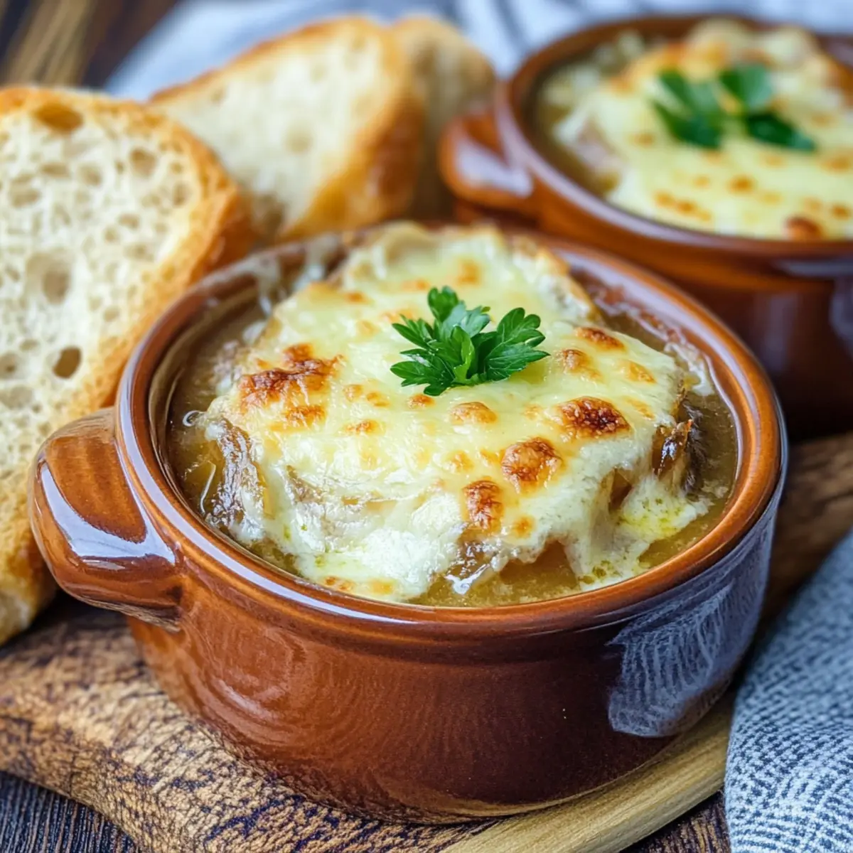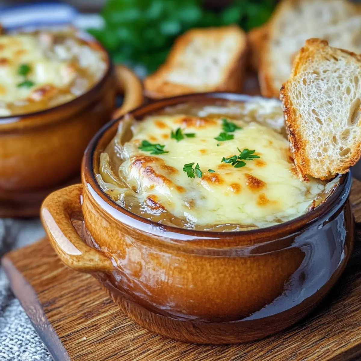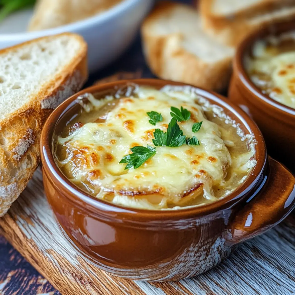 Jump to Recipe Print RecipeAs the aroma of caramelizing onions fills my kitchen, I can’t help but feel transported to a cozy Irish pub, surrounded by laughter and the warm glow of candlelight. This Savory Guinness Onion Soup is the perfect hug in a bowl, featuring deeply caramelized onions bathing in a rich, savory Guinness broth—topped with toasted baguette and bubbling Irish cheese. It’s a delightful comfort food that shines not just during St. Patrick’s Day celebrations but on any chilly evening when you crave something hearty and satisfying. Plus, with a simple switch to vegetable broth, you can easily whip up a nourishing vegetarian version. Ready to discover the magic of this easy-to-make dish? Let’s dive into the recipe! Why is Guinness Onion Soup Irresistible? Comforting, Hearty Dish: This soup is like a warm embrace on a chilly night, blending comforting flavors that evoke memories of Irish pubs. Savory Depth: The combination of caramelized onions and Guinness creates a unique richness that takes traditional onion soup to the next level, making it truly unforgettable. Versatile Options: Easily switch to a vegetarian version by using vegetable broth and omitting Worcestershire sauce. You can still enjoy the delightful taste without sacrificing flavor! Crowd-Pleasing Favorite: Serve this dish at gatherings, and you’ll have guests raving about your culinary skills. Pair it with Blooming Onions Flavor to make it an unforgettable meal. Easy Instructions: With simple steps for caramelizing, simmering, and toasting, this soup is accessible for everyone, whether you’re a seasoned chef or a home cook. A Showstopper Presentation: Topped with bubbly Irish cheese and toasted baguette, your soup will look as delicious as it tastes, making it perfect for impressing family and friends! Guinness Onion Soup Ingredients For the Soup • Olive Oil – Essential for sautéing onions; you can swap with vegetable oil if preferred. • Unsalted Butter – Adds a rich flavor; substitute with additional olive oil for a dairy-free version. • Onions – The heart of this soup, providing sweetness and texture; use yellow or sweet onions for the best flavor. • Salt and Pepper – Key for seasoning; adjust according to your taste preferences. • Garlic – Enhances the soup’s flavor; fresh garlic gives the best aroma. • Irish Whiskey – Adds depth; omit for a non-alcoholic twist. • Guinness – Brings a unique richness to the soup; any stout beer can work as a substitute. • Beef Stock – Forms the soup’s flavorful base; for a vegetarian option, choose vegetable or mushroom broth. • Worcestershire Sauce – Contributes umami; skip for vegetarians, or use a vegan alternative. • Fresh Thyme – Imparts an herbaceous note; dried thyme can be used if fresh isn’t available. • Bay Leaf – For aromatic flavor; just remember to remove it after cooking. For Serving • Baguette – Provides texture and a delicious crunch; any crusty bread is a great alternative. • Irish Cheese (e.g., Dubliner) – Melts deliciously into the soup for that gooey topping; sharp white cheddar makes a fine substitute. • Fresh Parsley or Chives – Optional for a sprinkle of freshness and color before serving. Dive into this Guinness Onion Soup for a comforting delight that will warm your heart and soul! Step‑by‑Step Instructions for Guinness Onion Soup Step 1: Sauté the Onions In a large pot, heat 2 tablespoons of olive oil and 2 tablespoons of unsalted butter over medium-low heat until melted and fragrant. Add 4 thinly sliced onions with a pinch of salt, and stir to coat. Cook slowly for about 45 minutes, stirring occasionally, until the onions turn deeply golden brown and caramelized, releasing a rich sweetness that sets the base for your Guinness Onion Soup. Step 2: Add Garlic Once the onions are beautifully caramelized, stir in 2 cloves of minced garlic. Cook for an additional 30 seconds to 1 minute, allowing the garlic to become fragrant without browning. This step enhances the flavor profile of the soup, adding a delicious depth that pairs perfectly with the sweet onions. Step 3: Deglaze with Whiskey Increase the heat to medium-high and pour in 1/4 cup of Irish whiskey. Use a wooden spoon to scrape the bottom of the pot, deglazing it to unlock any caramelized bits. Cook for about 2 minutes, allowing the alcohol to reduce and infuse a complex flavor into your Guinness Onion Soup. Step 4: Simmer with Guinness Pour in 4 cups of Guinness, stirring to combine all the flavors. Allow the mixture to come to a gentle simmer, and let it reduce by half over approximately 10 minutes. The liquid should thicken and become rich, building the wonderful depth characteristic of this comforting Guinness Onion Soup. Step 5: Add Stock and Season Next, add 4 cups of beef stock, 1 tablespoon of Worcestershire sauce, a few sprigs of fresh thyme, and 1 bay leaf to the pot. Season the mixture with salt and pepper to taste. Bring the soup to a boil, then reduce the heat and let it simmer gently for 30 minutes, allowing the flavors to meld beautifully. Step 6: Prepare the Baguette While the soup is simmering, slice a baguette into thick pieces and place them on a baking sheet. Toast the baguette slices under the broiler for about 2-3 minutes until they turn golden brown and crispy. This step adds a delightful crunch to your serving of Guinness Onion Soup. Step 7: Assemble and Broil Ladle the hot soup into broiler-safe bowls and top each with a toasted baguette slice. Generously sprinkle shredded Irish cheese (like Dubliner) over the bread to create a gooey topping. Place the bowls under the broiler for 2-3 minutes, or until the cheese is melted and bubbly, forming a decadent crust on top. Step 8: Garnish and Serve Once your Guinness Onion Soup is ready, carefully remove the bowls from the broiler. If desired, garnish each serving with a sprinkle of fresh parsley or chives for a splash of color. Serve immediately 