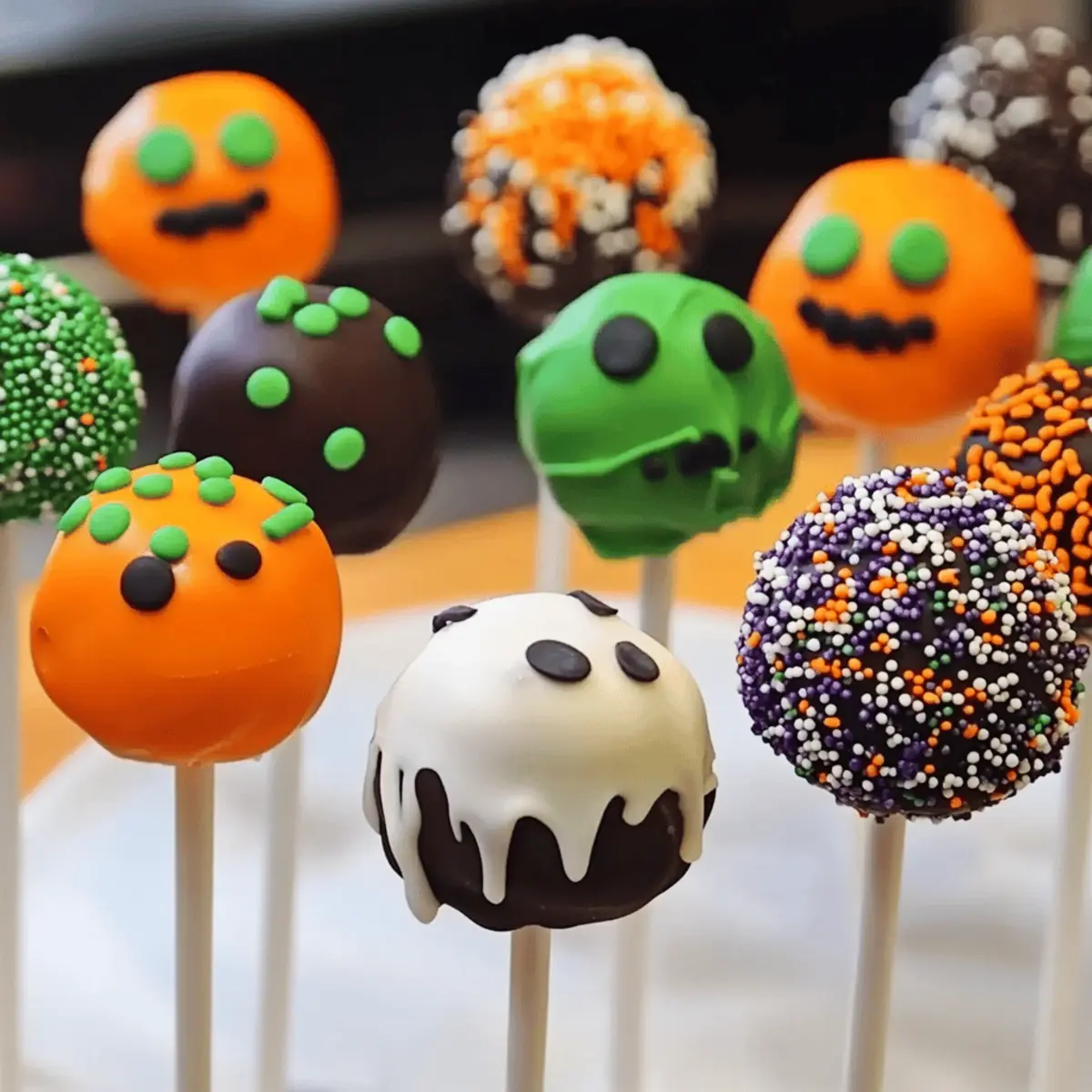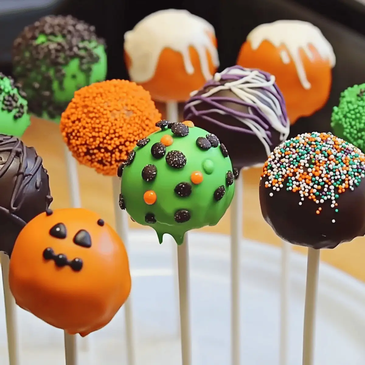 Jump to Recipe Print RecipeA whiff of sweet nostalgia tends to waft through the kitchen as Halloween approaches. That’s when I find myself craving Halloween Cake Pops, a delightful blend of creativity and flavor that brings joy to both kids and adults alike. These easy-to-make, customizable treats transform any gathering into a festive celebration, showcasing your inner pastry artist. With just a few simple ingredients, you can create an array of spooky designs, from adorable pumpkins to crafty mummies. They not only promise a quick prep time but also spark togetherness as friends and family gather to decorate. Are you ready to dive into the world of these whimsical bites and add some magic to your Halloween festivities? Why Are Halloween Cake Pops So Fun? Sweet nostalgia: Halloween Cake Pops evoke childhood memories, making them a delightful treat for all ages. Endless creativity: The customizable designs inspire fun family activities, turning your kitchen into a festive workshop. Quick & easy: With straightforward steps, you can whip up these treats in no time, perfect for busy schedules. Crowd-pleaser: Their unique appearance and delicious taste guarantee smiles at any Halloween gathering. Flexible flavors: Enjoy options like chocolate or vanilla, and even adapt them for dietary needs using gluten-free and dairy-free substitutes. Dive into a world of spooky fun with your Halloween Cake Pops! Halloween Cake Pops Ingredients For the Cake Mix • Cake Mix – Choose a flavor that suits your taste; gluten-free options are available for a gluten-free twist. • Frosting – Use store-bought or homemade frosting to bind the cake crumbs together and add sweetness; non-dairy frosting is a great substitute for dairy-free versions. For the Coating • Candy Melts – Colorful candy melts will give your Halloween Cake Pops a festive look; consider dark chocolate for a healthier take. • Lollipop Sticks – Essential for transforming cake balls into adorable cake pops that are easy to hold. For the Decorations • Sprinkles or Candy Eyes – Use fun decorations to enhance your spooky designs; this is where your creativity truly shines! • Chocolate Chips – Perfect for adding detail to your Halloween characters, especially mummies and Frankenstein. • Edible Glitter (optional) – A sprinkle of edible glitter can add an enchanting touch to your treats, making them even more festive. Step‑by‑Step Instructions for Halloween Cake Pops Step 1: Prepare the Cake Mix Begin by preheating your oven to the temperature indicated on the cake mix package, typically around 350°F (175°C). In a mixing bowl, prepare the cake mix according to the package instructions, mixing well until smooth. Pour the batter into a greased cake pan and bake for 25-30 minutes, or until a toothpick inserted in the center comes out clean. Once baked, let the cake cool completely on a wire rack. Step 2: Crumble the Cake Once cooled, gently remove the cake from the pan and crumble it into fine crumbs in a large mixing bowl. Use your hands or a fork to break it apart until it reaches a grainy consistency. This crumbling step is essential, as it will help form the base of your Halloween Cake Pops. Make sure there are no large chunks left for an even texture. Step 3: Mix in the Frosting Now, incorporate frosting into the crumbled cake mixture. Start with a few tablespoons, mixing it in gently with your hands until a dough-like consistency forms. The mixture should be moist enough to hold together without being overly sticky. If needed, adjust the amount of frosting, but avoid overmixing, as it can make the cake pops too dense for the perfect bite. Step 4: Shape the Cake Balls With the cake mixture ready, take small portions and roll them into approximately 1-inch balls. Place the rolled cake balls on a tray lined with parchment paper or a silicone mat. This will prevent sticking and make it easier to handle them later. Leave some space between each ball, as they will slightly expand when coated. Step 5: Melt Candy Melts In a microwave-safe bowl, melt candy melts in your choice of colors according to package instructions, usually in 30-second intervals on medium heat. Stir between each interval until the candy melts are smooth and fully melted without lumps. Choose festive colors like orange, green, and purple to accent your Halloween Cake Pops and make them visually appealing. Step 6: Insert Lollipop Sticks To prepare for coating, dip the tip of each lollipop stick into the melted candy melts, then gently insert it into the center of each cake ball, about halfway in. This helps the stick adhere better to the cake pop and prevents it from falling off later. Make sure to insert sticks into all the cake balls before moving on to coating them. Step 7: Coat the Cake Pops Fully dip each cake ball into the melted candy melts, ensuring they are completely covered. Use a spoon to help coat the sides and tap gently on the stick to shake off any excess candy. Place the coated cake pops upright in a styrofoam block or a cup to allow them to set without touching anything. Refrigerate for about 30 minutes to ensure the coating hardens well. Step 8: Add Decorations Once the candy coating has set, it’s time to get creative with your Halloween Cake Pops. Decorate them with sprinkles, candy eyes, or melted chocolate chips. Use a drizzle of melted chocolate for details like mummy bandages or facial features for Frankenstein. Get imaginative with your designs, turning them into adorable Halloween characters. Step 9: Serve and Enjoy Allow the decorated cake pops to harden completely at room temperature or in the fridge. Once set, they are ready to be served and enjoyed! These delightful Halloween Cake Pops are perfect for parties, gatherings, or just a fun time in the kitchen, bringing a smile to everyone who sees—and tastes—their spooky charm! Storage Tips for Halloween Cake Pops Room Temperature: Store your Halloween Cake Pops in an airti