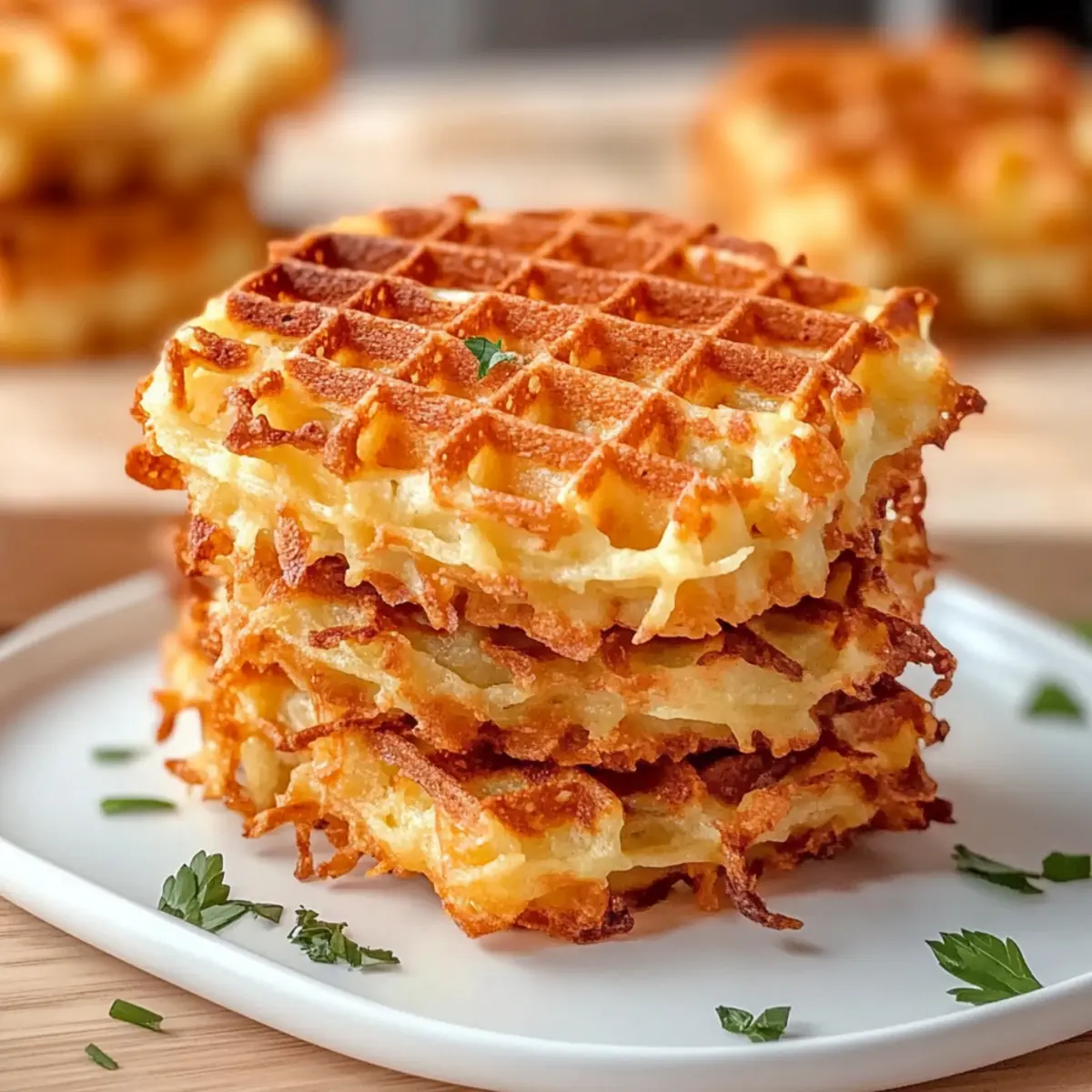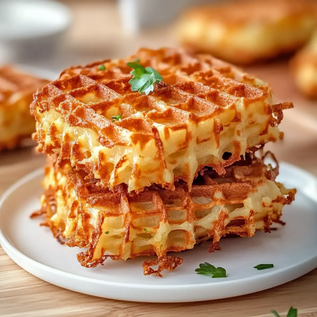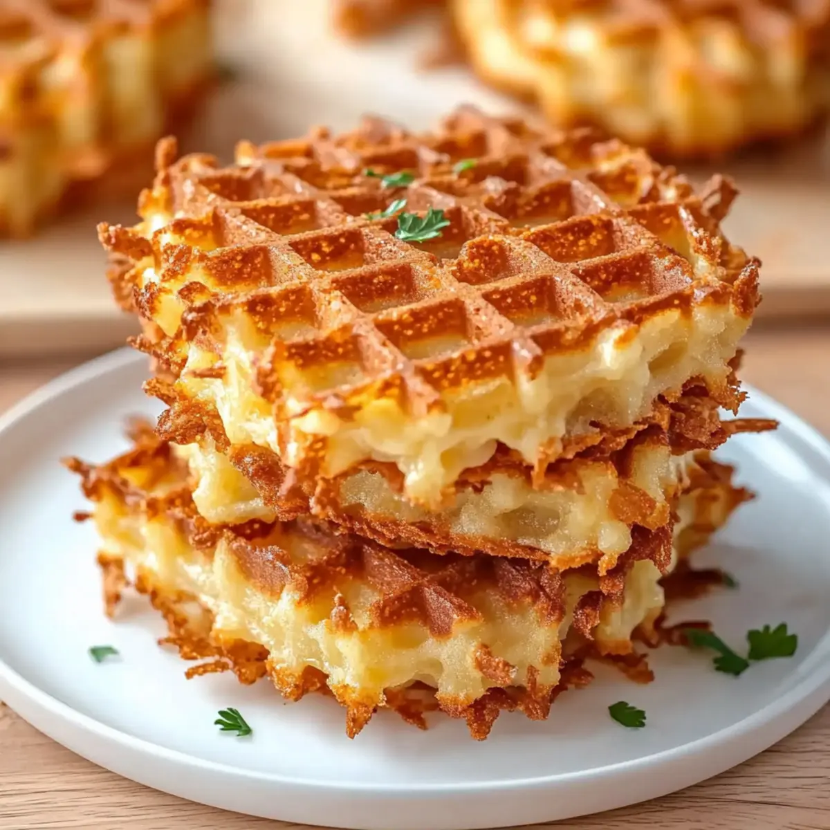 Jump to Recipe Print RecipeThere I was, staring into my fridge, battling the temptation to reach for yet another pre-packaged meal when inspiration struck. What if I could create a delicious breakfast that turned the mundane into magic? Enter the crispy Healthy Hashbrown Chaffles! This recipe transforms classic hashbrowns into a delightful, gluten-free treat that’s not only quick to whip up but also perfect for meal prepping. With every bite, you’ll savor the cheesy goodness and the satisfying crunch that comes from using either store-bought or homemade shredded hash browns. Whether you’re hunting for a low-carb option or simply want to impress brunch guests, this dish is sure to become your new go-to. Ready to learn how to make these crispy beauties? Let’s dive in! Why choose Healthy Hashbrown Chaffles? Deliciously Unique: These chaffles offer a delightful twist on a breakfast favorite, allowing you to enjoy the satisfying crunch of hashbrowns in a waffle form. Gluten-Free and Low-Carb: Perfect for those seeking a healthier option without sacrificing flavor—these chaffles fit seamlessly into your meal prep routine. Quick and Easy: With minimal prep and just a few ingredients, you can whip up these beauties in no time, making them perfect for busy mornings. Versatile Toppings: Dress them up with your favorite toppings—whether it’s avocado, a fried egg, or healthy ingredients—these chaffles work with anything! Perfect for Meal Prep: Store leftovers for a quick and delicious breakfast option during the week; they reheat perfectly! Try serving them alongside a light salad or crispy bacon for a balanced meal. For more healthy ideas, check out Healthy Mozzarella Sticks or Greek Chicken Burgers. Healthy Hashbrown Chaffle Ingredients • For the Chaffle Mixture Shredded Hash Browns – Choose between frozen (thawed) or freshly grated Russet potatoes for the best texture. Shredded Cheese – Opt for sharp varieties for enhanced flavor that ties the chaffle together. Seasoned Salt – Use this for an extra flavor kick; regular salt or your favorite blend works too. • For Cooking Cooking Spray or Oil – Essential to prevent sticking in the waffle iron and ensure easy removal of your healthy hashbrown chaffles. Step‑by‑Step Instructions for Healthy Hashbrown Chaffle Step 1: Preheat the Waffle Iron Begin by preheating your waffle iron to medium-high heat. Wait until the indicator light signals that it’s fully heated, usually taking about 5 minutes. This step is crucial for getting that lovely crispy texture on your Healthy Hashbrown Chaffles, so make sure it’s nice and hot before proceeding! Step 2: Prepare the Hash Browns If you’re using fresh potatoes, grate them using a box grater or food processor, and then make sure to thoroughly squeeze out their moisture with a clean kitchen towel. If opting for frozen hash browns, simply thaw them and pat dry. Ensuring your hash browns are dry is key to avoiding sogginess in your chaffles. Step 3: Mix Ingredients In a mixing bowl, combine your prepared hash browns, shredded cheese, and seasoned salt. Use a fork to mix them until everything is evenly distributed. This step allows the flavors to blend beautifully, creating a deliciously cheesy base for your Healthy Hashbrown Chaffle. Step 4: Prepare the Waffle Iron With your mixture ready, lightly spray or brush both waffle plates of the preheated waffle iron with cooking spray or a thin layer of oil. This will prevent your chaffles from sticking and make for a smooth release once they’re cooked. Step 5: Add the Mixture Scoop about 1 cup (or roughly 1/2 cup per individual chaffle) of the hash brown mixture and place it in the center of the waffle iron. Close the lid gently, making sure it’s not overfilled, which helps maintain the chaffle’s shape as it cooks and crisps up. Step 6: Cook Allow the chaffles to cook until golden brown and crispy. This typically takes about 4-6 minutes. You’ll know they’re ready when the steam diminishes, but for extra crispiness, wait an additional 30-45 seconds before opening the iron. Keep an eye on them to avoid overcooking! Step 7: Serve Immediately Once cooked, carefully remove the Healthy Hashbrown Chaffles from the waffle iron and place them on a wire rack if not serving immediately. This will prevent them from becoming soggy. Serve them hot with your favorite toppings or alongside bacon or a fresh salad for a complete meal! Storage Tips for Healthy Hashbrown Chaffles Fridge: Store cooked healthy hashbrown chaffles in an airtight container in the fridge for up to 3 days. To maintain their crispiness, add paper towels to absorb excess moisture. Freezer: For long-term storage, freeze chaffles in a single layer separated by parchment paper for up to 2 months. This prevents them from sticking together, so they are easy to grab anytime. Reheating: Reheat in a toaster oven or air fryer at 350°F (175°C) for about 5-7 minutes until crispy again. Avoid microwaving, as it can make them soggy. Make-Ahead: Feel free to prepare the mixture in advance; keep it in the fridge for up to 24 hours before cooking. Enjoy the convenience of meal prep with these delightful healthy hashbrown chaffles! What to Serve with Crispy Healthy Hashbrown Chaffles Elevate your breakfast experience by pairing these delightful chaffles with irresistible sides that create a balanced meal. Crispy Bacon: The savory crunch of bacon complements the chaffles’ texture, adding a smoky flavor that takes breakfast to the next level. Enjoy the contrast between crispy and fluffy! Fresh Fruit Salad: A medley of seasonal fruits adds a refreshing touch, balancing the richness of the chaffles while providing essential vitamins. The bright colors are a feast for the eyes! Avocado Toast: Creamy avocado spread on whole-grain bread brings a nutritious, buttery flavor, enhancing the dish while contributing healthy fats for energy. It’s a delightful pairing! Scrambled Eggs: Fluffy, butte
