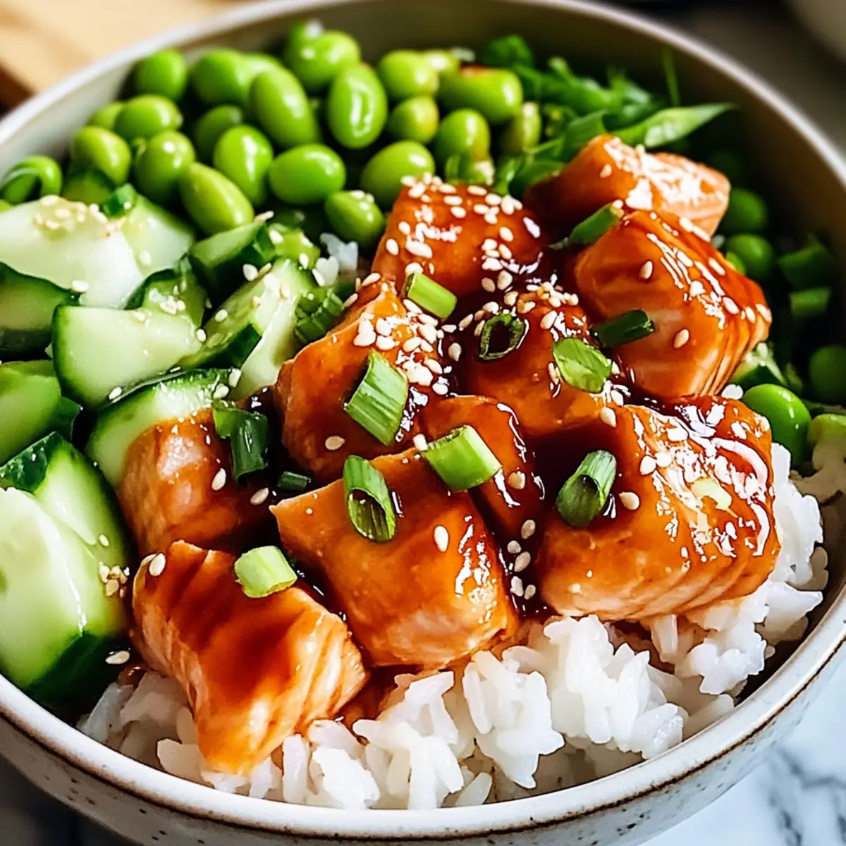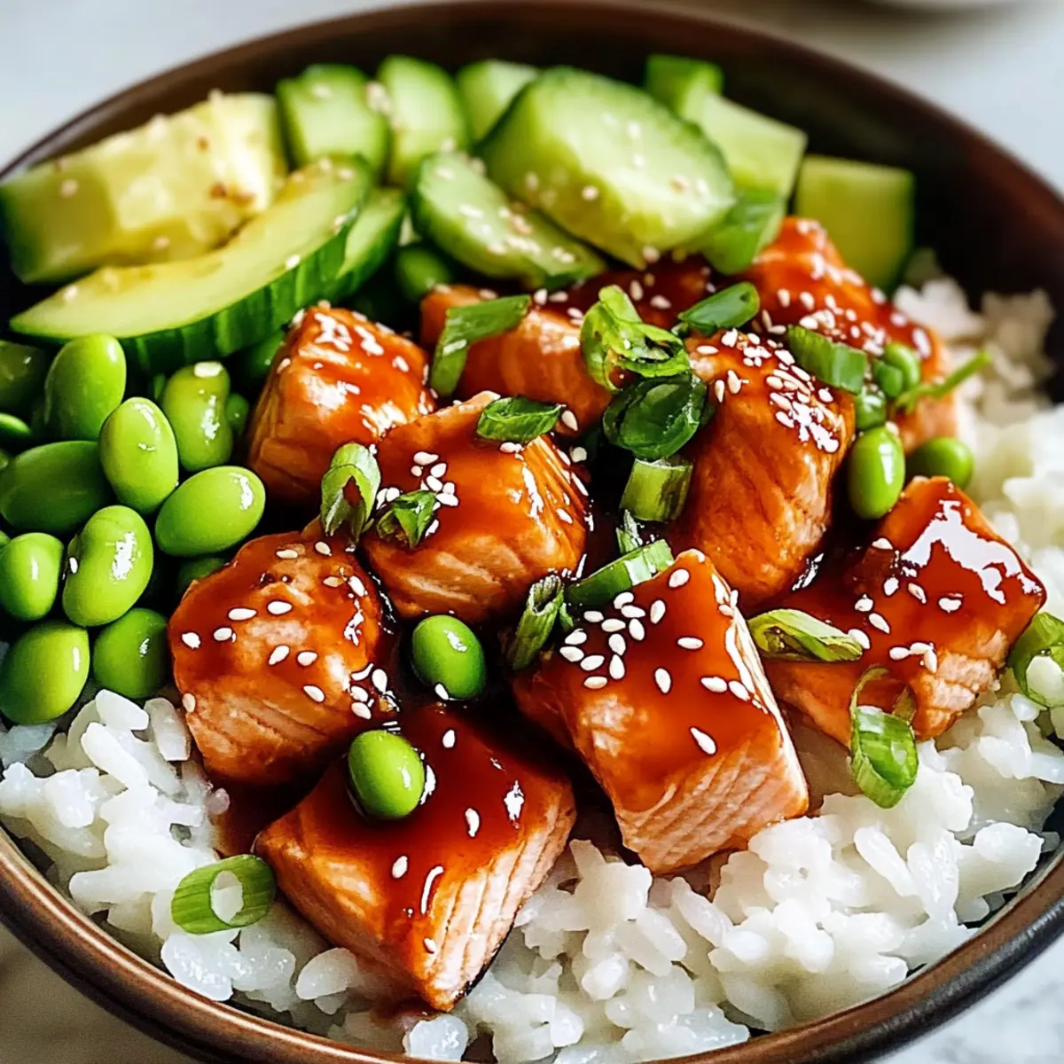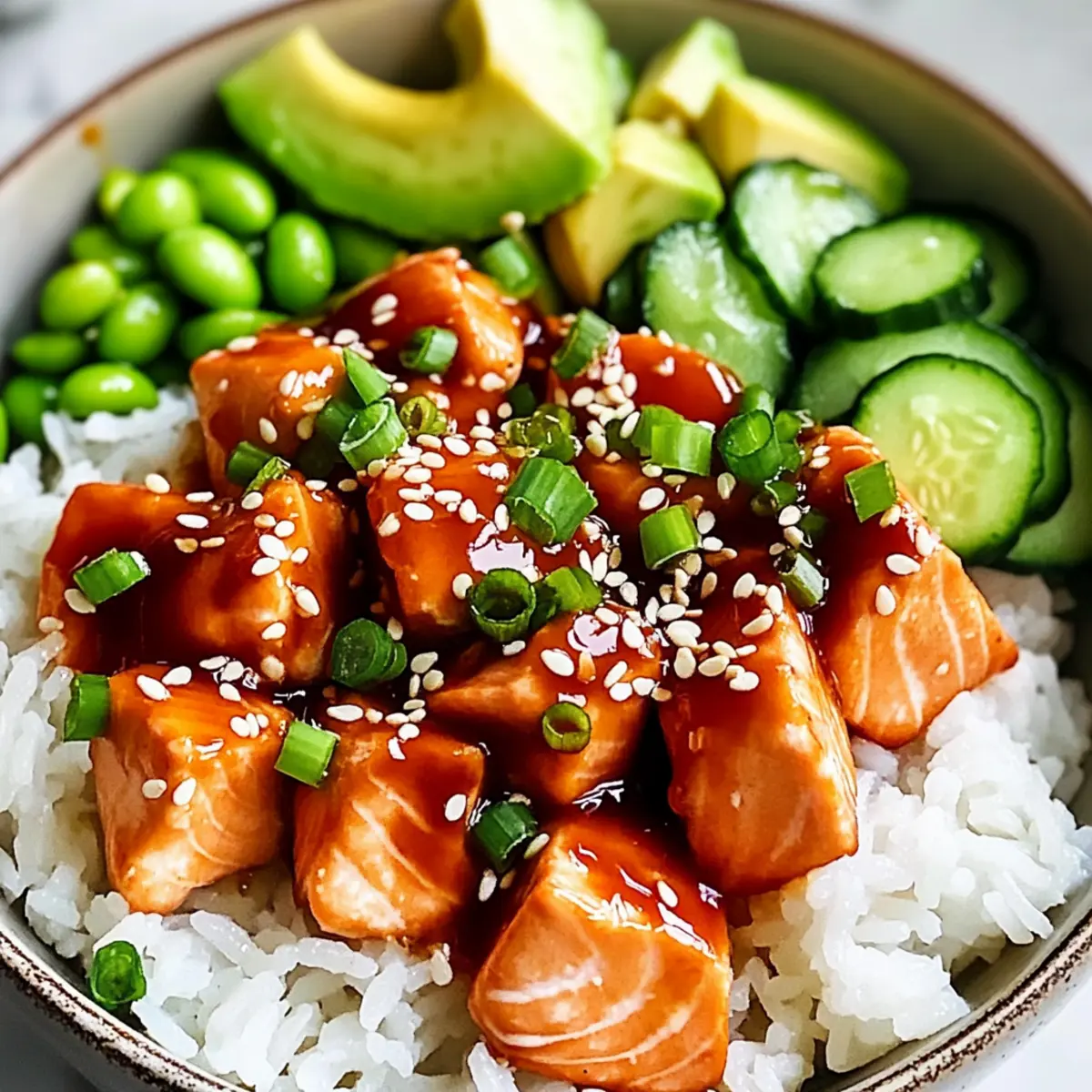 Jump to Recipe Print RecipeAs I stood in my kitchen, the scent of honey and sriracha filling the air, I couldn’t help but feel a rush of excitement. These Honey Sriracha Salmon Bowls are my go-to solution when I crave a quick dinner that doesn’t compromise on flavor or health. In just under 30 minutes, this beginner-friendly recipe transforms flaky salmon, glazed in a sweet and spicy sauce, into a mouthwatering meal, all served on perfectly fluffy rice. What I love most about this dish is its incredible versatility—swap the salmon for chicken or tofu, tweak the spice level, or throw in your favorite veggies! It’s an easy, customizable feast that’s sure to impress at the dinner table. Ready to elevate your weeknight meals with a delightful twist? Let’s dive into these vibrant bowls and make some magic happen in your kitchen! Why Choose Honey Sriracha Salmon Bowls? Quick and Easy: This recipe is perfect for busy weeknights, requiring just 30 minutes from start to finish. Customizable Ingredients: Switch up the protein or add seasonal vegetables—it’s all about your personal taste! Deliciously Balanced: The blend of sweet honey and spicy sriracha creates a flavor explosion that tantalizes the taste buds. Beginner-Friendly: Great for novice chefs, with straightforward steps that ensure success every time. Plus, if you’re ever in the mood for something different, check out my Honey BBQ Chicken for another quick, delicious option! Nutrient-Packed: Enjoy a wholesome meal brimming with omega-3 fatty acids and vitamins from fresh ingredients. Honey Sriracha Salmon Bowls Ingredients Dive into these delightful bowls with all the essentials you need! For the Salmon Salmon – Flaky and nutritious, use fresh or frozen fillets for best results. Honey – Adds a delightful sweetness; maple syrup is a great vegan alternative. Sriracha – This is what lends that zesty kick; adjust the quantity to suit your spice preference! For the Base Rice – Acts as the hearty foundation; consider using pre-cooked rice for extra convenience. Avocado – Adds creaminess and healthy fats; swap for tahini or omit for a lighter option. For the Toppings Cucumber – A refreshing crunch; zucchini or bell peppers can easily be substituted. Edamame – Packed with protein; perfect for texture; peas can serve as a replacement. Feel inspired yet? Get ready to whip up your own Honey Sriracha Salmon Bowls and enjoy a quick, nutritious dinner! Step‑by‑Step Instructions for Honey Sriracha Salmon Bowls Step 1: Prepare Marinade In a medium bowl, whisk together honey and sriracha until thoroughly combined. This sweet and spicy mixture should be smooth and glossy, giving the salmon a flavorful glaze. Set aside the marinade as you prep the salmon, ensuring you have a delightful balance of sweet heat ready for the next steps. Step 2: Marinate Salmon Place the salmon fillets in a shallow dish and pour the honey sriracha marinade over them, making sure to coat each piece evenly. Allow the salmon to marinate for about 10 minutes, letting the flavors penetrate while you prepare your cooking workspace, ensuring everything is at hand for a seamless cooking experience. Step 3: Cook Salmon Heat a non-stick skillet over medium heat until hot, adding a splash of oil to prevent sticking. Carefully place the marinated salmon fillets skin-side down in the skillet and cook for about 4-5 minutes. Look for the sides to turn opaque and a nice sear to form before flipping the salmon to cook for an additional 4-5 minutes until fully cooked and flaky. Step 4: Prepare Rice While the salmon is cooking, if you’re not using pre-cooked rice, prepare your rice according to package instructions. For a quicker method, use microwaveable rice, which just takes a few minutes. Once it’s fluffy and warmed, fluff it with a fork and set aside, ready to serve as the base of your Honey Sriracha Salmon Bowls. Step 5: Assemble Bowls To assemble your bowls, start by adding a generous scoop of warm rice to each bowl as the base. Then, carefully place the cooked salmon fillet on top of the rice. Layer the bowls with slices of creamy avocado, refreshing cucumber, and tender edamame for a vibrant, colorful presentation that makes these Honey Sriracha Salmon Bowls truly irresistible. Step 6: Garnish (Optional) For an extra burst of flavor, drizzle any remaining honey sriracha marinade over the assembled bowls, or sprinkle sesame seeds for a delightful crunch. This not only enhances the visual appeal but also complements the existing flavors, making your Honey Sriracha Salmon Bowls even more delicious and inviting. Step 7: Serve Immediately Serve your Honey Sriracha Salmon Bowls right away for the best taste and texture. Enjoy them warm with your favorite drink, perhaps even alongside a light salad or miso soup, for a complete and satisfying meal that showcases the delicious marriage of sweet and spicy in every bite. How to Store and Freeze Honey Sriracha Salmon Bowls Fridge: Store leftover Honey Sriracha Salmon Bowls in airtight containers for up to 3 days, separating the salmon and rice to maintain texture. Freezer: If you want to save for later, freeze the cooled salmon in a zip-top bag for up to 2 months. Thaw in the fridge overnight before reheating. Reheating: Gently reheat salmon in a skillet over low heat to retain moisture, while rice can be microwaved until warm. Add fresh toppings just before serving for a vibrant finish. Flavor Maintenance: For the best taste experience, consume the stored Honey Sriracha Salmon Bowls promptly, as freshness enhances both flavor and nutritional quality. Make Ahead Options These Honey Sriracha Salmon Bowls are perfect for meal prep enthusiasts! You can marinate the salmon up to 24 hours in advance to allow the flavors to deeply infuse. Simply combine the honey and sriracha, coat the salmon, and refrigerate. You can also cook the rice beforehand and store it in the refrigerator for up to 3 days. When you’re ready