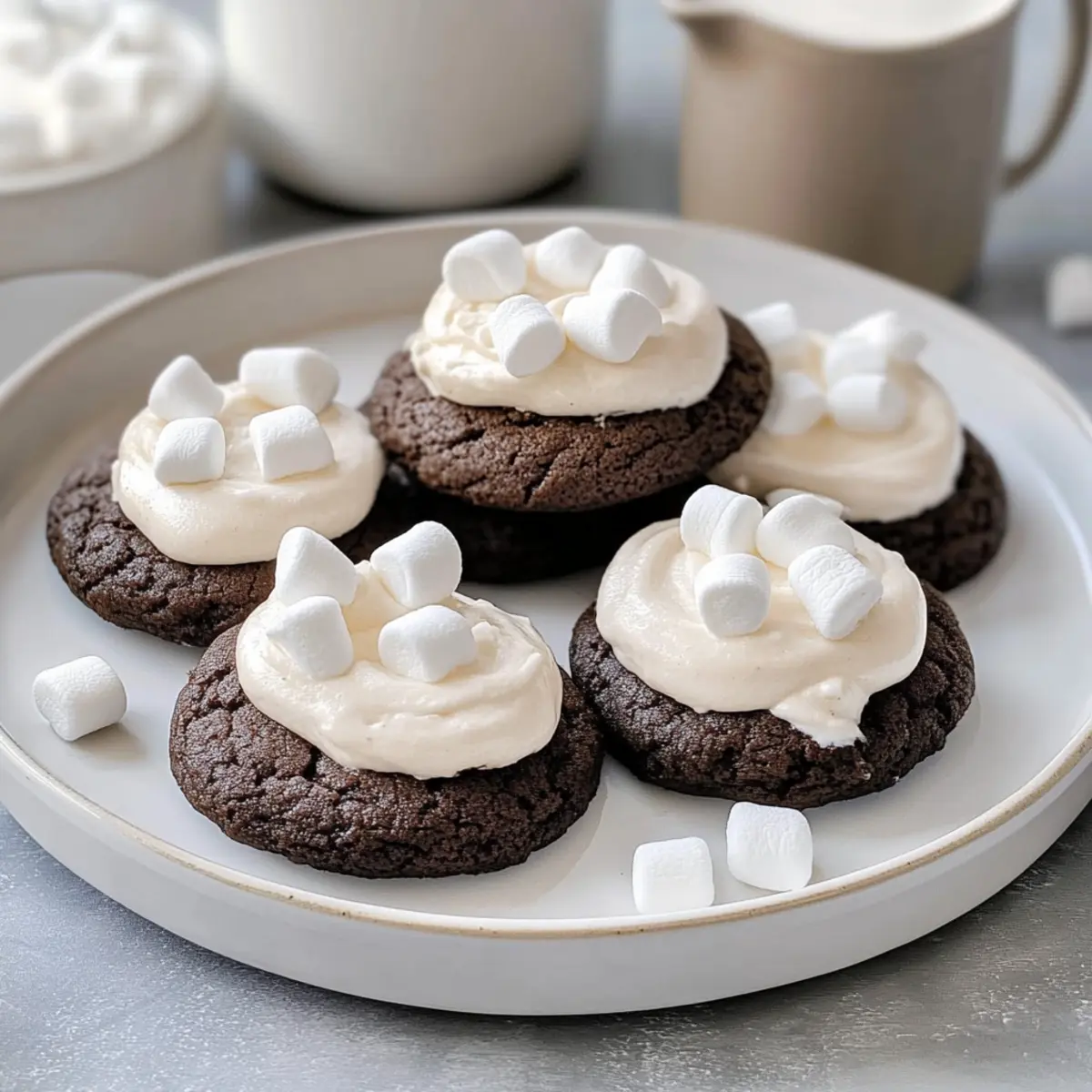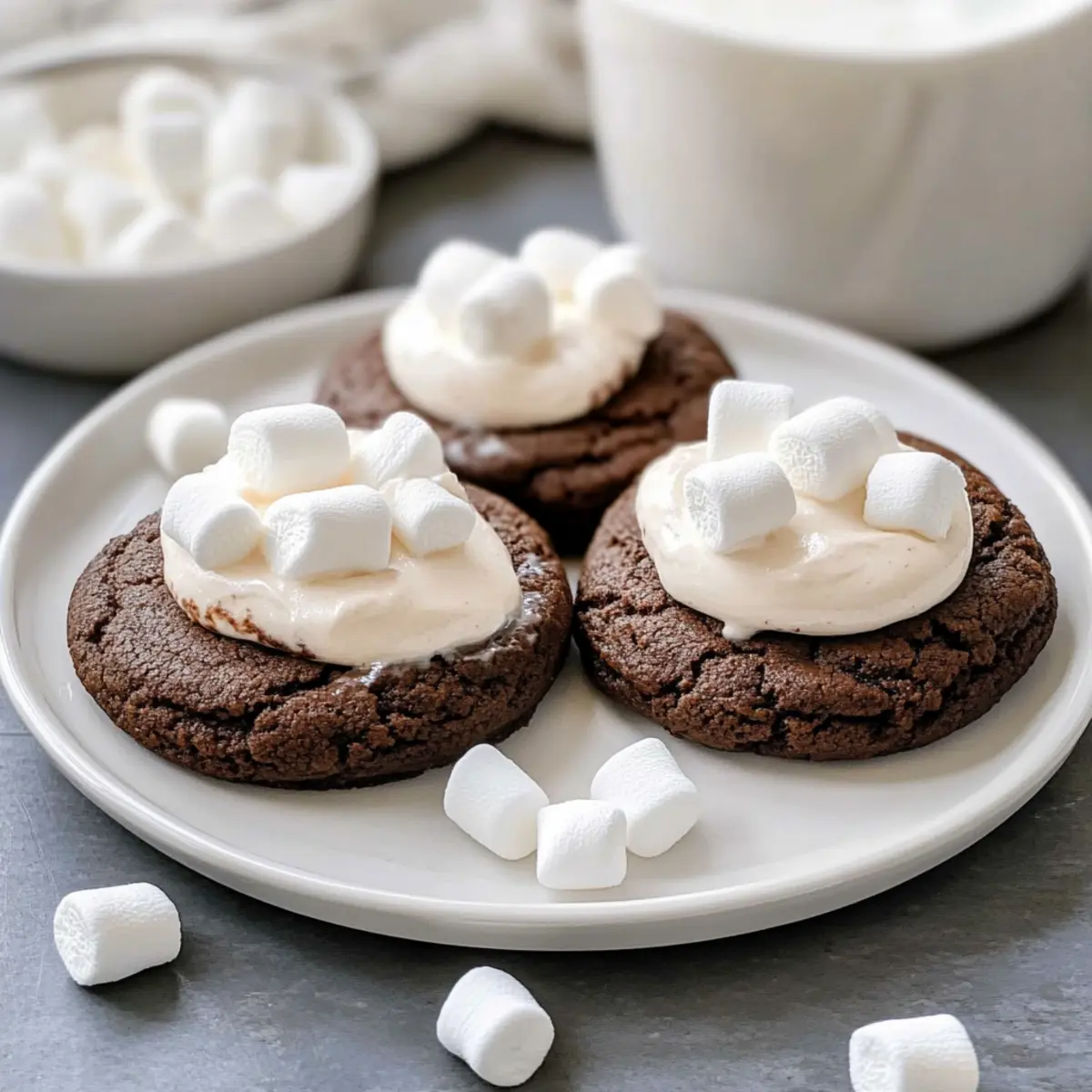Jump to Recipe Print RecipeOn a chilly winter evening, the aroma of baking cookies fills the air, instantly transporting me back to childhood memories of cozy family gatherings. That’s where my love for Hot Cocoa Cookies with Marshmallow Buttercream began—a blissful combination of soft, chewy cookies that capture the essence of every hot chocolate sip. Not only are these cookies a delectable treat to indulge in, but they also come together in under an hour, making them the perfect last-minute dessert for holiday celebrations or a sweet surprise for loved ones. With that fluffy marshmallow buttercream frosting on top, you’ll create a magical moment with every bite. Curious about how to bring this festive joy into your kitchen? Let’s dive in! Why are Hot Cocoa Cookies a must-try? Warm, Cozy Comfort: These Hot Cocoa Cookies evoke the nostalgia of winter nights with their rich, chocolatey flavor and soft texture. Quick & Easy: With just under an hour required from start to finish, you’ll have warm cookies ready for any occasion. A Showstopper: The fluffy marshmallow buttercream adds a delightful touch that both kids and adults will love—perfect for holiday parties! Endless Variations: Feel free to experiment by swapping in different chocolate chips or adding mint extract for a fun twist. Pair these cookies with a mug of Pink Hot Chocolate for an unforgettable treat that warms the heart! Hot Cocoa Cookies Ingredients • For the Cookies Salted Butter – Provides rich flavor and moisture for the cookies and frosting. Unsalted butter can be used; add a pinch of salt. White Sugar – Sweetness and contributes to the cookie’s chewy texture. Can replace with coconut sugar for a different flavor. Brown Sugar – Adds moisture and a slight caramel flavor. Light or dark variety can be used interchangeably. Eggs (1 whole + 2 yolks) – Acts as a binder, adding richness. Can substitute with 1/4 cup unsweetened applesauce for a vegan option. Vanilla Extract – Enhances overall flavor profile. Use pure vanilla for the best taste. All-purpose Flour – Provides structure and texture. For gluten-free, use a 1:1 gluten-free baking flour. Cocoa Powder – Adds chocolate flavor. Dark cocoa will provide a richer taste. Hot Chocolate Mix – Intensifies the chocolate flavor. Optional, can be omitted if unavailable. Baking Powder & Baking Soda – Leavening agents to achieve a light texture. Ensure they are fresh for best results. Salt – Enhances flavors and balances sweetness. Use kosher or sea salt for better texture. Dark and Semisweet Chocolate Chips – For texture and additional chocolate notes. Can substitute with white chocolate or butterscotch chips. • For the Marshmallow Buttercream Powdered Sugar – Sweetens the frosting and pairs well with cream. Can reduce amount for less sweetness. Marshmallow Cream – Adds fluffiness and sweetness to the frosting. Can be substituted with homemade marshmallow fluff if desired. Whipping Cream – Contributes to the light, airy texture of the frosting. Milk can be used as a substitute for a denser frosting. • For Garnish Jet Puffed Mini Marshmallow Bits – Final decorative touch that adds a festive look. Can replace with chocolate shavings for variation. With these Hot Cocoa Cookies with Marshmallow Buttercream ingredients on hand, you’re all set to create a delightful treat that captures the essence of cozy winter nights and joyful celebrations! Step‑by‑Step Instructions for Hot Cocoa Cookies with Marshmallow Buttercream Step 1: Preheat the Oven Begin by preheating your oven to 350°F (175°C). This ensures that the Hot Cocoa Cookies will bake evenly and achieve a delightful texture. While the oven heats, it’s the perfect time to gather your baking sheets and line them with parchment paper for easy cleanup. Step 2: Mix Wet Ingredients In a large mixing bowl, cream together the softened salted butter, white sugar, and brown sugar until the mixture is light and fluffy, about 2-3 minutes. Next, add in one whole egg and two yolks along with the vanilla extract, mixing until well combined. This creamy base will give your cookies the rich flavor they deserve. Step 3: Prepare Dry Ingredients In a separate bowl, whisk together the all-purpose flour, cocoa powder, hot chocolate mix, baking powder, baking soda, and salt until fully integrated. This step helps to evenly distribute the leavening agents and creates a flavorful dry mix for the Hot Cocoa Cookies, ensuring they rise perfectly as they bake. Step 4: Combine Mixtures Gradually add the dry ingredients to the wet mixture, mixing on low speed until just combined. Be careful not to overmix! Gently fold in the dark and semisweet chocolate chips, which will melt slightly during baking and create pockets of chocolate goodness in your cookies. Step 5: Chill Dough Cover the bowl with plastic wrap and refrigerate the dough for about 20 minutes. Chilling the Hot Cocoa Cookies dough helps to firm it up, making it easier to scoop and ensuring they maintain their shape while baking for that perfect soft and chewy texture. Step 6: Scoop & Bake Using a cookie scoop or tablespoon, drop rounds of dough onto the prepared baking sheets, spacing them about 2 inches apart. Slightly flatten each ball before placing them in the preheated oven. Bake for 8-10 minutes until the edges are crisp but the centers look soft and slightly underbaked for the ideal chewy bite. Step 7: Cool Cookies Once baked, allow the cookies to cool on the baking sheet for 5 minutes to set before transferring them to a wire rack. This step ensures that the Hot Cocoa Cookies maintain their soft centers while cooling, creating a delightful contrast to the crispy edges. Step 8: Prepare Frosting For the marshmallow buttercream, in a medium bowl, combine softened butter and marshmallow cream. Gradually add powdered sugar while mixing to prevent a cloud of sugar, then add vanilla extract and whipping cream. Beat on high until the frosting is