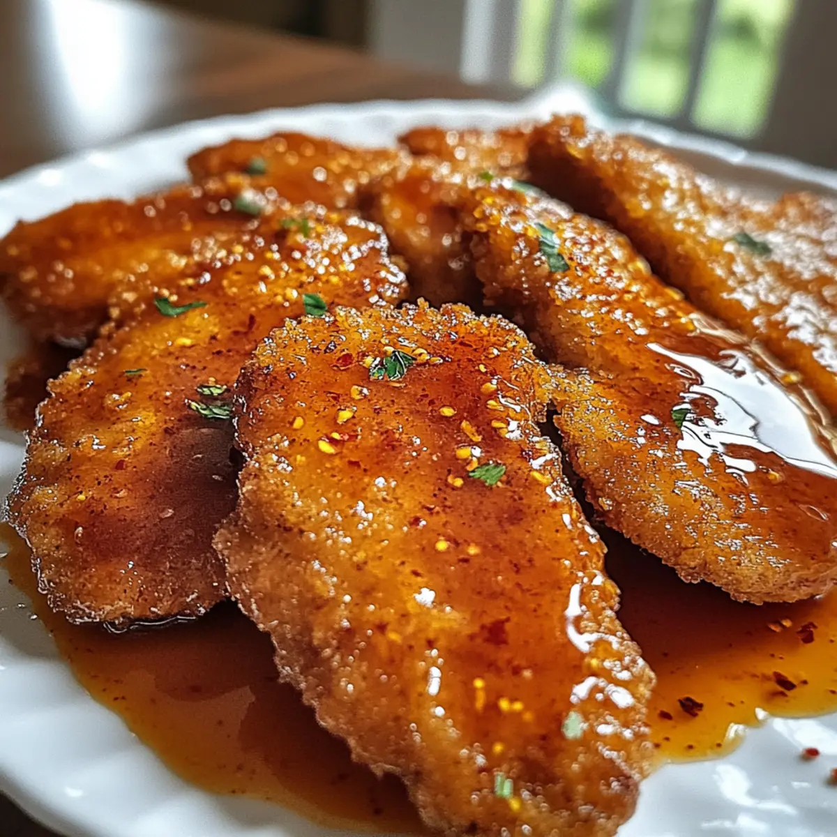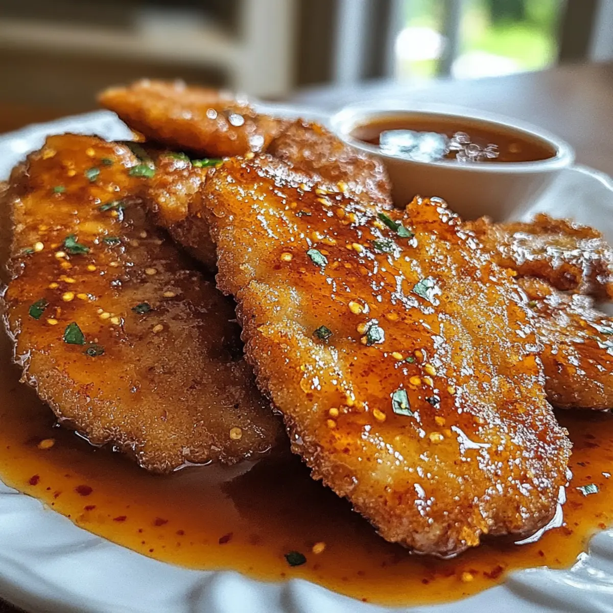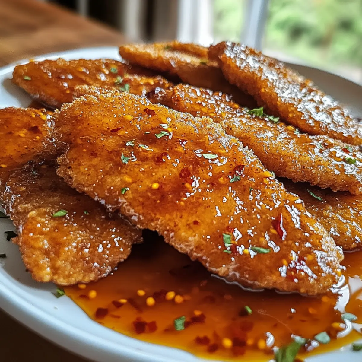 Jump to Recipe Print RecipeAs I was whisking together my go-to spicy glaze, a thought struck me: could I make weeknight dinners more exciting? Enter the star of my latest culinary adventure—Hot Honey Chicken Cutlets! These crispy, juicy delights are not just another meal; they’re a bold, crowd-pleasing alternative to the usual fast food. Brimming with flavor and quickly made, they’re perfect for impressing your family after a long day or for prepping ahead. The combination of the sweet and spicy glaze makes them utterly irresistible, whether you serve them with mashed potatoes or toss them in a wrap for lunch. Have you ever tasted something that instantly elevates a simple evening? Trust me, these cutlets do just that. Ready to bring some excitement to your table tonight? Why are Hot Honey Chicken Cutlets a must-try? Flavor Explosion: The Hot Honey glaze combines sweetness and heat, taking ordinary chicken cutlets to a whole new level. Juicy and Crispy: Each cutlet features a golden-brown crust that complements the tender chicken beneath, creating a satisfying bite. Quick and Easy: Perfect for busy weeknights, these cutlets come together in less than 30 minutes, proving that delicious meals don’t require hours in the kitchen. Versatile Note: Serve them as a main dish, or slice them into wraps alongside fresh veggies, or pair with a refreshing salad for a complete meal. If you’re looking for something a bit different, why not try these alongside some Garlic Parmesan Chicken for a combo that won’t disappoint? Hot Honey Chicken Cutlet Ingredients Get ready to create a dish that’s bursting with flavor! For the Cutlets • Chicken Cutlets – These are your main protein; opt for boneless, skinless chicken breasts for the most tender results. • Flour – This acts as your breading agent; it helps achieve a crispy texture, but feel free to use almond flour for a gluten-free alternative. • Eggs – Vital for binding; make sure they’re beaten until pale to ensure a smooth coating on your cutlets. • Breadcrumbs – These deliver crunch; consider using panko breadcrumbs for an extra crispy finish, or swap for gluten-free varieties if needed. For the Glaze • Hot Honey – This unique blend adds spicy sweetness; you can buy it at the store or mix together honey and chili flakes to make your own! • Chili Flakes – Adding heat; customize the amount to suit your spice preference and enhance the flavor of your hot honey chicken cutlets. • Salt and Pepper – Essential seasonings to elevate the overall flavor of the dish; don’t skip these! With these ingredients in hand, you’re on your way to an unforgettable meal that reinvents the weeknight dinner. Let’s get cooking! Step‑by‑Step Instructions for Hot Honey Chicken Cutlets Step 1: Prepare Chicken Begin by tenderizing the chicken cutlets with a meat mallet for even cooking. Pat them dry with paper towels, then season generously with salt and pepper to enhance flavor. This first step ensures your Hot Honey Chicken Cutlets will be juicy and packed with taste, setting the foundation for a delicious meal. Step 2: Set up Breading Station Prepare your breading station by placing three shallow bowls on your workspace. In the first bowl, add flour; in the second, whisk together the eggs until pale and frothy; and in the third, pour in the breadcrumbs. This organized setup will streamline the coating process for your Hot Honey Chicken Cutlets, making dipping and breading straightforward. Step 3: Coat Chicken Take each cutlet and dredge it in the flour, ensuring it is fully coated. Next, dip the floured cutlet into the egg, allowing excess to drip off, then transfer it to the breadcrumbs, pressing lightly to adhere. Repeat this process until all cutlets are breaded, creating a crispy exterior that will elevate the flavor of your Hot Honey Chicken Cutlets. Step 4: Fry Cutlets Heat two inches of cooking oil in a large skillet over medium-high heat until it reaches 350°F. Carefully add the breaded cutlets, cooking for about 4-5 minutes per side until they are golden brown and crispy. Use a meat thermometer to check that the internal temperature has reached 165°F for perfect doneness. Step 5: Make Hot Honey Glaze While the cutlets fry, combine the hot honey and chili flakes in a small saucepan over low heat. Stir continuously until the honey melts and slightly thickens, which should take about 3-5 minutes. This glaze will add a sweet and spicy kick to your Hot Honey Chicken Cutlets, enhancing their delicious crunch. Step 6: Drizzle & Serve Once the chicken cutlets are fried, use tongs to remove them from the skillet and let them rest on a paper towel-lined plate. Drizzle the warm hot honey glaze over each cutlet before serving. This finishing touch will not only make your Hot Honey Chicken Cutlets irresistible but also beautifully glossy, ready to impress anyone at the dinner table. What to Serve with Hot Honey Chicken Cutlets Elevate your weeknight dinner by pairing these crispy delights with sides that complement their bold flavors and textures. Creamy Mashed Potatoes: Their buttery smoothness balances the sweet and spicy kick of the cutlets, creating a comforting duo. Garlic Parmesan Roasted Broccoli: This vibrant veggie side adds a crunchy contrast and earthy flavor, enhancing the overall meal experience. Coleslaw with a Twist: A tangy, crunchy coleslaw offers a refreshing offset to the richness of the chicken, making each bite feel satisfying. Crisp Garden Salad: Light and fresh, a garden salad with mixed greens and a zesty dressing can brighten the meal and add a nutritious element. Sweet Corn on the Cob: The natural sweetness of corn pairs beautifully with the spicy glaze, creating a delightful contrast in flavors. Honey Mustard Dipping Sauce: For an extra layer of flavor, serve a honey mustard sauce alongside for dipping; it ties in beautifully with the hot honey glaze. Sparkling Lemonade: Refreshing and lightly tart, th