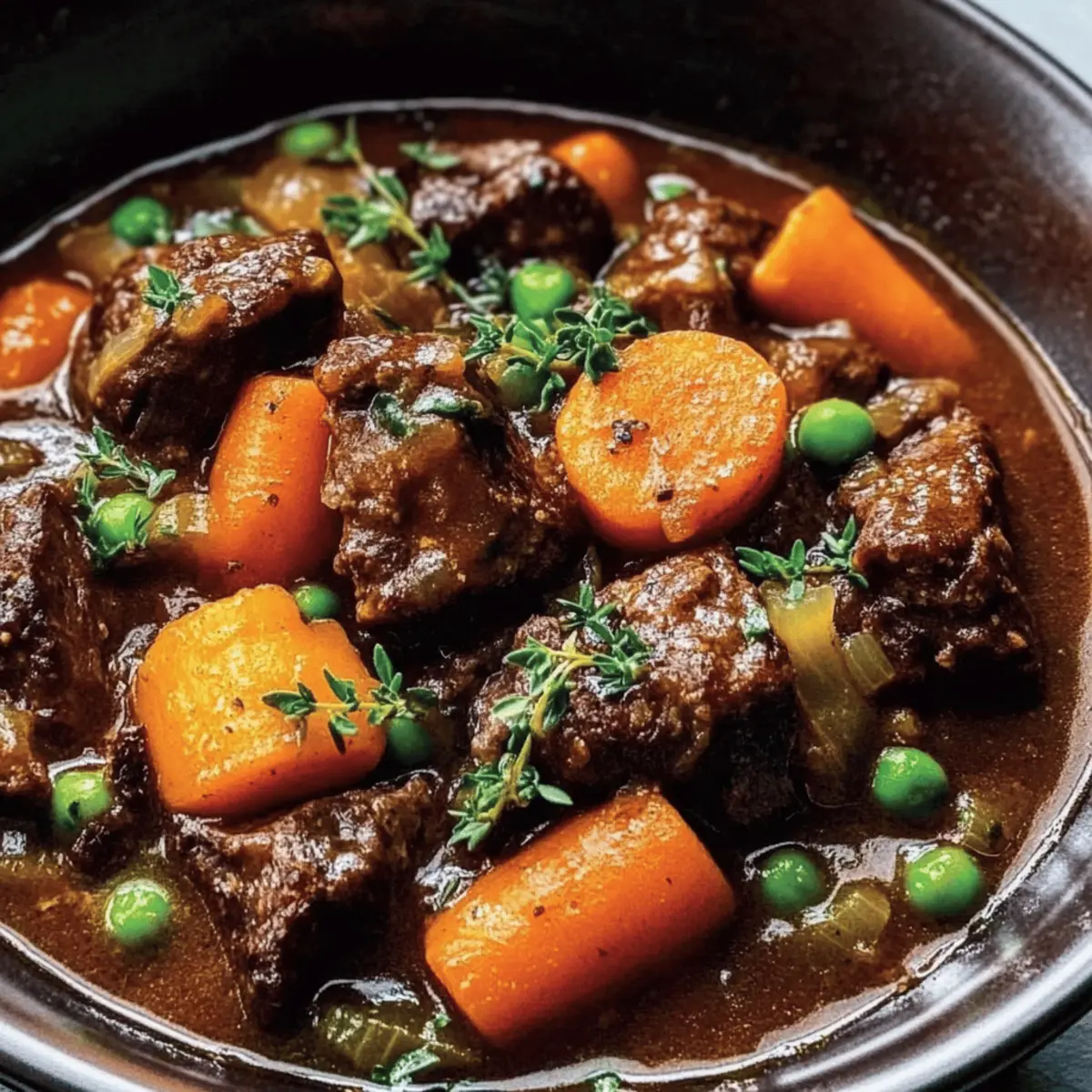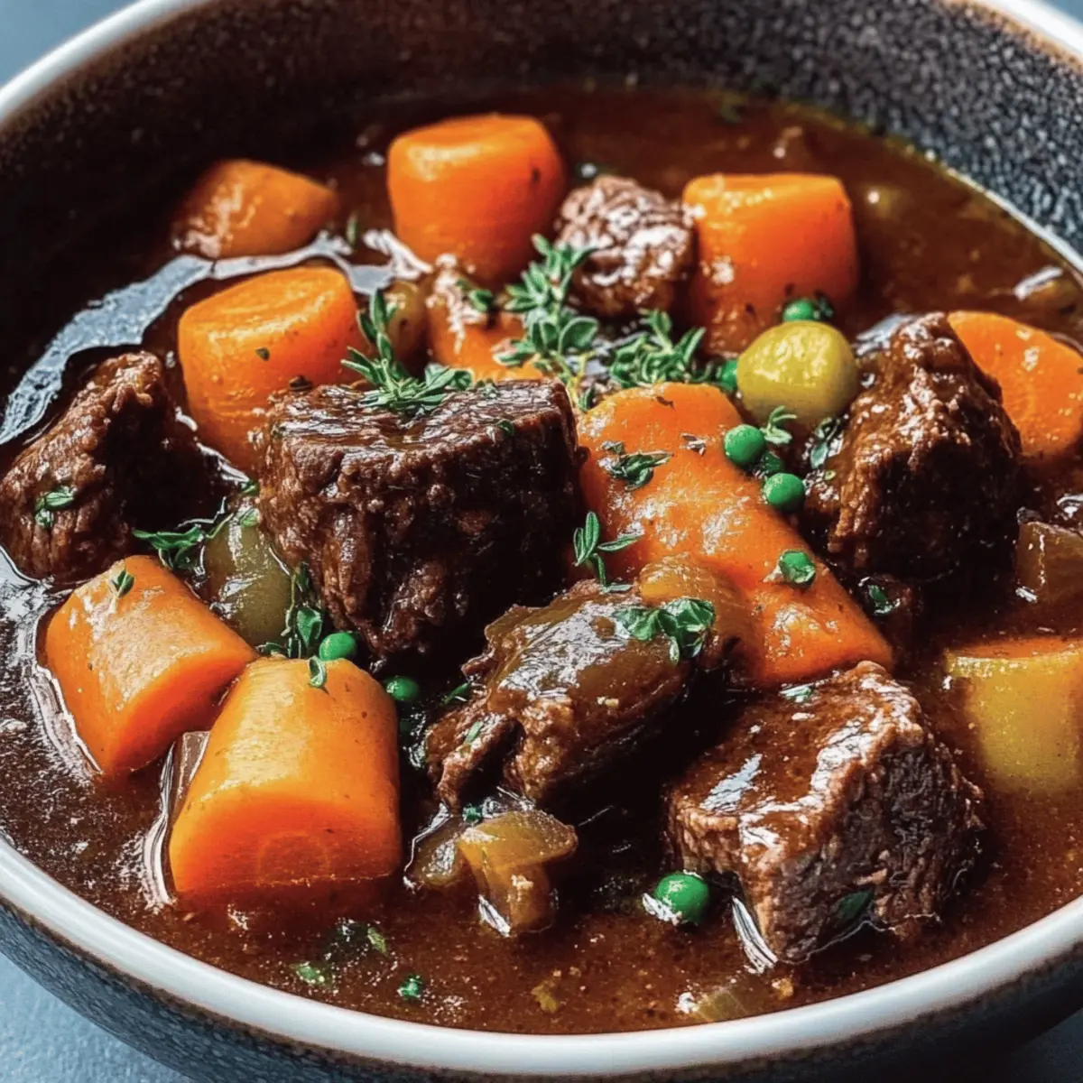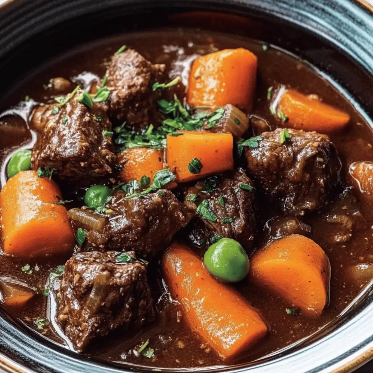 Jump to Recipe Print RecipeAs I stood in the kitchen, the familiar scent of simmering beef and herbs wrapped around me like a warm embrace, I couldn’t help but feel a wave of nostalgia. This Hearty Ina Garten Beef Stew is more than just a recipe; it’s a cozy ritual that transforms chilly evenings into something special. With tender chunks of beef melting into a rich, velvety broth and a medley of vibrant vegetables, this dish not only satisfies a craving for comfort food but is also an impressive centerpiece for family gatherings. Plus, it’s surprisingly easy to whip up, allowing you to savor each moment instead of stressing over dinner. Whether you’re new to cooking or a seasoned chef, this beef stew is bound to become a favorite. Are you ready to fill your kitchen with irresistible aromas and create a heartwarming meal? Why is Ina Garten Beef Stew a Must-Try? Unparalleled Comfort: This recipe delivers a hearty and satisfying meal that warms you from the inside out, making it perfect for chilly nights. Rich and Robust Flavor: The combination of herbs and red wine creates an unforgettable depth that elevates this stew to comfort food royalty. Simple Preparation: With straightforward steps, even novice cooks can easily recreate this timeless dish, ensuring you spend more time enjoying and less time stressing. Customizable Goodness: Feel free to add your favorite vegetables like potatoes or mushrooms, making it a versatile dish that caters to various tastes. Make-Ahead Magic: This stew offers fantastic leftovers and can even be frozen, so you can enjoy its tantalizing flavor on busy days. If you’re looking for more beef ideas, check out Epic Beef Nachos Supreme or Chilli Beef Rice! Ina Garten Beef Stew Ingredients For the Stew • 3 lbs beef chuck – Provides rich flavor and tenderness when braised. • Kosher salt and pepper – Essential for seasoning, enhancing overall flavor. • 3 tbsp olive oil – Used for browning the meat, adding depth of flavor. • 2 yellow onions, chopped – Contributes sweetness and aroma. • 4 garlic cloves, minced – Offers a pungent, aromatic base. • 1 cup carrots, chopped – Adds sweetness and color. • 1 cup celery, chopped – Provides a savory base and crunch. • 2 tbsp tomato paste – Adds richness and umami. • 1 cup dry red wine – Deepens the flavor; can be replaced with more broth for non-drinkers. • 4 cups beef broth – The liquid base of the stew, bringing everything together. • 1 can (14.5 oz) diced tomatoes, drained – Adds acidity and texture. • 1 tsp dried thyme – Infuses earthy flavor. • 2 bay leaves – Enhances the savory aroma of the stew. • 1 tsp Worcestershire sauce – Adds additional depth and complexity. Optional Add-ins • 1½ lbs potatoes – Versatile and hearty for added texture. • 1 cup mushrooms – Enriches the stew with an earthy flavor. • 1 cup peas – Adds a pop of color and sweetness. For Thickening (Optional Roux) • 2 tbsp butter – Helps create a rich base for thickening. • 2 tbsp flour – Use gluten-free flour for a gluten-free option! Step‑by‑Step Instructions for Ina Garten Beef Stew Step 1: Preheat the Oven Begin your hearty Ina Garten Beef Stew by preheating your oven to 325°F (163°C). This temperature is perfect for slow-cooking the beef to ensure it becomes tender and flavorsome. While the oven heats, gather your ingredients and equipment, making sure you have a large Dutch oven or heavy pot ready for the next steps. Step 2: Prepare the Beef Once the oven is preheated, season 3 pounds of beef chuck generously with kosher salt and pepper. In your Dutch oven, heat 3 tablespoons of olive oil over medium heat. When the oil shimmers, add the beef chunks, browning them on all sides for about 4-5 minutes. This step is crucial for locking in flavor and creating that rich, deep color. Step 3: Sauté Aromatics After browning the beef, carefully remove it from the pot and set it aside on a plate. In the same pot, add the chopped onions and minced garlic, stirring them for about 3-4 minutes until they soften and become fragrant. This aromatic base introduces sweetness to your hearty stew, setting the stage for the flavors to unfold beautifully. Step 4: Add Vegetables Next, stir in 1 cup each of chopped carrots and celery into the pot, cooking for an additional 2-3 minutes. You’ll notice the vibrant colors of the vegetables brighten the mixture, bringing a comforting warmth to your kitchen. These ingredients complement the beef perfectly while providing extra texture and sweetness to your stew. Step 5: Incorporate Broth and Flavorings Now, mix in 2 tablespoons of tomato paste, stirring until it darkens slightly, which takes about a minute. Pour in 1 cup of dry red wine, allowing it to deglaze the pot as you scrape up any browned bits from the bottom. Follow with 4 cups of beef broth, creating a rich mixture that will become the heart of your Ina Garten Beef Stew. Step 6: Return the Beef and Season Return the browned beef to the pot, then add a can of drained diced tomatoes, 1 teaspoon of dried thyme, 2 bay leaves, and 1 teaspoon of Worcestershire sauce. Giving everything a good stir will combine the flavors beautifully. At this point, the stew will radiate delicious aromas, making it hard to resist! Step 7: Add Optional Ingredients If you choose to include them, now is the time to mix in 1½ pounds of potatoes, 1 cup of mushrooms, and 1 cup of peas. These optional additions will enhance the stew, making it even heartier and more nutritious. Ensure everything is well distributed throughout the liquid for even cooking. Step 8: Simmer and Bake Bring the mixture to a gentle simmer over medium heat. Once it starts bubbling, cover the pot and carefully transfer it to your preheated oven. Let it bake for 2-3 hours, checking for tenderness. The beef should be fork-tender, melting into the rich broth—a true testament to the heart of comfort food. Step 9: Thicken If Desired If yo
