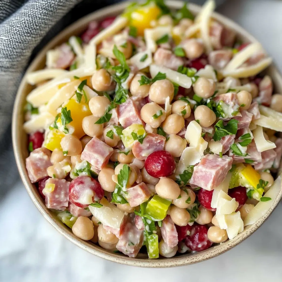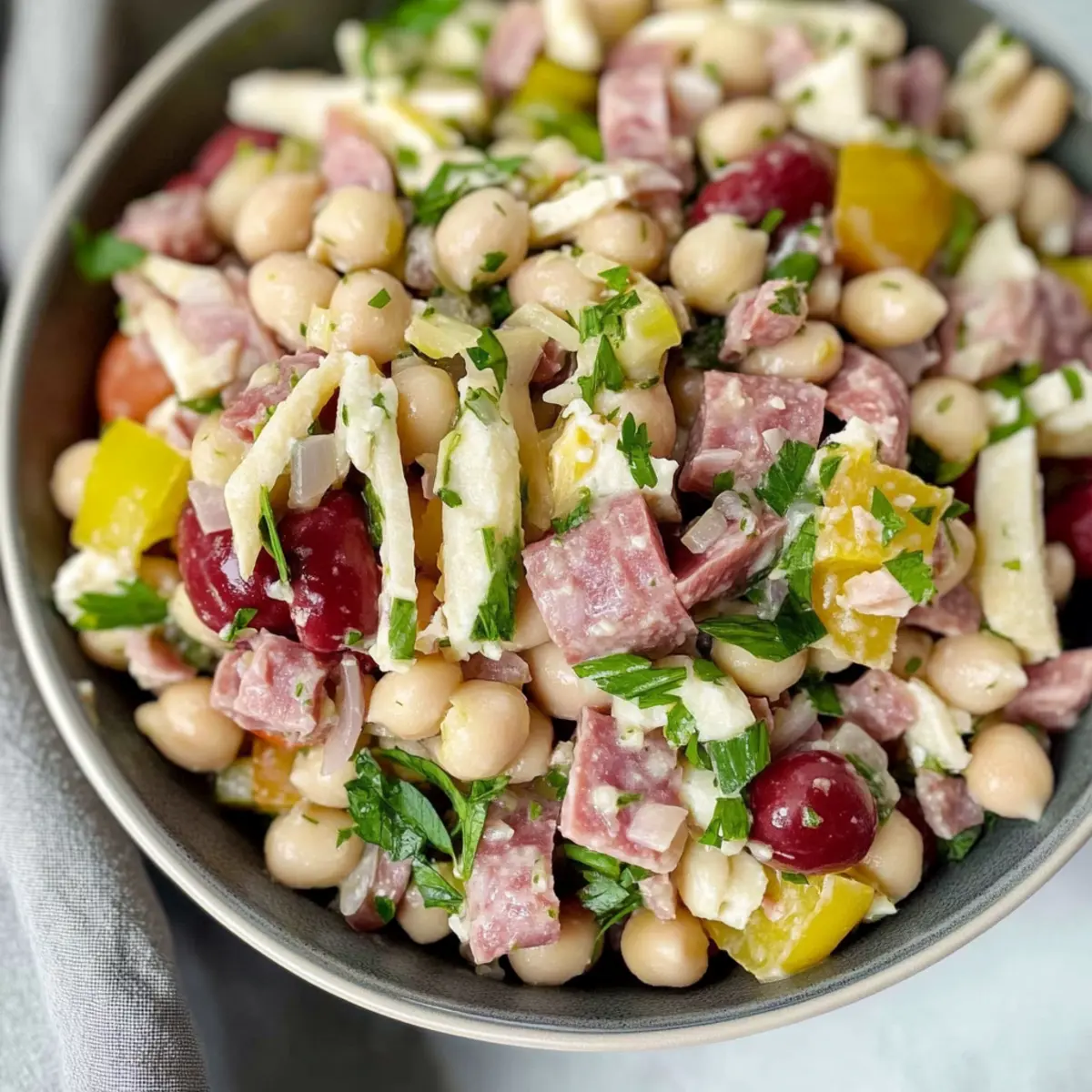 Jump to Recipe Print RecipeCan you hear that delightful crunch? When I first tossed together the ingredients for this Italian Grinder Bean Salad, the sound of fresh veggies and hearty beans colliding was music to my ears. This vibrant salad takes all the beloved flavors of a classic deli sandwich and transforms them into a protein-packed bowl that’s as refreshing as it is satisfying. Boasting a whopping 35 grams of protein and 12 grams of fiber per serving, it’s perfect for a quick meal prep solution or a filling lunch that won’t have you reaching for takeout. So, are you ready to indulge in this tasty twist? Let’s dive into making a salad that’s sure to become a new favorite! What makes this salad a must-try? Bold, Flavorful Ingredients: The Italian Grinder Bean Salad features a lively mix of beans, peppers, and meats, bursting with taste that feels just like your favorite deli sandwich. High in Protein: With 35 grams of protein per serving, it’s ideal for a quick refuel after a busy day! Quick & Easy: No cooking required! Just mix, chill, and enjoy—perfect for those hectic weekdays. Meal Prep Friendly: Prepare it ahead of time for delicious lunches throughout the week, just like my Mexican Street Salad. Versatile & Customizable: You can easily make it vegetarian by swapping meats or experiment with different beans! This salad is definitely a crowd-pleaser that everyone will love! Italian Grinder Bean Salad Ingredients For the Salad • Garbanzo Beans – These canned legumes form the hearty base, offering protein and fiber for a nutritious kick. • White Beans – Adding creaminess and extra protein, they can be replaced with Great Northern or navy beans if needed. • Turkey Breast – Diced for lean protein; skip it or swap in more beans for a vegetarian-friendly option. • Salami – Infuses savory richness; substitute with cured sausage or leave out for a lighter, healthier twist. • Green Bell Pepper – This fresh, crunchy addition enhances the salad’s color; red or yellow bell peppers work beautifully, too. • Cherry Tomatoes – Bursting with juiciness and brightness; if you’re out, substitute with regular diced tomatoes. • Pepperoncini – Provides a tangy touch with a mild kick; banana peppers can be a good alternative if you prefer something milder. • Red Onion – Adds a sharp bite and a pop of color; feel free to omit for a milder flavor profile. • Parsley – Fresh herbs for garnishing, lending freshness to the dish; switch to cilantro for a different twist. • Provolone or Mozzarella Pearls – Creamy cheese that brings balance to the salad; look for dairy-free alternatives if needed. For the Dressing • Greek Yogurt – The creamy base enhances the dressing’s tanginess; sour cream or a vegan alternative can also work well. • Extra Virgin Olive Oil – Adds a rich layer to the dressing; any mild oil can substitute in its place. • Red Wine Vinegar – Brightens flavors with its acidity; consider using apple cider vinegar or lemon juice if necessary. • Pepperoncini Brine – Elevates the dressing’s flavor profile; if you like it less tangy, feel free to omit it entirely. • Dijon Mustard – Offers zest and depth to the dressing; yellow mustard can easily substitute if that’s what you have. • Garlic – Fresh minced garlic boosts flavor in the dressing; garlic powder is a quick substitute if you’re in a pinch. • Dried Oregano – Infuses herbal notes into the dressing; Italian seasoning is a good alternative if you’re out. • Red Pepper Flakes – Adds just the right amount of heat; feel free to adjust to your preference or omit for a milder option. • Sea Salt – Essential for enhancing all flavors; adjust according to your dietary needs. This Italian Grinder Bean Salad is not only vibrant and delicious with its bold flavor profile, but it’s also a satisfying option you can prep ahead. Perfect for busy days, making it irresistible for anyone craving something homemade and uplifting! Step‑by‑Step Instructions for Italian Grinder Bean Salad Step 1: Prepare the Dressing In a medium bowl, whisk together 1 cup of Greek yogurt, 3 tablespoons of extra virgin olive oil, 2 tablespoons of red wine vinegar, and 1 tablespoon of pepperoncini brine. Add 1 tablespoon of Dijon mustard, 1 minced garlic clove, 1 teaspoon of dried oregano, a pinch of red pepper flakes, and sea salt to taste. Continue whisking until the dressing is smooth and creamy, then set aside. Step 2: Mix Salad Ingredients In a large mixing bowl, combine 1 can of drained garbanzo beans, 1 can of drained white beans, 1 cup of diced turkey breast, and ½ cup of diced salami. Add 1 chopped green bell pepper, 1 cup of halved cherry tomatoes, ½ cup of chopped pepperoncini, ¼ cup of diced red onion, and a handful of chopped parsley. Gently toss the salad ingredients until well mixed, showcasing the vibrant colors. Step 3: Dress the Salad Drizzle the prepared dressing over the mixed salad, ensuring all components receive an even coating. Utilizing a large spoon, gently toss the salad again to incorporate the dressing thoroughly. The Italian Grinder Bean Salad should look glossy and well-seasoned at this stage, with all ingredients evenly distributed for balanced flavor in every bite. Step 4: Chill and Serve For optimal flavor, refrigerate the mixed salad for at least 30 minutes, allowing the ingredients to meld beautifully. Before serving, give it another light toss and garnish with additional pepperoncini for an extra pop of flavor. Serve the salad cold to enjoy its refreshing crunch and hearty protein content! Make Ahead Options These Italian Grinder Bean Salad components are perfect for meal prep, allowing you to enjoy deliciousness with ease! To save time, you can prepare the dressing up to 3 days in advance; just store it in an airtight container in the refrigerator. For the salad, you can mix the beans, turkey, salami, and veggies in a separate bowl and refri