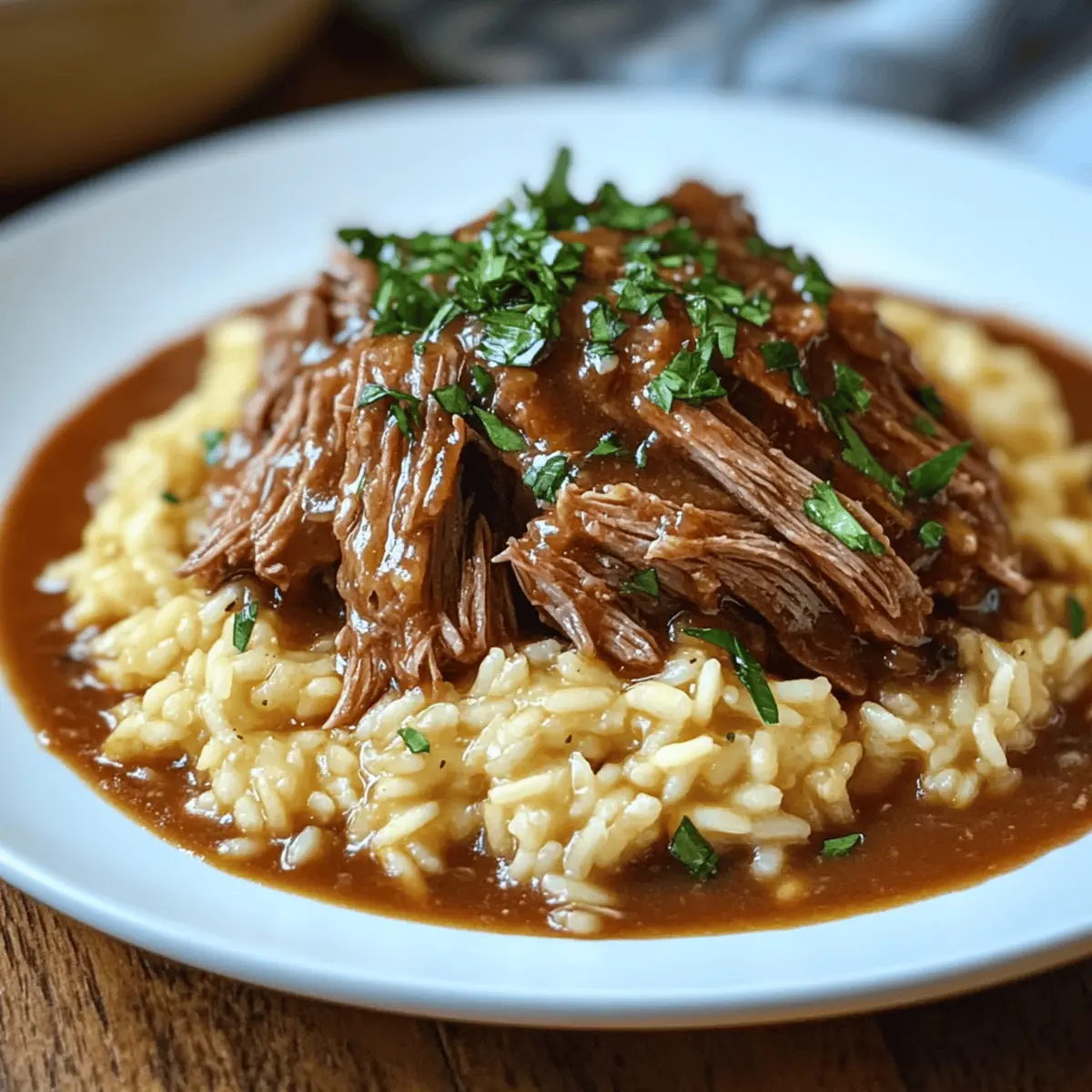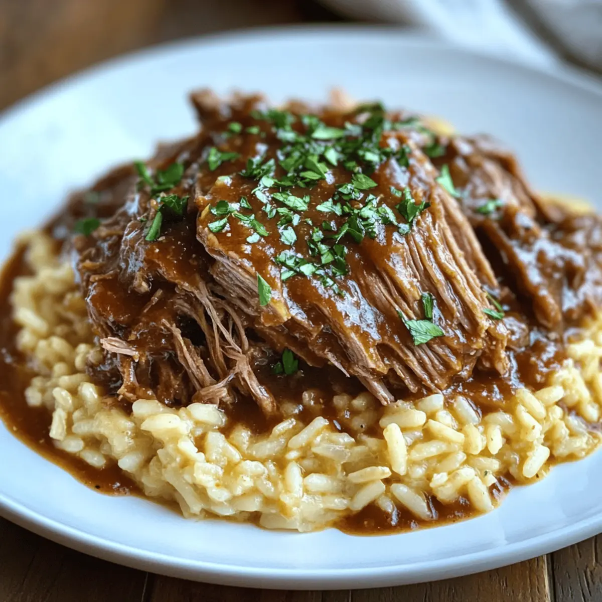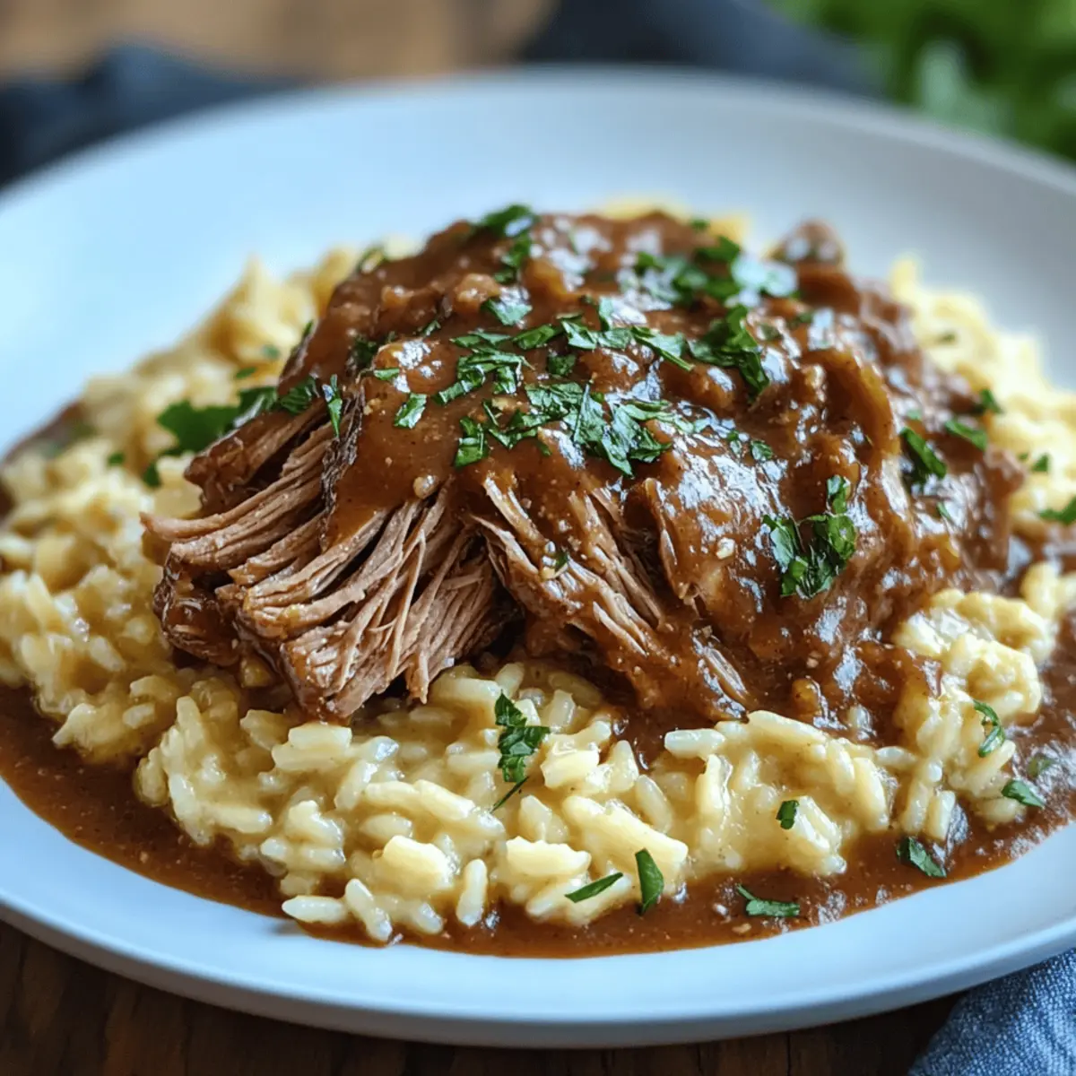 Jump to Recipe Print RecipeAs I sat down to savor a hearty meal the other night, a wave of nostalgia washed over me, reminding me of family gatherings filled with laughter and warmth. That’s when the idea of cooking an Italian Pot Roast with Creamy Parmesan Risotto came to mind. This recipe is more than just a comforting dish; it’s a love letter to traditional Italian cuisine, bringing together tender pot roast and rich, velvety risotto that’s undeniably gluten-free. Ideal for cozy evenings or special celebrations, this dish not only warms the soul but also offers a delightful way to impress your loved ones. So, are you ready to elevate your dinner experience and create some unforgettable memories in your kitchen? Let’s dive into this comforting culinary adventure together! Why is this Italian Pot Roast special? Unforgettable Flavors: The marriage of savory beef and creamy risotto creates a delectable balance that will have you savoring every bite. Comforting Discomfort: This dish embodies cozy Italian nights, bringing warmth and nostalgia to your dining table. Gluten-Free Delight: Perfect for those avoiding gluten, this recipe ensures everyone can enjoy a hearty meal without compromise—like my Garlic Parmesan Chicken for a delightful side option. Effortless Preparation: Minimal prep and a simple slow-cooking process make this pot roast the ultimate hands-off dish for busy weeknights. Crowd-Pleasing Appeal: Whether it’s a family dinner or a special gathering, this pot roast and risotto combo is sure to impress and satisfy your guests! Pair it with some fresh veggies or a light salad for a complete feast. Italian Pot Roast Ingredients • Discover what makes this Italian Pot Roast truly special! For the Pot Roast Boneless Beef Chuck Roast – The star of the dish; tender and flavorful when slow-cooked. Olive Oil – Ideal for browning meat; substitute with any light cooking oil if needed. Onions – Adds a sweet depth to the roast; shallots can be used as an alternative. Carrots – For sweetness and a pop of color; celery offers a different flavor if preferred. Garlic – Enhances the overall aroma; feel free to adjust or use garlic powder as a backup. Dry Red Wine – Introduces complexity; can be replaced with additional beef broth for a non-alcoholic option. Beef Broth – Ensures moisture and flavor; vegetable broth is a great substitute for a lighter taste. Diced Tomatoes – Brings acidity and texture; fresh tomatoes work beautifully as well. Fresh Rosemary and Thyme – Increases aromatic notes; dried herbs can be swapped with an adjusted quantity. Bay Leaves – Infuses deep flavor; remember to remove them before serving. Salt and Pepper – Essential for balancing flavors; adjust to your liking. For the Risotto Arborio Rice – The key to creamy texture in risotto; other short-grain rice varieties can be used as well. Chicken Broth – Flavors the risotto while keeping it gluten-free; vegetable broth is another excellent option. Dry White Wine – Adds depth to risotto; extra broth can replace this if preferred. Parmesan Cheese – Provides creaminess; use nutritional yeast or vegan cheese for a dairy-free alternative. Butter and Heavy Cream – Enhance richness; olive oil and omitted cream make it lighter if desired. Embrace the joy of cooking and create this flavorful Italian Pot Roast & Parmesan Risotto, where every ingredient shines through in this timeless comfort food! Step‑by‑Step Instructions for Italian Pot Roast & Parmesan Risotto Step 1: Brown the Pot Roast Heat 2 tablespoons of olive oil in a large Dutch oven over medium-high heat. Once the oil shimmers, carefully add the boneless beef chuck roast. Sear the meat for about 4-5 minutes on each side until a golden-brown crust forms. This step adds depth of flavor that enhances your Italian Pot Roast. Step 2: Sauté the Vegetables Remove the roast and set it aside on a plate. In the same pot, add chopped onions, diced carrots, and minced garlic. Sauté for about 5 minutes, stirring occasionally, until the onions are translucent and the veggies are softened. This aromatic mixture will lay the groundwork for your flavorful pot roast sauce. Step 3: Deglaze with Wine Pour in 1 cup of dry red wine to the pot, using a wooden spoon to scrape up the delightful browned bits from the bottom. Allow the mixture to simmer for 5 minutes; the wine will reduce slightly, intensifying the flavors. This step ensures your Italian Pot Roast has a rich base to slow cook in. Step 4: Combine Broth and Tomatoes Stir in 2 cups of beef broth, a can of diced tomatoes (with juices), and a mix of fresh rosemary, thyme, salt, and pepper. Bring the mixture to a gentle simmer, allowing the flavors to meld together. This creates a luscious environment for the beef, which will become tender and flavorful. Step 5: Slow Cook Return the browned pot roast to the pot, nestling it in the flavorful broth. Cover the pot with a lid and reduce heat to low. Allow it to slow cook for 4-6 hours, until the roast is fork-tender and infused with all those delicious Italian flavors, turning it occasionally for even cooking. Step 6: Prepare Risotto While the pot roast is cooking, prepare the Parmesan risotto in a separate saucepan. Heat 2 tablespoons of olive oil over medium heat, then add diced onions and minced garlic. Sauté for about 2-3 minutes until fragrant, ensuring the garlic does not brown. Step 7: Cook Risotto Add 1 cup of Arborio rice to the saucepan, stirring constantly for about 1-2 minutes until the rice is lightly toasted and translucent. Gradually add 4 cups of warm chicken broth, about 1 cup at a time, stirring frequently. Continue this for about 20 minutes until the risotto is creamy and al dente. Step 8: Finish Risotto Once the risotto reaches the desired creamy consistency, stir in 2 tablespoons of butter, 1 cup of grated Parmesan cheese, and a splash of heavy cream. Season with salt and pepper to taste. This step gives the risotto a lu