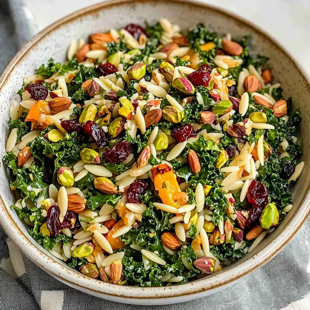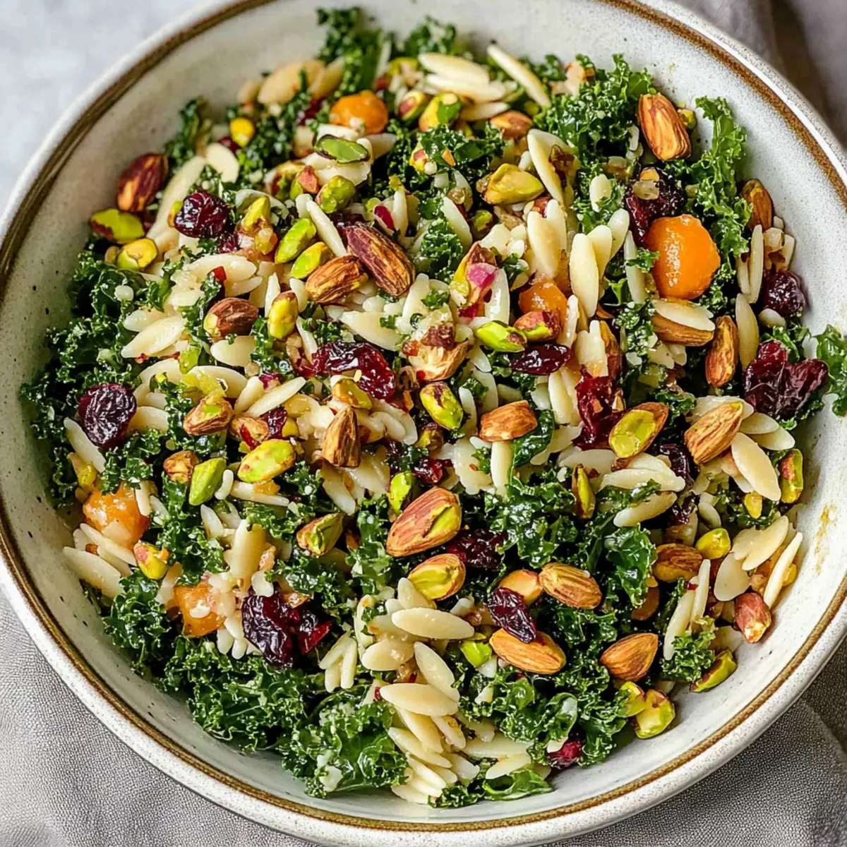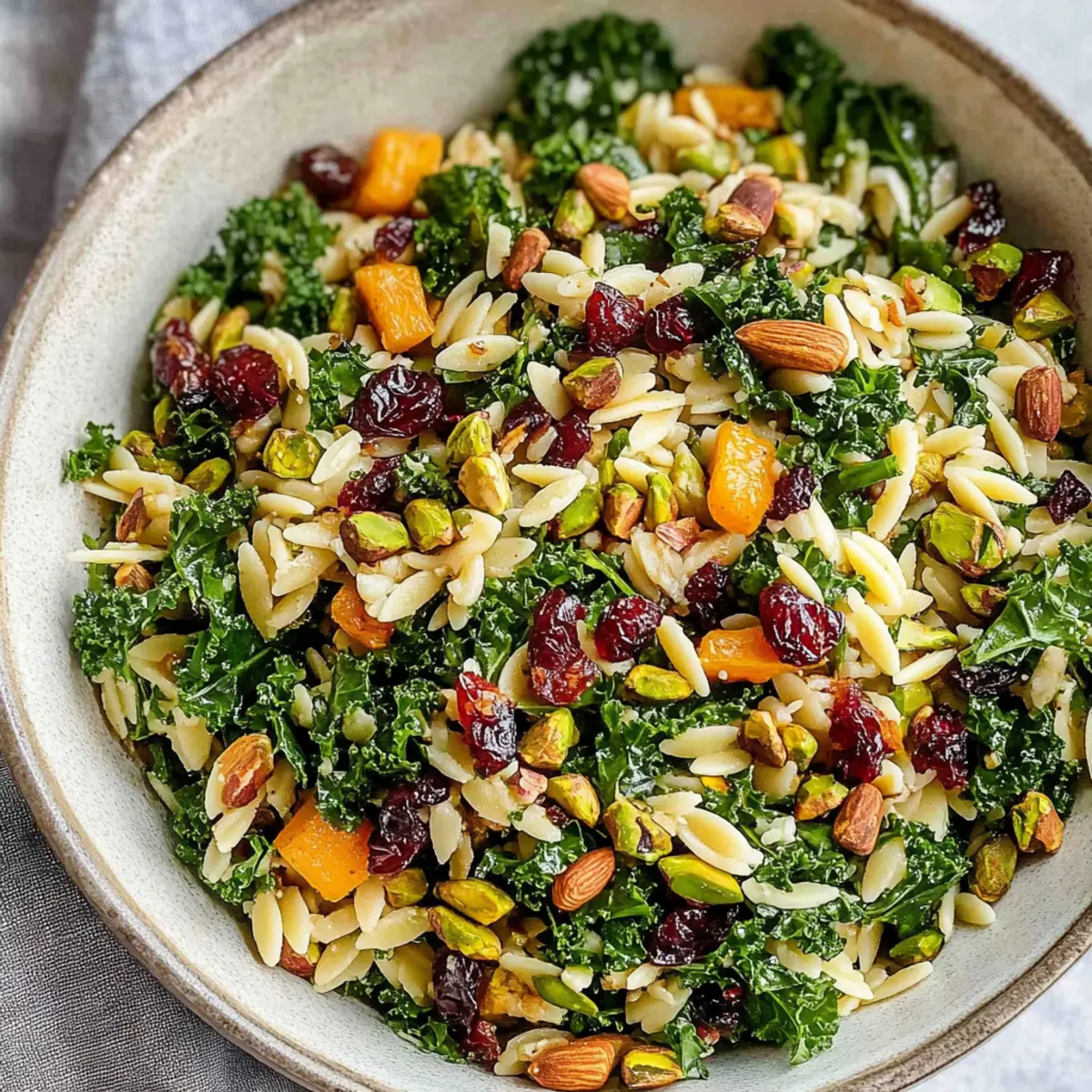 Jump to Recipe Print RecipeBiting into a crisp kale leaf topped with roasted honeynut squash and crunchy pistachios is nothing short of a joyful experience. That’s the magic of this Kale Orzo Salad with Maple Lime Vinaigrette, a vibrant dish that completely revitalizes the idea of a salad. With its balance of textures and delightful flavors, this meal is not only budget-friendly and vegan but also a breeze to prepare. Imagine a nourishing option that’s perfect for gatherings and weeknight meal prep alike! Each ingredient shines through, allowing you to customize it with seasonal produce or your favorite pantry staples. Are you ready to dive into a bowl of colorful goodness? Let’s create something delicious together! Why Is This Salad a Must-Try? Vibrant Colors: This Kale Orzo Salad with Maple Lime Vinaigrette is a feast for the eyes, featuring a medley of hues that signal fresh ingredients and wholesome goodness. Customizable Delight: Whether you want to swap chickpeas for lentils or try quinoa instead of orzo, the variations are endless, catering to your taste and dietary needs. Healthy and Filling: Packed with protein and fiber, it’s the perfect choice for those looking to enjoy a nutrient-rich meal without compromising flavor. Meal Prep Friendly: Make it ahead for busy weekdays! This salad stores beautifully and only gets better as it sits, making it a wonderful addition to your meal prep routine. Crowd Pleaser: Serve it warm or cold, and watch it disappear at parties or family gatherings—everyone will love digging into this delicious, hearty salad! For added variety, check out our Peach Feta Salad or Mexican Street Salad for refreshing seasonal alternatives! Kale Orzo Salad Ingredients • Perfectly curated for your next meal! For the Salad Orzo – Quick-cooking rice-shaped pasta provides structure; substitute with any small pasta or gluten-free option. Kale – Leafy green adds nutrients; can substitute with shredded Brussels sprouts or broccoli (requires longer roasting). Honeynut Squash – Adds sweetness and creaminess; can swap with butternut squash or sweet potato. Pistachios – Crunchy texture; for nut allergies, use pepitas or sunflower seeds. Chickpeas – Provide protein and fiber; alternatives include butter beans or lentils. Dried Cranberries – Offers sweetness; can be replaced with chopped dates or omitted entirely. For the Vinaigrette Maple Syrup – Adds sweetness to dressing; agave syrup works as an alternative for the Kale Orzo Salad with Maple Lime Vinaigrette. Extra Virgin Olive Oil – High-quality oil enhances flavor; use your preferred brand. Shallots – Milder than onions; can swap with red onion if needed. Lime – Fresh zest and juice add brightness; orange juice/zest may also work. White Wine Vinegar – Adds acidity; substitute with apple cider or red wine vinegar. Step‑by‑Step Instructions for Kale Orzo Salad with Maple Lime Vinaigrette Step 1: Preheat the Oven Begin by preheating your oven to 425°F (220°C). This temperature is ideal for roasting the vegetables, allowing them to caramelize beautifully. While the oven is heating up, prepare your ingredients so that you’re ready to get cooking once the oven reaches the desired temperature. Step 2: Prepare the Veggies In a large bowl, combine drained chickpeas and cubed honeynut squash. Drizzle with olive oil and sprinkle in garlic powder, salt, and pepper to taste. Toss well until the chickpeas and squash are evenly coated. Spread them out on a baking sheet, ensuring they aren’t crowded for perfect roasting, and place them in the preheated oven for about 25 minutes. Step 3: Roast the Kale After 18 minutes of roasting the chickpeas and squash, take the baking sheet out and add the seasoned kale. Drizzle a little olive oil, sprinkle salt and pepper over it, and use your hands to massage the kale gently. This helps to soften the leaves. Return the sheet to the oven and roast everything together for the final 7 minutes, until nicely crisped. Step 4: Cook the Orzo While your vegetables are roasting, bring a pot of salted water to a boil. Add the orzo pasta and cook according to the package instructions until al dente, usually 7-9 minutes. Stir occasionally to prevent sticking. Once cooked, drain the orzo and toss it immediately with a splash of olive oil to keep it from clumping together, then set aside to cool. Step 5: Make the Vinaigrette In a small bowl or jar, combine the maple syrup, fresh lime juice and zest, white wine vinegar, shallots, and a pinch of salt. Whisk or shake vigorously until the dressing is well emulsified and smooth. Taste and adjust the seasonings as necessary, allowing the bright flavors to shine—this vinaigrette will elevate your Kale Orzo Salad beautifully. Step 6: Combine the Salad In a large mixing bowl, add the roasted kale, chickpeas, squash, cooked orzo, chopped fresh parsley, pistachios, and dried cranberries. Drizzle generously with the maple lime vinaigrette you prepared earlier. Toss everything together gently to combine, ensuring all ingredients are well-coated with the sweet and tangy dressing for a rich flavor in your Kale Orzo Salad with Maple Lime Vinaigrette. Step 7: Serve and Enjoy Once everything is well mixed, you can serve the salad immediately while warm, or let it chill in the refrigerator for about 30 minutes to meld the flavors together—either way, enjoy this vibrant dish as a delightful main or side that’s sure to satisfy! How to Store and Freeze Kale Orzo Salad Fridge: Store the Kale Orzo Salad in an airtight container for up to 3-5 days. Keep it undressed for optimal freshness and texture; add dressing just before serving. Freezer: This salad is not ideal for freezing due to the presence of orzo and vegetables, which may lose texture upon thawing. It’s best enjoyed fresh! Reheating: If desired, warm the salad gently in the microwave or on the stovetop, adding a splash of olive oil. Enjoy it warm or cold for delightful flavors. M