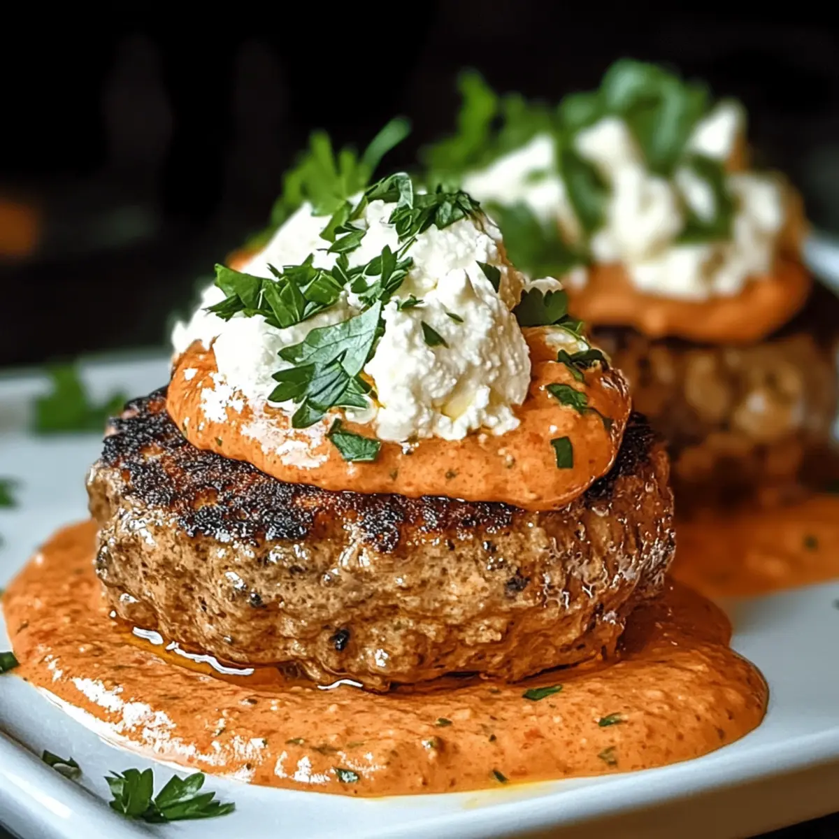 To serve, plate the Keto Feta Burgers, drizzling any remaining sauce on top. Garnish with freshly chopped parsley, additional feta crumbles, and a sprinkle of smoked paprika for an eye-catching presentation. These flavorful burgers are now ready to be enjoyed alongside your favorite low-carb sides!