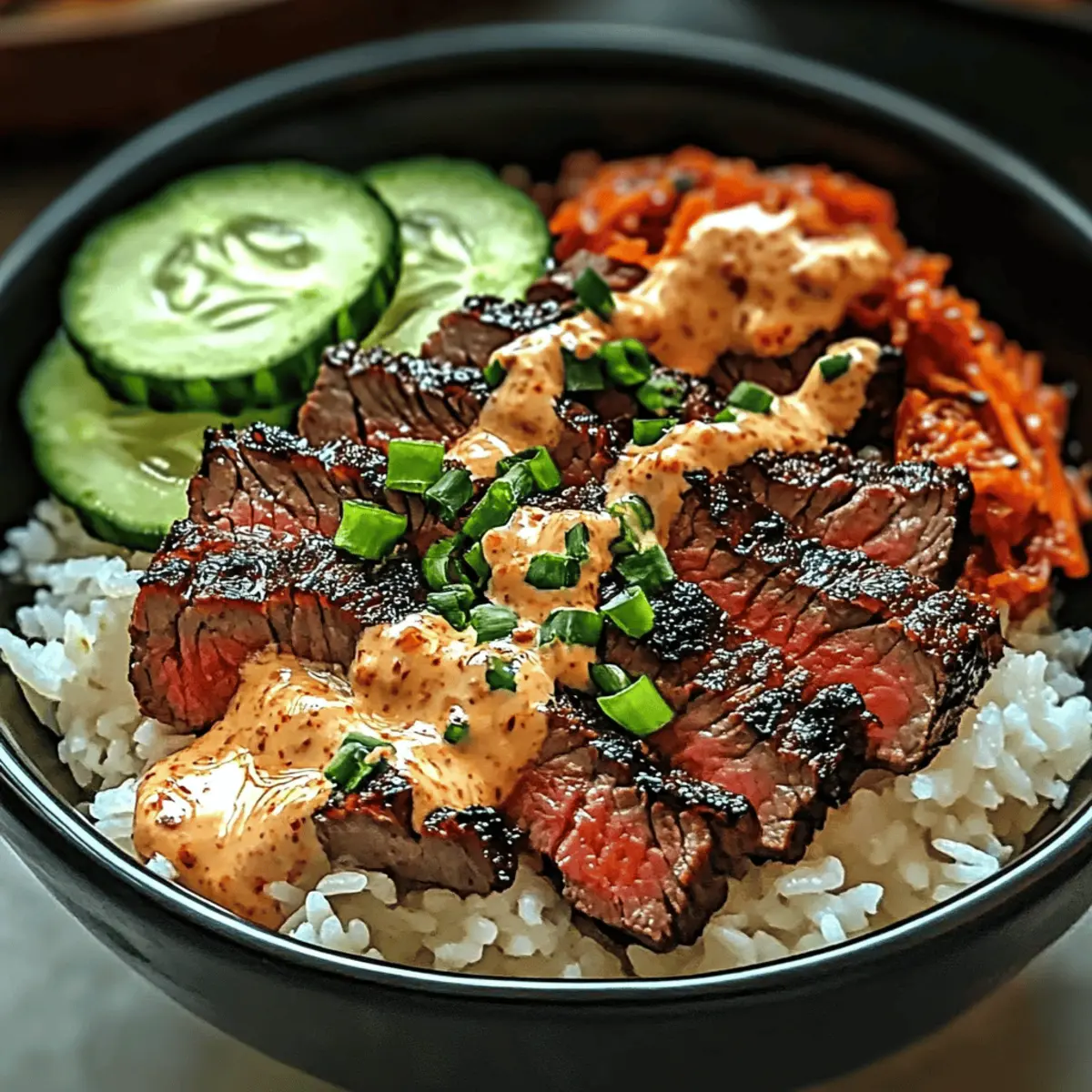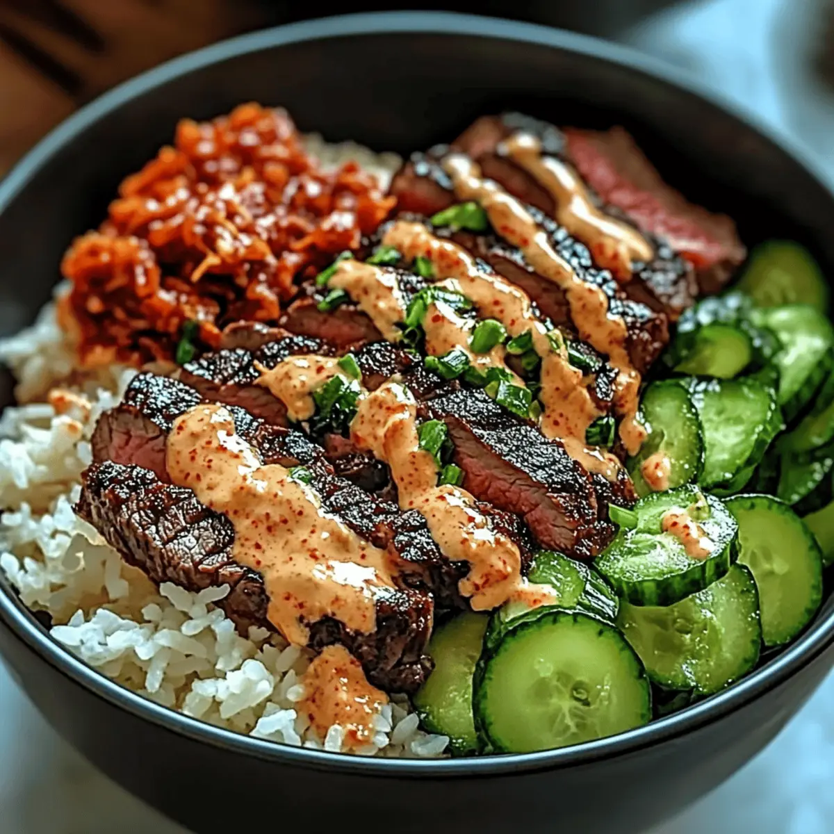 5. In serving bowls, start by layering cooked rice as your base. Next, artfully arrange the sliced steak over the rice. Top each bowl with a generous helping of kimchi, fresh cucumber slices, julienned carrots, and creamy avocado. Sprinkle with chopped green onions, sesame seeds, and fresh cilantro.