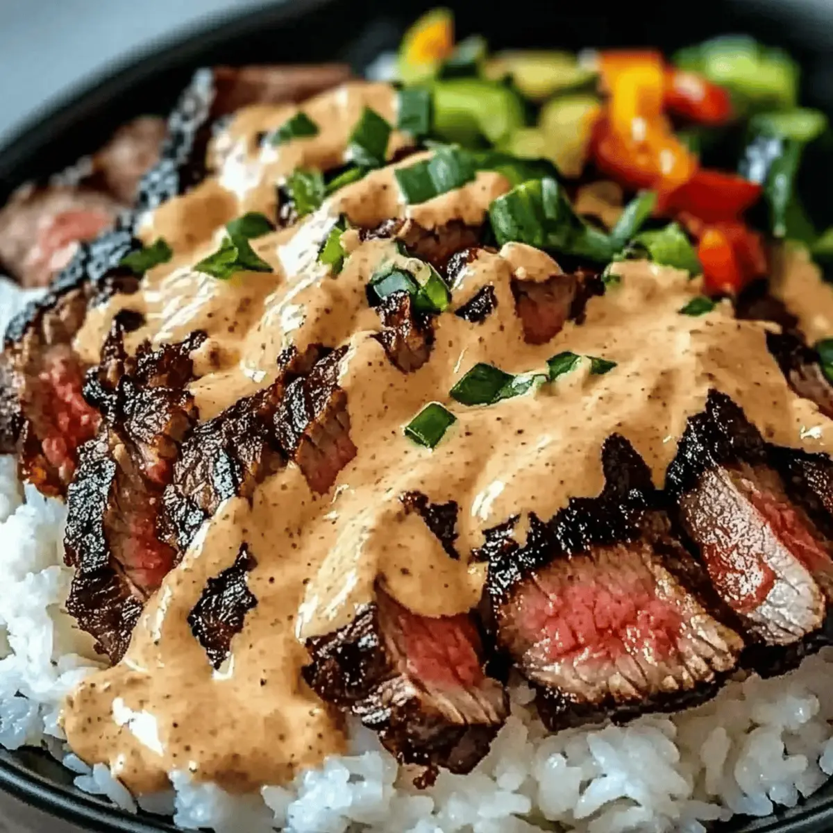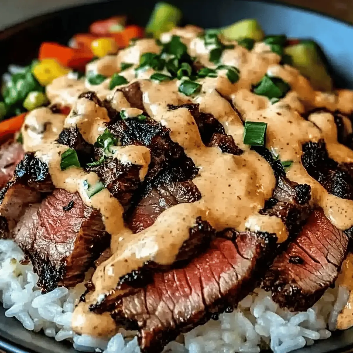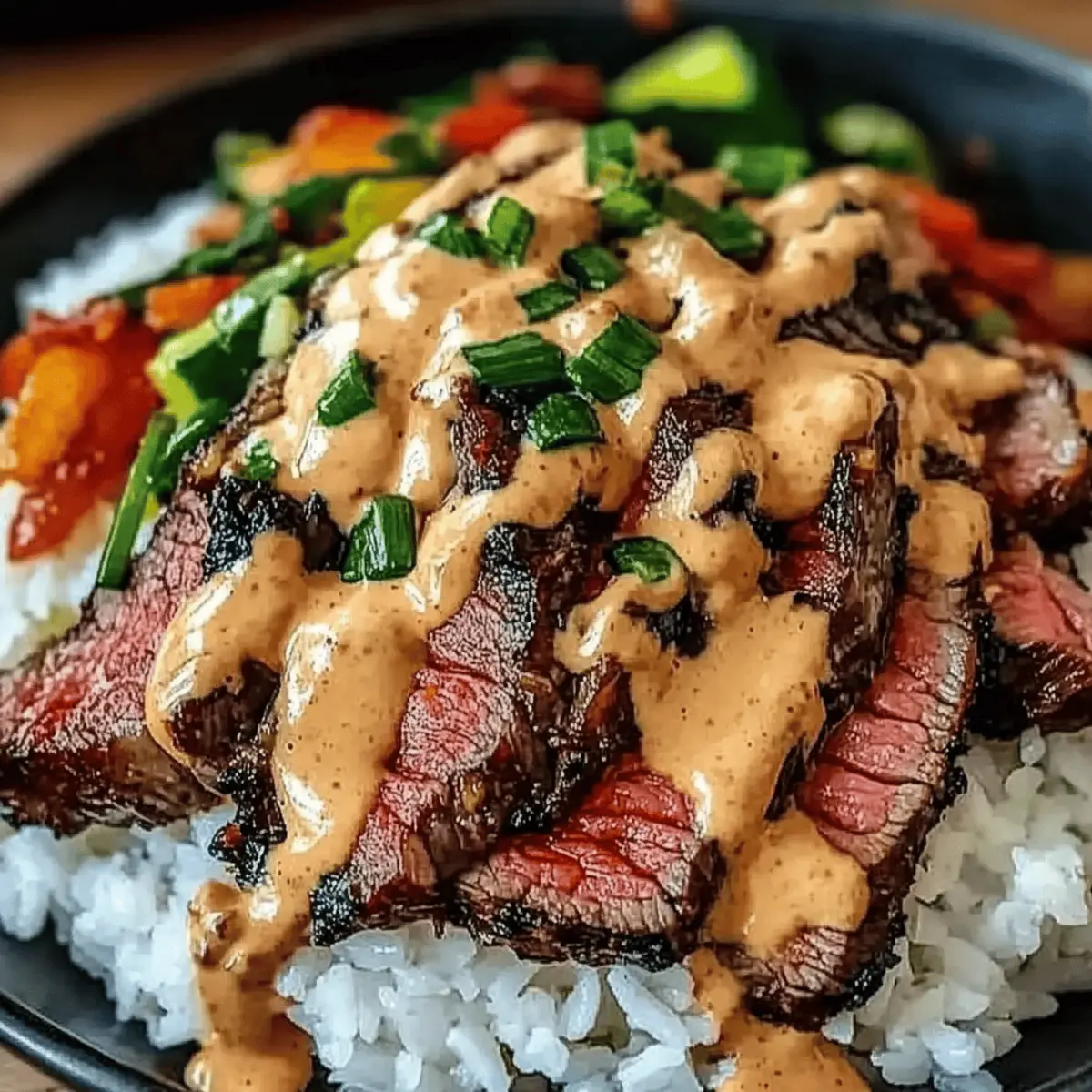 Jump to Recipe Print RecipeAs I stood by the grill, the aroma of marinated flank steak sizzling over high heat transported me straight to the bustling streets of Seoul. These Korean BBQ Steak Rice Bowls with Spicy Cream Sauce are more than just a meal; they’re a vibrant celebration of flavor and comfort that you can whip up in just 35 minutes. With tender steak paired alongside fluffy jasmine rice and crisp vegetables, this dish promises a quick escape from the mundane, making it perfect for those hectic weeknights. Plus, the creamy, spicy drizzle adds a delightful kick that’s sure to impress. Are you ready to make your kitchen feel like a gourmet restaurant? Let’s dive into this delicious adventure together! Why are Korean BBQ Steak Bowls a Must-Try? Quick and Easy: In just 35 minutes, you can enjoy a restaurant-quality meal at home! Perfect for those hectic evenings when you want something satisfying without a lot of fuss. Dynamic Flavors: The harmonious blend of marinated flank steak and a spicy cream sauce delivers a flavor explosion that will tantalize your taste buds. Nutrient-Packed: Packed with colorful vegetables and protein-rich steak, this dish is as wholesome as it is delicious. Customizable Goodness: Feel free to swap out the steak for chicken or tofu, or use different grains like quinoa for a unique twist! Crowd-Pleasing Appeal: Impress your family and friends with this vibrant dish that looks as good as it tastes—ideal for gatherings! Take your taste journey further with Garlic Parmesan Pasta or round out your meal with a side of Honey BBQ Chicken Rice for a full flavor experience that everyone will rave about! Korean BBQ Steak Rice Bowls Ingredients • Ready to create a sumptuous Korean BBQ experience at home? Let’s gather what you need! For the Flank Steak Flank Steak – The star protein, flavorful and tender when marinated and grilled to perfection. Soy Sauce – Adds deep umami flavor; tamari is a great gluten-free substitute. Sesame Oil – Infuses a nutty taste; olive oil can work in a pinch for a milder flavor. Brown Sugar – Balances the saltiness of soy; can be replaced with honey for a different sweetness. Garlic (minced) – Enhances aroma and flavor; always opt for fresh garlic for the best results. Ginger (grated) – Lifts the overall taste with its zesty kick; ground ginger can be used as a last resort. For the Rice and Vegetables Cooked Jasmine Rice – A fluffy base that soaks up all the delicious flavors; cauliflower rice serves as a low-carb swap. Mixed Vegetables (carrots, bell peppers, broccoli) – Adds nutrition and crunch; seasonal veggies can offer delightful variations. Vegetable Oil – Used for sautéing; canola or olive oil are equally great choices. For the Spicy Cream Sauce Sour Cream – Provides creaminess and richness; Greek yogurt makes for a lighter option. Sriracha Sauce – Adds the perfect heat; adjust to your spice tolerance or switch it for chili paste. Lime Juice – Brightens the sauce for a fresh zing; lemon juice can work when limes aren’t at hand. Honey – Sweetens the sauce while counteracting the heat; maple syrup is a vegan alternative. Salt and Pepper – Essential for seasoning to your liking. For the Garnish Sesame Seeds – Sprinkle some on top for extra crunch and a beautiful finish. Green Onions – Adds fresh flavors and a pop of color, enhancing the overall presentation. Dive into this exciting culinary adventure and transform your weeknight dinners with these Korean BBQ Steak Rice Bowls with Spicy Cream Sauce! Step‑by‑Step Instructions for Korean BBQ Steak Rice Bowls with Spicy Cream Sauce Step 1: Marinate the Steak In a bowl, whisk together soy sauce, sesame oil, brown sugar, minced garlic, and grated ginger until well combined. Add the flank steak, ensuring it’s fully coated in the marinade. Cover the bowl with plastic wrap and refrigerate for at least 30 minutes. This step enhances the flavor, making your Korean BBQ Steak Rice Bowls incredibly tasty. Step 2: Prepare the Rice While the steak marinates, cook the jasmine rice according to package instructions. Typically, this involves rinsing the rice, simmering it in water for around 15 minutes, and then fluffing it with a fork. Once cooked, set the fluffy rice aside, allowing it to remain warm and ready to serve as the base for your rice bowls. Step 3: Make the Spicy Cream Sauce In a sleek mixing bowl, combine sour cream, Sriracha, lime juice, honey, salt, and pepper. Whisk the ingredients together until you achieve a smooth, creamy consistency. Taste the sauce and adjust the Sriracha according to your spice preference. This creamy drizzle is the crown jewel of your Korean BBQ Steak Rice Bowls, adding a kick to each delicious bite. Step 4: Cook the Steak Take a grill pan or skillet and heat it over high heat until it’s very hot. Sear the marinated flank steak for about 5-6 minutes on each side for medium-rare, or until it reaches your desired doneness. Look for a beautiful char and a lovely mahogany color. Once cooked, transfer the steak to a cutting board to rest, ensuring it stays juicy. Step 5: Rest the Steak Allow your grilled steak to rest for about 5 minutes. This resting period is crucial, as it allows the juices to redistribute throughout the meat, ensuring that every slice is tender and flavorful. After resting, slice the steak against the grain into thin strips, making it easier to enjoy in your rice bowls. Step 6: Sauté the Vegetables In the same grill pan, lower the heat slightly and add vegetable oil. Toss in your mixed vegetables and sauté for about 5-7 minutes until they are tender-crisp and vibrant in color. Stir occasionally to ensure even cooking, letting the natural flavors shine through. These vegetables bring a fresh crunch to your Korean BBQ Steak Rice Bowls. Step 7: Assemble the Bowls Start layering your Korean BBQ Steak Rice Bowls by placing a generous scoop of jasmine rice in each bowl. Neatly arrange the sliced s