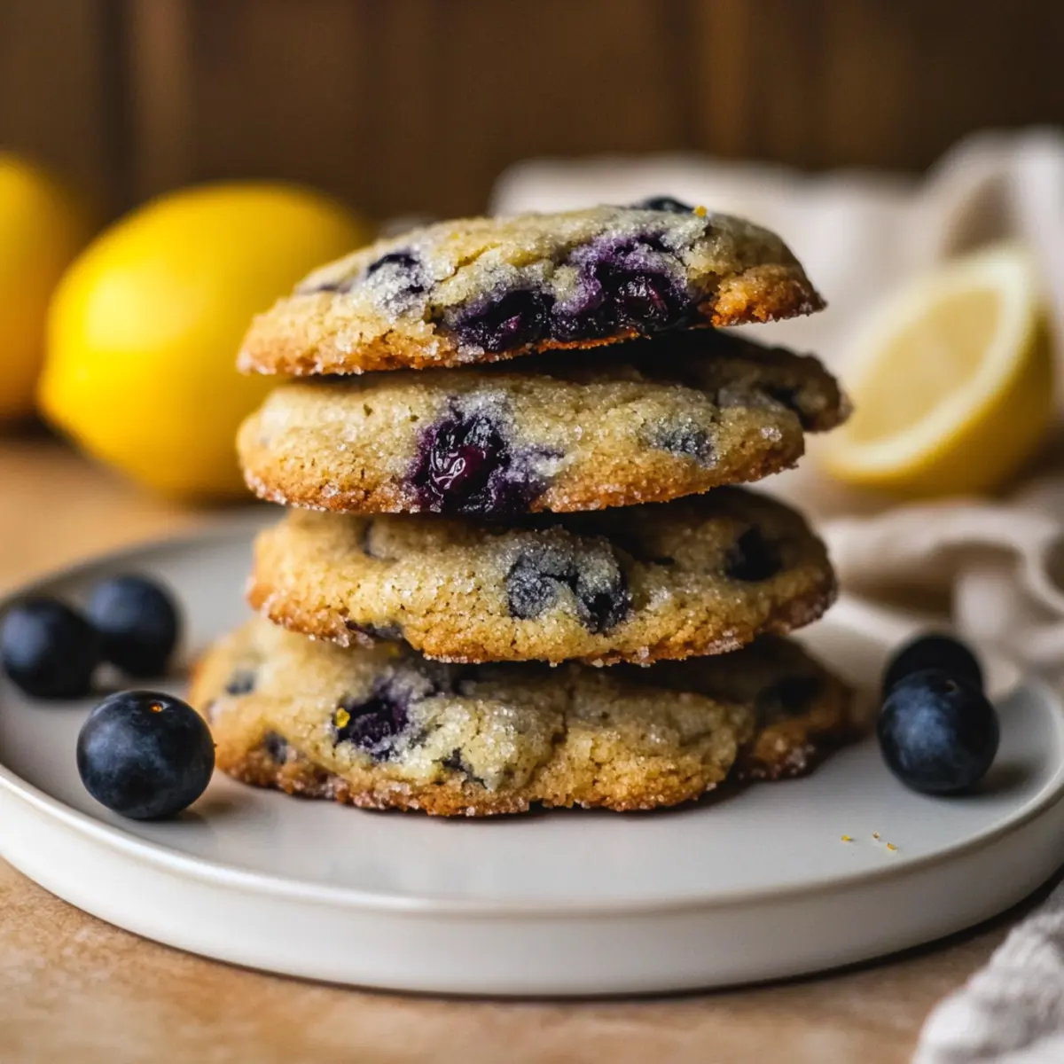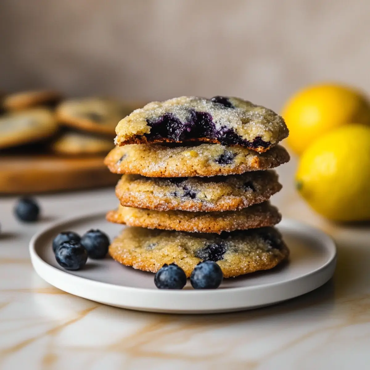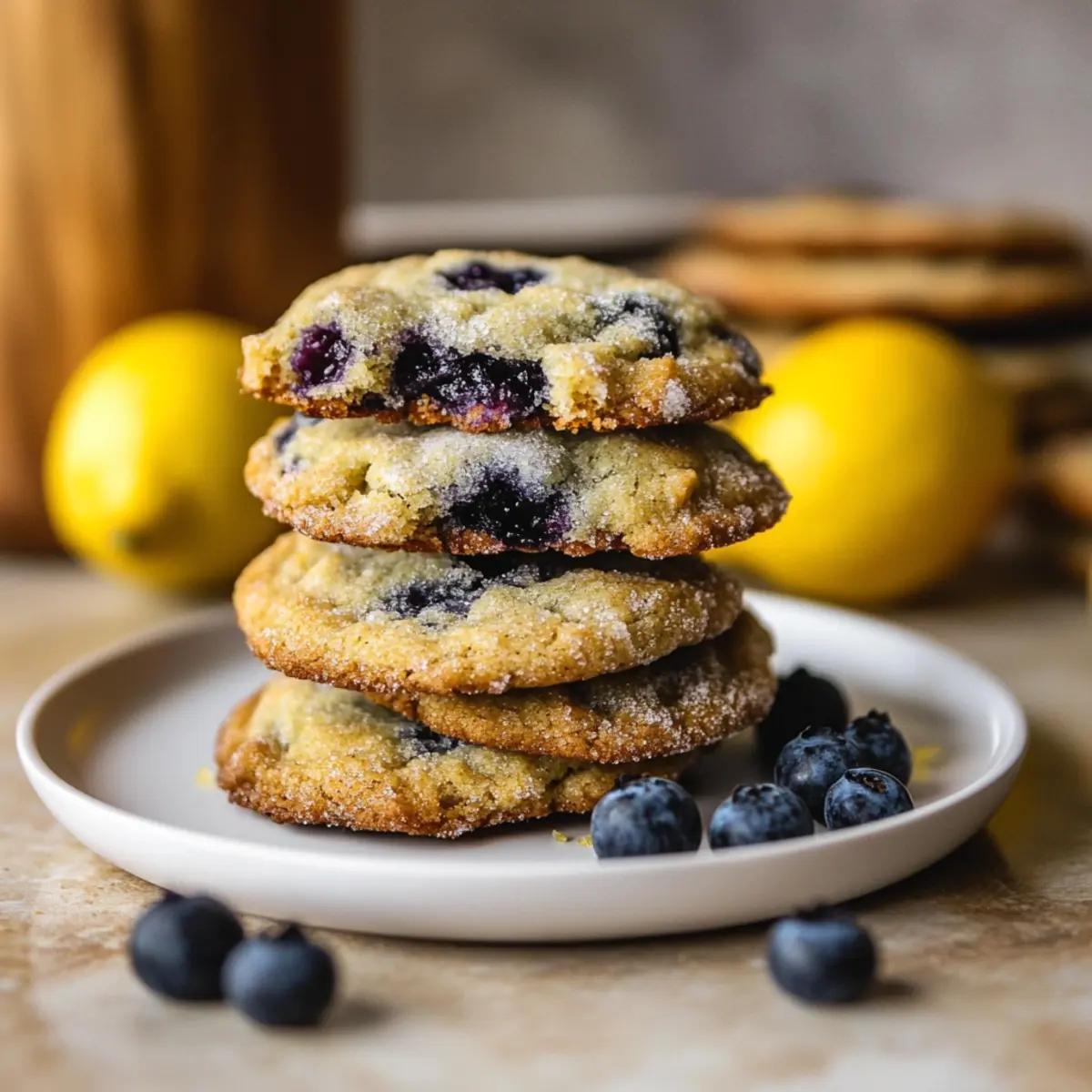 Jump to Recipe Print RecipeStepping into my kitchen one bright afternoon, I was greeted by the sweet fragrance of citrus mingling with fresh blueberries—truly a sensory delight! That’s when I decided it was time to bake a batch of Lemon Blueberry Cookies. These delightful treats feature a soft center and crispy edges, making them as satisfying to nibble as they are simple to whip up. With the perfect balance of zesty lemon and juicy blueberries, these cookies are the ideal addition to any gathering or simply enjoyed with a cup of tea. Plus, they’re freezer-friendly, meaning you can always have a little sweetness on hand. Ready to dive into this easy recipe for Lemon Blueberry Cookies and impress your friends and family? Let’s get started! Why Make Lemon Blueberry Cookies? Irresistible Flavor: The combination of sweet blueberries and zesty lemon creates a vibrant flavor experience that elevates your dessert game. Simple Preparation: With just basic baking skills needed, these cookies are a breeze to whip up and will have everyone asking for the recipe. Perfect for Any Occasion: Whether it’s a sunny picnic, a casual get-together, or a cozy afternoon snack, these cookies fit perfectly. Make-Ahead Friendly: You can freeze the dough for those unexpected cravings, so you’ll have delicious cookies ready whenever the mood strikes. Plus, if you love lemons, check out these Lemon Blueberry Loaf and Lemon Truffles Tangy for more citrusy goodness! Texture Delight: Enjoy the delightful contrast of soft cookie centers and crispy edges that leave a lasting impression on your taste buds. Lemon Blueberry Cookies Ingredients For the Cookies • Unsalted Butter – Softer butter creates a rich and moist cookie. • White Granulated Sugar – The primary sweetener; coconut sugar can be used for a deeper flavor. • Light Brown Sugar – Adds moisture and a lovely caramel hint. • Lemon Zest – Fresh citrus flavor for that vibrant kick; lime zest is a great alternative. • Large Egg – Binds the ingredients and adds necessary structure. • Lemon Juice – Fresh juice gives optimal flavor; lime juice can replace it if needed. • Vanilla Extract – Elevates the overall flavor profile beautifully. • All-Purpose Flour – Provides structure; spoon and level for best accuracy. • Baking Powder & Baking Soda – Ensure they’re fresh for optimal leavening. • Salt – Balances the sweetness and enhances flavor. • Wild Frozen Blueberries – They give intense blueberry flavor; fresh blueberries may add extra moisture. For the Lemon Sugar • Lemon Sugar – A mix of sugar with extra lemon zest for a zesty coating on your cookies. Dive into this wonderful journey of baking Lemon Blueberry Cookies that are bound to brighten your day! Step‑by‑Step Instructions for Lemon Blueberry Cookies Step 1: Cream the Butter and Sugars In a large mixing bowl, cream together 1 cup of softened unsalted butter, ¾ cup of white granulated sugar, and ¾ cup of light brown sugar using an electric mixer. Beat on medium speed for about 3-4 minutes until the mixture is light and fluffy. As you mix, the sugars will dissolve, creating a creamy texture that forms the base for your delicious Lemon Blueberry Cookies. Step 2: Add Egg and Flavorings Next, add 1 large egg, 2 tablespoons of freshly squeezed lemon juice, 1 tablespoon of lemon zest, and 1 teaspoon of vanilla extract to your creamed mixture. Continue to mix on low speed for about 1-2 minutes, scraping the sides of the bowl to ensure everything is well incorporated. You will notice a fragrant combination of citrus and vanilla starting to emerge. Step 3: Combine Dry Ingredients In a separate bowl, sift together 2 ½ cups of all-purpose flour, 1 teaspoon of baking powder, ½ teaspoon of baking soda, and ½ teaspoon of salt. This step is crucial for evenly distributing the leavening agents. After sifting, gently fold the dry ingredients into the wet mixture using a rubber spatula, making sure to just combine until no dry flour remains. This will help maintain the softness of the Lemon Blueberry Cookies. Step 4: Fold in Blueberries Once the cookie dough is formed, gently fold in 1 cup of wild frozen blueberries, ensuring they are evenly distributed without overmixing. Overmixing can break the berries and affect the dough’s integrity. The wild blueberries will add bursts of flavor to your cookies, making each bite a delightful treat. Step 5: Scoop and Chill the Dough Using a 2 oz ice cream scoop, portion out the cookie dough and place it onto a parchment-lined baking sheet, leaving enough space between each scoop. Cover the baking sheet with plastic wrap and refrigerate the dough for 1-2 hours until it is fully chilled. Chilling the dough helps the Lemon Blueberry Cookies maintain their shape during baking. Step 6: Prepare Lemon Sugar While the dough is chilling, prepare your lemon sugar by combining ¼ cup of granulated sugar with the zest of 1 lemon in a small bowl. Use your fingers to rub the lemon zest into the sugar, releasing the oils and enhancing the aroma. This mixture will give your cookies a delightful citrusy coating before baking. Step 7: Preheat the Oven and Roll Dough Preheat your oven to 350°F (175°C). Once the dough is chilled, roll each dough ball in the prepared lemon sugar until fully coated. This step not only adds flavor but also creates a beautiful finish on your cookies. Place the rolled dough back onto the baking sheet, spacing them about 2 inches apart. Step 8: Bake the Cookies Bake the cookies in the preheated oven for 16-17 minutes, flipping the baking sheet halfway through to ensure even baking. The cookies are done when they are lightly golden around the edges and still soft in the center. Remove them from the oven and shape them using a large cutter to smooth the edges immediately while they’re warm. Step 9: Cool the Cookies Let the Lemon Blueberry Cookies cool on the baking sheet for about 5 minutes before transferring them