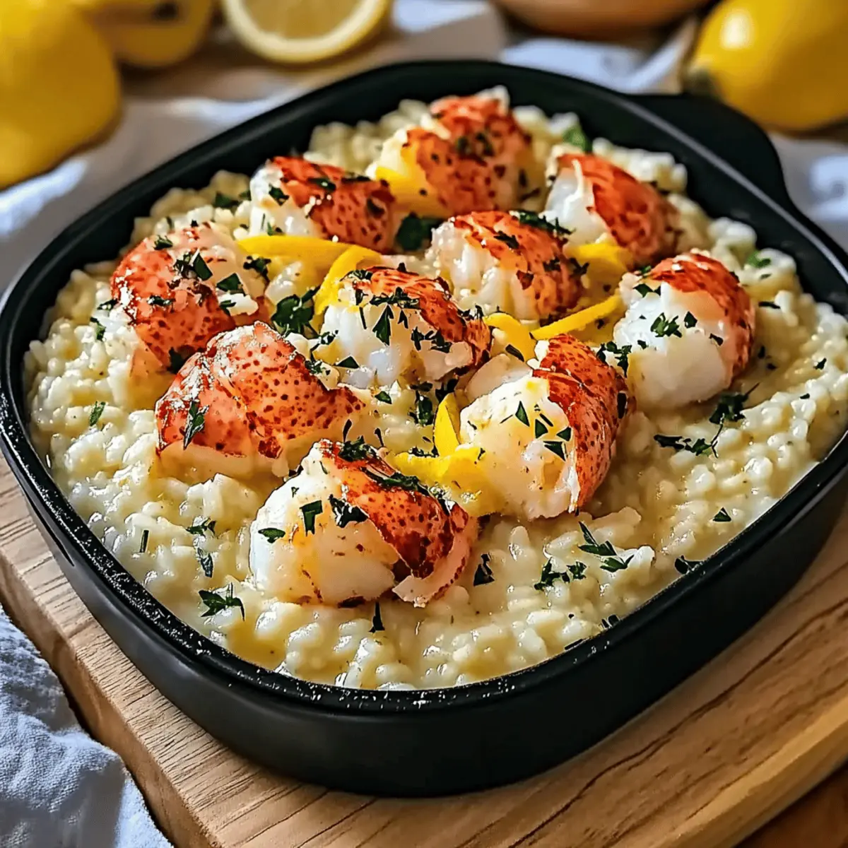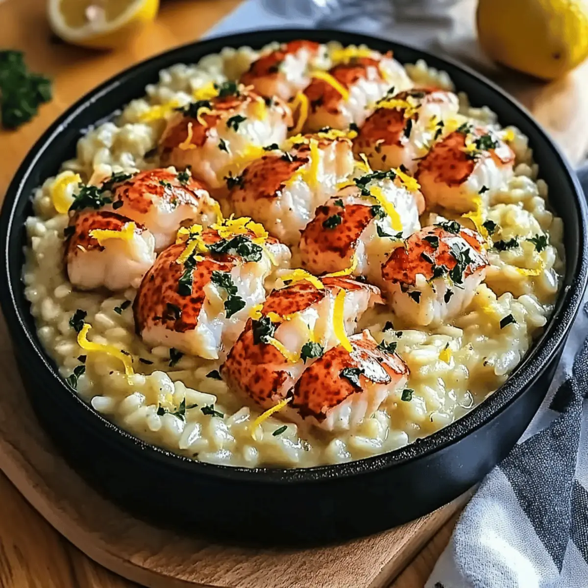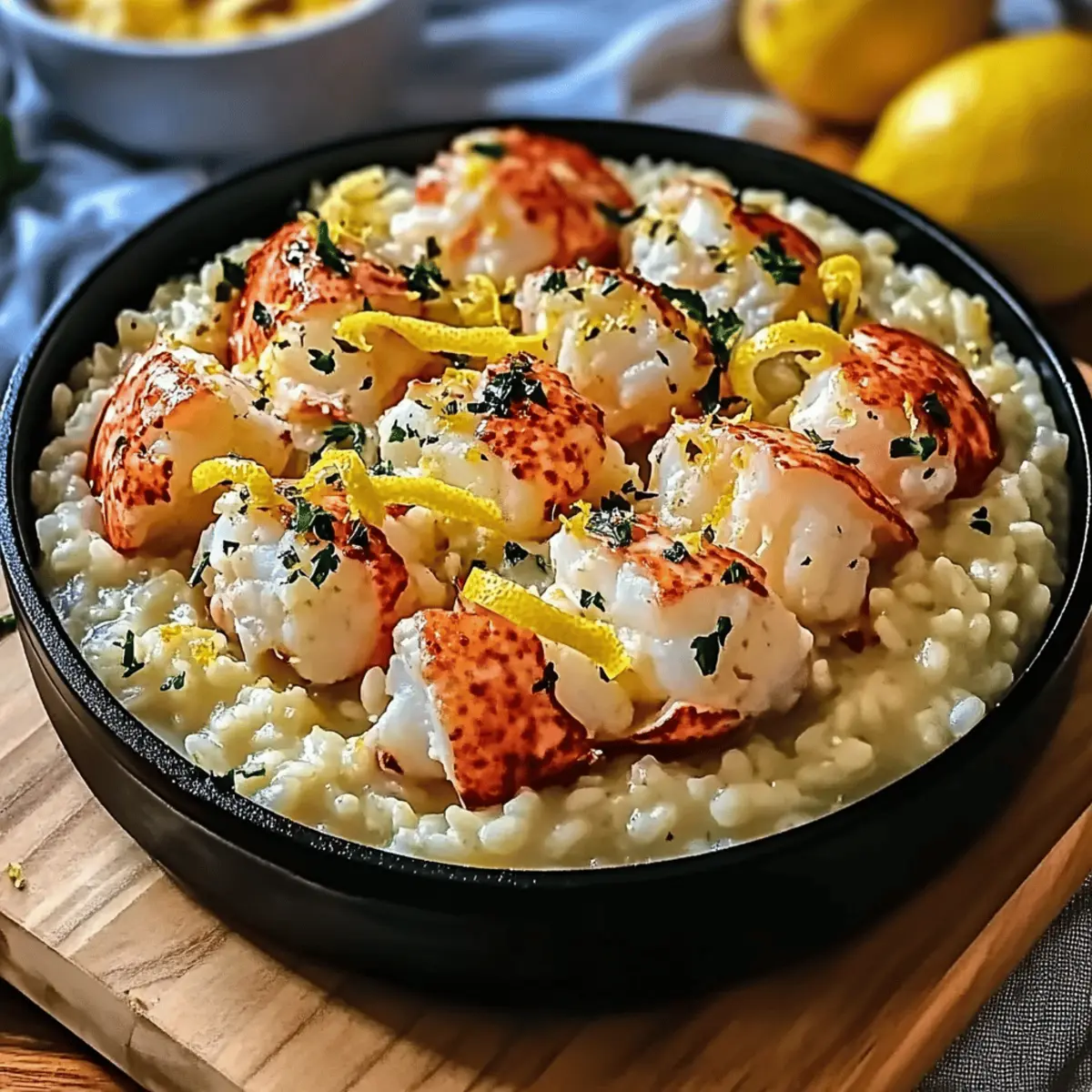 Jump to Recipe Print RecipeAs I stirred a pot of creamy goodness, I couldn’t help but realize how each swirl of Lemon Butter Lobster Risotto takes me to the heart of culinary luxury right in my own kitchen. This delightful dish perfectly marries the sweet, tender flavors of lobster with the comforting, velvety texture of risotto, all brightened by zesty lemon and savory Parmesan. Best of all, this precious recipe allows you to create a restaurant-quality experience without the fuss—you’ll find it surprisingly easy to whip up! Ideal for special occasions or a comforting night in, this dish will impress any crowd and captivate your taste buds. Ready to elevate your dinner game? Let’s dive into the world of risotto magic together! Why is This Risotto So Irresistible? Luxurious Indulgence: Imagine the creamy texture of Arborio rice combined with sweet lobster—it’s pure decadence in every bite. Bright Flavors: The zesty lemon juice and zest awaken your palate, ensuring that this dish is not just rich but refreshingly balanced. Simplicity Meets Elegance: You don’t need to be a chef to make a restaurant-quality dish like this at home. With straightforward techniques, anyone can achieve perfect risotto. Crowd-Pleasing Delight: This Lemon Butter Lobster Risotto is perfect for gatherings, impressing your guests with its gourmet flair. Consider pairing it with a delightful glass of chilled Chardonnay for an evening to remember. Versatile Variations: Not just for special occasions, you can customize it! Try mixing in sautéed asparagus for an extra veggie boost, or swap out lobster for shrimp if desired. Your creativity knows no bounds! Lemon Butter Lobster Risotto Ingredients For the Risotto Lobster – The star ingredient providing sweet, tender, and slightly briny flavor; substitute with shrimp if needed for a different taste. Arborio Rice – Essential for risotto, high in starch for creaminess; do not substitute with regular rice as cooking time will vary significantly. Parmesan Cheese – Adds nutty, salty depth; freshly grated is recommended, while Pecorino Romano can substitute for a more robust flavor. Lemon Juice and Zest – Adds brightness that cuts through the richness; it’s essential for balancing the dish and enhancing flavors. Dry White Wine – Enhances flavors in the risotto; use Sauvignon Blanc or Pinot Grigio for best results; omit and replace with broth and apple cider vinegar if necessary. Warm Seafood Broth – Infuses flavor and depth into the risotto; opt for low-sodium broth and chicken broth can substitute if needed. For Serving Extra Parmesan – For garnishing when serving; it adds a nice finishing touch. Chives or Parsley – Fresh herbs to sprinkle on top for a burst of color and flavor to elevate your dish. Lemon Wedges – Serve on the side for a fresh squeeze of lemon to enhance flavors right before enjoying. Step‑by‑Step Instructions for Lemon Butter Lobster Risotto Step 1: Prepare the Broth In a medium saucepan, heat your warm seafood broth over low heat, ensuring it’s hot but not boiling. This sets the stage for your creamy Lemon Butter Lobster Risotto. Keeping the broth warm allows the rice to cook evenly as you add it gradually, helping to achieve that perfect risotto texture. Step 2: Sauté Aromatics In a large skillet, melt 2 tablespoons of unsalted butter over medium heat. Add minced garlic and sauté for about 1 minute until fragrant. Then, stir in 1 cup of Arborio rice, toasting it lightly for 2-3 minutes until it becomes slightly translucent. This step builds a foundation of flavor for your decadent risotto. Step 3: Deglaze with Wine Pour in ½ cup of dry white wine, such as Sauvignon Blanc, into the skillet. Stir continuously, allowing the rice to absorb the wine completely, which will take around 2-3 minutes. You’ll know it’s ready when the rice has a glossy appearance and virtually all the liquid has evaporated, enriching your Lemon Butter Lobster Risotto. Step 4: Gradually Add Broth Begin adding your warm seafood broth, ½ cup at a time, stirring the rice constantly. Allow each addition to be absorbed before adding more; this should take about 18-20 minutes total. The key is to maintain a gentle simmer while stirring to coax out the starches, creating a creamy consistency as the risotto cooks to the perfect al dente. Step 5: Incorporate Lobster and Citrus When your risotto reaches a creamy, al dente texture, gently fold in 1 cup of cooked lobster meat, 2 tablespoons of fresh lemon juice, and the zest of 1 lemon. Stir until everything is well combined and heated through, allowing the flavors to meld beautifully. This step truly embodies the elegance of the Lemon Butter Lobster Risotto. Step 6: Finish with Parmesan Remove the skillet from heat and gradually incorporate ½ cup of freshly grated Parmesan cheese. Stir until the cheese melts smoothly into the risotto, creating a luxurious, velvety finish. Taste your dish and adjust seasoning with salt and freshly cracked black pepper, making sure each bite is perfection. Expert Tips for Lemon Butter Lobster Risotto Warm Broth is Key: Always use warmed seafood broth while cooking; this helps maintain the temperature and ensures the rice cooks evenly without stalling. Gentle Stirring: Stir the risotto gently. Vigorous stirring can break the grains and lead to a mushy texture, ruining your creamy Lemon Butter Lobster Risotto. Gradual Additions: Add the broth slowly, ½ cup at a time. Allow the liquid to fully absorb before adding more; this technique coax out the necessary starches for that perfect creaminess. Season Late: Taste the risotto at the end and adjust the seasoning. Adding salt too early can result in an overly salty dish, especially since lobster and broth already contribute flavor. Lobster Temperature: Make sure your lobster is pre-cooked and at room temperature before adding it to the risotto. This ensures it warms through quickly without overcooking during the final sta