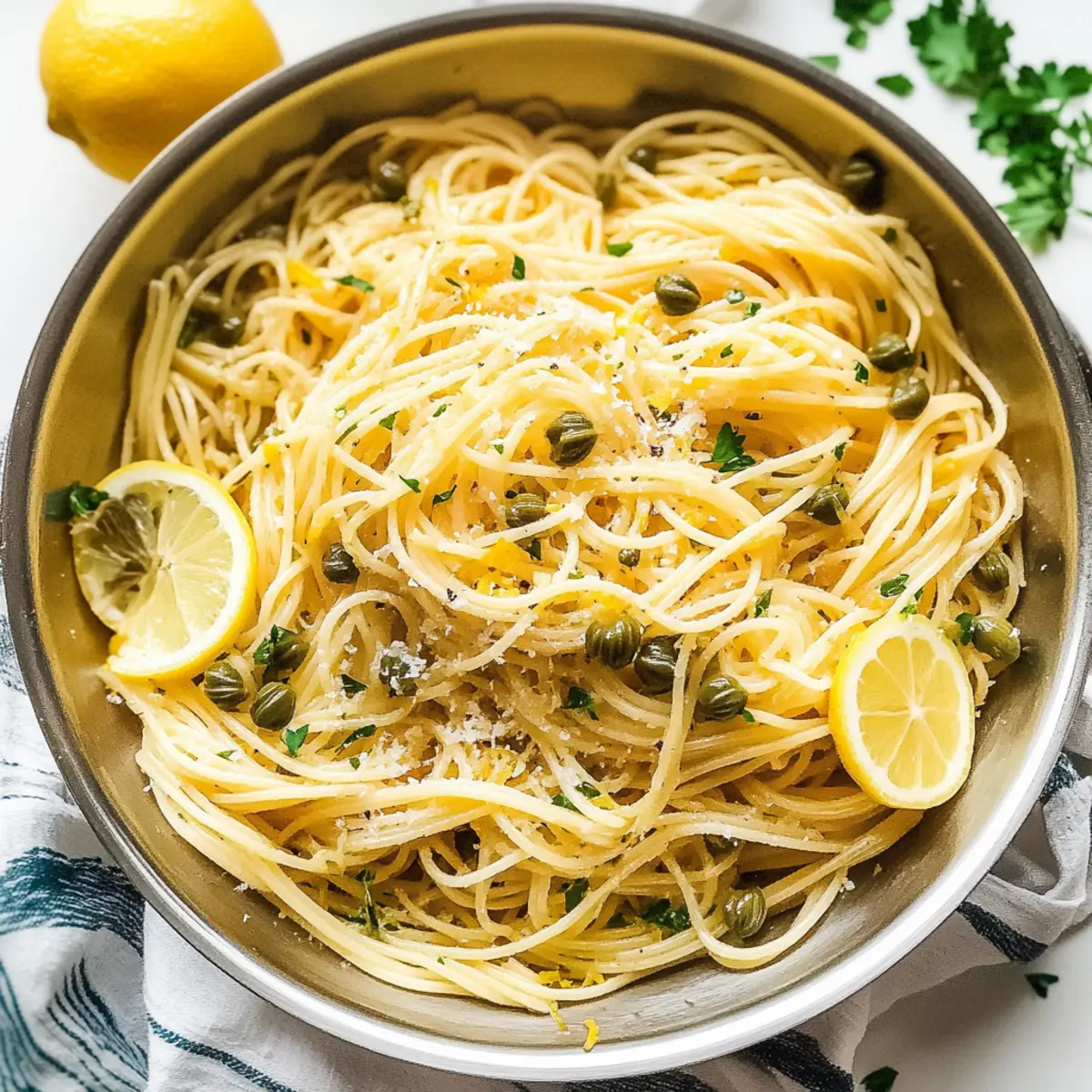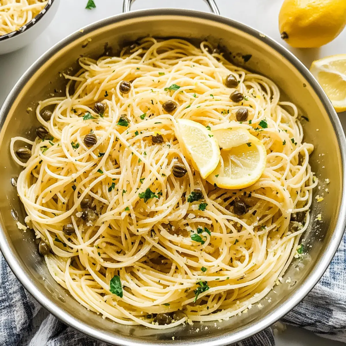 Jump to Recipe Print RecipeThe tangy zing of fresh lemons and the briny pop of capers dance in the air as I prepare my quick Lemon Caper Pasta. In just 20 minutes, you can create a meal that feels like a warm embrace after a long day—a true lifesaver for busy weeknights! This dish is a delightful vegetarian-friendly option, bursting with heartwarming flavor while being incredibly simple to whip up. Whether you savor it as a stand-alone delight or pair it as a side to grilled chicken or succulent shrimp, it’s sure to put a bright smile on your face. Curious how to bring this refreshing recipe to your table? Let’s dive in! Why is Lemon Caper Pasta a Must-Try? Quick and Easy: In just 20 minutes, this dish fits perfectly into any busy schedule, making it ideal for those hectic weeknights. Burst of Flavor: The combination of tangy lemons and savory capers creates a refreshing taste sensation that will leave your taste buds dancing. Versatile Delight: Whether served as a main dish or a stunning side alongside grilled meats, its adaptability makes it a great addition to any meal. Vegetarian-Friendly: Enjoyed by everyone, this recipe caters to a variety of diets without losing its rich flavor. Crowd-Pleaser: It’s the perfect choice for family dinners, impressing guests with its vibrant colors and inviting aroma. For more delightful pasta dishes, you might enjoy our Garlic Parmesan Pasta or Butter Shrimp Pasta. Lemon Caper Pasta Ingredients For the Pasta • Spaghetti (8 ounces) – This forms the delightful base of your dish; feel free to experiment with other pasta shapes! For the Sauce • Butter (2 tablespoons, divided) – Adds rich flavor and a glossy finish to the sauce; a little more can amp up the creaminess. • Olive Oil (2 tablespoons) – Essential for sautéing garlic and enhancing flavor; can be substituted with another oil if desired. • Garlic (3-4 cloves, minced) – Provides aromatic depth; adjust based on your preferred garlic intensity. • White Wine or Vegetable Broth (1/4 cup) – Adds complexity to your sauce; opt for broth for a non-alcoholic version. • Lemon (1, zested and juiced) – Infuses bright acidity and freshness; zest enhances the lemon’s flavor beautifully. • Capers (1.5 ounces, drained but not rinsed) – Bring a delightful briny kick; rinse if you want a milder taste. • Fresh Parsley (1/4 cup, chopped) – Lifts the dish with freshness and color; substitute with basil for a different herbaceous note. • Kosher Salt and Black Pepper – Key for balancing flavors; season to your taste and adjust based on other salt sources. Embrace the piquant charm of this Lemon Caper Pasta as you gather these simple, yet flavorful ingredients! Step‑by‑Step Instructions for Lemon Caper Pasta Step 1: Boil the Pasta Begin by bringing a large pot of heavily salted water to a rolling boil over high heat. Once boiling, add 8 ounces of spaghetti and cook according to package directions until al dente, about 8-10 minutes. Reserve ½ cup of the pasta water before draining the pasta in a colander. This starchy water will help achieve the perfect sauce consistency later. Step 2: Sauté the Garlic While the pasta cooks, heat a large skillet over medium heat and add 1 tablespoon of butter along with 2 tablespoons of olive oil. Once the butter has completely melted, add minced garlic, sautéing for 30-60 seconds until fragrant and golden. Be careful not to burn the garlic, as it adds depth to the Lemon Caper Pasta. Step 3: Add Liquid Ingredients Pour in ¼ cup of white wine or vegetable broth into the skillet, allowing it to simmer gently for 1-2 minutes. This step will let the liquid reduce slightly and intensify in flavor, creating a savory base for your sauce. Stir occasionally, keeping an eye on the mixture as it thickens. Step 4: Incorporate Flavor Elements To the simmering sauce, add the remaining tablespoon of butter, lemon zest, lemon juice, drained capers, and chopped parsley. Stir everything together, letting it simmer for about 1 minute. This is where the recipe truly comes alive, as the zesty, savory aromas envelop your kitchen. Step 5: Combine the Pasta and Sauce Once the pasta is drained, add it directly to the skillet with the sauce. Toss everything together thoroughly, ensuring the pasta is fully coated. If the sauce seems too thick, gradually add some reserved pasta water until you achieve your desired creamy consistency for the Lemon Caper Pasta. Step 6: Season and Serve Season the dish with kosher salt and freshly ground black pepper to taste, mixing well. For an extra touch of brightness, garnish with additional parsley and lemon wedges before serving. This vibrant Lemon Caper Pasta is now ready to be enjoyed, either as a satisfying main course or an elegant side dish. Make Ahead Options This Lemon Caper Pasta is perfect for meal prep, allowing you to enjoy a fresh and satisfying dish without the last-minute hassle! You can prepare the sauce up to 24 hours in advance by making the sautéed garlic mixture, adding the lemon juice, zest, capers, and parsley, then storing it in an airtight container in the refrigerator. To maintain freshness and flavor, avoid tossing in the pasta until you’re ready to serve. When it’s time to enjoy your meal, simply cook the pasta, reheat the sauce in a skillet, and mix them together, adding a splash of reserved pasta water to achieve the perfect consistency. Enjoy this delicious dish with minimal effort and maximum flavor! How to Store and Freeze Lemon Caper Pasta Fridge: Store any leftover Lemon Caper Pasta in an airtight container for up to 3 days. Reheat gently on the stovetop with a splash of water to revive the creamy sauce. Freezer: Although it’s best fresh, you can freeze Lemon Caper Pasta in a freezer-safe container for up to 2 months. Thaw in the fridge overnight before reheating. Airtight Wrapping: Wrap individual servings tightly in plastic wrap before placing in the freezer to prevent freezer burn a