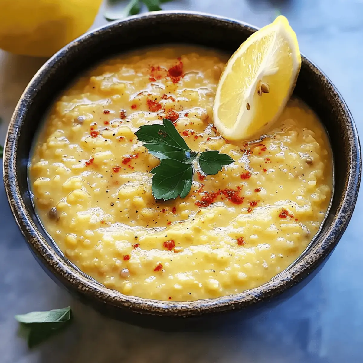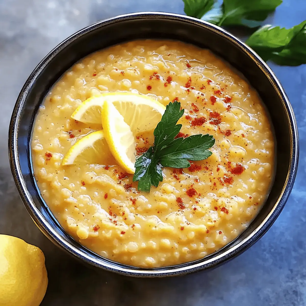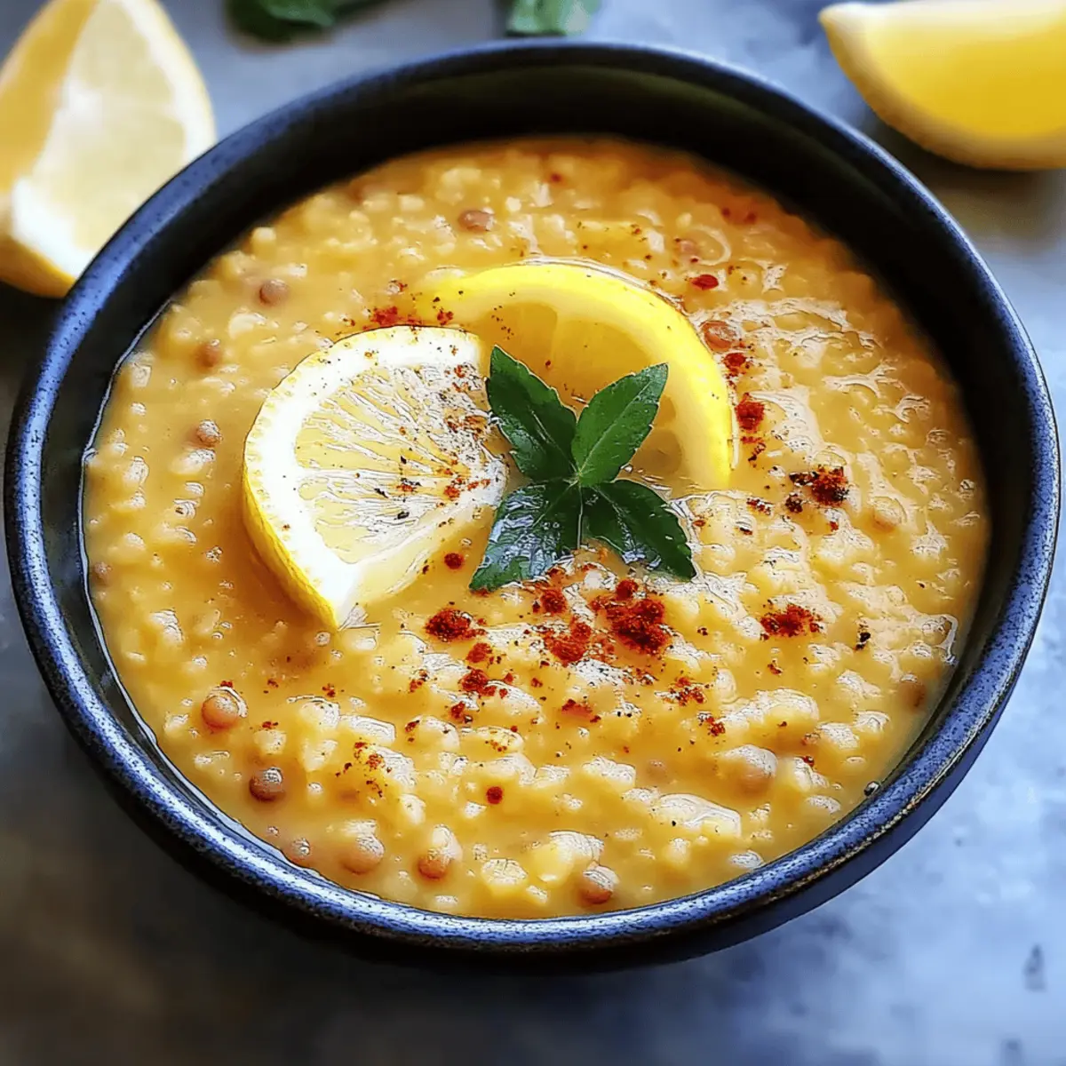 Jump to Recipe Print RecipeAs I stood in my kitchen, the warm aroma of sautéed garlic and spices began to wrap around me like a cozy blanket. This Lebanese Lemon Lentil Soup has a way of transforming even the simplest moments into something truly special. With ingredients like turmeric and fresh lemon, this comforting dish not only tantalizes the taste buds but also serves as a wholesome vegan and gluten-free one-pot meal. It’s the perfect choice for a quick weeknight dinner or meal prep, taking under an hour to bring vibrant citrusy goodness to your table. Every spoonful is a reminder that healthy eating can be both satisfying and delicious. Curious how to make this delightful soup a staple in your kitchen? Let’s dive into the recipe! Why Make Lemon Lentil Soup? Comforting, this soup warms the soul with its hearty ingredients and aromatic spices. Versatile, it easily adapts to your pantry staples—try adding carrots or zucchini for a flavor boost! Nutritious, packed with protein-rich lentils and vibrant lemon, it’s a wholesome choice for any meal. Quick to make, it requires just one pot and under an hour, perfect for busy weeknights. For a refreshing drink to pair with your meal, consider a glass of Whipped Pink Lemonade. Enjoy making this zesty dish a delightful staple in your home! Lemon Lentil Soup Ingredients • Discover the essential ingredients for a delightful Lemon Lentil Soup below! For the Base Olive Oil – Adds richness and helps sauté the aromatics; for a twist, try coconut oil. Onion – Provides foundational flavor; shallots or leeks make great substitutes. Garlic – Enhances the overall savory taste; adjust for more or less intensity. Cumin – Offers depth and earthiness; coriander can be a quick substitute. Turmeric – Contributes a warm color and flavor; freshly grated gives a punchier taste. Paprika – Adds mild spiciness and a smoky flavor; smoked paprika enhances the dish. For the Soup Red Lentils – The star ingredient for creaminess; brown or green lentils work too, just adjust cooking time. Rice – Provides texture; use quinoa or skip it for a lower-carb option. Vegetable Broth – The flavorful base of the soup; ensure gluten-free if needed. Salt and Pepper – Essential for seasoning; adjust to your taste preferences. For the Finish Fresh Lemon Juice – Brightens and elevates the soup’s flavor; zest adds an extra citrus kick. Step‑by‑Step Instructions for Lemon Lentil Soup Step 1: Heat Olive Oil In a Dutch oven, heat 2 tablespoons of olive oil over medium-high heat. Allow the oil to shimmer, which indicates it’s ready. This will create a rich base for the aromatics, essential for the flavorful Lemon Lentil Soup that is to follow. Step 2: Sauté Aromatics Add 1 diced onion and 3 minced garlic cloves to the pot. Sauté these for about 5 minutes, stirring occasionally until the onion is translucent and soft. This step fills your kitchen with inviting aromas that will set the stage for the soup’s delicious flavor. Step 3: Introduce Spices Stir in 1 teaspoon each of cumin, turmeric, and paprika. Cook for another minute, ensuring the onions and garlic are well-coated in the spices. You’ll notice the spices starting to bloom, releasing their fragrant scents, which adds depth to your Lemon Lentil Soup. Step 4: Add Base Ingredients Incorporate 1 cup of red lentils and ½ cup of rice into the pot, alongside salt and pepper to taste. Cook these for 3-5 minutes, stirring frequently so they mix well with the spices and absorb the flavors, enhancing the creamy texture of the soup. Step 5: Pour in Broth Add 6 cups of vegetable broth to the mixture and bring the contents to a rolling boil. Once boiling, reduce the heat to low and let it simmer. This process typically takes around 30-35 minutes, allowing the lentils and rice to soften and meld together beautifully. Step 6: Monitor Soup Progress Stir occasionally as the soup simmers. If you notice it becoming too thick, feel free to add more broth to reach your desired consistency. Aim for a creamy yet hearty texture that embodies the essence of a comforting Lemon Lentil Soup. Step 7: Add Fresh Lemon Juice Once the lentils and rice are soft and cooked through, remove the pot from heat. Stir in the juice of 1 fresh lemon, adjusting seasoning as needed. The lemon brightens the entire dish, giving your soup the signature zesty flavor that makes it truly special. Step 8: Blend for Smoothness For a creamier soup, use an immersion blender and puree portions of the soup to your liking. This will yield a smooth and velvety texture while still leaving some lentils whole for that hearty feel in the Lemon Lentil Soup. Step 9: Serve Warm Ladle the hot soup into bowls and serve immediately, ideally with pita or crusty bread on the side. The soup is not only warming but also nourishing, making it an ideal one-pot meal that everyone will love. Make Ahead Options These Lemon Lentil Soup preparations are perfect for busy home cooks looking to save time without sacrificing flavor! You can chop the onion and garlic and store them in an airtight container in the refrigerator up to 3 days in advance. Additionally, measure out and combine the spices (cumin, turmeric, paprika) so they’re ready to go when it’s time to cook. The soup itself can be made ahead and stored in the refrigerator for up to 4 days or even frozen for up to 3 months. To reheat, simply warm on the stove over medium heat until heated through, adding a splash of vegetable broth if needed to maintain its creamy consistency. Enjoy delicious, homemade Lemon Lentil Soup with minimal effort on those busy weeknights! Expert Tips for Lemon Lentil Soup Texture Control: For a thicker Lemon Lentil Soup, reduce the amount of broth you add or blend part of the soup to create a creamier consistency. Herb Enhancements: Consider adding fresh herbs like parsley or cilantro right before serving to elevate the flavor and add a splash of color. Spice Balance: If you pre