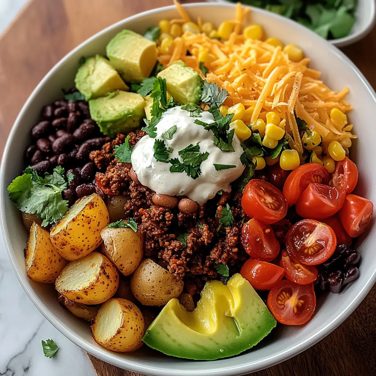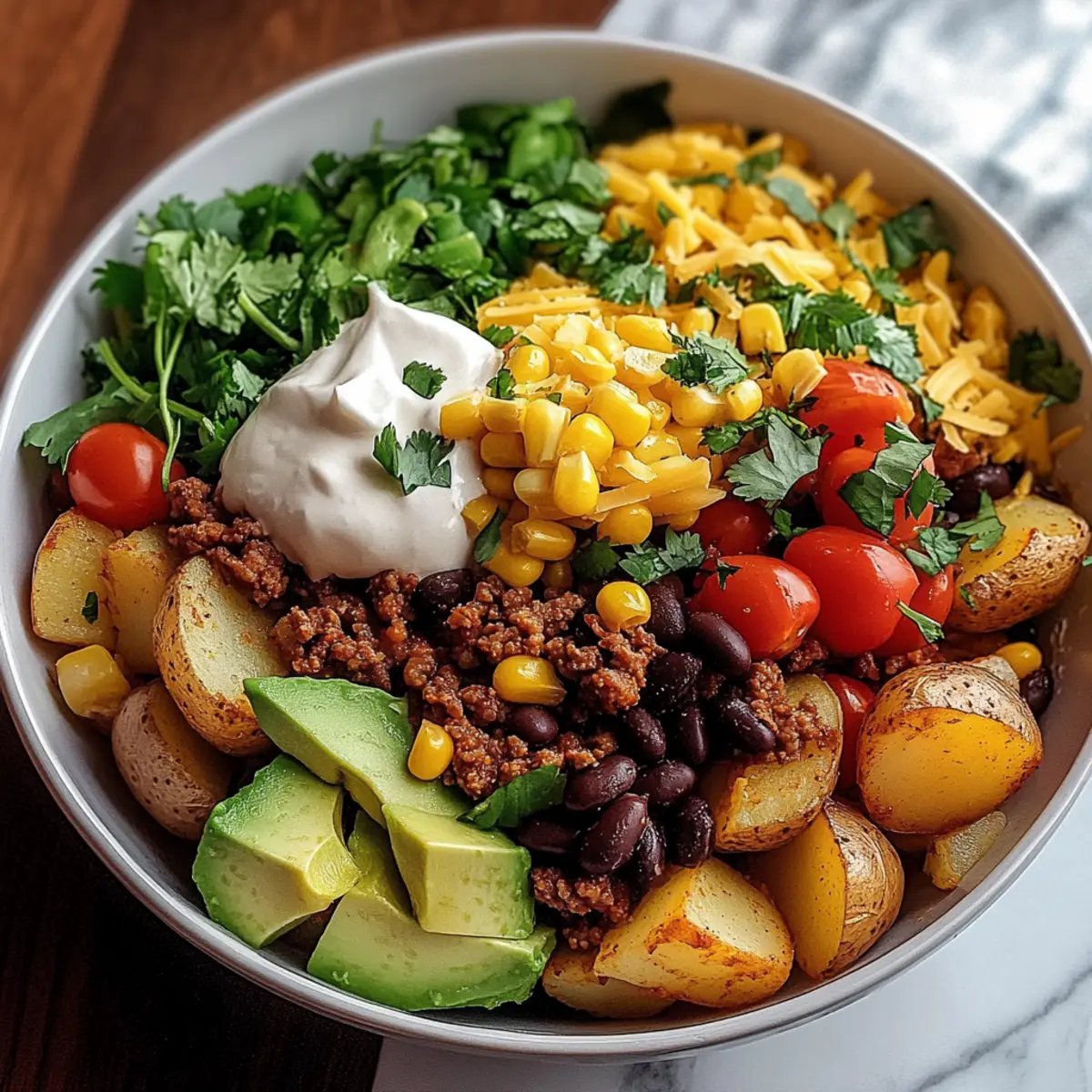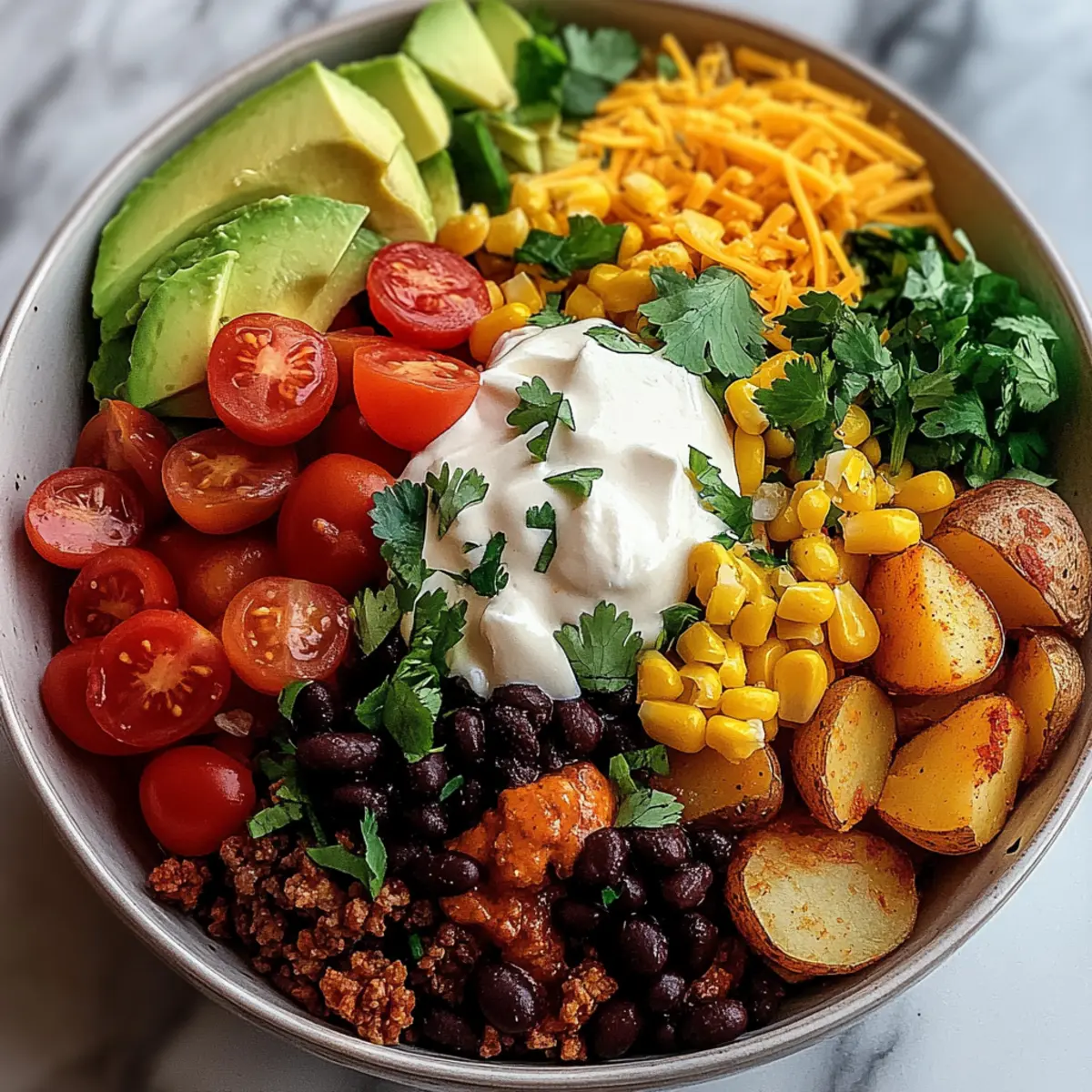Jump to Recipe Print RecipeAs the aroma of roasting potatoes fills my kitchen, I can’t help but smile. There’s something wonderfully comforting about a bowl filled with crispy, golden potatoes, juicy meat, and a medley of vibrant toppings. Say hello to my Loaded Potato Taco Bowl, an unbeatable quick dinner option that’s not only easy to whip up but also incredibly customizable to fit any dietary preference! Whether you’re a meat lover or leaning toward vegetarian, this dish lets you play with flavors and textures, ensuring everyone at the table is satisfied. Imagine inviting friends over for a casual meal where each person can build their own delicious creation. Ready to dive in and discover just how satisfying this comforting bowl can be? Let’s get cooking! Why is this Loaded Potato Taco Bowl perfect? Customizable Delights: Each bite of this Loaded Potato Taco Bowl offers endless possibilities! You can easily swap out ingredients to suit your taste—think sweet potatoes, beans, or scrumptious toppings like avocado or fresh cilantro. Quick and Easy: With preparation and cooking time under an hour, you’ll have a comforting dish ready even on your busiest weeknights. Family Fun: Make dinner interactive by letting everyone build their own bowls, mixing and matching their favorite toppings for a personalized feast. Nutritional Balance: Packed with protein, healthy fats, and fresh veggies, this dish checks all the boxes for a nutritious meal that doesn’t skimp on taste. Crowd-Pleasing Comfort: If you love the flavors of a classic taco, but want something unique, this recipe is your answer! Check out my other favorites like Garlic Parmesan Potato Wedges for more delicious sides. Loaded Potato Taco Bowl Ingredients • Prepare to create a mouthwatering Loaded Potato Taco Bowl! For the Potatoes • Russet Potatoes – Acts as the base; crispy outside, fluffy inside. Substitution: Sweet potatoes for added sweetness and nutrition. • Olive Oil – Aids in roasting, promotes even cooking, and enhances flavor. Use any neutral oil if preferred. • Garlic Powder – Adds garlic flavor without the need for fresh cloves. Can substitute with fresh minced garlic, but use less. • Onion Powder – Provides mild sweetness and aromatic depth. Alternatively, use finely chopped fresh onion. • Smoked Paprika – Introduces a smoky flavor and brightens the dish’s color. Sweet paprika can be a substitute for a milder taste. • Salt and Black Pepper – Essential for flavor enhancement. Adjust to taste based on preference. For the Filling • Ground Beef or Turkey – Adds protein and heartiness; acts as the savory layer. Vegetarian option: Replace with beans, tofu, or lentils. • Chili Powder – Provides the classic taco flavor profile with mild heat. Increase for more spiciness. • Cumin – Adds warm, earthy notes; enhances the seasoning of the protein. No direct substitution; omit for a lighter flavor. • Red Onion – Adds crunch, color, and sweetness. Regular onion can be a substitute. • Black Beans – Introduce creaminess and added protein. Can use pinto beans or chickpeas instead. • Corn Kernels – Contribute sweetness and texture. Frozen or canned corn works well. For Toppings • Shredded Cheddar Cheese – Provides melty richness and a classic taco touch. Substitute with other cheeses like Monterey Jack or omit for a lighter version. • Cherry Tomatoes – Adds freshness and bursts of juiciness. Diced regular tomatoes can be a substitute. • Avocado – Offers creaminess and nutrients, balancing flavors. Replace with sour cream or yogurt for additional creaminess. • Fresh Cilantro – For garnish; adds herbal brightness. Omit for a non-cilantro preference or substitute with parsley. • Lime Wedges – Enhances each bite with a burst of acidity. Use lemon as an alternate citrus option. • Sour Cream – Provides tangy creaminess. Greek yogurt can be a healthier substitute. Step‑by‑Step Instructions for Loaded Potato Taco Bowl Step 1: Preheat the Oven Begin by preheating your oven to 425°F (220°C). While it heats, wash and dice your russet potatoes into ½-inch cubes for even cooking. In a large mixing bowl, toss the diced potatoes with olive oil, garlic powder, onion powder, smoked paprika, salt, and pepper until evenly coated, ensuring they glisten with flavor. Step 2: Roast the Potatoes Spread the seasoned potatoes in a single layer on a baking sheet, making sure not to overcrowd them for optimal crispiness. Bake in the preheated oven for 25-30 minutes. Halfway through, give them a gentle toss to promote even browning until they are golden and crisp on the outside while fluffy inside. Step 3: Brown the Meat While the potatoes roast, heat a large skillet over medium-high heat. Add your choice of ground beef or turkey, breaking it apart with a spatula as it cooks. Sauté for about 5-7 minutes, stirring occasionally, until the meat is browned and fully cooked. Drain any excess fat to keep your Loaded Potato Taco Bowl light and enjoyable. Step 4: Flavor the Meat Once the meat is cooked, stir in chili powder, cumin, and chopped red onion. Continue to cook for an additional 3-4 minutes until the onion becomes soft and translucent, releasing its sweet essence into the mixture. This will elevate the flavors of your Loaded Potato Taco Bowl beautifully. Step 5: Add Beans and Corn Next, fold in the black beans and corn into the skillet, stirring gently. Allow the mixture to heat through for about 2-3 minutes. Taste and adjust the seasoning as needed, ensuring the flavors marry perfectly before moving to assembly. This hearty filling brings a satisfying texture to your bowl. Step 6: Assemble the Bowls Once your potatoes are perfectly roasted and your filling is ready, it’s time to assemble. Start by spooning a generous portion of the crispy roasted potatoes into individual bowls. Top them with the savory meat mixture, allowing the flavors to meld deliciously in each b