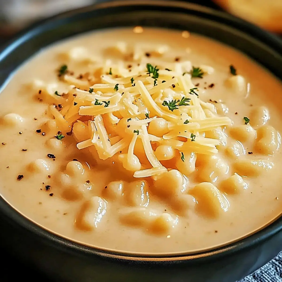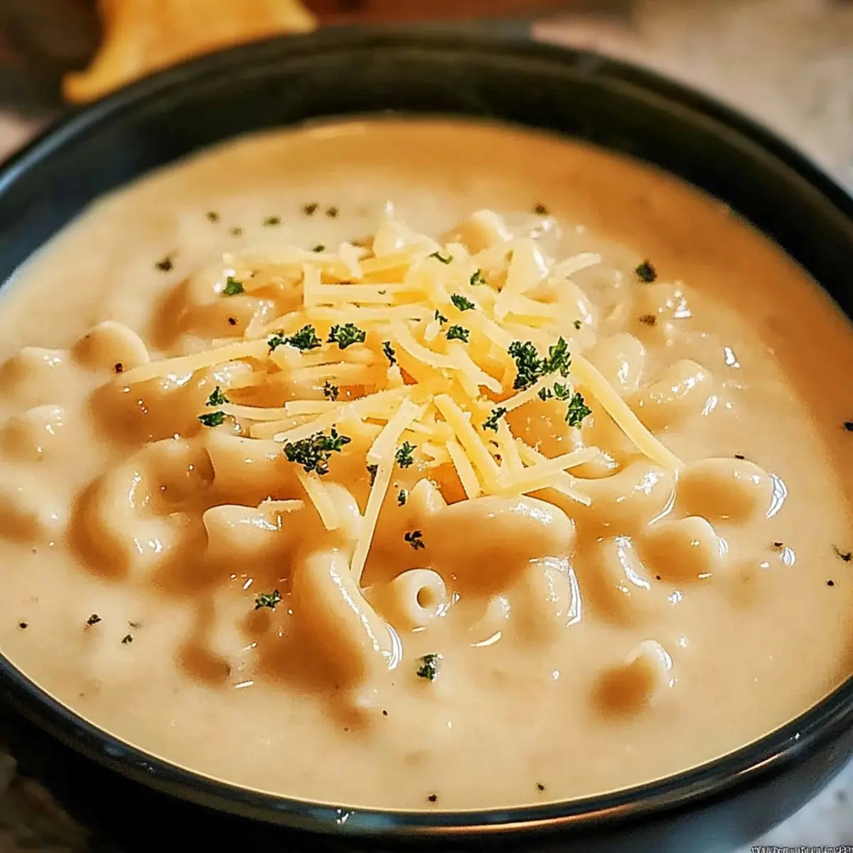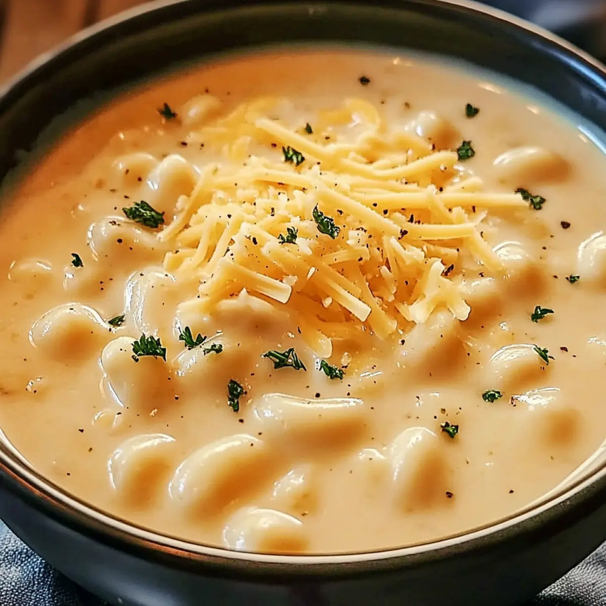 Jump to Recipe Print RecipeThe aroma of melted cheese wafting through the kitchen instantly pulls me in, transporting me to cozy evenings spent around the dinner table. Meet my Creamy Mac and Cheese Soup, a delightful twist on the beloved classic that combines all the creamy goodness of traditional mac and cheese in a warm and inviting soup form. Not only is this dish incredibly easy to whip up in just one pot, making cleanup a breeze, but it’s also vegetarian, ensuring it pleases a wide range of palates. Perfect for chilly nights or simply when you’re in the mood for comfort food, this soup brings a sense of nostalgia and warmth that hugs you from the inside. Curious about how to make this cozy creation? Let’s dive in! Why is this Mac and Cheese Soup magical? Comforting flavors take center stage in this creamy bowl of goodness, delivering the ultimate cozy experience. One-pot simplicity makes it a breeze to create, allowing you to relax while dinner comes together effortlessly. Rich texture combines the nostalgic taste of mac and cheese with a delightful soup consistency, perfect for dipping crusty bread. Plus, vegetarian-friendly ingredients make it suitable for a diverse crowd, ensuring everyone can savor this dish. For an extra treat, serve it alongside Chicken Cheese Zucchini or Cheese Grape Skewers for a complete comfort meal! Mac and Cheese Soup Ingredients • Dive into the creamy goodness with these essential ingredients! For the Base 4-5 cups chicken broth or stock – This adds depth of flavor; vegetable broth can be used for a vegetarian version. 1¼ cups uncooked elbow macaroni – This provides the pasta component; use gluten-free pasta for a gluten-free option. For the Creaminess 2 tablespoons butter – Adds richness and aids in thickening the soup. 2 tablespoons all-purpose flour – Used as a thickener; consider using gluten-free flour as a substitute. 2 cloves garlic, minced – Provides aromatic flavor; can substitute with garlic powder (1/2 teaspoon). 1 cup milk – This creamy liquid base enhances richness; whole milk is preferred, but plant-based milk works too. 4 ounces spreadable cream cheese – Adds extra creaminess and richness to the soup. For the Cheesy Goodness 1 cup shredded sharp cheddar cheese – This is the primary cheese flavor; feel free to substitute with any favorite cheese. ½ cup shredded Swiss cheese (or additional cheddar) – Adds complexity; optional to omit if using only cheddar. For Flavor Enhancement ½ teaspoon onion powder – Enhances flavor; fresh onion can be finely chopped and sautéed if preferred. ½ teaspoon dry mustard powder – Adds depth; can be omitted if desired. ¼ teaspoon salt – Basic seasoning; adjust to taste. ¼ teaspoon black pepper – Adds a mild kick; white pepper can be used for a different flavor. Step‑by‑Step Instructions for Creamy Mac and Cheese Soup Step 1: Boil the Broth and Cook Pasta In a medium pot, bring 4-5 cups of chicken broth to a rolling boil over high heat. Once boiling, add 1¼ cups of uncooked elbow macaroni and cook according to package instructions until al dente, roughly 6-8 minutes. Stir occasionally to prevent sticking, and remember not to drain the pasta, as you’ll need the flavorful broth for your Creamy Mac and Cheese Soup. Step 2: Prepare the Roux While the pasta is cooking, in a separate saucepan, melt 2 tablespoons of butter over medium heat. Once melted, whisk in 2 tablespoons of all-purpose flour, cooking for about 1 minute until it forms a paste that is slightly golden; this roux will give your soup a perfect thick consistency. Be sure to keep stirring to avoid burning. Step 3: Sauté Garlic and Make a Base Add 2 cloves of minced garlic to the roux and sauté for 30 seconds until fragrant. Gradually whisk in 1 cup of milk to create a smooth mixture, ensuring there are no lumps. Continue to stir while cooking this base over medium heat until it thickens and bubbles slightly, typically around 2-3 minutes. This creamy base is crucial for the ultimate richness in your Mac and Cheese Soup. Step 4: Incorporate Seasonings Stir in ½ teaspoon of onion powder, ½ teaspoon of dry mustard powder, ¼ teaspoon of salt, and ¼ teaspoon of black pepper into the creamy base. Allow this mixture to cook over medium heat for about 1 minute, stirring continuously until it’s fragrant and thickens slightly. These seasonings will elevate the flavor profile of your comforting soup. Step 5: Add the Cheeses Next, lower the heat to medium-low and start incorporating 4 ounces of spreadable cream cheese, 1 cup of shredded sharp cheddar cheese, and ½ cup of shredded Swiss cheese into your mixture. Stir continuously until the cheeses melt completely and the mixture becomes smooth and creamy. This is where the magic of your Creamy Mac and Cheese Soup truly begins to shine! Step 6: Combine Everything Together After your cheeses have melted beautifully, gently fold in the cooked pasta along with the chicken broth from the first pot. Stir everything together until well combined, allowing the soup to heat through for about 3 minutes. The pasta will absorb some of the creamy goodness, creating a delightful texture that makes this dish feel extra cozy. Step 7: Final Touches and Serve Taste your Mac and Cheese Soup and adjust the seasoning with additional salt and pepper as needed. Once satisfied, let it simmer for another minute or two before serving. To enhance presentation, garnish with extra cheese and chopped parsley, providing a pop of color and flavor to your warm, comforting meal. Mac and Cheese Soup Variations Get your creative juices flowing and personalize this delightful soup with these fun ideas! Gluten-Free Pasta: Swap elbow macaroni for gluten-free pasta like quinoa or brown rice noodles to accommodate dietary needs. Enjoy the same creamy goodness without compromise! Add Spice: For a kick of flavor, toss in a splash of hot sauce or diced jalapeños to spice things up. This adds a lively ta