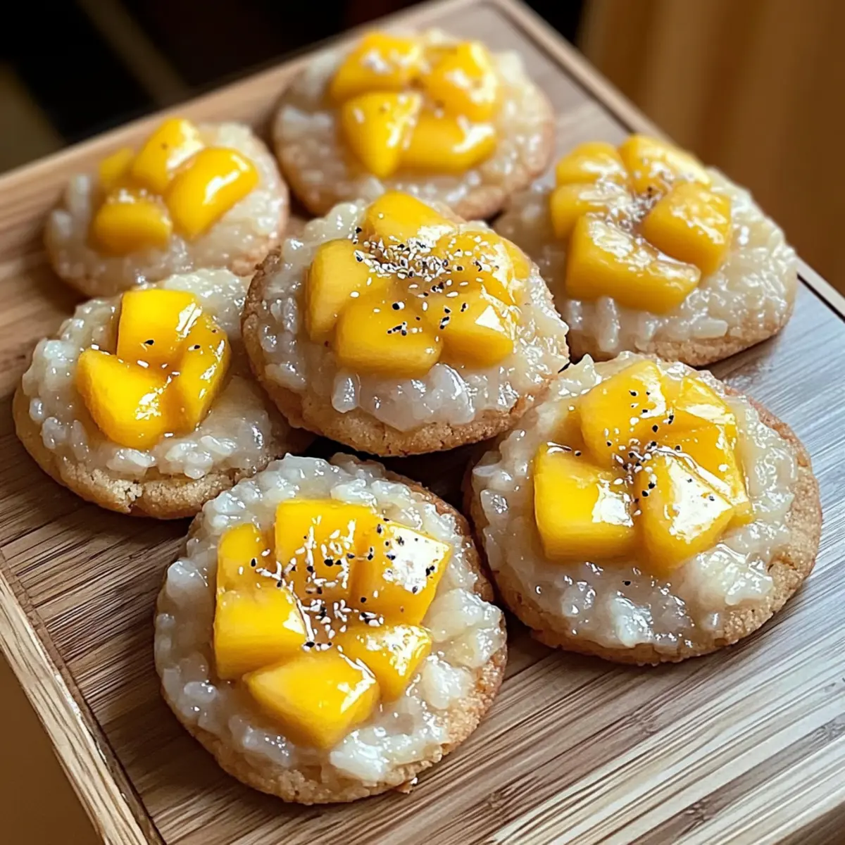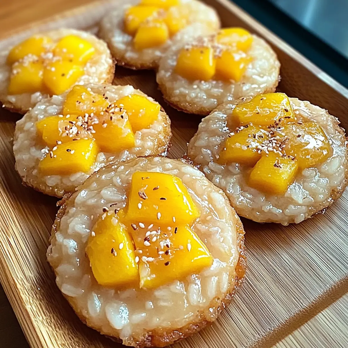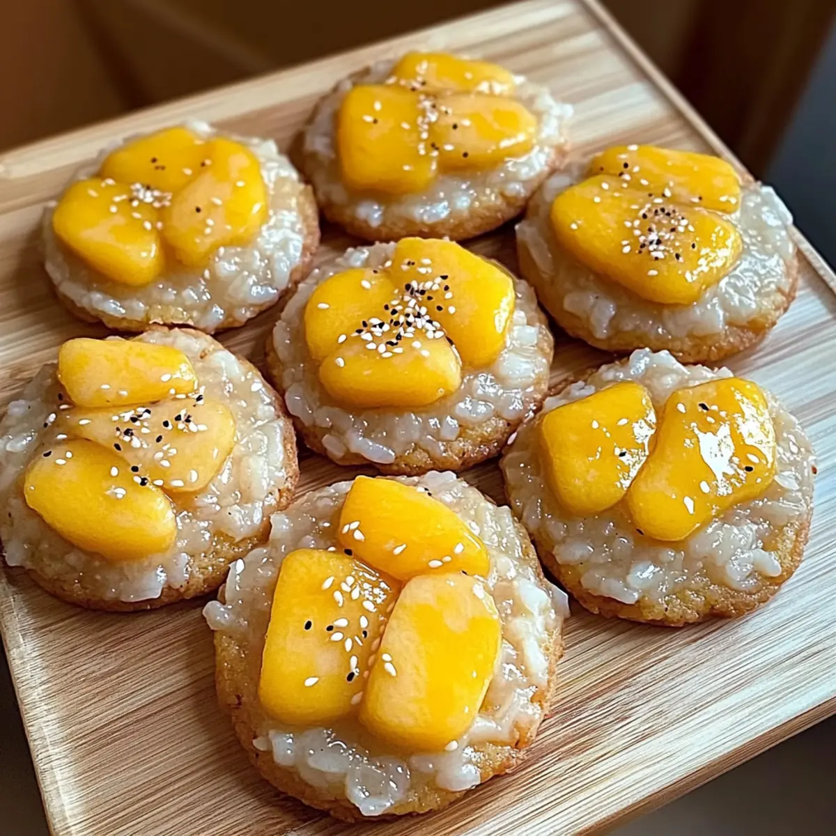Jump to Recipe Print RecipeAs I stood in my kitchen, the sweet aroma of ripe mangoes wafted through the air, instantly transporting me to a tropical paradise. That’s when the idea struck me: why not capture the essence of the beloved Thai dessert, mango sticky rice, in a cookie? Enter the Mango Sticky Rice Cookies—these irresistibly chewy tropical treats are not only a fun twist on a classic dessert but also offer delightful variations, including gluten-free and vegan options. With a warm coconut base and a burst of mango sweetness, they’re a guaranteed crowd-pleaser for any gathering. Plus, they’re easy to whip up and perfect for satisfying those dessert cravings without any fast-food temptation. Curious how a simple cookie can evoke such flavor-packed memories? Let’s dive into this mouthwatering recipe together! Why Are These Cookies So Irresistible? Tropical Bliss: The fusion of creamy coconut and sweet mango brings the beloved Thai dessert into cookie form, making every bite feel like a vacation. Versatile Variations: Whether you’re vegan, gluten-free, or just looking for something nut-free, this recipe offers alternatives to fit all dietary needs. Chewy Perfection: The unique addition of sticky rice contributes that signature chewy texture, setting these cookies apart from any ordinary treat. Quick Whip-Up: Enjoy the ease of creating these delightful cookies without sacrificing time—perfect for busy bakers craving homemade goodness. Crowd-Pleasing Delight: These tropical cookies are sure to impress at any gathering, making them the perfect dessert to share; pair with coconut ice cream for an extra treat! Mango Sticky Rice Cookies Ingredients For the Cookie Dough • Unsalted Butter – For richness and flavor; swap for vegan butter to make it dairy-free. • Brown Sugar – Adds moisture and depth of flavor; no substitute needed. • White Sugar – Brings sweetness and structure; can be replaced with coconut sugar for a natural alternative. • Egg – Provides necessary structure; use flaxseed meal or applesauce for a vegan alternative. • Vanilla Extract – Enhances the overall flavor; always go for pure for the best results. • Baking Soda – Acts as a leavening agent; check freshness to ensure proper rise. • Salt – Balances sweetness and is essential for flavor. • All-Purpose Flour – The base for structure; use a gluten-free blend if needed. For the Mango Jam • Mangoes – Fresh or frozen, these offer the signature flavor; choose ripe mangoes for the best taste. • Granulated Sugar – Helps thicken the mango jam; adjust amount based on mango sweetness. For the Sticky Rice • Sweet Rice – Provides the chewy texture; do not substitute for regular rice. • Coconut Milk – Delivers creaminess and tropical flavor; essential for this recipe. • Sweetened Condensed Milk – Adds a hint of sweetness and creaminess; omit for a dairy-free version. These Mango Sticky Rice Cookies promise a delightful fusion of flavors that will whisk you away to a tropical paradise! Step‑by‑Step Instructions for Mango Sticky Rice Cookies Step 1: Prepare the Dough In a large mixing bowl, cream together ½ cup of unsalted butter with ½ cup of brown sugar and ¼ cup of white sugar until the mixture is light and fluffy, about 3-5 minutes. Beat in one egg and 1 teaspoon of vanilla extract until well combined. In a separate bowl, whisk together 1 ½ cups of all-purpose flour, 1 teaspoon of baking soda, and a pinch of salt. Gradually blend the dry ingredients into the wet mixture, forming a soft dough; chill in the refrigerator for 30 minutes to firm up. Step 2: Make Mango Jam While the dough chills, prepare the mango jam by finely dicing 1 ripe mango and placing it in a saucepan over medium heat. Add 2 tablespoons of granulated sugar and simmer for 10-15 minutes, stirring occasionally until the mixture thickens and becomes jam-like. Remove from heat, let it cool completely, and set aside for layering in the cookies. Step 3: Prepare Sticky Rice Next, rinse 1 cup of sweet rice under cold water until the water runs clear, ensuring it’s free from excess starch. Soak the rice in water for at least 4 hours or overnight for best results. Once soaked, steam it in a bamboo steamer or fine mesh sieve lined with cheesecloth for 20-30 minutes until tender. Once done, mix the rice with ½ cup of coconut milk and ¼ cup of sweetened condensed milk for added creaminess, then allow it to cool and thicken. Step 4: Assemble Cookies Preheat your oven to 350°F (175°C). On a parchment-lined baking sheet, scoop out dough balls about 2 tablespoons in size, spacing them 2 inches apart. Using your thumb or the back of a spoon, create a hollow in the center of each dough ball. Place a teaspoon of cooled mango jam into the hollow, filling it generously, then top each with a spoonful of the prepared sticky rice, gently pressing down to adhere. Step 5: Bake Bake the assembled Mango Sticky Rice Cookies in your preheated oven for 12-15 minutes, watching closely. They should turn a lovely golden brown, with a slightly soft center indicating they’re perfectly baked. Avoid overbaking to keep that delightful chewy texture. Step 6: Cool and Serve Once baked, allow the cookies to cool on the sheet for 5 minutes. Afterward, sprinkle with flaky sea salt to enhance the flavors. Carefully transfer them to a wire rack to cool completely. These Mango Sticky Rice Cookies are now ready to bring a taste of tropical bliss to your dessert table! Make Ahead Options These Mango Sticky Rice Cookies are perfect for busy home cooks looking to save some time on dessert prep! You can prepare the cookie dough and mango jam up to 24 hours in advance. Simply follow the first two steps of the recipe, then wrap the chilled dough tightly in plastic wrap and place it in the refrigerator. The mango jam can be stored in an airtight container in the fridge for the same duration. For the sticky rice, soak it up to 8 hours ahead o