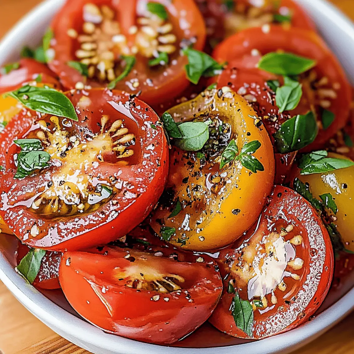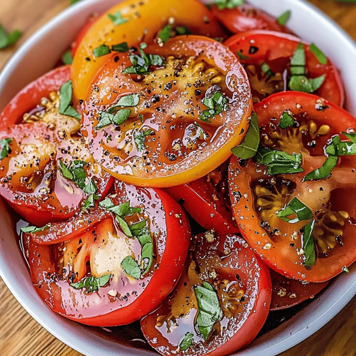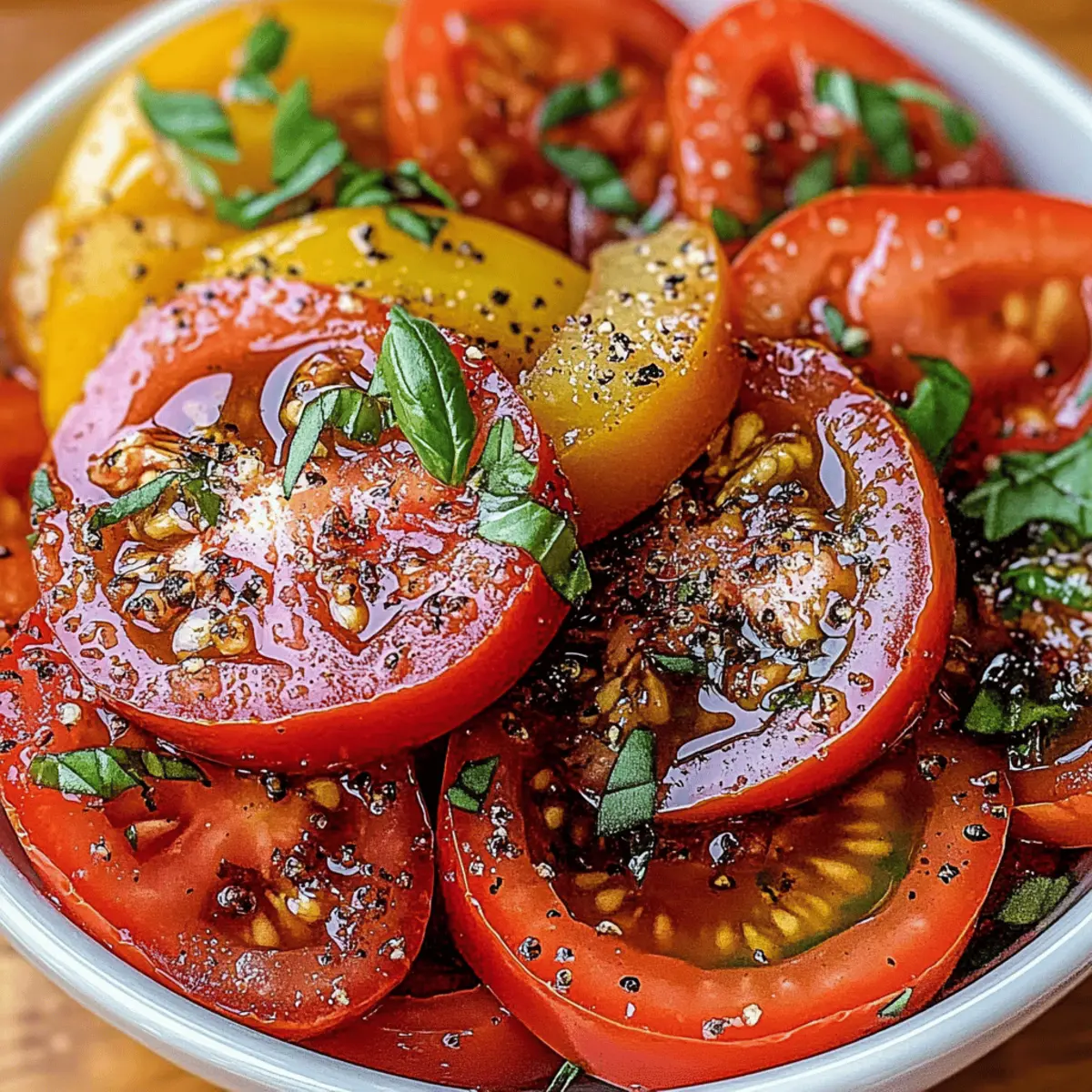 Jump to Recipe Print RecipeAs the sun sets over the summer horizon, I can’t help but think about how much I cherish those simple moments—gathering with friends, laughter echoing, and of course, digging into vibrant dishes. One of my all-time favorites has to be marinated tomatoes. This recipe delivers a burst of tangy, savory goodness that breathes life into any meal. Whip up these marinated tomatoes quickly, and you’ll have a stunning summer side dish that’s both fresh and gluten-free. Perfect for tossing in salads or serving atop grilled meats, they’re versatile enough to suit any gathering and simple enough for busy weeknights. Are you ready to elevate your dining experience with this delightful twist on a classic favorite? Let’s dive in! What makes marinated tomatoes irresistible? Freshness in every bite: The luscious, ripe tomatoes soak up a zesty marinade that’s bursting with flavor. Effortless preparation: With just 10 minutes of hands-on time, you can create a dazzling side dish that complements any meal. Versatile addition: Great for salads, sandwiches, or grilled meats, making them a go-to for summer entertaining. Health-conscious: Packed with vitamins and antioxidants, they’re a guilt-free indulgence that everyone can enjoy. Customizable: Feel free to experiment with herbs and spices—try adding a kick with red pepper flakes or a sweet touch of honey! Dive into this vibrant recipe and experience the magic of marinated tomatoes today! Marinated Tomatoes Ingredients For the Marinade Extra Virgin Olive Oil – Provides richness and enhances the overall taste of the marinated tomatoes. Balsamic Vinegar – Adds a tangy depth; feel free to swap it with red wine or apple cider vinegar for a unique twist. Sea Salt – Helps to enhance the flavor while drawing moisture from the tomatoes. Black Pepper – Freshly ground black pepper adds subtle heat and earthy tones to the dish. Garlic – Freshly minced garlic brings aromatic flavor; if in a hurry, garlic powder will work in a pinch. Red Pepper Flakes (optional) – For those who like a bit of spice, this adds the perfect kick! For the Tomatoes Tomatoes – Choose juicy, ripe tomatoes for the best sweetness and texture; aim for tomatoes that are firm but slightly soft. For the Fresh Touch Fresh Basil – Introduces vibrant herbal notes; dried basil is a good substitute, but remember to use less. Fresh Parsley – Adds brightness; you can replace it with dried parsley if needed, scaling back the amount. Dive into these marinated tomatoes and elevate your summer dishes with amazing flavors! Step‑by‑Step Instructions for Marinated Tomatoes Step 1: Prepare the Tomatoes Start by selecting ripe, firm tomatoes and rinsing them under cool water. Pat the tomatoes dry gently using a clean kitchen towel. Once dry, slice them into wedges or rounds, ensuring an even cut for better marination. This will create the perfect base for your delicious marinated tomatoes, allowing them to soak up the flavors beautifully. Step 2: Whisk the Marinade In a mixing bowl, combine extra virgin olive oil, balsamic vinegar, sea salt, freshly ground black pepper, and freshly minced garlic. Use a whisk to blend these ingredients until smooth. The marinade should have a harmonious balance of tangy and savory notes. Take a moment to enjoy the aroma as the mixture comes together, setting the stage for your marinated tomatoes. Step 3: Add Fresh Herbs Next, fold in the freshly chopped basil and parsley into the marinade. If you’re adding red pepper flakes for a hint of heat, sprinkle them in now. Gently stir the mixture to ensure the herbs are evenly distributed. The addition of these vibrant herbs will elevate the taste of your marinated tomatoes, infusing them with refreshing flavors. Step 4: Marinate the Tomatoes In a large bowl, toss the sliced tomatoes with the prepared marinade. Make sure each piece is thoroughly coated in the flavorful blend. Cover the bowl with plastic wrap or a lid, letting it marinate at room temperature for at least 30 minutes. For enhanced flavor, consider marinating for up to 2 hours, allowing the tomatoes to absorb the delicious marinade fully. Step 5: Serve and Enjoy After marination, transfer the beautifully vibrant marinated tomatoes onto a serving dish. Drizzle any leftover marinade over the top for added flavor. These colorful marinated tomatoes make an excellent side dish or topping for grilled meats, adding a burst of freshness to any summer meal. Serve immediately and watch them disappear! Make Ahead Options These marinated tomatoes are perfect for meal prep and can save you time during busy summer nights! You can slice and marinate the tomatoes up to 3 days in advance, allowing their flavors to develop while stored in an airtight container in the refrigerator. To maintain their quality, ensure the tomatoes are fully coated in the marinade and kept chilled. If you’re preparing them ahead of time, simply allow them to sit at room temperature for about 30 minutes before serving to enhance their flavors. This way, you’ll have delicious marinated tomatoes ready to impress your guests or elevate your meals with minimal effort. What to Serve with Marinated Tomatoes As the vibrant colors of summer invite us to the table, enhancing your meal with complementary dishes elevates every bite. Grilled Chicken: Juicy, well-seasoned chicken pairs beautifully with the tangy flavors of marinated tomatoes, providing a satisfying contrast in both taste and texture. This combination makes for a perfect summer evening feast. Crusty Bread: Freshly baked bread is ideal for soaking up the delicious marinade, offering a comforting, satisfying crunch alongside the freshness of the tomatoes. Serve it warm with a side of olive oil for dipping. Pasta Salad: A light pasta salad with olives, feta, and a hint of lemon makes a refreshing side dish that complements the marinated tomatoes wonderfully, infusing your meal with Mediterranean cha