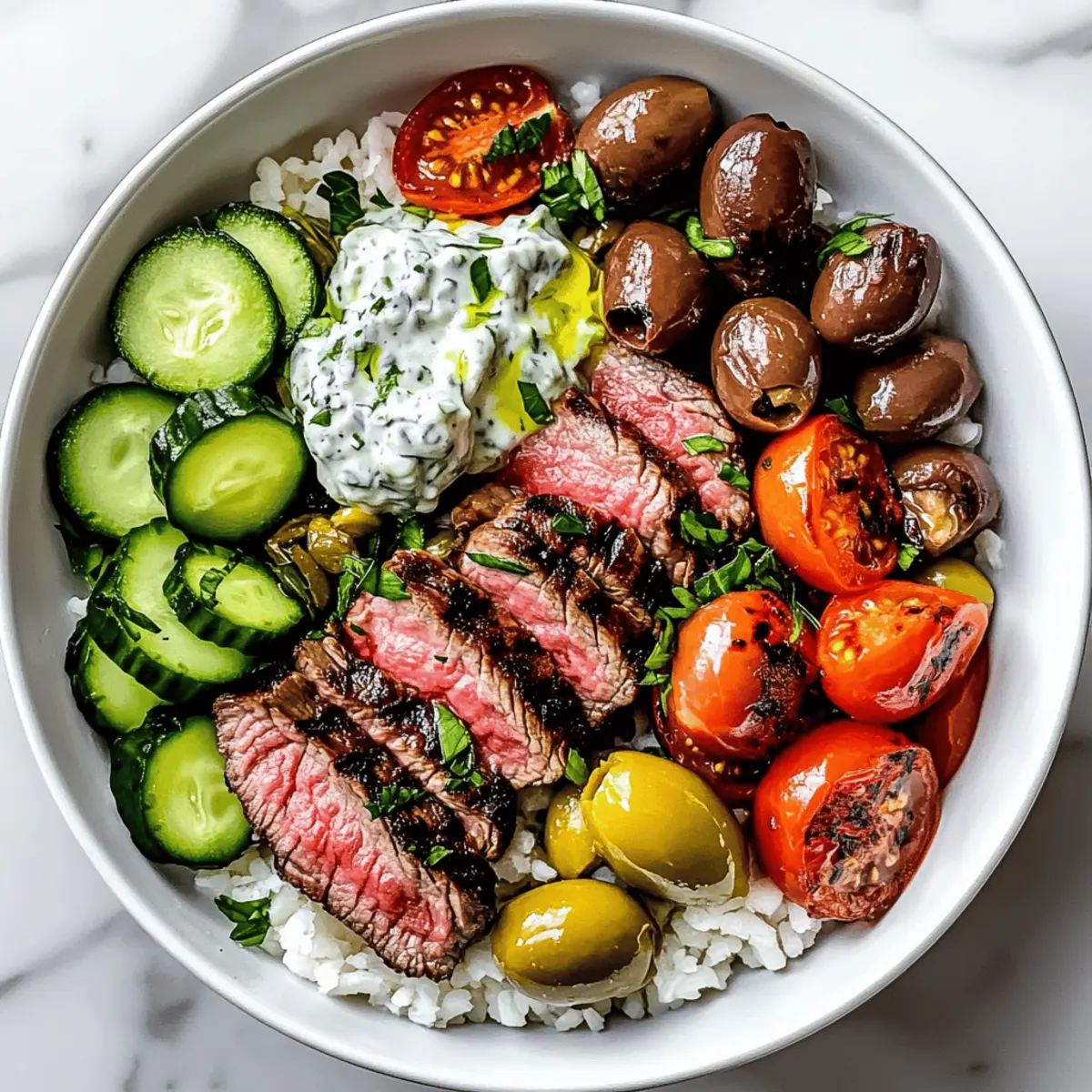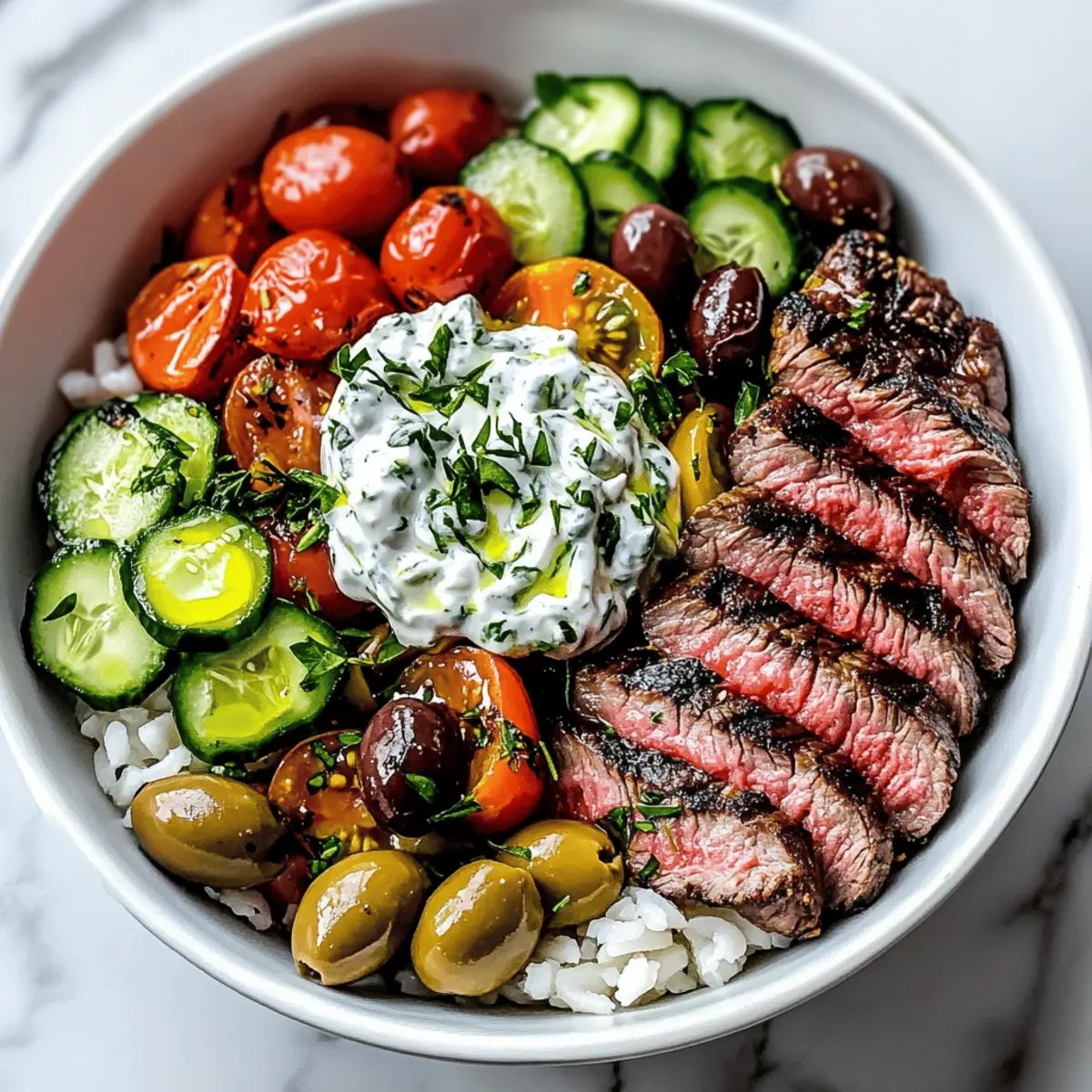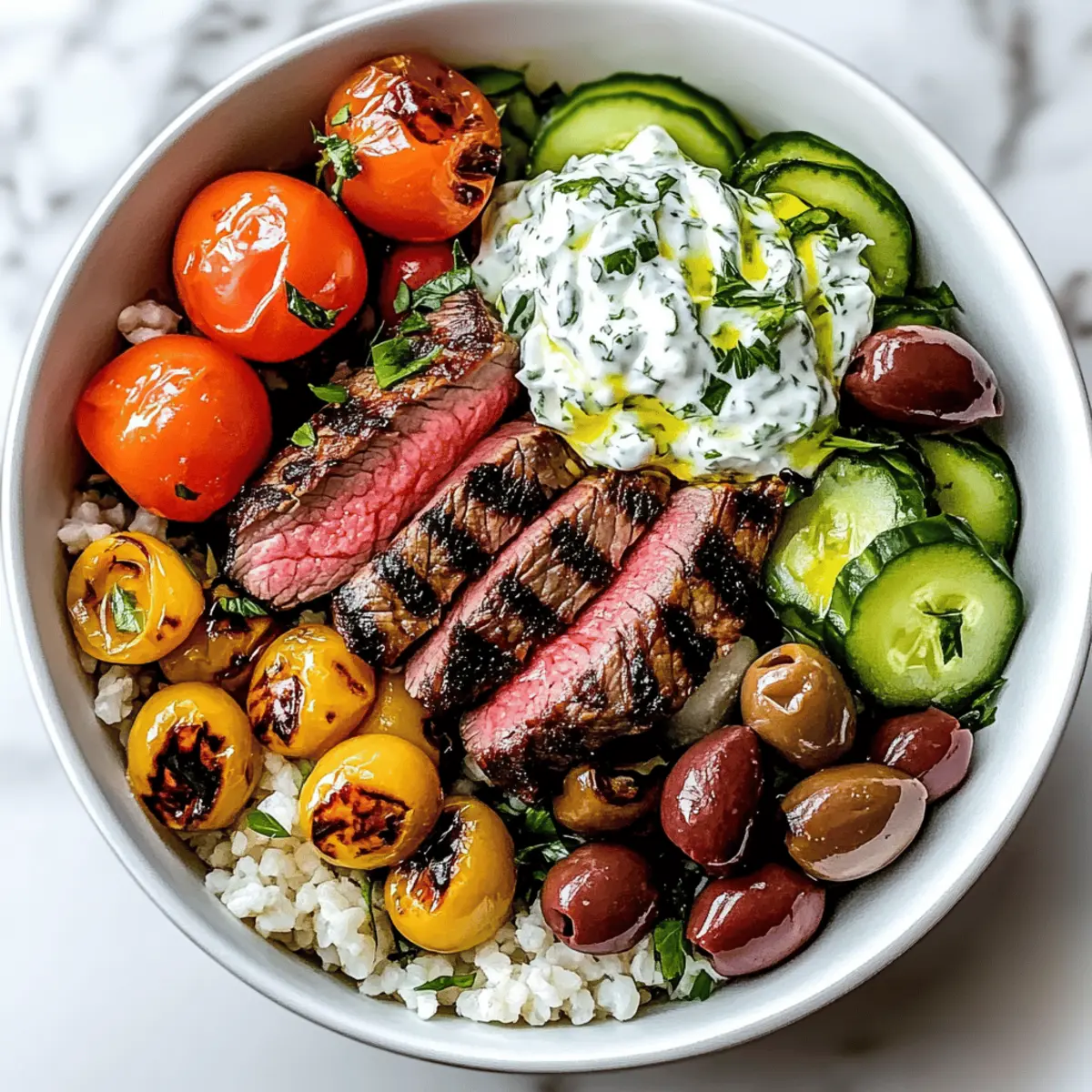 Jump to Recipe Print RecipeThe aroma of sizzling sirloin wafts through the kitchen, instantly transporting me to sun-drenched Mediterranean shores. That’s the magic of the Mediterranean Steak Bowl—a delightful conglomeration of perfectly grilled steak, vibrant vegetables, and creamy tzatziki, all adorned over a bed of fluffy grains. This recipe not only comes together in under 30 minutes but also champions meal flexibility, allowing for gluten-free or low-carb variations that fit any dietary preference. Whether for a quick weeknight dinner or a vibrant meal prep option, this bowl is guaranteed to please even the pickiest eaters at your table. What twist will you add to make it your own? Why is this Mediterranean Steak Bowl special? Bold, Vibrant Flavors: Each ingredient shines, from the grilled steak to the zesty tzatziki, creating a dish that’s bursting with Mediterranean essence. Customizable Options: Whether you prefer grains or a low-carb twist, this recipe adapts to your craving. For a veg-friendly take, consider swapping steak for grilled halloumi or marinated tofu! Quick Preparation: Whip up this flavorful bowl in under 30 minutes, making it perfect for busy weeknights. Meal Prep Friendly: Prepare components in advance for effortless assembly throughout the week. Looking for more meal prep ideas? Check out our Mediterranean Herb Crusted Grilled Chicken and Sriracha Salmon Bowls for fresh inspiration! Mediterranean Steak Bowl Ingredients • Dive into the vibrant world of flavors with these essential ingredients. For the Steak • Sirloin Steak – The star of the show, providing a juicy, flavorful base; flank, skirt, or ribeye are great alternatives too. • Olive Oil – Essential for marinating the steak; opt for extra virgin for the best taste. • Garlic – Enhances the overall flavor; fresh minced garlic is preferred, but garlic powder works fine too. • Lemon Juice – Brightens flavors; lime juice can be substituted for a zesty twist. • Dried Oregano & Thyme – Infuse the steak with aromatic herb goodness; fresh herbs give an extra flavor boost. • Salt & Pepper – Vital for seasoning; adjust according to your taste preferences. For the Bowl Base • Cooked Grains (Brown Rice, Quinoa, Cauliflower Rice) – Forms the hearty base; using pre-cooked grains saves time. • Cherry Tomatoes & Cucumber – Add freshness and crunch; feel free to swap for bell peppers or radishes. • Red Onion – Offers a sharp bite; can be omitted or replaced with green onions for a milder flavor. • Kalamata Olives – Introduce a briny taste; if preferred, green olives serve as an excellent substitute. • Feta Cheese – Optional for a creamy finish; use dairy-free alternatives for a vegan option. • Fresh Herbs (Parsley or Dill) – Brighten the dish with freshness; basil or mint are great substitutions. For the Tzatziki • Greek Yogurt – The creamy backbone of tzatziki; coconut yogurt makes a fantastic dairy-free substitute. • Grated Cucumber in Tzatziki – Adds a wonderful crunch; remember to squeeze out excess moisture for the best texture. • Honey (optional in vinaigrette) – Sweetens the vinaigrette; omit it for a Whole30-friendly version. • Garlic in Vinaigrette – Elevates flavor; garlic powder is a convenient alternative. Get ready to indulge in the delectable Mediterranean Steak Bowl that’s not only flexible but also reflects the essence of fresh, wholesome ingredients perfect for your dining experience! Step‑by‑Step Instructions for Mediterranean Steak Bowl Step 1: Prepare the Marinade In a medium bowl, whisk together ¼ cup of olive oil, 4 minced garlic cloves, the juice of 1 lemon, 1 teaspoon of dried oregano, and 1 teaspoon of thyme. Season generously with salt and pepper. Coat your 1 pound sirloin steak with this marinade, ensuring it’s evenly covered. Allow it to marinate for at least 30 minutes at room temperature or up to 4 hours in the refrigerator for deeper flavor. Step 2: Make the Tzatziki While the steak marinates, prepare the creamy tzatziki sauce. In a separate bowl, combine 1 cup of Greek yogurt, 1 grated cucumber (squeezed to remove excess water), the juice of ½ lemon, 1 minced garlic clove, and 1 tablespoon of chopped dill. Season with salt and pepper to taste. Stir well and refrigerate to allow the flavors to meld. Step 3: Prepare the Vinaigrette In a small bowl, whisk together 3 tablespoons of olive oil, 2 tablespoons of lemon juice, 1 tablespoon of honey (if using), 1 minced garlic clove, ½ teaspoon of dried oregano, salt, and pepper. Adjust sweetness and seasoning as needed, then set aside to let the flavors combine while you cook the steak. Step 4: Cook the Steak Heat a skillet over medium-high heat until hot, then add the marinated steak. Sear for 4-5 minutes on each side, until it reaches your desired doneness—medium-rare is recommended for tenderness. Use a meat thermometer to check the internal temperature (130°F/54°C). Once done, remove from heat and let it rest for 5 minutes before slicing thinly. Step 5: Assemble the Bowl Start by layering your base: spoon 1 cup of cooked grains (like quinoa or brown rice) into a bowl. Top with the sliced steak, some vibrant cherry tomatoes, diced cucumber, and a handful of Kalamata olives. Crumble feta cheese over the top and sprinkle with fresh herbs like parsley or dill to enhance freshness. Step 6: Finish with Tzatziki and Vinaigrette Drizzle your homemade vinaigrette over the assembled Mediterranean Steak Bowl, allowing the flavors to meld. Add a generous dollop of tzatziki on top for creaminess and flavor contrast. Serve immediately and savor the vibrant and hearty combination of ingredients! Make Ahead Options These Mediterranean Steak Bowls are perfect for meal prep aficionados! You can marinate the sirloin steak up to 24 hours in advance, allowing it to soak in the flavors while preventing any drying out during cooking. Additionally, prepare the tzatziki sauce and vinaigre