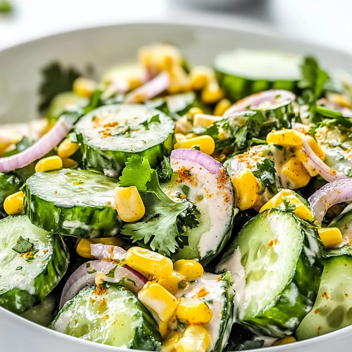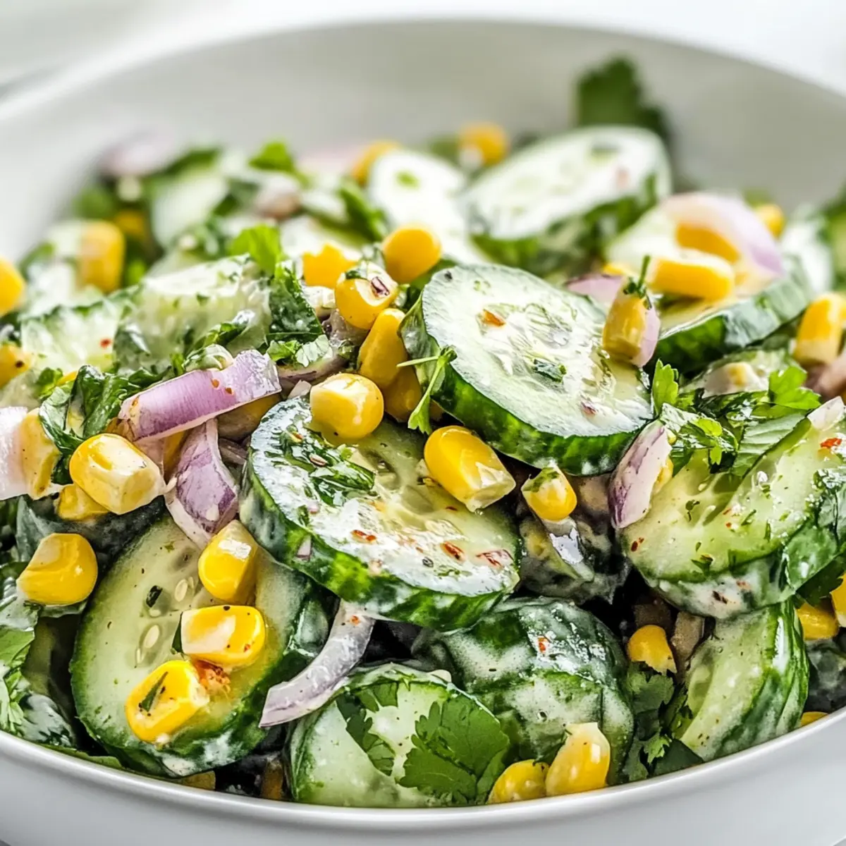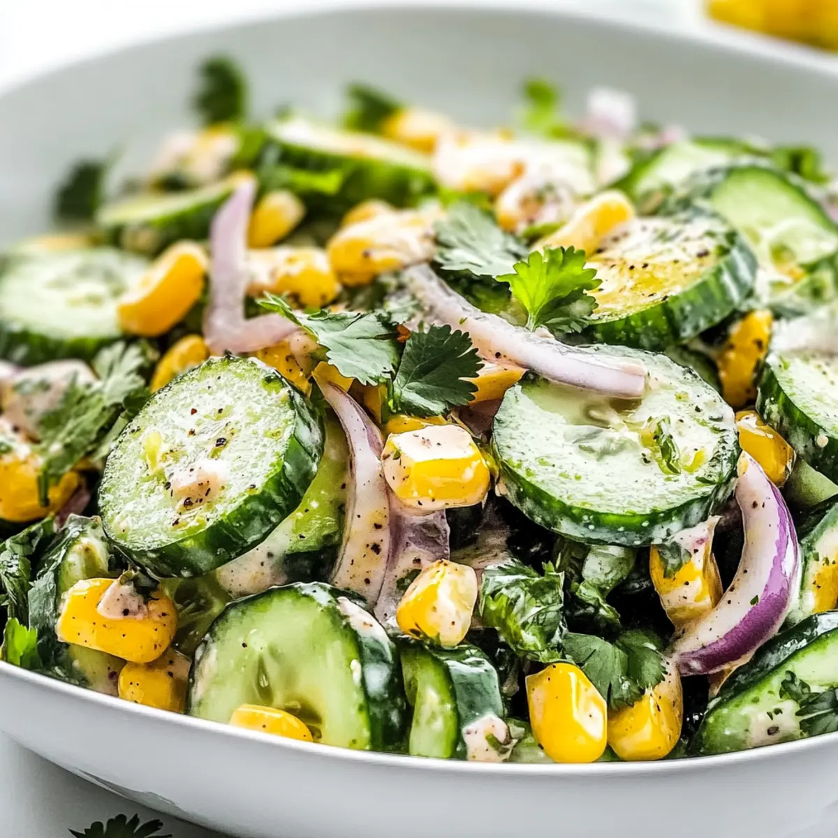 Jump to Recipe Print RecipeAs the sun blazes overhead and the air is filled with the tantalizing aroma of summer, nothing feels more like a culinary victory than a bowl of Refreshing Mexican Cucumber Salad with Creamy Lime Dressing. This vibrant gem combines irresistibly crisp cucumbers, sweet corn, and zesty lime, creating a quick summer side dish that’s perfect for those backyard BBQs or potlucks. You’ll love how it takes just 30 minutes to whip up, making it an easy go-to for a cool and satisfying accompaniment to rich grilled meats. Plus, it’s vegetarian-friendly and delivers a burst of freshness that everyone will adore. Are you ready to bring a taste of Mexico to your summer spread? Let’s dive in and get those flavors mixing! Why is this salad a summer essential? Vibrancy: Every bite of this Mexican Cucumber Salad bursts with color and flavor, making it a feast for the eyes and palate alike. Quick Prep: In just 30 minutes, you can create this delicious side, perfect for last-minute gatherings! Versatile Pairing: Enjoy it alongside tacos, grilled chicken, or as a refreshing standalone dish at BBQs and picnics. Vegetarian Delight: With wholesome ingredients, this salad caters to vegetarian and health-conscious eaters. For more tasty vegetarian sides, check out our Pasta Salad Cups or Peach Feta Salad. Flavor Profile: The creamy lime dressing, combined with zesty spices, adds a delightful twist that will leave everyone craving more! Mexican Cucumber Salad Ingredients Get ready to create a flavor-packed dish! For the Salad Cucumbers – Persian cucumbers offer the best crunch, but English cucumbers work well too! Corn Kernels – Adds sweetness and texture; use fresh, canned, or thawed frozen for ease. Red Onion – Infuses a sharp, delicious crunch; diced finely for the best flavor integration. Fresh Cilantro – Provides a refreshing herbaceous note; substitute with parsley or green onions if desired. For the Dressing Mayonnaise (or Greek Yogurt) – Creates a creamy base; Greek yogurt lightens the dish and is perfect for this Mexican Cucumber Salad. Lime Juice – Brings tangy goodness; lemon juice is a suitable substitute if you’re in a pinch. Chili Powder – Adds mild heat; adjust the amount if you prefer a kick! Ground Cumin – Deepens the flavor profile, enhancing the overall taste. Garlic Powder – Elevates the dressing’s flavor; fresh garlic can be used but reduce the quantity. Salt and Black Pepper – Essential for seasoning; taste as you go! Garnish Options Tajín or Extra Chili Powder – Spruce it up with a pinch for added flavor and a kick! Crumbled Cotija or Diced Avocado – Add richness and creamy texture for an extra special touch. Step‑by‑Step Instructions for Mexican Cucumber Salad Step 1: Prepare the Vegetables Begin by washing and slicing about 4 Persian cucumbers into thin rounds and place them in a large mixing bowl. Next, add 1 cup of corn kernels, either fresh or thawed frozen, along with half a finely diced red onion and a handful of chopped fresh cilantro. Give the mixture a gentle toss until everything is evenly combined and colorful. Step 2: Make the Dressing In a separate bowl, whisk together ½ cup of mayonnaise (or Greek yogurt) and the juice of 2 limes until smooth. Then, sprinkle in 1 teaspoon of chili powder, ½ teaspoon of ground cumin, ½ teaspoon of garlic powder, and salt and black pepper to taste. Blend these ingredients until you create a creamy dressing that looks inviting and fragrant. Step 3: Combine Salad and Dressing Pour the creamy dressing over the cucumber mixture in the large bowl. Using a spatula or tongs, gently toss everything together so that the cucumbers and corn are well-coated with the dressing. Look for a satisfying sheen on the salad, indicating it’s fully covered in flavor. Step 4: Chill and Meld Flavors Cover the mixing bowl with plastic wrap or a lid, and place it in the refrigerator for 15 to 20 minutes. This chilling time allows the flavors in your Mexican Cucumber Salad to meld beautifully, enhancing its refreshing taste. The salad should feel cool to the touch when served. Step 5: Garnish and Serve Right before serving, take the salad out of the fridge and give it a quick toss to mix any dressing that may have settled. Optionally, garnish with a sprinkle of Tajín or extra chili powder for added spice and color. Your vibrant, zesty Mexican Cucumber Salad is now ready to be enjoyed alongside your favorite summer dishes! Make Ahead Options These Mexican Cucumber Salad preparations are perfect for busy home cooks looking to save time! You can chop the cucumbers, corn, red onion, and cilantro up to 24 hours in advance and store them in an airtight container in the refrigerator. The creamy dressing can also be prepared ahead of time, but keep it separate to maintain the salad’s delightful crunch. When you’re ready to serve, simply combine the prepped salad ingredients with the dressing and let it chill for about 15-20 minutes—this allows the flavors to meld beautifully. Trust me, with this make ahead method, your Mexican Cucumber Salad will be just as delicious and fresh! Expert Tips for the Best Mexican Cucumber Salad Ingredient Quality: Use fresh, crisp cucumbers for the best texture. Avoid overripe cucumbers, which may be too soft and watery. Dressing Timing: Pour the dressing over the salad right before serving to maintain the crunchiness of the cucumbers and corn in your Mexican Cucumber Salad. Chilling is Key: Allow the salad to chill for at least 15-20 minutes to meld the flavors. It enhances the refreshing taste and makes it all the more appetizing! Customize Heat Levels: Adjust the chili powder according to your preference. Start with less if you’re sensitive to spice, and add more gradually. Mix and Serve: Stir the salad again before serving; the creamy dressing can settle at the bottom while chilling, ensuring an even coating of flavors. Storage Tips for Mexican Cucumber Salad Fridge