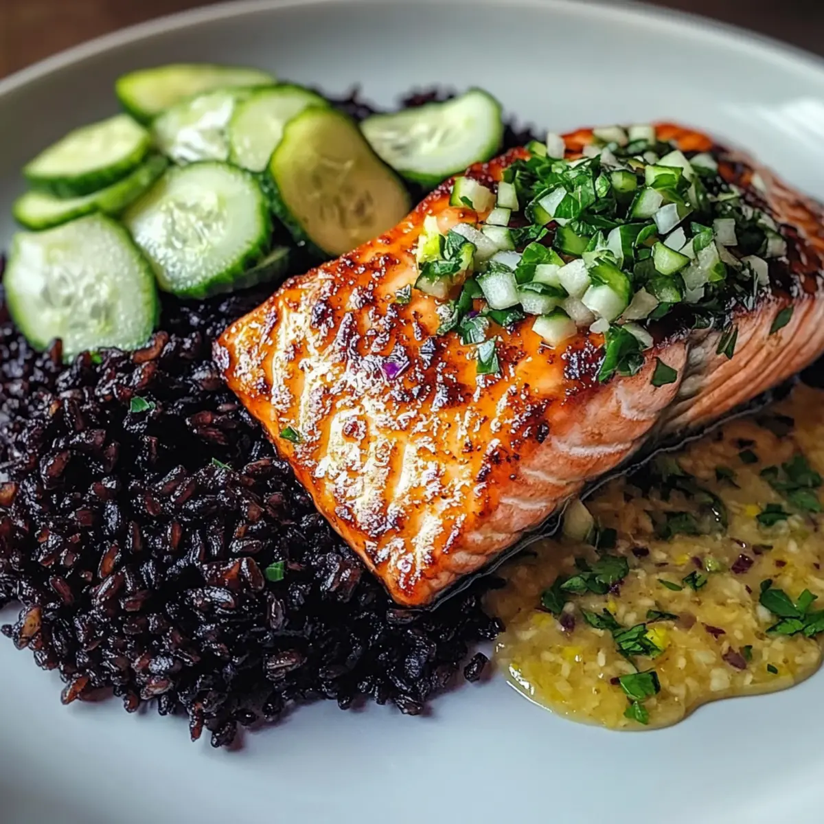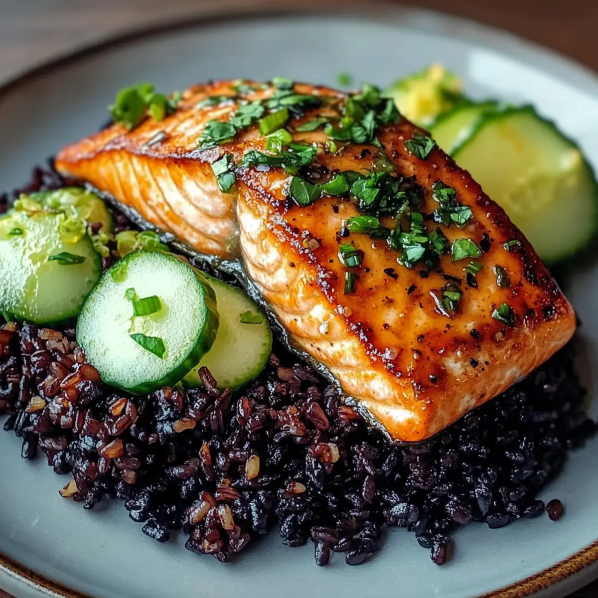 Jump to Recipe Print RecipeAs I lifted the lid off my steamer, the heady aroma of miso wafted through my kitchen, tantalizing my senses. Today’s recipe is a heartfelt tribute to healthy eating: Miso Salmon with Black Rice and Coconut Cucumber Salad. This vibrant dish is not just a feast for the eyes; it’s brimming with omega-3 fatty acids and essential nutrients that make dinnertime feel like a nurturing embrace. Enjoying this meal means embracing a quick prep time that leaves you with plenty of moments to savor at the table rather than the drive-thru. The unique combination of nutty black rice, flaky salmon, and a refreshing coconut cucumber salad transforms an ordinary dinner into a culinary experience that celebrates wellness and flavor. Are you ready to create a meal that nourishes both body and soul? Let’s dive in! Why is Miso Salmon a Perfect Dinner? Healthy and delicious, this recipe is a delightful way to indulge in flavorful nutrition. Quick prep means you can whip up dinner in no time, leaving you plenty of time to enjoy it. Unique textures come from the flaky salmon, chewy black rice, and crunchy coconut cucumber salad, making each bite a joy. Versatile enough to impress guests, it pairs perfectly with bright flavors like lime juice and fresh herbs, or even serves as a healthy meal prep option for the week. If you love vibrant dishes like the Honey Sriracha Salmon or crave something fresh like Fried Rice Colorful, this Miso Salmon won’t disappoint! Miso Salmon with Black Rice Ingredients For the Salmon Salmon – Rich in omega-3 fatty acids; using skin-on enhances crispiness. Miso Paste – Provides an irresistible umami flavor; if using red miso, reduce the amount to manage saltiness. Mirin – Adds sweetness; replace with rice vinegar mixed with sugar if unavailable. Lime Juice – Lifts flavors; vinegar can be used in its place if needed. For the Black Rice Black Rice – Offers a unique nutty taste and fiber; brown rice is a suitable substitute if black rice is hard to find. For the Salad Cucumber – Brings refreshing crunch; opt for English cucumber to minimize seeds. Coconut Milk – Adds a creamy texture to the dressing; plain yogurt can lower fat content if preferred. Step‑by‑Step Instructions for Miso Salmon with Black Rice and Coconut Cucumber Salad Step 1: Prepare Marinade In a small bowl, combine miso paste, mirin, and a splash of lime juice until smooth. Coat the skin-on salmon fillets evenly with this mixture, ensuring every inch is covered for maximum flavor. Let the salmon marinate for at least 30 minutes at room temperature, allowing the umami flavors to infuse deeply into the fish. Step 2: Cook Black Rice Rinse 1 cup of black rice under cold water until the water runs clear to remove excess starch. In a medium saucepan, combine the rinsed rice with 2 cups of water, then bring to a boil over high heat. Once boiling, reduce the heat to low, cover, and let it simmer for 25-30 minutes until the rice is tender and the water is absorbed, giving it a chewy texture. Step 3: Cook Salmon Preheat your oven to 400°F (200°C) or heat a grill. Place the marinated salmon fillets skin-side down on a lined baking sheet or grilling pan. Bake or grill for about 12-15 minutes, or until the salmon is opaque and flakes easily with a fork. This ensures your Miso Salmon is perfectly cooked without drying out. Step 4: Make Salad While the salmon is cooking, prepare the coconut cucumber salad. In a mixing bowl, toss diced cucumber with coconut milk and the remaining lime juice. Season this mix to taste with salt and pepper, ensuring a delightful balance of flavors that will complement the rich miso glaze. Step 5: Serve To plate your Miso Salmon with black rice, spoon a generous portion of black rice onto each plate. Top with the beautifully cooked salmon fillet, and serve the creamy coconut cucumber salad alongside. Add lime wedges for an extra burst of freshness and enjoy your vibrant meal that’s both nourishing and comforting. Expert Tips for Miso Salmon Perfect Timing: Cook salmon until just opaque; overcooking can lead to dryness. Aim for 12-15 minutes for the juiciest Miso Salmon. Marinating Mindfully: Limit marinade time to 30-60 minutes. Over-marinating can result in saltiness due to the miso paste. Adjust as needed for your taste. Texture Matters: Ensure black rice is rinsed thoroughly for the best texture. This removes excess starch and helps achieve that delightful chewiness. Cucumber Crunch: Use English cucumbers to minimize seeds and enhance crunch. Freshness in your coconut cucumber salad is key for balance in the dish. Temperature Check: Always use a food thermometer to check salmon doneness; it should reach an internal temperature of 145°F (63°C) for safe eating. Flavor Elevation: Consider garnishing your dish with fresh herbs or sesame seeds for an added flavor layer that complements your Miso Salmon with black rice and coconut cucumber salad beautifully. Make Ahead Options These Miso Salmon with Black Rice and Coconut Cucumber Salad are perfect for busy weeknights! You can marinate the salmon up to 24 hours before cooking, allowing the flavors to deepen beautifully. Additionally, prepare the black rice and coconut cucumber salad up to 3 days in advance; store each component separately in airtight containers in the refrigerator to maintain freshness. When it’s time to serve, simply reheat the black rice and bake or grill the marinated salmon for about 12-15 minutes. Whip up the salad right before dining for that refreshing crunch, ensuring a delicious meal that feels just as gourmet as when freshly made! How to Store and Freeze Miso Salmon with Black Rice and Coconut Cucumber Salad Fridge: Store leftover Miso Salmon, black rice, and coconut cucumber salad separately in airtight containers. They can last up to 3 days for optimal freshness. Freezer: For longer storage, freeze Miso Salmon wrapped tightly in plastic wrap and placed in a freezer-safe bag