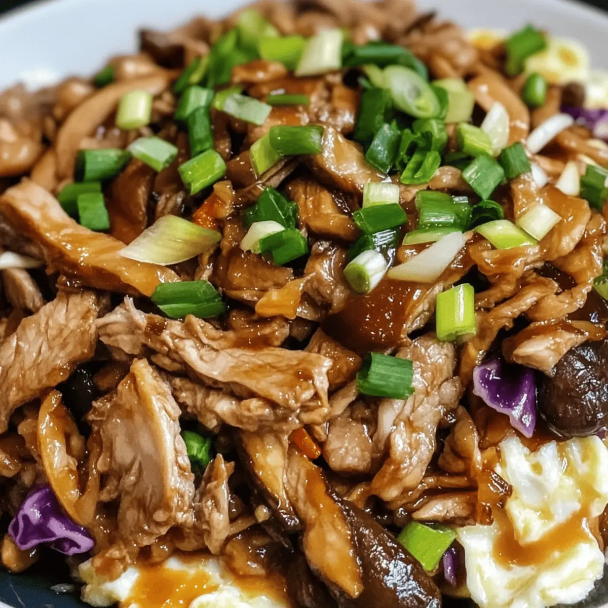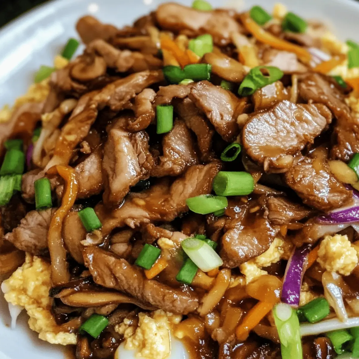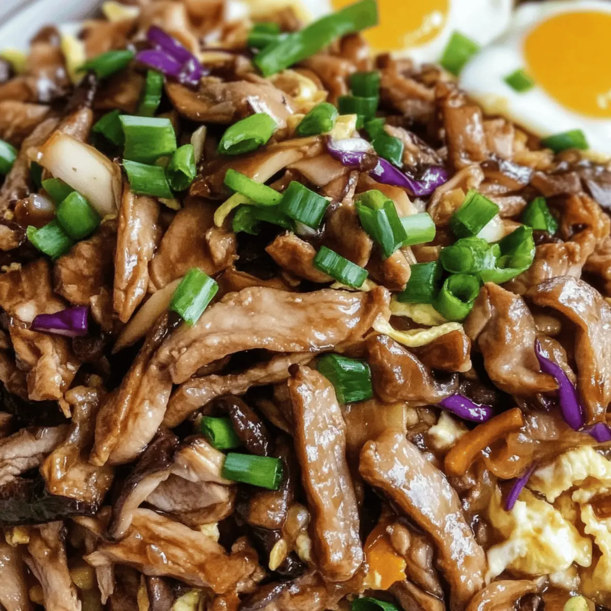 Jump to Recipe Print Recipe“Who knew a simple stir-fry could spark so much joy in the kitchen? Easy Moo Shu Pork is that delightful recipe, blending tender marinated pork with earthy shiitake mushrooms and vibrant veggies. This customizable dish not only serves as a wholesome alternative to takeout, but it also empowers you to create a healthy, balanced meal in under 30 minutes. It’s perfect for busy weeknights or when you’re entertaining friends with minimal fuss. Whether you’re sticking to the traditional pork or swapping in chicken, beef, or even tofu, you can personalize it to suit every palate. Curious about how this flavorful creation can elevate your dinner game? Let’s dive into the details!” Why is Moo Shu Pork so Special? Customization at Your Fingertips: You can easily swap the pork for chicken, beef, or tofu, tailoring it to fit any diet or taste preference. Quick to Prepare: Ready in under 30 minutes, it’s a time-saving dish for those hectic nights when cooking seems overwhelming. Flavor Explosion: The balance of savory hoisin sauce, earthy shiitake mushrooms, and fresh veggies creates a delightful taste experience that rivals takeout. Health Conscious: Packed with lean protein and vibrant vegetables, it’s a balanced meal that nourishes without compromising on flavor. Crowd-Pleasing Dish: Whether for family or friends, this restaurant-quality recipe will impress and satisfy everyone at your table. Feel free to explore our other vegetable stir-fry options for more delicious ideas! Moo Shu Pork Ingredients For the Marinade • Hoisin sauce – Provides a rich, sweet, and savory base; try substituting with Chinese barbecue sauce for a similar flavor. • Rice wine – Adds depth to the marinade; if unavailable, consider using dry sherry or simply omitting it. • Low sodium soy sauce – Incorporates the essence of umami while controlling sodium content; use regular soy sauce in moderation if desired. • Rice vinegar – Offers acidity to balance the dish’s flavors; apple cider vinegar works well as a substitute. • Garlic – Adds aromatic flavor; use fresh minced garlic for the best taste. • Ginger – Provides warmth and a hint of spice; fresh grated ginger enhances the overall flavor profile. • Cornstarch – Thickens the marinade; vital for achieving a silky sauce consistency. • Sesame oil – Imparts a nutty flavor; a little goes a long way for delicious depth. • Black pepper – Brings a mild heat to the dish; adjust based on your spice preference. • Mirin – A sweet rice wine that adds depth; if absent, a touch of sugar and water can stand in. For the Main Dish • Pork tenderloin – The primary protein, lean and tender; feel free to substitute with chicken breast, beef, or tofu for variety. • Vegetable oil – Used for frying; other neutral oils like canola or sunflower oil work just as well. • Eggs – Add richness; for vegan options, try scrambled tofu as an alternative. • Tricolor coleslaw – Brings crunch and nutrition; substitute with shredded cabbage and carrots if needed. • Shiitake mushrooms – Provide an earthy flavor; replace with button mushrooms for a milder taste if desired. • Green onions – Add freshness and color; chives or scallions can be used as alternatives. Now that you’re armed with these essential ingredients, it’s time to embark on your Moo Shu Pork journey. Remember, this dish’s ability to adapt is what makes it truly special! Enjoy the cooking adventure! Step‑by‑Step Instructions for Moo Shu Pork Step 1: Prepare the Marinade In a medium-sized bowl, whisk together hoisin sauce, rice wine, low sodium soy sauce, rice vinegar, minced garlic, grated ginger, cornstarch, sesame oil, black pepper, and mirin until smooth. This flavorful marinade will serve as a base for your Moo Shu Pork. Reserve about ½ cup for later use to ensure a rich sauce at the end. Step 2: Marinate the Pork Add the pork tenderloin strips to the bowl with the remaining marinade, ensuring each piece is coated evenly. Cover and let it marinate in the refrigerator for at least 30 minutes. This step allows the flavors to penetrate the meat, resulting in tender, flavorful pork that will shine in your dish. Step 3: Cook the Eggs Heat 1 tablespoon of vegetable oil in a large skillet over medium heat. Once the oil is shimmering, crack the eggs into the pan and scramble them until fully set, about 2-3 minutes. Gently slide the scrambled eggs onto a plate, slice them into strips, and keep them warm as you proceed to cook the pork. Step 4: Cook the Pork In the same skillet, add the marinated pork strips in a single layer, making sure not to overcrowd the pan. Sear the pork for about 2-3 minutes, stirring occasionally, until it’s browned and cooked through. Remove the pork from the skillet and keep it warm to retain its juiciness while you prepare the vegetables. Step 5: Stir-Fry Vegetables In the same skillet, pour in another tablespoon of vegetable oil and add the tricolor coleslaw and shiitake mushrooms. Sauté the mixture over medium-high heat for about 4-5 minutes, stirring frequently, until the vegetables are tender but still crisp. Their vibrant colors and flavors will add a delightful contrast to the Moo Shu Pork. Step 6: Combine & Serve Return the cooked pork and scrambled eggs to the skillet with the sautéed vegetables. Pour the reserved marinade over the mixture and stir well to combine, heating everything through for an additional 2-3 minutes. Once warmed, serve your delicious Moo Shu Pork immediately, wrapped in flour tortillas or Chinese pancakes for a satisfying meal. Expert Tips for Moo Shu Pork Marinate Wisely: Ensure the pork is well-coated in the marinade and let it sit for at least 30 minutes to enhance flavor. Short marinating time results in less flavorful meat. Avoid Overcrowding: When cooking the pork, cook in batches if necessary. Overcrowding the skillet can lead to steaming rather than searing, making it to