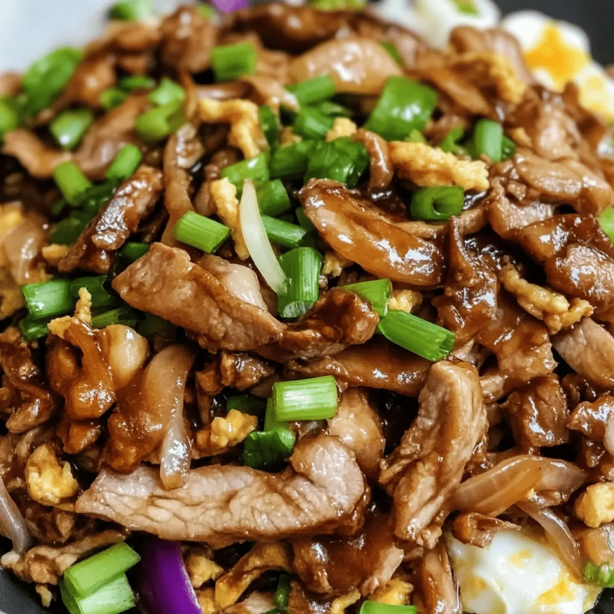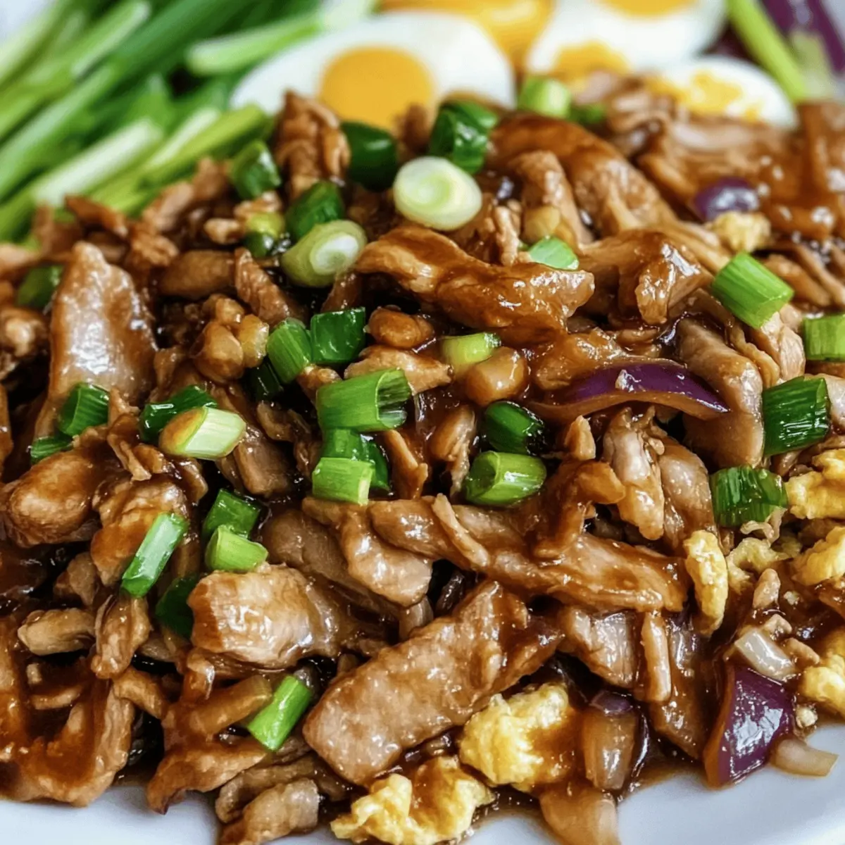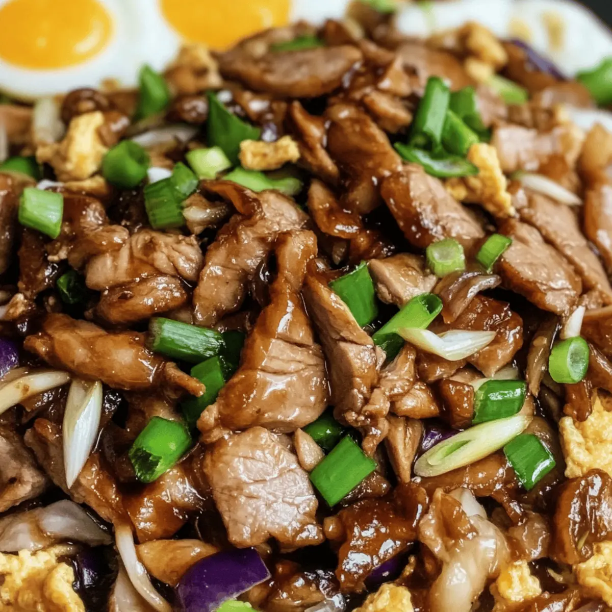 Jump to Recipe Print RecipeAs I stood in my kitchen, a delightful aroma began to fill the air, swirling with hints of garlic and ginger. That’s when I realized it was time to whip up a comforting plate of Easy Moo Shu Pork with Savory Sauce. This traditional Chinese dish marries tender, marinated pork with crisp vegetables and fluffy scrambled eggs, all draped in a sticky, mouthwatering sauce. Perfect for busy weeknights, this recipe is not only quick to prepare but also offers a customizable twist for any taste preference. Whether you’re looking for a protein-rich dinner that beats fast food or a fresh approach to weeknight meals, Moo Shu hits the spot. Curious how to make this easy favorite your own? Let’s dive into the recipe! Why is Moo Shu a Must-Try? Satisfying, Flavorful Experience: The balance of savory pork and vibrant vegetables creates a delicious harmony that delights the palate. Quick Prep Time: With just a few simple steps, you can whip up this dish in no time—perfect for busy weeknights! Customizable Ingredients: Feel free to swap in chicken, beef, or even tofu to match your dietary needs. Add your favorite veggies for a personal touch! Crowd-Pleasing Choice: Impress your family or guests; everyone loves a comforting, homemade meal that’s reminiscent of Chinese takeout without the wait! Nutrient-Packed Delight: Thanks to its protein-rich components and colorful vegetables, this dish offers a wholesome dining experience. If you love exploring new flavors, this Moo Shu Pork recipe will surely become a staple in your home cooking! Moo Shu Pork Ingredients • Dive into the flavors of Moo Shu with these essential ingredients! For the Marinade Hoisin Sauce – Adds sweetness and depth; substitute with BBQ sauce if you’re in a pinch. Rice Wine – Enhances flavor profile; you can omit it or use white wine as a substitute. Soy Sauce – Provides umami and saltiness; opt for low-sodium soy for a healthier twist. Rice Vinegar – Adds acidity to balance richness; apple cider vinegar can work in a pinch. Garlic (2 cloves, minced) – For aromatic flavor; fresh is best, but powder can be used in lesser quantity. Ginger (1 tbsp, grated) – Adds a warm spice note; ground ginger is a usable substitute. Cornstarch (2 tsp) – Thickens the marinade; arrowroot can be an alternative as well. Sesame Oil (1 tsp) – Imparts a nutty aroma; peanut oil is a delightful swap. Black Pepper (½ tsp) – For mild heat; consider using white pepper for a different flavor. Mirin (2 tbsp, optional) – Sweet rice wine for depth; omit if not available. For the Main Dish Pork Tenderloin (1 ¼ lb, thinly sliced) – The main protein source; feel free to swap it with chicken breast or tofu. Vegetable Oil (2-3 tbsp) – For sautéing; any high-heat oil like avocado oil is a great choice. Eggs (2 large, lightly beaten) – Provide richness; omit for a vegan version or replace with scrambled tofu. Tricolor Coleslaw (16 oz or 6-7 cups shredded mix) – Adds crunch and color; substitute with shredded cabbage or veggies of your choice. Shiitake Mushrooms (8 oz, stemmed and sliced) – Offer an earthy flavor; button mushrooms can work if needed. Green Onions (4, thinly sliced) – For a fresh garnish; chives also make a suitable replacement. Step‑by‑Step Instructions for Moo Shu Step 1: Prepare Marinade In a mixing bowl, combine hoisin sauce, rice wine, soy sauce, rice vinegar, minced garlic, grated ginger, cornstarch, sesame oil, black pepper, and mirin. Whisk until smooth, ensuring the cornstarch is fully dissolved. Set aside ½ cup of this flavorful marinade for later. This step enhances Moo Shu’s savory profile, providing a delicious base for your pork. Step 2: Marinate Pork Place the thinly sliced pork tenderloin in the remaining marinade, ensuring every piece is well-coated. Cover the bowl and refrigerate for 30 minutes to 1 hour; this allows the flavors to seep in. As the pork marinates, the tender meat will absorb the delightful aromas, setting the stage for a tasty Moo Shu. Step 3: Cook Eggs Heat 1 tablespoon of vegetable oil in a large skillet over medium heat. Pour in the lightly beaten eggs, swirling to coat the pan. Cook until the edges begin to set (about 1-2 minutes), then gently flip to cook the other side until just golden. Remove the cooked eggs from the pan, slicing them into strips for a finishing touch on your Moo Shu. Step 4: Sauté Pork With the skillet still hot, add another tablespoon of vegetable oil. Carefully add the marinated pork, spreading it out to avoid crowding the pan. Sauté for about 2-3 minutes, stirring occasionally, until the pork is browned and cooked through. This quick cooking process keeps the pork tender and juicy, key for an appetizing Moo Shu. Step 5: Stir-fry Vegetables In the same skillet, add the tricolor coleslaw mix, sliced shiitake mushrooms, and half of the chopped green onions. Stir-fry for about 3-4 minutes until the cabbage wilts and the mushrooms are tender. This step brings vibrant colors and textures to your Moo Shu, enhancing both flavor and presentation. Step 6: Combine Ingredients Return the cooked pork and egg strips to the skillet with the vegetables. Drizzle with the reserved marinade and stir gently to combine all ingredients. Heat through over low heat for about 1-2 minutes, allowing the flavors to meld. Your Moo Shu will begin to shine, encapsulating a savory, sticky essence. Step 7: Serve Transfer the completed Moo Shu Pork to a serving dish, garnishing with the remaining green onions. Serve hot alongside warm tortillas or Chinese pancakes. The contrasting flavors and textures will delight your family or guests, making this comforting dish a standout meal any night of the week. How to Store and Freeze Moo Shu Fridge: Store leftover Moo Shu in an airtight container in the refrigerator for up to 3 days. Reheat gently on the stovetop to preserve the texture of the pork and vegetables. Freezer: For longer storage, freeze Moo Shu in