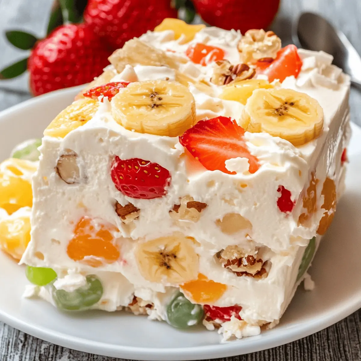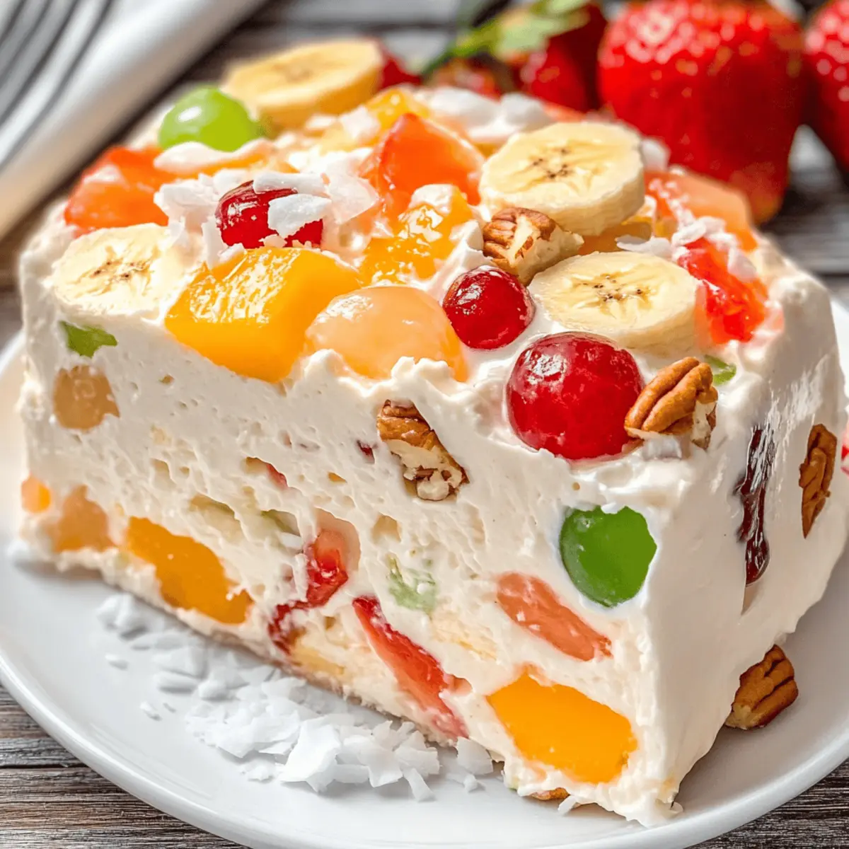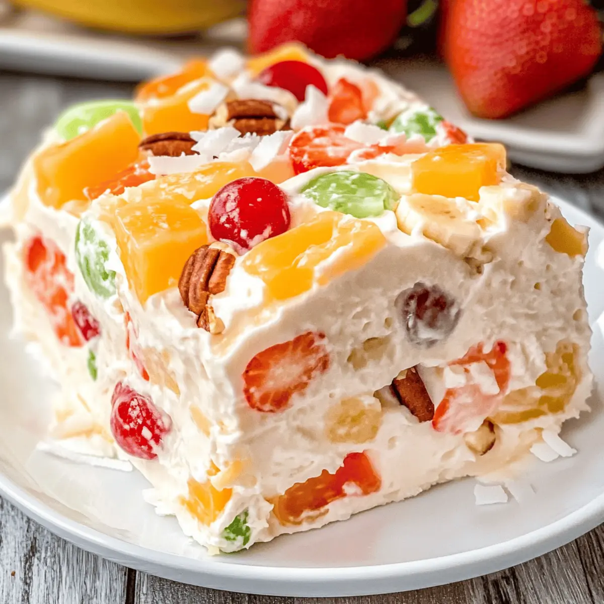Jump to Recipe Print RecipeEvery summer barbecue, I hear echoes of laughter and memories of my childhood revolving around Nana’s Frozen Fruit Salad. This simple, yet nostalgic recipe is a creamy combination of fresh fruits, pecans, and a smooth blend of whipped cream and cream cheese that has graced countless family gatherings. Not only is it a make-ahead frozen dessert that can be prepared in a flash, but it’s also a guaranteed crowd-pleaser that brightens up any table. With a delightful crunch and a refreshing flavor, this salad is an inviting alternative to traditional heavy sweets. Want to add a twist? Consider a splash of lime or a sprinkle of shredded coconut for a tropical vibe! Curious about how to make this fruity masterpiece? Let’s dive into the recipe! Why is Nana’s Frozen Fruit Salad a Must-Try? Nostalgic flavors that evoke cherished memories of family gatherings resonate with everyone. Effortless Preparation means you can whip up this creamy delight in no time. Refreshing Texture combines smooth, dreamy creaminess with a delightful crunch from pecans, making every bite a joy. Versatile Options allow you to tailor it with seasonal fruits or even a touch of coconut for a tropical twist. Perfect as a dessert or a side, this salad promises to be the star of any occasion! Don’t forget to check out our Frozen Grapes for more refreshing treats! Nana’s Frozen Fruit Salad Ingredients • Ready to create a refreshing treat? Here’s what you’ll need! For the Base Whipped Cream – Adds a light, creamy texture that makes this salad irresistible. Cream Cheese – Provides a rich base; consider using light cream cheese for a lower-fat option. For the Fruit Mixed Fresh Fruits (e.g., strawberries, bananas, grapes) – Brings sweetness and vibrant colors to the dish; feel free to substitute with your favorite seasonal fruits. For the Crunch Pecans – Introduces a satisfying crunch and nutty flavor; you can swap these for walnuts or leave them out for a nut-free version. For Sweetness Sugar – Sweetens the salad beautifully; reduce the amount for a less sweet dish or opt for a sugar substitute if desired. Embrace the magic of Nana’s Frozen Fruit Salad and get ready to impress your friends and family at your next gathering! Step‑by‑Step Instructions for Nana’s Frozen Fruit Salad Step 1: Prepare the Base In a large mixing bowl, combine 2 cups of whipped cream with 8 ounces of softened cream cheese. Use an electric mixer on medium speed to blend until smooth and creamy, which should take about 2-3 minutes. The mixture should be light and fluffy, with no lumps remaining, setting a delightful base for your Nana’s Frozen Fruit Salad. Step 2: Fold in the Fruits Gently fold in 4 cups of chopped mixed fresh fruit, such as strawberries, bananas, and grapes, into the creamy mixture. Use a spatula to ensure even distribution without deflating the whipped cream. This process should take about 1-2 minutes, aiming for a colorful blend that highlights the freshness of the fruits in your salad. Step 3: Add the Crunch Stir in 1 cup of chopped pecans and 1/4 cup of sugar to the fruit mixture, adjusting the sweetness to your taste. Mix carefully until everything is incorporated, taking care not to overmix. The pecans will add a delightful crunch to Nana’s Frozen Fruit Salad and should complement the textures beautifully. Step 4: Freeze the Mixture Transfer the fruit mixture into a freezer-safe dish, spreading it evenly. Smooth the top with a spatula and cover tightly with plastic wrap or a lid. Freeze the salad for at least 4-6 hours, or until solid, allowing the flavors to meld together, creating a refreshing treat perfect for hot days. Step 5: Soften Before Serving Once frozen, remove the dish from the freezer and let it sit at room temperature for about 10-15 minutes before serving. This step ensures that your Nana’s Frozen Fruit Salad softens slightly for easier scooping. The ideal texture is creamy and easy to serve, resembling a delightful fruit parfait. Expert Tips for Nana’s Frozen Fruit Salad Stiff Peaks: Ensure your whipped cream is beaten to stiff peaks before folding it in. This guarantees a fluffy texture in your Nana’s Frozen Fruit Salad. Fruit Freshness: Use the ripest fruits for the best flavor and sweetness. Adjust the sugar based on the natural sweetness of your fruits. Freezer Storage: Cover the freezing dish tightly with plastic wrap to avoid freezer burn, preserving the creamy texture of your frozen salad. Nut-Free Option: To make Nana’s Frozen Fruit Salad nut-free, simply omit the pecans or substitute them with sunflower seeds for added crunch. Chill Time Matters: Allow the salad to soften at room temperature before serving. This makes it easier to scoop while maintaining that creamy delightfulness. How to Store and Freeze Nana’s Frozen Fruit Salad Fridge: Store any leftovers in an airtight container in the fridge for up to 3 days. Enjoy it as a refreshing snack right from the fridge! Freezer: Nana’s Frozen Fruit Salad can be kept in the freezer for up to 2 weeks. Ensure it’s tightly covered to prevent freezer burn. Thawing: Before serving, remove the salad from the freezer and allow it to sit at room temperature for about 10-15 minutes to soften, resulting in an easy-to-scoop texture. Reheating: There’s no need to heat this salad; simply serve it chilled for the best experience! Make Ahead Options Nana’s Frozen Fruit Salad is a fantastic dish for busy home cooks looking to save time while still delighting their family and friends! You can prepare the creamy base of whipped cream and cream cheese up to 24 hours in advance, storing it in the refrigerator to keep it fresh. Additionally, chop your mixed fruits and pecans up to 3 days ahead of serving; simply refrigerate them in an airtight container to maintain their quality. When you’re ready to serve, just fold the prepared fruits and nuts into the frozen base, transfer to a freezer-safe dish,