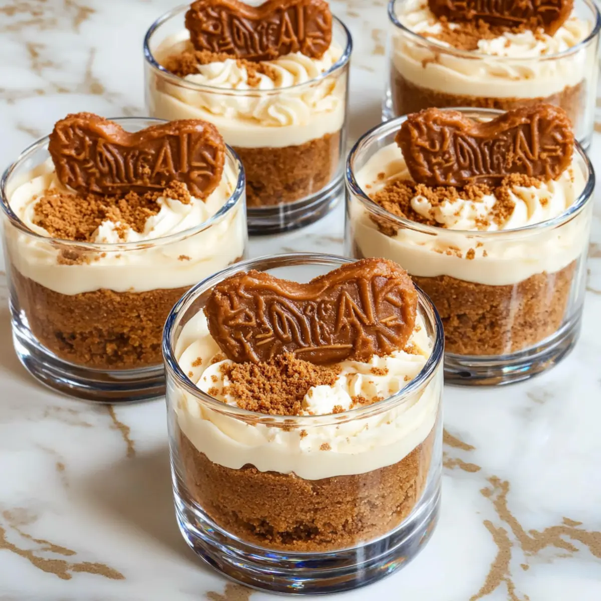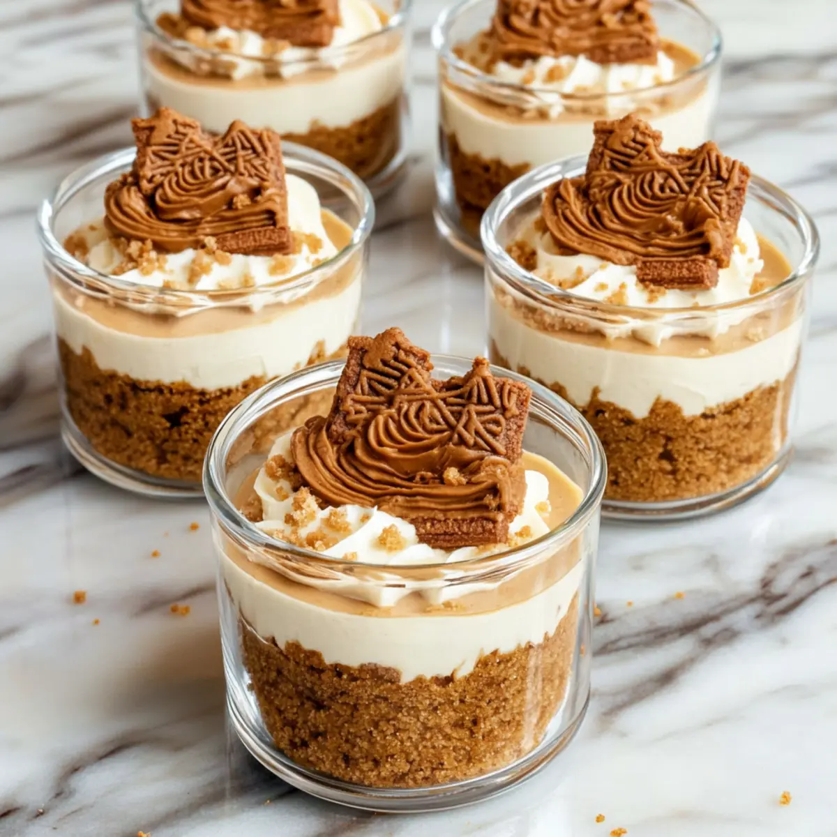 Jump to Recipe Print RecipeAs I flipped through my recipe collection, I stumbled upon a creamy delight that instantly transported me to dessert heaven: No-Bake Biscoff Cheesecake Cups. With their layered textures and the iconic, caramelized flavor of Biscoff cookies, these little cups of joy are the perfect antidote to a hectic week. What I adore about this recipe is not just its incredibly quick prep time of just 15 minutes, but also how effortlessly it impresses guests or satisfies my own sweet cravings. Plus, they’re make-ahead friendly—ideal for those moments when you want a delectable dessert without the fuss. Curious how easily you can whip up these treats and possibly customize them with your favorite cookies? Let’s dive in! Why You’ll Adore These Cheesecake Cups Effortless Preparation: With just 15 minutes of hands-on time, you can have these divine No-Bake Biscoff Cheesecake Cups ready to chill, making them perfect for busy weeknights. Decadent Layers: Enjoy the enchanting combination of creamy filling and crunchy cookie crust that will tantalize your taste buds with every bite. Versatile Variations: Feel free to customize using your favorite cookies, whether it’s graham crackers or Oreos—endless possibilities await! Try them with our Oreo Cheesecake Decadent for a fun twist! Make-Ahead Convenience: Prep these cups in advance and simply pop them in the fridge. They’re an excellent choice for entertaining or a last-minute dessert. Crowd-Pleasing Delight: Impress friends and family with visually stunning layers that look as good as they taste—perfect for gatherings or special occasions! Dare to experiment with flavors or toppings for a unique spin—your guests will be asking for seconds! No-Bake Biscoff Cheesecake Cups Ingredients For the Crust • Biscoff Cookies – The star of the show, providing that signature caramel flavor; substituting with graham crackers adds a different twist. • Unsalted Butter – Binds the cookie crust together; coconut oil makes it a dairy-free alternative. For the Cheesecake Filling • Heavy Cream – Gives a light and fluffy texture; consider coconut cream for a dairy-free option. • Cream Cheese – Essential for richness and structure; swap in mascarpone for a creamier flavor. • Powdered Sugar – Sweetens the filling delightfully; granulated sugar can also be used if needed. • Vanilla Extract – Enhances the overall flavor; vanilla bean paste offers a more intense aroma. • Biscoff Spread – Adds a luscious layer of flavor; for variety, try peanut butter or any nut butter you love. These ingredients come together to create delightful No-Bake Biscoff Cheesecake Cups that are simple to make and utterly delicious! Step‑by‑Step Instructions for No-Bake Biscoff Cheesecake Cups Step 1: Crust Preparation Begin by crushing 18 Biscoff cookies into fine crumbs using a food processor or by placing them in a zip-top bag and rolling with a rolling pin. Melt 4 tablespoons of unsalted butter and mix it into the crumbs until well combined. Distribute the mixture evenly into 6 serving cups, pressing down firmly to create a solid crust layer. Step 2: Whipped Cream In a chilled mixing bowl, pour in 1 cup of heavy cream. Using an electric mixer, whip the cream on medium-high speed until stiff peaks form, which should take about 3–5 minutes. Keep an eye on the cream; it should be fluffy and light in texture, standing tall when the beaters are lifted. Step 3: Cheese Mixture In a separate bowl, beat 8 ounces of softened cream cheese with 1 cup of powdered sugar and 1 teaspoon of vanilla extract. Use an electric mixer on medium speed for about 2-3 minutes until the mixture reaches a smooth consistency with no lumps. This creamy blend is the foundation for your No-Bake Biscoff Cheesecake Cups. Step 4: Combine Fillings Carefully fold the whipped cream into the cream cheese mixture using a spatula. Gently incorporate the two until no white streaks remain, ensuring a light and fluffy filling. This step is crucial to keep the texture airy and delicious in your cheesecake cups. Step 5: Layering Using a piping bag or a spoon, layer the creamy cheesecake filling over the prepared cookie crust in each cup. Fill generously, ensuring an even distribution. Aim for a visually appealing layer of filling that rises just above the crust, showcasing those luscious textures of your No-Bake Biscoff Cheesecake Cups. Step 6: Biscoff Spread Layer Take 1/2 cup of Biscoff spread and microwave it for about 15-20 seconds until it becomes slightly warm and pourable. Drizzle this melted spread across the tops of your cheesecake layers in each cup. The warmth will enhance the flavor and help it settle beautifully on the creamy filling. Step 7: Chill Cover each cheesecake cup with plastic wrap and refrigerate for at least 1 hour. This chilling time allows the flavors to meld and the cheesecake to set, creating a perfect texture. You’ll know they’re ready when they’re firm to the touch and slightly chilled. Step 8: Serve Before serving, top each cup with whole or crushed Biscoff cookies for that extra crunch and visual appeal. Enjoy your No-Bake Biscoff Cheesecake Cups chilled, and delight in the combination of creamy and crunchy layers that are sure to impress everyone at your table! What to Serve with No-Bake Biscoff Cheesecake Cups Bring your dessert experience full circle with delightful pairings that elevate these sweet treats. Fresh Berries: Juicy strawberries or raspberries add a tart contrast that beautifully balances the sweetness of the cheesecake cups. Enjoying a berry alongside each bite creates a refreshing taste explosion. Coffee or Espresso: A cozy cup of coffee or a shot of espresso complements the rich flavors of Biscoff. The warmth and slight bitterness of the coffee enhance the overall dessert, making each indulgence even sweeter. Citrusy Sorbet: A lemon or orange sorbet provides a vibrant burst of refreshing flavor that cuts through the crea