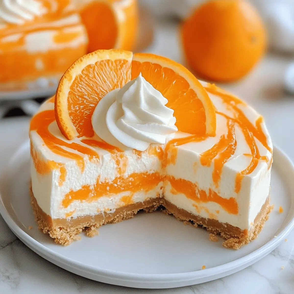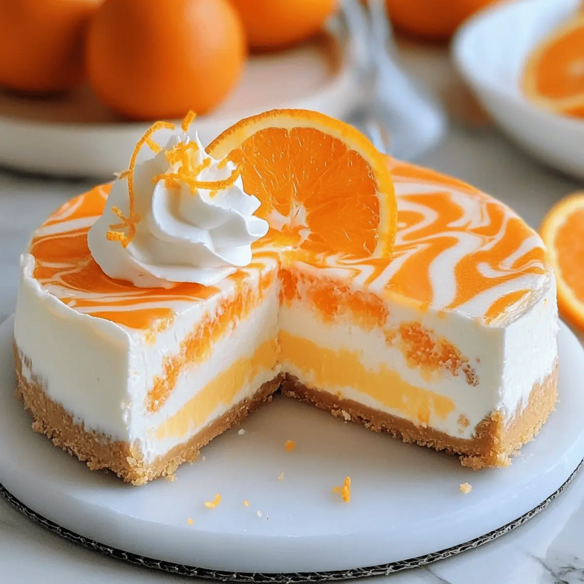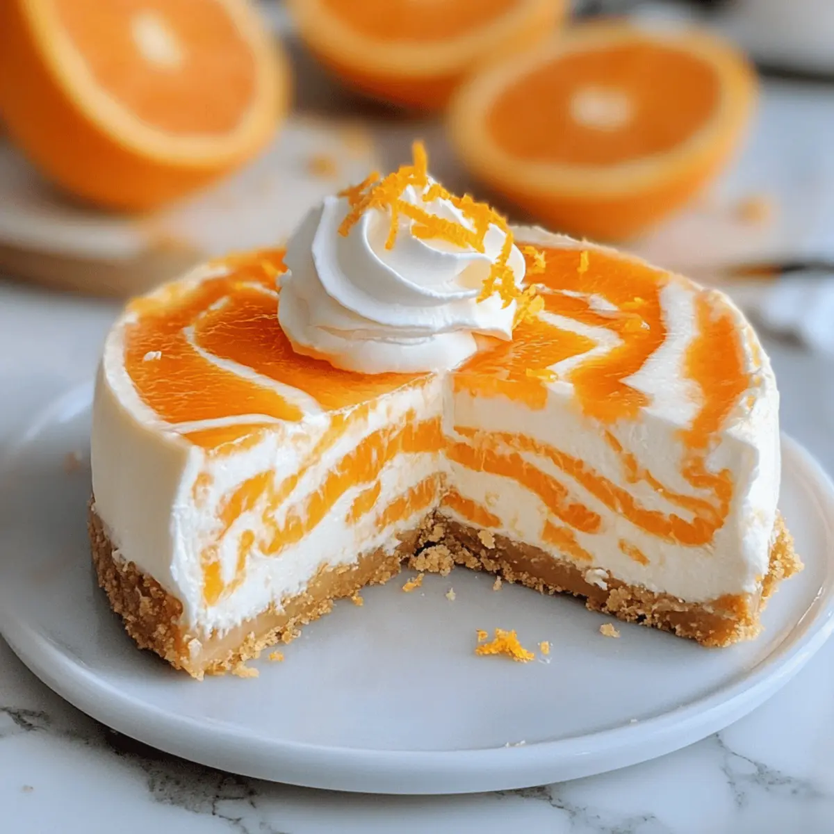 Jump to Recipe Print RecipeThere’s something magical about summer’s arrival, isn’t there? The sun shines brighter, and those nostalgic flavors from childhood come rushing back, especially when it comes to desserts. This No-Bake Orange Creamsicle Cheesecake captures that magic perfectly, blending the zesty delight of orange jello with a creamy cheesecake that feels like a cool, refreshing hug. Not only is it incredibly easy to whip up—no oven required—but it also makes for a fantastic make-ahead treat that your friends and family will adore. Picture this: a chilled slice on a warm day, bringing a wave of childhood memories alongside its luscious taste. Ready to create a dessert that’s both a crowd-pleaser and a breeze to prepare? Let’s dive in! Why is This Cheesecake a Must-Try? Nostalgic Flavors: This No-Bake Orange Creamsicle Cheesecake evokes summer memories with its vibrant orange jello and creamy filling—deliciously reminiscent of childhood treats. Effortless Preparation: Enjoy the ease of preparing this dessert without turning on the oven; it’s perfect for those hot days when you want something sweet but easy. Versatile Options: Feel free to experiment with different jello flavors, like lemon or lime, to create your own refreshing twist. Crowd-Pleaser: This cheesecake is guaranteed to impress guests at any gathering, whether it’s a family barbecue or a casual get-together. Discover more delightful flavors with our Oreo Cheesecake Decadent or Blueberry Crumble Cheesecake for an extended dessert menu! Beautiful Presentation: With its stunning layers and optional garnishes, it’s not only a treat for the taste buds but also a feast for the eyes. No-Bake Orange Creamsicle Cheesecake Ingredients For the Crust Graham Cracker Crumbs – A sweet and crunchy base; you can substitute with vanilla wafers or Oreo crumbs for a different flavor. Unsalted Butter – Binds the crust ingredients together and adds richness; use melted for better mixing. For the Filling Cream Cheese – Essential for that creamy texture; full-fat cream cheese yields the best results. Powdered Sugar – Sweetens the filling smoothly, ensuring a pleasant texture without grittiness. Heavy Whipping Cream – Whipped to stiff peaks, it lightens the cheesecake, making it airy and delightful. Vanilla Extract – Enhances flavor with its warm notes; even a splash can elevate the overall taste. Orange Zest – Provides a burst of citrus aroma and flavor; an essential touch in this no-bake orange creamsicle cheesecake. For the Jello Layer Orange Jello – Adds vibrant color and flavor while helping the cheesecake set perfectly; feel free to experiment with other flavored jellos for variety. Boiling Water – Facilitates the dissolution of jello powder to create a smooth layer. Optional Garnishes Whipped Cream – For topping, it adds an extra layer of decadence and visual appeal. Fresh Orange Segments – Excellent for decoration and adding a fresh citrusy bite. Dive into creating this delightful dessert that will surely whisk you back to sun-soaked days of your childhood! Step‑by‑Step Instructions for No-Bake Orange Creamsicle Cheesecake Step 1: Prepare Jello In a mixing bowl, combine the orange jello powder with one cup of boiling water. Whisk vigorously until the jello is fully dissolved, ensuring no granules remain. Allow the mixture to cool at room temperature for about 30 minutes, or until it thickens slightly, creating a beautiful base for your No-Bake Orange Creamsicle Cheesecake. Step 2: Prepare Pan Spray a 9-inch springform pan with non-stick cooking spray to prevent sticking, then carefully line the bottom and sides with parchment paper. This step makes removal of your finished cheesecake a breeze and ensures a smooth presentation when it’s time to serve your delightful No-Bake Orange Creamsicle Cheesecake. Step 3: Make Crust In a medium bowl, mix together the graham cracker crumbs and melted unsalted butter until both are well combined. Press the mixture firmly into the bottom and slightly up the sides of the prepared springform pan. Place the crust in the freezer for about 30 minutes to set, ensuring a crunchy base for your creamy cheesecake. Step 4: Beat Cream Cheese While the crust sets, take a large mixing bowl and add softened cream cheese, along with the powdered sugar. Using an electric mixer, beat the mixture on medium speed until it becomes smooth and creamy, about 2-3 minutes. This step ensures a luscious filling for your No-Bake Orange Creamsicle Cheesecake. Step 5: Whip Cream In another bowl, pour in the heavy whipping cream, half a cup of powdered sugar, vanilla extract, and orange zest. Whip the mixture with an electric mixer on medium-high speed until stiff peaks form, which usually takes around 3-5 minutes. The whipped cream will add an airy, light texture to your cheesecake filling. Step 6: Fold Filling Gently fold half of the whipped cream into the cream cheese mixture using a spatula until just combined. Then, take the cooled jello mixture and fold it into the remaining whipped cream. Be careful to maintain the airy texture by folding gently, ensuring your No-Bake Orange Creamsicle Cheesecake has a light and fluffy filling. Step 7: Assemble Spoon alternating layers of the cream cheese mixture and the jello mixture into the chilled crust, swirling them together with a knife for a visually appealing effect. Continue layering until all the filling is used, finishing with a creamy layer on top. This creates the signature look of your No-Bake Orange Creamsicle Cheesecake. Step 8: Chill Cover the assembled cheesecake with plastic wrap or a lid and place it in the refrigerator. Allow it to chill for at least 6 hours, but preferably overnight, to achieve the best texture and flavor. Once set, carefully remove the cheesecake from the springform pan and serve chilled, treating your guests to a delightful, refreshing dessert. What to Serve with No-Bake Orange Creamsicle Cheesecake 