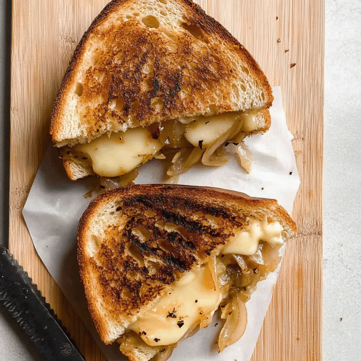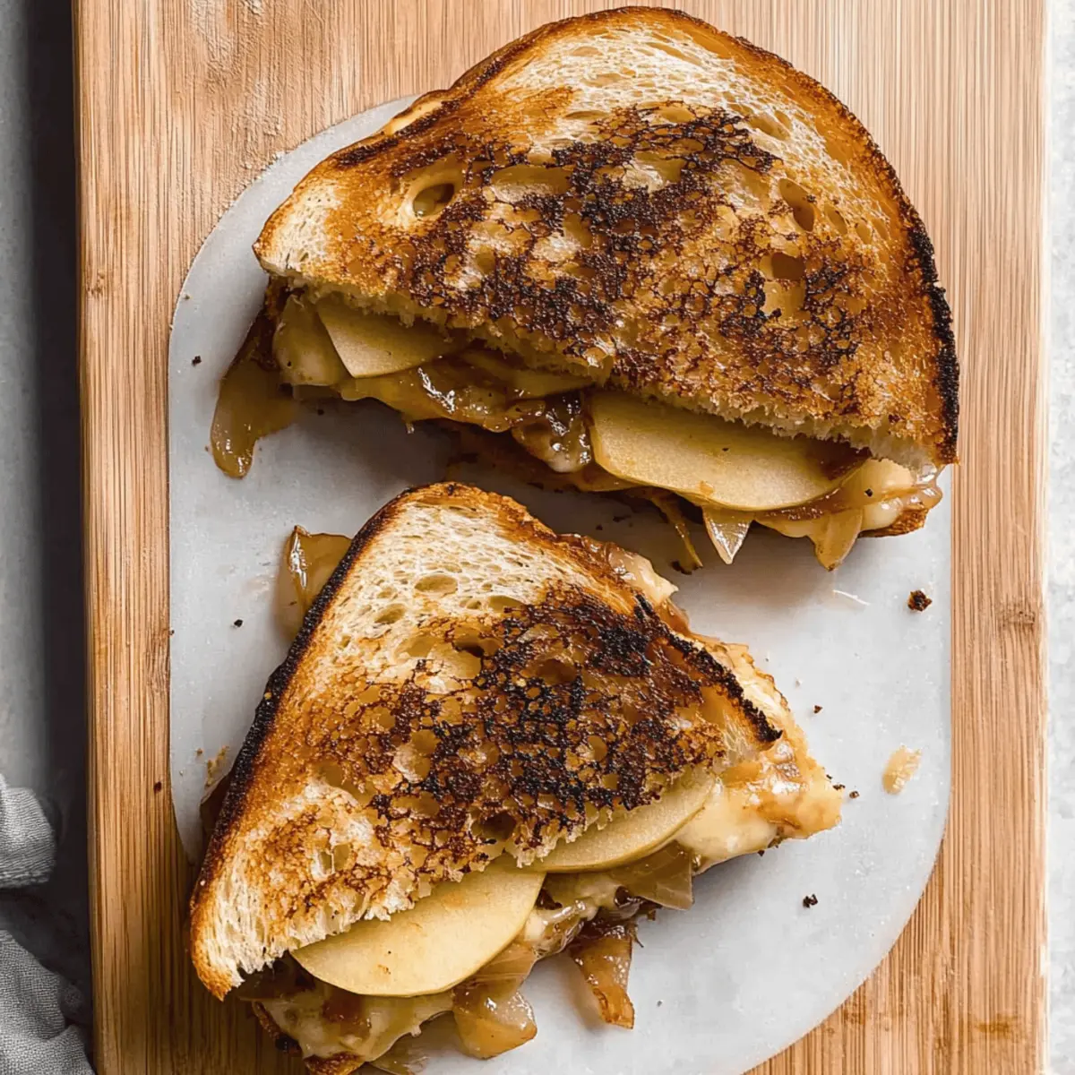 Jump to Recipe Print RecipeAs the cooler days of fall settle in, there’s a special kind of comfort that comes from curling up with a warm sandwich, don’t you think? Introducing my Caramelized Onion & Apple Grilled Cheese Sandwich, where the sweet notes of caramelized onions dance harmoniously with the tart crunch of honeycrisp apples—all enveloped in gooey cheddar and velvety brie. This recipe isn’t just about a quick meal; it’s a delightful way to elevate classic comfort food with gourmet flavors, making it perfect for impressing friends or simply enjoying on a cozy afternoon. Best of all, it comes together in a snap, so you can spend less time in the kitchen and more time savoring each delicious bite. Can you imagine how wonderful this will be with your favorite soup or salad? Let’s dive into the details! Why is this sandwich a must-try? Irresistible flavors: The sweet, caramelized onions perfectly complement the crisp tartness of honeycrisp apples, making every bite a flavor sensation. Gourmet comfort: This sandwich takes classic grilled cheese and elevates it to a gourmet experience, perfect for cozy evenings. Quick & easy: With just a few simple steps, you can whip up a meal that impresses without the fuss. Versatile pairing: Pair this creation with a bowl of delightful Herb Crusted Grilled Chicken or a refreshing green salad for a complete meal. Fun for all ages: It’s a hit with both kids and adults, making it a fantastic choice for family dinners or gatherings! Unique combinations: Don’t hesitate to swap out the cheeses or apples to create your personal twist on this scrumptious melody of flavors! Onion & Apple Grilled Cheese Sandwich Ingredients For the Bread • Sourdough Bread – The foundation; provides texture and tang. Substitute with any sturdy bread like whole grain or gluten-free types. For the Filling • Yellow Onions – Main flavor component; caramelizes for depth. Use red onions for a sweeter taste. • Honeycrisp Apple – Provides sweetness and crunch. Substitute with Granny Smith for a tart flavor. • Fresh Sage – Adds an aromatic quality; enhances overall flavor. Omit or replace with thyme if unavailable. For the Cheese • Cheddar Cheese – Offers sharpness and melts beautifully. Swap for gouda or mozzarella for different flavors. • Brie Cheese – Adds creaminess; elevates the dish. Omit or replace with cream cheese for a similar texture. For Cooking • Unsalted Butter – Ensures rich flavor and helps with browning. Use vegan butter for a dairy-free option. • Olive Oil – Helps cook the sandwich; adds healthy fat. Substitute with avocado oil for a different flavor. • Kosher Salt – Enhances flavors and aids in caramelization. Use sea salt or table salt as an alternative. Step‑by‑Step Instructions for Caramelized Onion & Apple Grilled Cheese Sandwich Step 1: Caramelize Onions In a large skillet, melt 1 tablespoon of unsalted butter and 1 tablespoon of olive oil over medium heat. Add the sliced yellow onions and stir every few minutes. After about 10 minutes, sprinkle with kosher salt to enhance flavor, and continue cooking for 30-40 minutes, stirring regularly, until they are golden brown and caramelized. If the onions get too dry, add a splash of water to keep them moist. Step 2: Prepare Sage Butter While the onions are caramelizing, soften 2 tablespoons of unsalted butter in a small bowl. Finely chop a few leaves of fresh sage and mix them into the butter, along with a pinch of salt. This aromatic sage butter will add a delightful flavor to the outside of the sandwich, elevating your Onion & Apple Grilled Cheese Sandwich to gourmet status. Step 3: Assemble Sandwich Take two slices of sourdough bread and lay one slice down, non-buttered side facing up. Start layering the sandwich: add a slice of brie cheese, followed by a layer of cheddar, slices of honeycrisp apple, and the caramelized onions. Top it with another layer of cheddar and finish with the second slice of sourdough bread, buttered side facing up. Step 4: Cook Sandwich Heat a clean skillet over medium heat and add a bit more olive oil. Place the sandwich in the skillet, buttered side down, and cook for about 3-4 minutes until golden brown and crispy. Carefully flip the sandwich and cook the other side for another 3-4 minutes, ensuring the cheeses inside are melting beautifully and the bread is a perfect toasty brown. Step 5: Serve and Enjoy Once cooked, remove the Caramelized Onion & Apple Grilled Cheese Sandwich from the skillet and let it cool for a minute before slicing it in half. The gooey interior should be melty and inviting, perfect for pairing with your favorite soup or salad. Savor each bite and share the warmth of this cozy dish with friends and family! What to Serve with Caramelized Onion & Apple Grilled Cheese Sandwich As the rich flavors of your sandwich fill the air, let’s explore delightful pairings that enhance this culinary experience. Tomato Soup: The classic combo! A warm, creamy tomato soup adds a delightful contrast and delicious comfort to the meal. Simple Green Salad: Fresh greens tossed in a light vinaigrette add a crisp, refreshing element, balancing the sandwich’s rich flavors beautifully. Sweet Potato Fries: Crispy and slightly sweet, these fries provide a satisfying crunch and a touch of warmth, making each bite blissful. Roasted Brussels Sprouts: The caramelization of Brussels sprouts brings an earthy flavor that complements the sweetness of the apple and onions perfectly. Chardonnay: A glass of chilled Chardonnay with its crisp acidity elevates the meal, enhancing the flavors of the melted cheese and caramelized onions. Apple Pie: For a sweet finish, a slice of homemade apple pie harmonizes beautifully with the sandwich’s apple notes, perfect for cozy fall evenings. Expert Tips for Onion & Apple Grilled Cheese Sandwich Onion Caramelization: Make sure to stir the onions regularly; low heat allows for even caramelization without bur