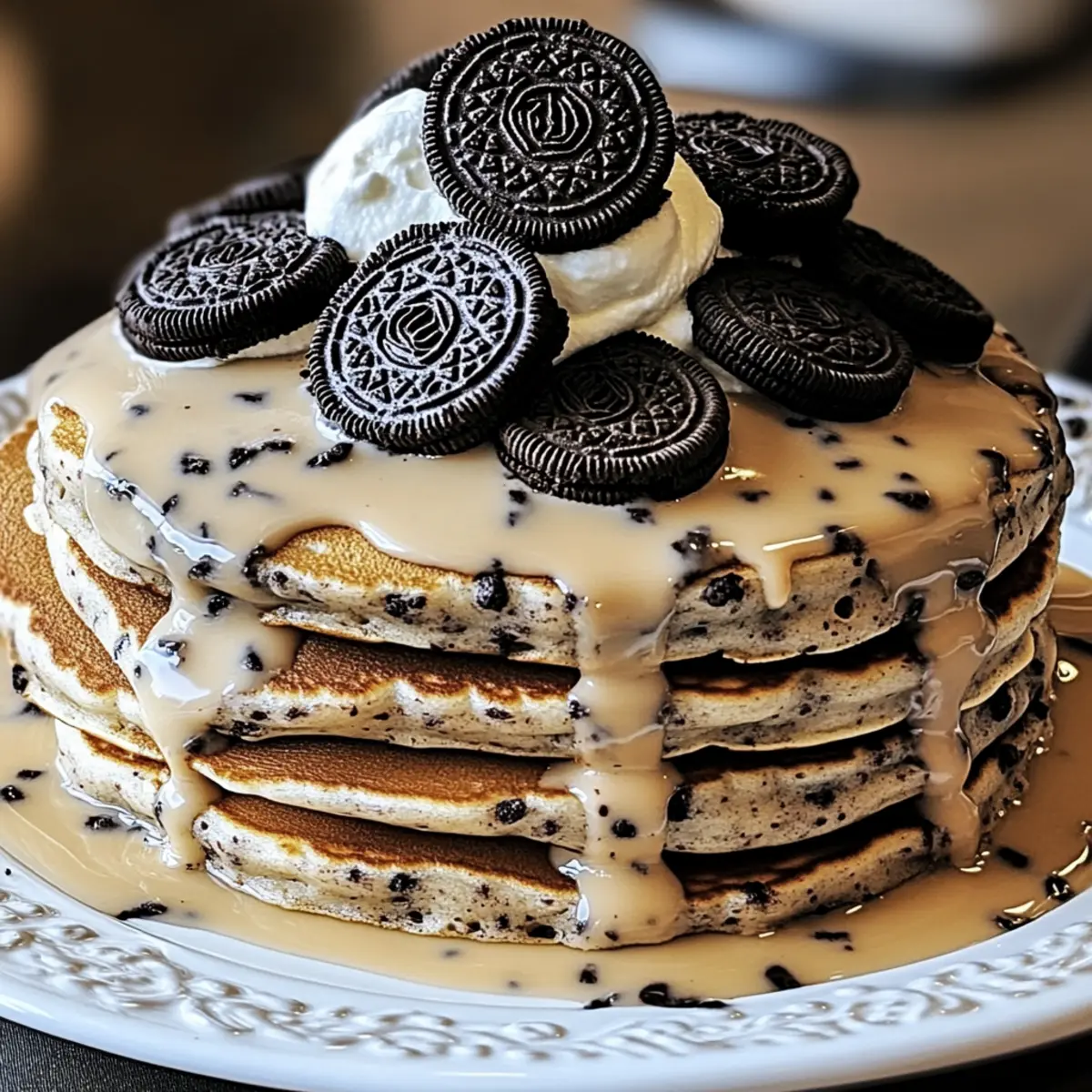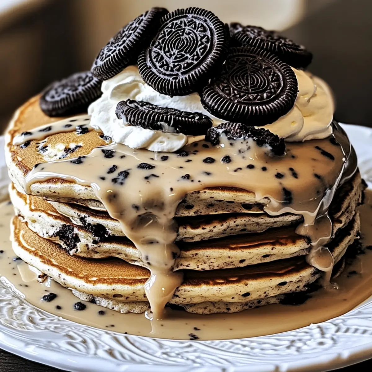 Jump to Recipe Print RecipeYou won’t believe how a few crushed cookies can transform the simplest breakfast into an indulgent affair! Say hello to Oreo Pancakes, where classic fluffy pancakes meet chocolatey cookie delight. This easy-to-make recipe not only satisfies sweet cravings but also whisks you away from the mundane mornings filled with fast food. With just a sprinkle of crushed Oreos mixed into the batter, you’re guaranteed a crowd-pleasing dish that’s as fun to serve as it is to eat. Plus, they can be easily customized with toppings of your choice—think whipped cream, fresh berries, or even a drizzle of chocolate syrup! Best of all, if you have dietary restrictions, don’t fret; this recipe adapts effortlessly for vegans too. Ready to level up your breakfast game? Let’s dive into these mouthwatering Oreo Pancakes! Why are Oreo Pancakes a Must-Try? Irresistible Flavor: The delightful combination of fluffy pancakes and rich Oreo chunks creates an unforgettable breakfast experience that will leave everyone craving more. Customizable Toppings: Whether you prefer whipped cream, fresh berries, or a drizzle of chocolate syrup, these pancakes are versatile enough to please all taste buds. Easy to Make: With just a few simple ingredients, you’ll whip up a delicious breakfast in no time—perfect for busy mornings or leisurely weekends. Diet-Friendly: For those with dietary restrictions, the recipe can easily adapt to vegan diets by using non-dairy milk and a flax egg substitute, ensuring no one misses out on the fun! Family Appeal: Kids and adults alike can indulge in these sweet treats, making them a fantastic family-friendly meal that transforms mundane mornings into something special. If you’re in the mood for more decadent ideas, don’t miss our delicious Oreo Cheesecake Decadent that takes dessert to new heights! Oreo Pancakes Ingredients • From the rich flavor to the delightful texture, these ingredients blend perfectly for your Oreo Pancakes adventure! For the Pancake Batter All-Purpose Flour – Provides the perfect base for fluffy, thick pancakes. Baking Powder – Ensures your pancakes are light and airy; always check the expiration date for best results. Granulated Sugar – Balances the flavor without overpowering the cookie chunks; adjust to taste. Milk – Adds creaminess; substitute almond or oat milk for a vegan option. Eggs – One large egg binds the ingredients together and adds moisture. Crumpled Oreos – Approximately four to six crushed Oreos incorporate that signature chocolate flavor and texture. Optional Toppings Whipped Cream – Adds a light, fluffy contrast to the sweet pancakes; homemade or store-bought works well. Chocolate Syrup – A delicious drizzle enhances the indulgent experience; go dark for a richer flavor. Fresh Berries – Berries like strawberries or blueberries bring a refreshing touch; balance out the sweetness nicely. Step‑by‑Step Instructions for Oreo Pancakes Step 1: Prepare the Batter In a large mixing bowl, combine 1 cup of all-purpose flour, 2 teaspoons of baking powder, 2 tablespoons of granulated sugar, and a pinch of salt. Mix these dry ingredients thoroughly, ensuring there are no lumps. This will form the base for your fluffy Oreo Pancakes, so make sure it’s well blended before moving on. Step 2: Add Wet Ingredients Next, whisk in 1 cup of whole milk and 1 large egg into the dry mixture until just combined. It’s important to stop mixing when the batter is still slightly lumpy, as overmixing can lead to dense pancakes. The batter should be smooth with visible flecks of flour, ready to be transformed into delicious pancakes. Step 3: Fold in Oreos Gently fold in 4 to 6 crushed Oreos into the pancake batter using a spatula. This step is crucial, as it maintains the texture of the Oreo pieces while blending the rich flavor into your batter. Aim for an even distribution of cookie chunks, ensuring every bite of your Oreo Pancakes is indulgently chocolatey. Step 4: Heat the Pan Preheat a non-stick skillet over medium heat, which should be around 350°F (175°C). Lightly grease the skillet with butter or cooking spray to prevent sticking, allowing for a golden-brown finish on your pancakes. Once the skillet is hot, it’s time to start cooking these fluffy treats. Step 5: Cook the Pancakes Pour ½ cup of the batter onto the heated skillet for each pancake. Cook until bubbles form on the surface, which should take about 2-3 minutes. Flip the pancake once the edges appear set and the bottom is golden brown. Cook for an additional 2-3 minutes until both sides are perfectly golden. Step 6: Serve and Enjoy Remove the Oreo Pancakes from the skillet and stack them onto plates. Serve immediately while warm, pairing them with your favorite toppings like whipped cream, a drizzle of chocolate syrup, or fresh berries. This quick and easy recipe creates a delightful breakfast that’s sure to impress family and friends! Expert Tips for Oreo Pancakes Avoid Overmixing: Mix the wet and dry ingredients just until combined to keep your Oreo Pancakes fluffy. Lumps are okay! Fresh Ingredients Matter: Ensure all ingredients, especially baking powder, are fresh to achieve the perfect rise and texture in your pancakes. Perfect Pancake Temperature: Preheat your skillet to medium heat before pouring batter, ensuring even cooking and preventing burnt edges. Customize Wisely: Feel free to experiment with different toppings like fresh fruit or flavored syrups, so every batch of Oreo Pancakes feels unique. Cool and Store: If making ahead, allow pancakes to cool completely before storing in an airtight container to maintain their softness. What to Serve with Oreo Pancakes There’s nothing quite like a warm stack of decadent pancakes to brighten your morning, but pairing them with the right sides elevates the entire experience! Fresh Berries: Juicy strawberries and blueberries add a burst of freshness, perfectly balancing the rich chocolate flav
