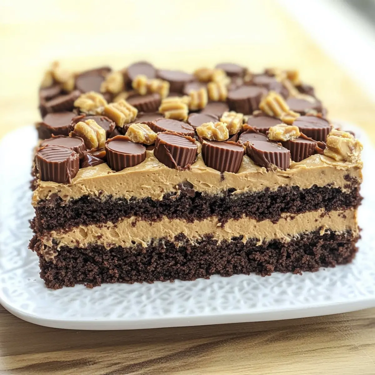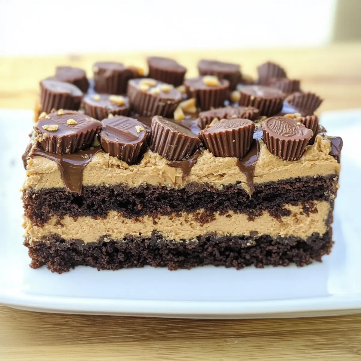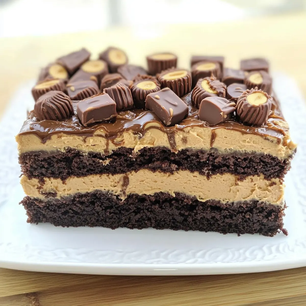 Jump to Recipe Print RecipeAs the rich aroma of chocolate wafts through my kitchen, I can’t help but smile at the magic that unfolds with every layer of this Peanut Butter Cup Brownie Torte. This isn’t just any dessert; it’s a celebration of flavors and textures that combines fudgy brownies, creamy peanut butter buttercream, and, of course, a generous sprinkle of Reese’s cups on top. What’s more, this indulgence is surprisingly easy to make! Perfect for impressing guests at gatherings or treating yourself after a long day, this torte offers the best of both worlds: it’s decadent yet achievable. So, are you ready to dive into a dessert that’s sure to become a staple in your home? Let’s get started! Why is This Torte So Irresistible? Decadent Layers: Every bite of this Peanut Butter Cup Brownie Torte promises rich, fudgy brownies layered with velvety peanut butter frosting, crowned with delightful Reese’s cups. Easy to Make: With just a few simple ingredients, this recipe is approachable even for novice bakers who want to impress. Crowd Pleaser: Whether for birthdays, potlucks, or any special occasion, this dessert will wow guests and spark joy at any gathering. Quick Assembly: You’ll find the assembly process straightforward, making it perfect for when you’re short on time but still want to indulge in something special. Pair it with a scoop of vanilla ice cream for that ultimate dessert experience! Peanut Butter Cup Brownie Torte Ingredients For the Brownie Base • Brownie Mix – Choose a quality box mix like Betty Crocker Hershey’s Original Supreme for best flavor. • Water – Hydrates the brownie mix; use the amount specified on the box for perfect consistency. • Vegetable Oil – Adds moisture for a fudgier texture; melted coconut oil works as a great substitute. • Egg – Binds the mixture together; make sure it’s at room temperature for easier mixing. For the Peanut Butter Buttercream • Butter (Softened) – Brings richness to the frosting; opt for vegan butter for a dairy-free version. • Peanut Butter – The star ingredient for flavor; creamy peanut butter spreads easily, or natural peanut butter for a healthier take. • Powdered Sugar – Sweetens the buttercream; adjust the amount based on your sweetness preference. For the Ganache • Semi-Sweet Chocolate Chips – Essential for the ganache; dark chocolate chips add an even richer flavor. • Heavy Cream – Gives a smooth consistency to the ganache; full-fat coconut cream is a delicious dairy-free option. For Decoration • Reese’s Cups – Key for both decoration and flavor; feel free to substitute with your favorite chocolate-covered peanut butter candies. Step‑by‑Step Instructions for Peanut Butter Cup Brownie Torte Step 1: Prepare Brownie Layer Start by preheating your oven to 350°F (175°C). In a large mixing bowl, combine the brownie mix, water, vegetable oil, and egg according to the package instructions. Once mixed, pour the batter into a greased 9×13 pan, smoothing it out evenly. Bake for 22-25 minutes until a toothpick inserted in the center comes out clean. Remove from the oven and let it cool completely. Step 2: Make Buttercream While the brownies cool, prepare the peanut butter buttercream. In a mixing bowl, use an electric mixer to beat the softened butter and creamy peanut butter together until fluffy, about 3-5 minutes. Gradually add the powdered sugar, mixing until fully incorporated and creamy. This luscious frosting will be the perfect complement to your Peanut Butter Cup Brownie Torte. Step 3: Prepare Ganache Next, let’s whip up the ganache! In a saucepan over low heat, melt the semi-sweet chocolate chips along with the heavy cream, stirring continuously until smooth and glossy. This exquisite ganache will add a rich, velvety finish to your dessert. Once fully melted, set aside to cool slightly while you assemble the torte. Step 4: Assemble Torte After your brownies have cooled, carefully slice them horizontally into three equal layers. On the bottom layer, spread a generous amount of the peanut butter frosting. Place whole Reese’s cups evenly over the frosting, and then drizzle some of the ganache over the top. Layer the second brownie piece on top and repeat the frosting, Reese’s, and ganache application. Step 5: Final Layer and Decoration Add the final brownie layer atop the second. Cover the entire torte with the remaining peanut butter frosting, ensuring every inch is smooth and inviting. Drizzle the remaining ganache generously over the top, and finish with a scattering of chopped Reese’s cups for an eye-catching flair. Step 6: Chill Before Serving To allow all those delicious flavors to meld together perfectly, refrigerate your Peanut Butter Cup Brownie Torte for at least 1 hour. This will firm up the layers, making it easier to slice. Once chilled, it’s ready to be enjoyed—just slice into squares and serve! Make Ahead Options These Peanut Butter Cup Brownie Torte layers are perfect for meal prep enthusiasts! You can prepare the brownie base up to 24 hours in advance—just bake, cool completely, and then store it tightly wrapped in the refrigerator to maintain its fudgy texture. Additionally, the peanut butter buttercream can be made ahead and refrigerated for up to 3 days; just give it a quick whip before you spread it on the torte. When you’re ready to assemble, slice the cooled brownies, layer with frosting and Reese’s cups, drizzle with ganache, and chill for at least 1 hour before serving for a spectacular dessert that’s just as delicious as if made fresh! How to Store and Freeze Peanut Butter Cup Brownie Torte Fridge: Store the torte in an airtight container in the refrigerator for up to 5 days to keep it fresh and maintain its fudgy texture. Freezer: For longer storage, wrap the torte tightly in plastic wrap and then in aluminum foil before placing it in the freezer. It can last for up to 3 months. Thawing: To enjoy, simply trans