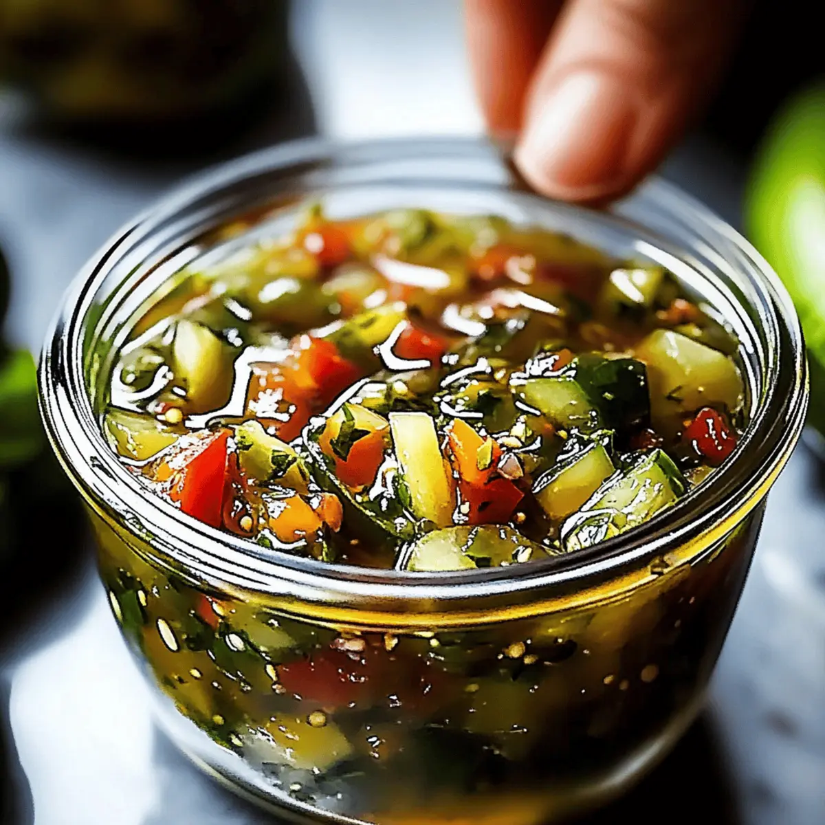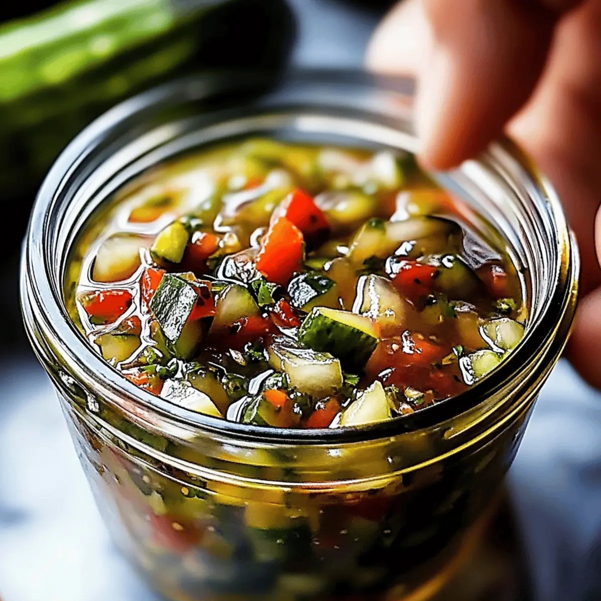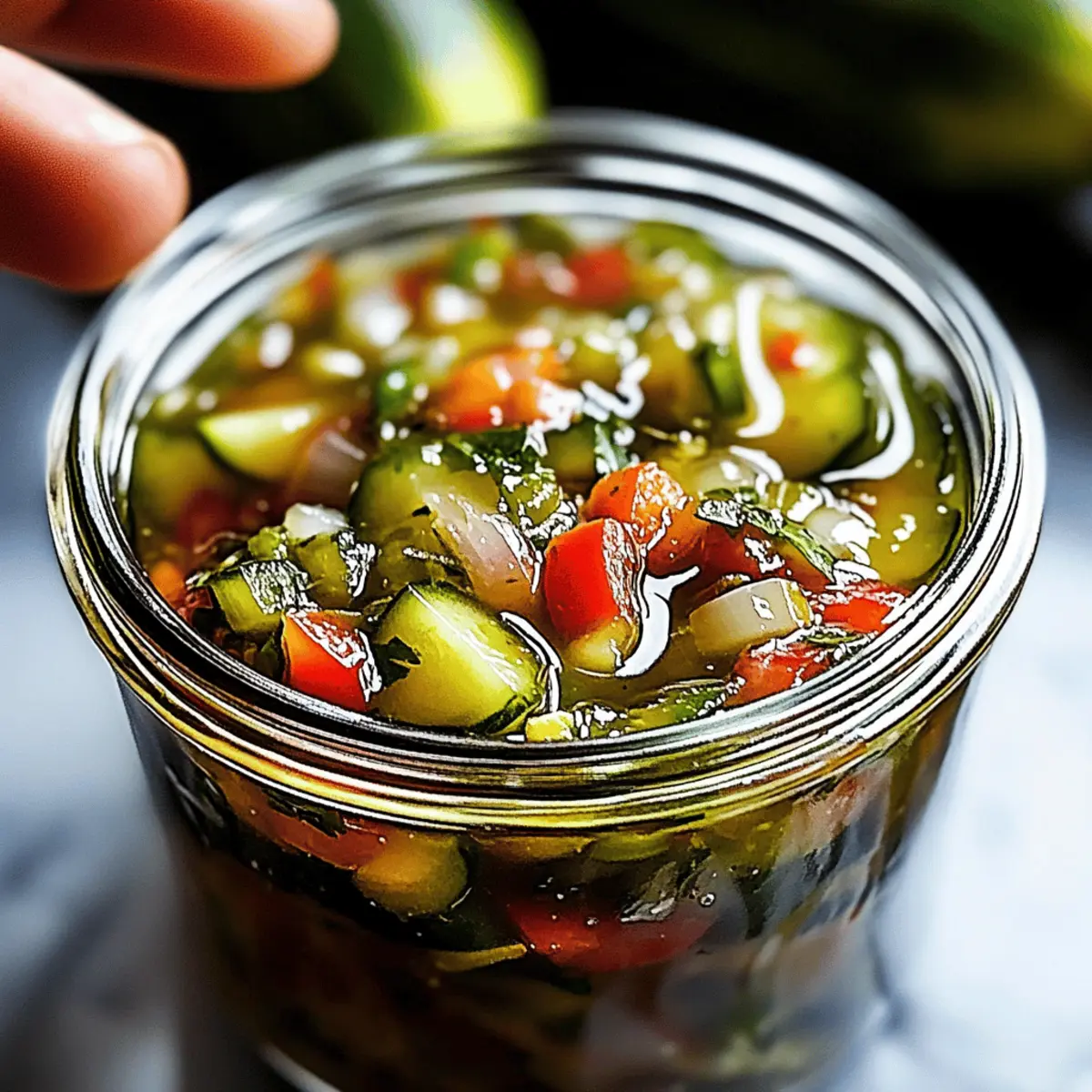 Jump to Recipe Print RecipeThe scent of simmering vinegar and fresh vegetables wafts through my kitchen, instantly transporting me to my grandmother’s garden where she would whip up her famous Sweet and Spicy Pickle Relish. This vibrant condiment is not just a flavor-packed addition to your sandwiches and hot dogs; it’s a delightful blend of sweetness and spice that you can easily personalize to match your taste buds. Best of all, this homemade pickle relish is not only a quick recipe to whip up, but it’s also a crowd-pleaser that opens up endless pairing possibilities. You can relish in the satisfaction of using fresh ingredients that bypass the preservatives often found in store-bought versions. Ready to elevate your meals with this irresistible twist? Let’s dive into making your very own batch! Why is Pickle Relish So Popular? Irresistible Flavor: This pickle relish blends sweet and spicy notes, creating a taste that enhances your favorite dishes. Customization at Its Finest: Tailor your relish by adjusting heat levels or sweetness, ensuring it suits your palate perfectly. Quick and Easy: With minimal prep and cooking time, even novice cooks can create a gourmet condiment in a snap. Perfect for Canning: Enjoy the satisfaction of preserving seasonal produce for later enjoyment—this relish stores beautifully! Versatile Pairing: Use it as a topping on burgers, hot dogs, or even in salads. Its punchy flavor works wonders in many recipes, making it a must-have in your kitchen. Healthier Choice: This homemade version is free from preservatives, utilizing fresh vegetables for a guilt-free condiment that still delivers on taste. Pickle Relish Ingredients For the Vegetables • Cucumbers – Fresh, firm cucumbers give the best crunch; pickling varieties are ideal. • Red Bell Pepper – Adds sweetness; feel free to use orange or yellow for a unique twist. • Onion – Sweet onions provide a milder flavor, while red onions offer a sharper bite. For the Brine • Salt – Essential for extracting moisture; opt for kosher or sea salt to enhance flavor. • Sugar – Balances the acidity of the vinegars; honey or agave nectar can work as substitutes. • White Vinegar – Provides sharpness and helps with preservation; apple cider vinegar adds a milder taste. • Apple Cider Vinegar – Contributes a slight sweetness and depth to the relish. For the Flavor • Mustard Seeds – Infuses a tangy spice; celery seeds can be used as a substitute for a different profile. • Celery Seeds – Adds an aromatic touch; can be omitted if not available. • Ground Turmeric – For that vibrant color and health benefits you’ll love. • Chili Flakes (optional) – Adjust to taste for your desired spice level; omit for a milder relish. Embrace the adventure of crafting your own pickle relish, and enjoy making it your very own! Step‑by‑Step Instructions for Homemade Sweet and Spicy Pickle Relish Step 1: Prepare the Vegetables Start by washing and finely chopping your fresh, firm cucumbers, red bell pepper, and onion. In a large mixing bowl, combine the vegetables with kosher or sea salt. Let this mixture sit for about 1 hour, allowing the salt to extract moisture and enhance the flavors. You’ll notice the vegetables releasing liquid, which is a good sign that they’re brining nicely. Step 2: Drain Excess Liquid After the hour has passed, it’s time to drain the mixture. Use a fine mesh strainer to let the brined vegetables sit for a few minutes, pressing gently with the back of a spoon to remove any excess liquid. This step is crucial to avoid a watery pickle relish. The mixture should now feel slightly firmer, perfect for the next steps of your pickle relish. Step 3: Make the Brine In a non-reactive pot, combine white vinegar, apple cider vinegar, sugar, mustard seeds, celery seeds, ground turmeric, and optional chili flakes. Heat the mixture over medium heat, stirring gently until the sugar has fully dissolved. Once the mixture reaches a gentle boil, remove it from the heat. The tangy aroma should fill your kitchen, setting the stage for your homemade pickle relish. Step 4: Combine Everything Stir the drained vegetable mixture into the brine, returning the pot to medium heat. Bring the combined mixture back to a boil, allowing it to simmer for about 10 minutes. Stir occasionally during simmering, ensuring the vegetables are beautifully coated with the brine. As it simmers, you’ll appreciate the vibrant colors and enticing scents of your sweet and spicy pickle relish. Step 5: Jar the Relish Once simmered, carefully ladle the hot pickle relish into sterilized jars, leaving about ½ inch of headspace at the top. Wipe the rims of each jar with a clean towel to ensure a proper seal. Seal the jars tightly with sterilized lids. You’ll see the bright, colorful relish inside, ready to enhance your meals. Step 6: Process for Preservation To ensure long-term storage, process the sealed jars in a boiling water bath for 10 minutes. Ensure the water covers the jars by at least an inch. This step helps to create a vacuum seal, preserving your homemade pickle relish for months. As the jars boil, you’ll feel accomplished knowing you’re preserving summer’s bounty in a jar. Step 7: Cool and Store After processing, carefully remove the jars and let them cool on a clean kitchen towel or rack for at least 24 hours. Once cooled, check that the lids have sealed properly by pressing the center; it shouldn’t pop back. Store the sealed jars in a cool, dark place for future enjoyment, or refrigerate any jars you haven’t sealed for immediate use. Enjoy the flavorful rewards of your hard work with this delightful pickle relish! What to Serve with Sweet and Spicy Pickle Relish? Bright flavors and delightful crunch make this condiment a star in your kitchen. Grilled Hot Dogs: The tangy sweetness enhances the smoky flavor, transforming ordinary hot dogs into something extraordinary. Classic Cheeseburgers: A