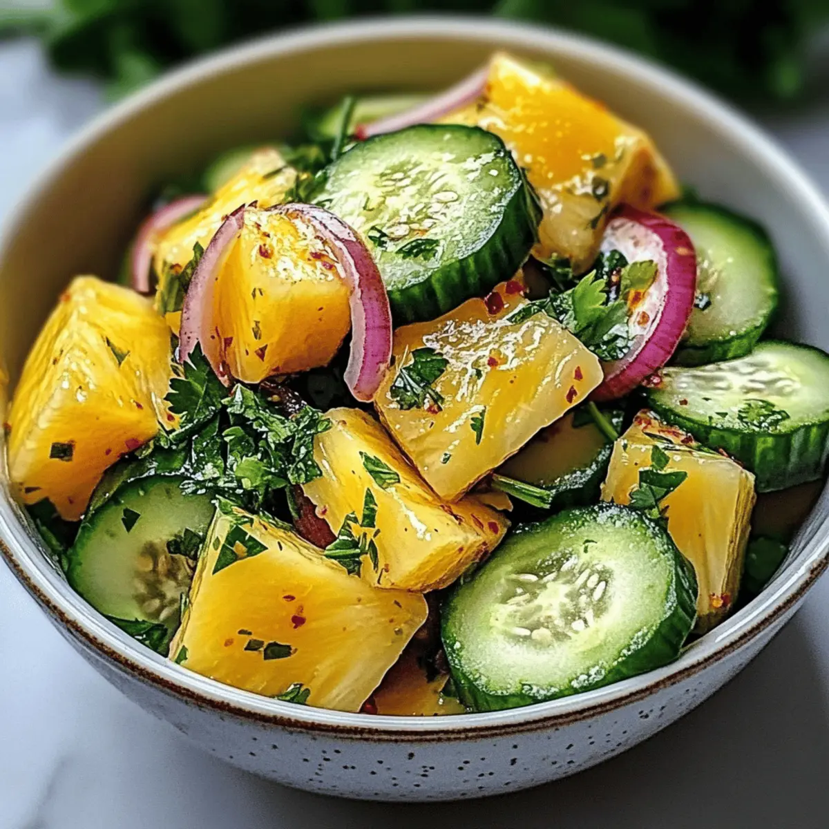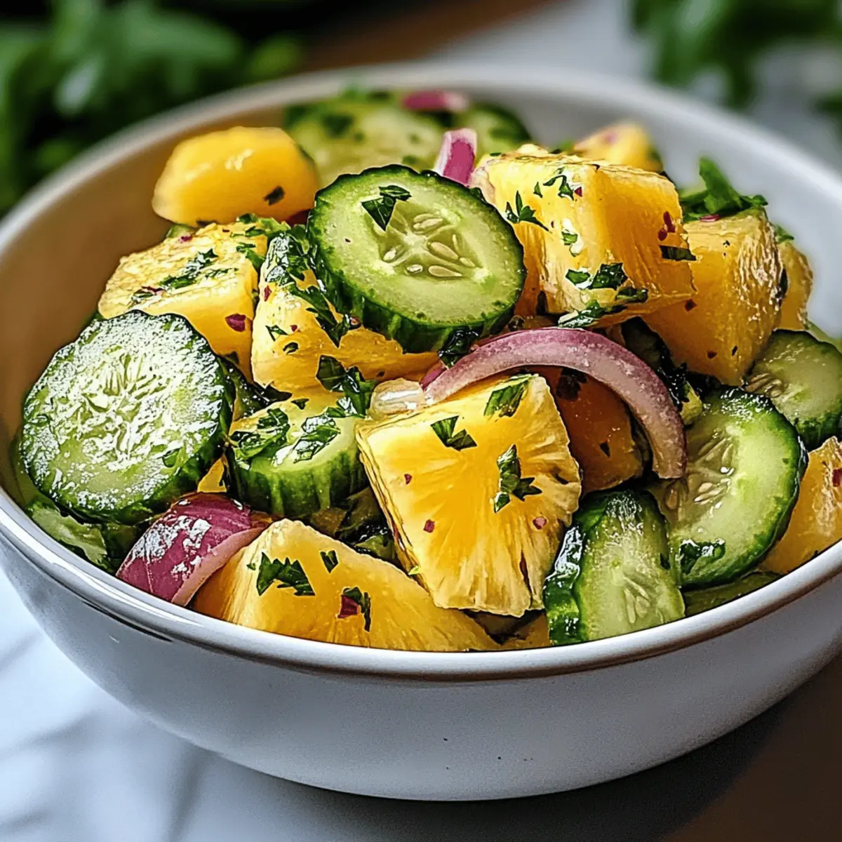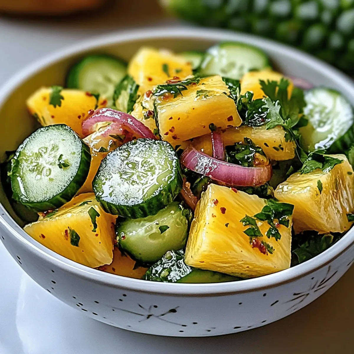 Jump to Recipe Print RecipeSinking my teeth into a pineapple wedge always transports me to sandy beaches and sun-soaked summers. That’s the magic behind this Pineapple Cucumber Salad with Zesty Chili-Lime Dressing—my latest culinary adventure that marries the bright sweetness of fresh pineapple with the cool crunch of cucumber and a dash of spice. Not only is this salad refreshing and hydrating, but it’s also a low-calorie way to celebrate wholesome ingredients. Whether you’re seeking a light meal on a hot day or a quick post-workout snack, this salad fits the bill perfectly. Get ready to savor a blend of tropical flavors that will leave your taste buds dancing—how do you like to brighten up your meals? Why is this salad a must-try? Vibrant flavors: The sweet, juicy pineapple paired with the cool crunch of cucumber creates a harmonious balance that’s impossible to resist. Easy preparation: With just a few simple steps, you can whip up this salad in no time—perfect for busy days! Low-calorie delight: At only 85 kcal per serving, it’s a guilt-free way to enjoy wholesome nutrition that keeps you feeling light. Perfect for any occasion: Whether you’re entertaining guests or just treating yourself, this salad is a crowd-pleaser that pairs wonderfully with options like Summer Berry Salad or Pasta Salad Cups. Versatile ingredients: Customize it by adding diced avocado or mango to cater to your taste—there are endless possibilities! Fresh and hydrating: It’s the ideal summer dish that quenches your thirst and satisfies your cravings. Pineapple Cucumber Salad Ingredients • Refreshing components for a tropical twist! For the Salad Fresh Pineapple – Natural sweetness and hydration; use ripe pineapple for optimal flavor. Cucumber – Provides a cool, crisp texture; English cucumber is preferable for less seediness. Red Onion – Adds a subtle bite; shallots can be a milder substitute. For the Dressing Chili Powder – Introduces spice and warmth; adjust the amount to suit your heat preference. Lime Juice – Offers acidity that enhances flavor balance; freshly squeezed is best for optimal taste. Honey or Maple Syrup – Adds sweetness to balance the tartness of lime; maple syrup is great for a vegan option. Salt – Enhances overall flavor; use to taste. Optional Garnishes Cilantro or Mint – Adds herbs for fragrance and an extra layer of flavor. Now you have all the ingredients ready to create your delicious Pineapple Cucumber Salad! Enjoy the wholesome, tropical flavors that will brighten your day! Step‑by‑Step Instructions for Pineapple Cucumber Salad Step 1: Prepare the Salad Ingredients Begin by peeling and dicing one ripe pineapple into bite-sized pieces, ensuring to remove the core. Next, take an English cucumber, wash it thoroughly, and slice it thinly for that refreshing crunch. To add a touch of sharpness, finely slice half a small red onion. Combine all these vibrant ingredients in a large mixing bowl, creating a colorful base for your Pineapple Cucumber Salad. Step 2: Make the Zesty Dressing In a small bowl, whisk together one tablespoon of chili powder, the juice of one freshly squeezed lime, one tablespoon of honey or maple syrup, and a pinch of salt. Aim for a smooth and well-combined mixture, as this zesty dressing will elevate the flavors of your salad. Set the dressing aside, allowing the ingredients to meld while you move on to the next step. Step 3: Combine Salad and Dressing Pour the prepared chili-lime dressing over the pineapple, cucumber, and red onion mixture in your large bowl. Gently toss all the ingredients together using a spatula or your hands, ensuring that the vibrant flavors of the dressing coat every piece of fruit and vegetable evenly. You should see the colors brighten as they mix, creating an inviting appearance for your Pineapple Cucumber Salad. Step 4: Allow Flavors to Meld Once combined, let your salad rest at room temperature for about 10–15 minutes. This wait is essential, as it allows the flavors to meld beautifully, enhancing the taste of the Pineapple Cucumber Salad. You’ll notice the vegetables softening ever so slightly while absorbing the zesty dressing, making every bite a burst of freshness. Step 5: Garnish and Serve Just before serving, add a handful of finely chopped fresh cilantro or mint on top for a fragrant finish. This optional garnish not only adds a pop of color but also an extra layer of flavor to your refreshing Pineapple Cucumber Salad. Serve it in individual bowls or family-style, and watch as everyone reaches for this delightful dish! Make Ahead Options These Pineapple Cucumber Salad preparations are perfect for busy home cooks! You can chop the pineapple and cucumber, along with slicing the red onion, up to 24 hours ahead to save time. Store these ingredients separately in airtight containers in the refrigerator to maintain their crispness and prevent browning. The zesty chili-lime dressing can also be made in advance and kept for up to 3 days; just give it a good shake before using. When you’re ready to enjoy your salad, simply combine the prepped ingredients, toss them with the dressing, and let it rest for 10-15 minutes to allow the flavors to meld. Your Pineapple Cucumber Salad will be just as delicious, allowing you to savor those refreshing tropical flavors with minimal effort! Pineapple Cucumber Salad Variations Feel free to unleash your creativity and personalize this salad with these exciting twists! Mango Swap: Replace pineapple with diced mango for an all-new tropical sweetness. The juicy texture and flavor will elevate your salad. Creamy Avocado: Add diced avocado for a rich, creamy contrast that complements the refreshing ingredients beautifully. This makes every bite feel indulgent. Bell Pepper Crunch: Mix in colorful, diced bell peppers for an extra crunch and a pop of color—perfect for a festive touch. Zesty Lemon: Substitute lime juice with fresh lemon juice for a bright, citrusy 