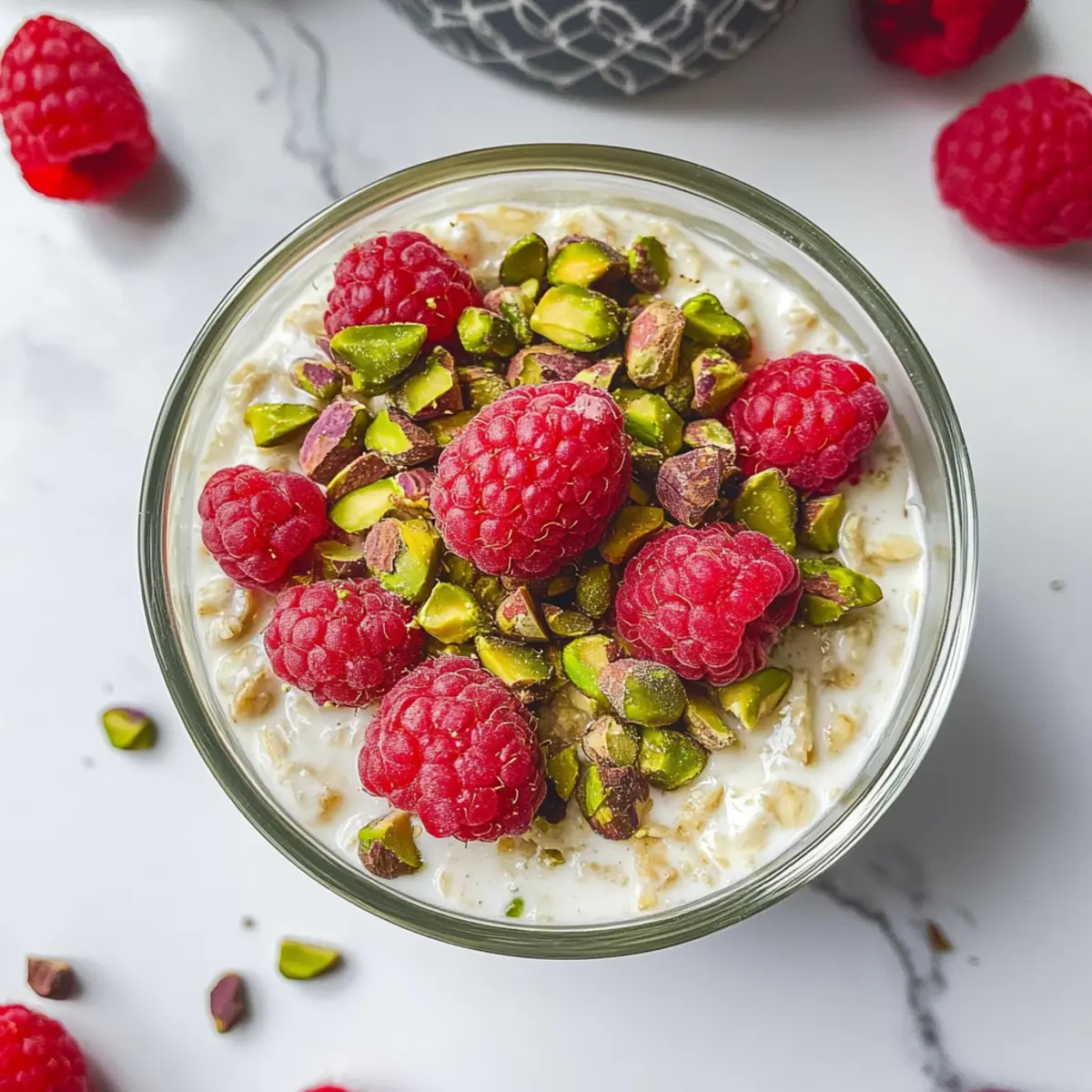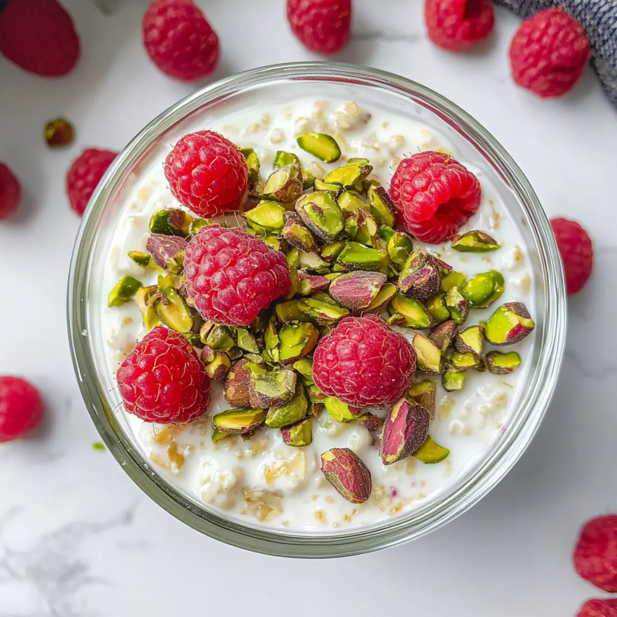 These Creamy Pistachio Overnight Oats are a fantastic option for meal prep enthusiasts! You can prepare the base mixture of oats, non-dairy milk, pistachio butter, and chia seeds up to 24 hours in advance and refrigerate it, ensuring it remains fresh. To do this, simply whisk together all the base ingredients (1 cup non-dairy milk, 2 tablespoons pistachio butter, 1 tablespoon maple syrup, and 1 teaspoon vanilla) and store them in a sealed jar. The next morning, just give it a gentle stir, and top with delicious non-dairy yogurt, fresh raspberries, and chopped pistachios—the oats will be just as creamy and satisfying! This method saves precious time and guarantees a nutritious breakfast awaits you each morning.