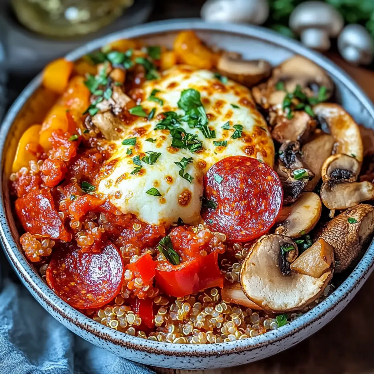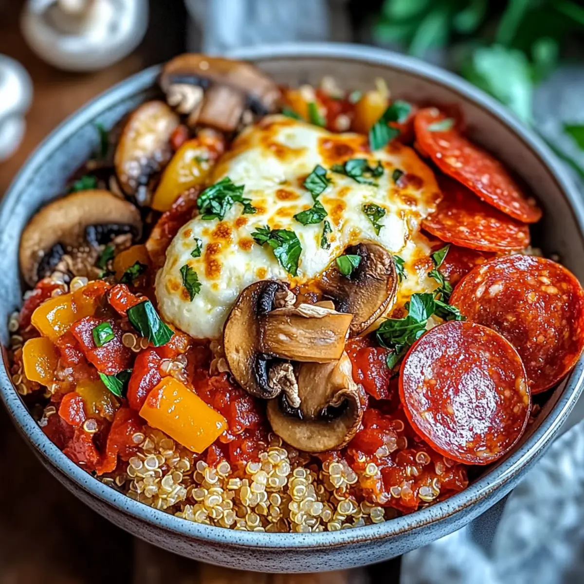 Jump to Recipe Print RecipeAs I stood in front of the fridge, trying to piece together a quick dinner, the scramble for something delicious yet nutritious had me in a mini crisis. That’s when the idea of a Pizza Protein Bowl hit me—a clever and satisfying way to enjoy the classic flavors of pizza without the guilt! This scrumptious dish is packed with protein from quinoa and offers the chance to customize to your heart’s content, making it perfect for busy weeknights or whenever cravings strike. Who says you can’t eat healthy and enjoy your favorite comfort food at the same time? Best of all, it’s an effortless recipe that can easily be tailored to suit gluten-free or low-carb diets. Curious about how to transform a simple bowl into a feast for the senses? Let’s dive into this delightful adventure! Why is the Pizza Protein Bowl a must-make? Flavor-packed goodness: The combination of quinoa, savory chicken, and melted cheese delivers a comforting taste that mirrors your favorite pizza! Customizable options: With suggestions for substitutions like turkey pepperoni or cauliflower rice, it’s easy to cater to different dietary preferences like low-carb or gluten-free. Quick to prepare: Ready in less than 30 minutes, making it a perfect weeknight meal. Healthy indulgence: Enjoy all the indulgence without the guilt, packed with protein and vibrant veggies. Elevate your dining game with a slice of nostalgia; if you love fruit in your meals, don’t forget to check out this amazing Fruit Pizza Deliciously! Pizza Protein Bowl Ingredients • Get ready to create a flavorful dish! For the Base Quinoa – A protein-packed base offering a nutty flavor that complements the dish. Substitute with cauliflower rice for a low-carb option. Canned Diced Tomatoes – Adds moisture and richness; fresh or spicy diced tomatoes can be great alternatives. For the Veggies Green Bell Pepper – Provides a crunchy texture and vibrant color; swap for any bell pepper or zucchini if desired. Mushrooms – Contributes an earthy taste; can be replaced with spinach, kale, or omitted completely. For the Protein Pepperoni – A classic pizza topping; turkey pepperoni or even diced cooked chicken are healthier alternatives. For the Toppings Shredded Mozzarella Cheese – Creates that gooey pizza feel; opt for low-fat cheese if you prefer a lighter option. For Sautéing Olive Oil – Enhances flavor during cooking; feel free to use any other cooking oil for variety. Garlic – An aromatic that adds warmth; diced onions can be swapped in for a change. Seasoning Essentials Salt, Pepper, Oregano, Basil – These ingredients boost flavor; adjust based on your taste preferences for the perfect Pizza Protein Bowl! Step‑by‑Step Instructions for Pizza Protein Bowl Step 1: Sauté the Aromatics Begin by heating 2 tablespoons of olive oil in a large skillet over medium heat. Once the oil is shimmering, add 2 minced garlic cloves, cooking until fragrant, about 1 minute. The aroma should fill your kitchen, providing a savory base for the Pizza Protein Bowl’s flavorful ingredients. Step 2: Add the Veggies Next, toss in 1 diced green bell pepper and 1 cup of sliced mushrooms. Sauté the vegetables for 4-5 minutes until they soften and become vibrant. During this time, sprinkle in salt, pepper, 1 teaspoon of oregano, and 1 teaspoon of basil to infuse the Pizza Protein Bowl with mouthwatering flavors. Step 3: Combine Quinoa and Tomatoes Now, stir in 2 cups of cooked quinoa and a can of drained diced tomatoes. Mix everything thoroughly, allowing it to heat through for about 2 minutes. You want the quinoa to be warm and coated with the aromatic veggies and tomatoes, creating a colorful and hearty mixture for your Pizza Protein Bowl. Step 4: Layer the Cheese Once heated, transfer the quinoa mixture into a large bowl. Evenly sprinkle 1 cup of shredded mozzarella cheese over the top. This creates a gooey, cheesy layer that will melt beautifully, adding that essential pizza feel to your Pizza Protein Bowl. Step 5: Broil for Perfect Melting Preheat your broiler to high. Carefully arrange your pepperoni slices, about 1 cup, on top of the cheese layer. Place the bowl under the broiler for about 3-5 minutes, keeping a close eye on it. The cheese should be bubbly and lightly golden, but be cautious to prevent burning. Step 6: Garnish and Serve Remove the Pizza Protein Bowl from the oven when the cheese is perfectly melted. For a fresh touch, garnish with chopped parsley or basil before serving warm. This final step elevates the dish, providing an inviting presentation that’s sure to delight your family or guests! How to Store and Freeze Pizza Protein Bowl Fridge: Store leftovers in an airtight container for up to 3 days. Reheat in the microwave or on the stovetop with a splash of water to keep the dish moist. Freezer: For longer storage, freeze individual portions in airtight containers for up to 2 months. Thaw overnight in the fridge before reheating. Reheating: Reheat in the microwave or on the stovetop, adding a little water if necessary to prevent drying out. Enjoy your delicious Pizza Protein Bowl warm! Room Temperature: It’s best to avoid leaving the Pizza Protein Bowl at room temperature for more than 2 hours to ensure food safety. Make Ahead Options These Pizza Protein Bowls are a game changer for meal prep enthusiasts! You can prepare the quinoa, sauté the veggies, and mix in the canned diced tomatoes up to 24 hours in advance, storing everything in an airtight container in the refrigerator. When you’re ready to enjoy your meal, simply reheat the mixture in a skillet over medium heat until warm. For the final touch, add the shredded mozzarella cheese and pepperoni, then broil until the cheese is bubbly and golden—this last step takes just 3-5 minutes! By making components ahead of time, you’ll enjoy a delicious, hearty dinner with minimal effort on busy weeknights. Pizza Protein Bowl Variations & Substitutions Feel 