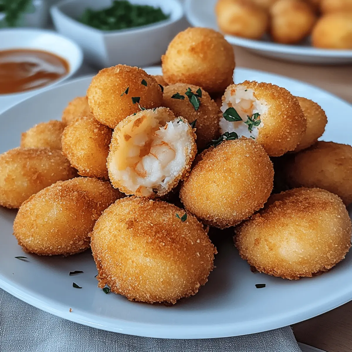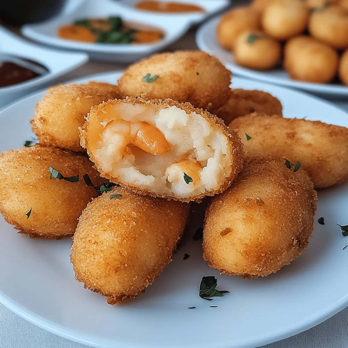 Jump to Recipe Print RecipeAs I pulled the golden-brown croquettes from the skillet, the aroma of garlic and fresh herbs filled my kitchen, transporting me straight to the coastal streets of Portugal. These Portuguese Shrimp Croquettes, with their crispy breadcrumbs encasing a rich and creamy filling, are simply irresistible. Not only are they a delightful way to impress guests with minimal effort, but they’re also a fantastic way to use up leftover mashed potatoes. Each bite offers a satisfying crunch followed by an explosion of savory shrimp flavors that are delightful as starters or casual snacks. Ready to discover how to whip up these delectable bites for your next gathering? Why Are These Croquettes So Irresistible? Unforgettable flavor: A perfect blend of shrimp, garlic, and fresh herbs creates an explosion of taste that’ll have everyone reaching for more. Versatile delights: These croquettes are not just appetizers; they can easily transition into a main dish when paired with a salad or dipping sauce, just like my favorite Garlic Butter Shrimp. Easy to make: With straightforward steps, even novice cooks can whip these up without stress. Perfect for gatherings: Their crowd-pleasing crunch and savory center make them an instant hit at parties or family dinners. Sustainable cooking: Not only are these croquettes delicious, but they also help reduce food waste by using leftover mashed potatoes, giving them an eco-friendly twist. Get ready to impress with these tasty bites that capture the essence of Portuguese cuisine! Portuguese Shrimp Croquettes Ingredients For the Filling Shrimp – Fresh or cooked shrimp are both great choices, providing a delicious source of flavor and protein. Mashed Potatoes – Leftover mashed potatoes work perfectly to create a creamy texture that binds the filling together. Garlic – Enhances the aromatic profile; adjust the amount based on your love for garlic. Herbs (e.g., parsley, cilantro) – Fresh herbs are recommended to elevate the flavor and freshness of the croquettes. Spices (e.g., paprika, black pepper) – Customize the seasoning to suit your taste; a pinch of paprika adds a lovely hue and flavor kick. For the Coating Breadcrumbs – Opt for panko breadcrumbs for an extra crunchy coating; gluten-free options are available too. Egg – This acts as a binder for the croquettes; you can also use a flax egg for a vegan substitute. These ingredients come together beautifully to create delightful Portuguese Shrimp Croquettes that are sure to impress your family and friends! Step‑by‑Step Instructions for Portuguese Shrimp Croquettes Step 1: Prepare the Filling In a skillet over medium heat, sauté 2-3 minced cloves of garlic in a tablespoon of olive oil until fragrant, about 1-2 minutes. Add in 1 pound of finely chopped shrimp, your choice of fresh herbs like parsley or cilantro, and season with paprika, black pepper, and salt. Stir in 1 cup of mashed potatoes until everything is well combined and heated through, about 3-4 minutes. Let the filling cool for easier handling. Step 2: Form the Croquettes Once your filling has cooled for about 10-15 minutes, use your hands to shape small portions into round balls or oval patties, approximately the size of a golf ball. Place the shaped croquettes on a baking sheet lined with parchment paper to keep them from sticking. This step will ensure they maintain their shape while frying. Step 3: Coat in Egg and Breadcrumbs Prepare a bowl with one beaten egg for the coating. Dip each croquette into the egg until fully coated, allowing any excess to drip off. Then, roll each croquette in panko breadcrumbs, making sure it’s evenly covered. The panko will give your Portuguese Shrimp Croquettes an extra crunchy texture when fried. Step 4: Fry the Croquettes In a deep skillet, heat about 1 inch of vegetable oil over medium-high heat until it’s shimmering, around 350°F. Carefully add the croquettes in batches, making sure not to overcrowd the pan. Fry for 3-4 minutes on each side, or until they are golden brown and crispy. Use a slotted spoon to remove them, draining the excess oil on paper towels. Step 5: Drain and Serve After frying, let the Portuguese Shrimp Croquettes sit on paper towels for a minute to absorb any extra oil. Serve them warm with your favorite dipping sauce, like aioli or tartar sauce. These crispy bites are perfect for appetizers or casual snacking, bringing a taste of Portugal right to your kitchen! Make Ahead Options These Portuguese Shrimp Croquettes are perfect for meal prep enthusiasts! You can prepare the filling—combining sautéed garlic, shrimp, herbs, spices, and mashed potatoes—up to 24 hours in advance. Simply refrigerate your filling in an airtight container until you’re ready to continue. When ready to cook, shape the filling into croquettes and coat them in breadcrumbs as instructed. For those who prefer even easier options, you can fully assemble the croquettes and freeze them for up to 3 months; just fry them from frozen, allowing an extra minute or two for cooking. This way, you can enjoy delicious appetizers crafted in advance, saving time and hassle on busy weeknights! Expert Tips for Portuguese Shrimp Croquettes Oil Temperature: Keep the oil hot, around 350°F, to ensure a crispy croquette. If the oil is too cool, the croquettes will absorb more oil and become soggy. Don’t Overcrowd: Fry in batches without crowding the pan. Overcrowding lowers the oil temperature, leading to uneven cooking and less crispy croquettes. Cool Filling: Let the filling cool before shaping the croquettes. This makes it easier to handle and form them without falling apart. Breadcrumb Coating: Use panko breadcrumbs for extra crunch. This texture elevates your Portuguese Shrimp Croquettes and keeps them crispy longer. Spice to Taste: Customize your shrimp filling with spices according to preference. A little cayenne or chili powder can kick up the heat! What to Serve with Portuguese Shrim