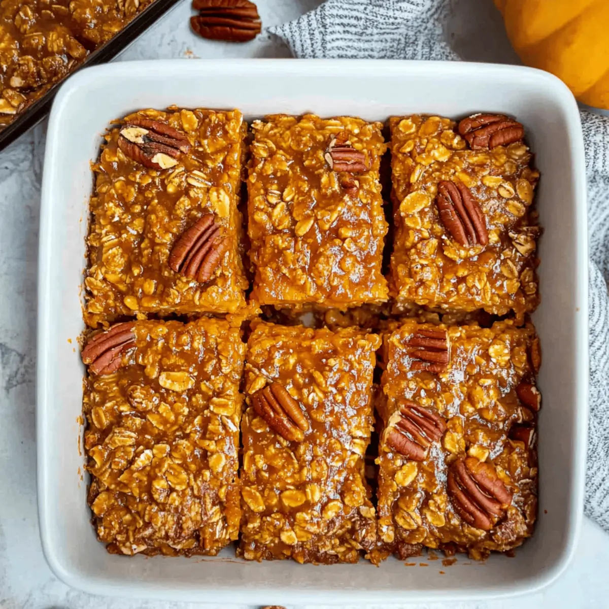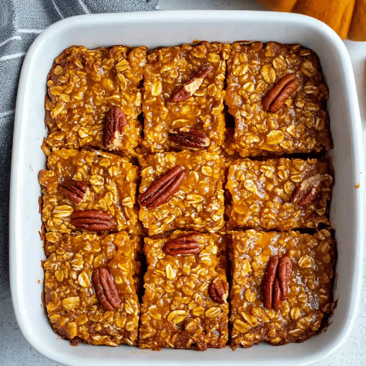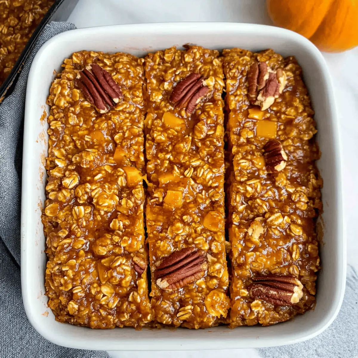 Jump to Recipe Print RecipeAs I was savoring my first bite of this delightful creation, I felt an undeniable wave of cozy warmth wash over me. The Healthy Pumpkin Baked Oatmeal is more than just a breakfast; it’s a snapshot of fall in every bite, perfectly crafted to give you that homestyle comfort you crave. This dish features wholesome rolled oats, naturally sweetened with maple syrup, and vibrant pumpkin puree, making it a fantastic meal prep option that’s both high-fiber and low-sugar. Whether you enjoy it warm out of the oven or chilled for a quick grab-and-go breakfast, this oatmeal will keep you satisfied all morning long. Plus, with both gluten-free and dairy-free adaptations available, everyone can join in on this delicious fall favorite. Curious to know the secret to achieving that perfect fluffy texture? Let’s dive into the recipe! Why Is This Pumpkin Baked Oatmeal Special? Comforting Flavor: The blend of pumpkin and warm spices creates an irresistible warming sensation, capturing the essence of fall. Healthy Twist: Packed with fiber and naturally sweetened, it’s a guilt-free breakfast that fills you up without extra sugar. Easy to Customize: With options for gluten-free and vegan adaptations, everyone can enjoy this delightful dish regardless of dietary needs. Meal Prepping Made Simple: Prepare a batch in advance to ensure delicious, hassle-free mornings. It’s easy to store and reheat! Versatility in Serving: Enjoy it as a cozy warm breakfast or a quick snack. Try vibrant additions like nuts or chocolate chips for a fun twist. You might also love serving it with a dollop of Greek yogurt or alongside some Baked Smashed Potatoes for a wholesome brunch spread. Pumpkin Baked Oatmeal Ingredients For the Base Rolled Oats – Provides structure and fiber for a hearty base; use certified gluten-free oats for a gluten-free version. Pumpkin Puree – Adds moisture, flavor, and vibrant color; canned or homemade works beautifully. Maple Syrup – Acts as a natural sweetener; honey or agave syrup can be used for variations. Milk – Introduces moisture; choose unsweetened almond milk for a dairy-free option. Egg – Binds the ingredients together; replace with a flax egg (1 tbsp flaxseed meal + 2.5 tbsp water) for vegan adaptations. Baking Powder – Acts as a leavening agent for extra fluffiness. Salt – Enhances overall flavor. Pumpkin Pie Spice – Provides that classic pumpkin flavor; if unavailable, substitute with cinnamon and nutmeg. For the Crunch Chopped Pecans – Adds delightful crunch; walnuts or sunflower seeds make great substitutes for nut allergies. Curious to see how these ingredients come together to create a warm, healthy Pumpkin Baked Oatmeal? Let’s get cooking! Step‑by‑Step Instructions for Pumpkin Baked Oatmeal Step 1: Preheat Your Oven Begin by preheating your oven to 350°F (175°C). This temperature is ideal for achieving a perfectly fluffy texture in your Pumpkin Baked Oatmeal. While the oven heats, gather all your ingredients and equipment, including a mixing bowl, a whisk, and a greased baking dish to speed up your preparation. Step 2: Mix the Dry Ingredients In a large mixing bowl, combine rolled oats, baking powder, salt, and pumpkin pie spice. Stir the dry ingredients together thoroughly, ensuring they are evenly distributed. This step will help season your Pumpkin Baked Oatmeal to perfection. Take a moment to appreciate the cozy aroma of the spices wafting around your kitchen as you mix. Step 3: Whisk the Wet Ingredients In a separate bowl, whisk together the pumpkin puree, milk, maple syrup, and the egg or flax egg. Aim for a smooth, homogenous mixture. This delightful blend brings the moisture and sweetness to the Pumpkin Baked Oatmeal, enhancing its rich flavor profile. Pour this wet mixture into the bowl of dry ingredients, creating a vibrant contrast. Step 4: Combine the Mixtures Pour the wet ingredients into the bowl with the dry mixture. Gently stir with a spatula until just combined—be careful not to over-mix. You want to see some of the oats still distinct, which will give your oatmeal the perfect texture. This is where the magic of your healthy Pumpkin Baked Oatmeal starts to come together! Step 5: Fold in the Nuts Carefully fold in the chopped pecans or your choice of nuts to the mixture. This will add a delightful crunch and elevate the overall texture of your Pumpkin Baked Oatmeal. Ensure that the nuts are well-distributed throughout the batter for an even bite that complements the rich pumpkin flavors. Step 6: Prepare for Baking Transfer the oatmeal mixture into your greased baking dish, spreading it out evenly with a spatula. It should look rich and thick, ready to transform in the oven. This step is crucial for ensuring that your Pumpkin Baked Oatmeal bakes evenly, resulting in that perfect soft and fluffy interior. Step 7: Bake to Perfection Place the baking dish in your preheated oven and bake for 30-35 minutes. You’ll know it’s ready when the center is set and the top is lightly golden. The warm, spiced aroma will fill your kitchen, making it even more enticing as you wait for your delicious Pumpkin Baked Oatmeal. Step 8: Cool and Serve Once baked, remove the dish from the oven and let it cool slightly. This will help the oatmeal set a bit more, making it easier to slice into bars or serve warm. The final dish should be light and fluffy, mirroring the comforting flavors of fall—perfect for a cozy breakfast or snack! Pumpkin Baked Oatmeal Variations Feel free to get creative and make this scrumptious dish your own with these delicious ideas! Nut-Free: Swap out the pecans for sunflower seeds or simply omit nuts for a safe, satisfying treat. Sweet Surprises: Toss in a handful of chocolate chips or dried cranberries for a touch of sweetness that adds delightful bursts of flavor. Extra Veggie Boost: Incorporate grated carrots into your mix for added nutrition, bringing a natural sweetness that pairs wonderfully with pu