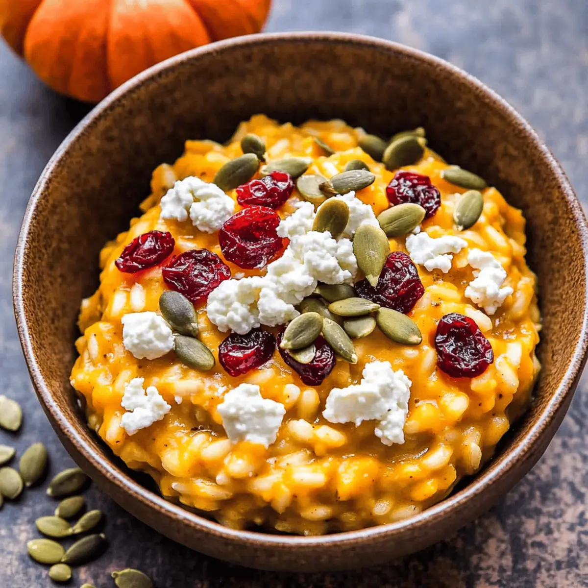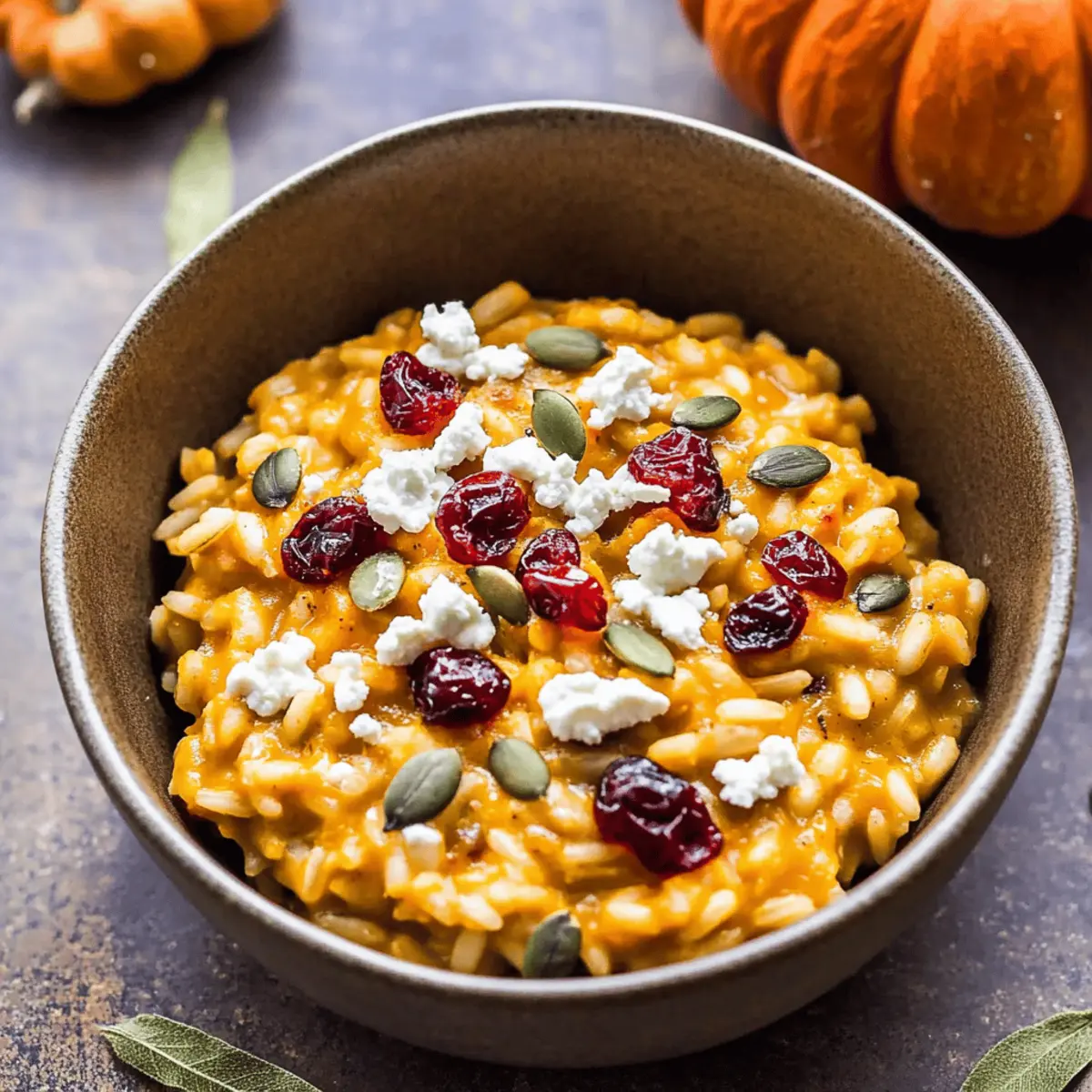 Jump to Recipe Print RecipeAs the leaves begin to turn gold and the air gets that crisp autumn edge, my thoughts drift to warm, comforting meals that celebrate the season. This Creamy Baked Pumpkin Goat Cheese Risotto perfectly captures those rich fall flavors, making it a must-have for your dinner table. With minimal prep and a simple baking technique, you can create a dish that’s not only a visual feast topped with cranberries and pepitas but also a time-saver for your festive gatherings. Whether you’re treating your family to a cozy dinner or impressing friends at Thanksgiving, this vegetarian delight is destined to become a crowd-pleaser. So, are you ready to dive into a bowl of creamy goodness? Why is Pumpkin Goat Cheese Risotto a Must-Try? Irresistible Comfort: This risotto delivers warm and cozy vibes, perfect for fall gatherings. Quick and Simple: With just an hour in the oven, this hassle-free dish lets you relax while it bakes. Crowd-Pleasing Delight: The combination of creamy goat cheese and sweet pumpkin creates a flavor profile everyone will love! Versatile Options: Serve it as a stunning side for Thanksgiving, or pair it with a fresh salad for a complete meal. Nutrient-Rich: Packed with fiber and wholesome ingredients, this risotto is a guilt-free indulgence for any feast. For more seasonal side inspiration, check out our Crispy Broccoli Cheese Rounds or Chicken Cheese Zucchini Muffins! Pumpkin Goat Cheese Risotto Ingredients For the Risotto Olive Oil – Adds richness and helps sauté aromatic vegetables; substitute with avocado oil for a different flavor profile. Shallot – Provides a mild, sweet onion flavor; use onion if shallot is unavailable. Garlic – Enhances the overall savory flavor; roasted garlic offers a sweeter and deeper taste. Short Grain Brown Rice (Arborio) – Creates a creamy texture when cooked; Arborio white rice is a quicker option. Dry White Wine – Adds acidity and depth; omit and use additional vegetable broth if desired. Low Sodium Vegetable Broth – The base of the dish, offering moisture and flavor; chicken broth works for a non-vegetarian option. Pumpkin Purée – Delivers the sweetness and fall flavor that this dish is known for; butternut squash purée can be swapped if needed. Fresh Chopped Sage – Offers an earthy flavor that complements the pumpkin; thyme or parsley can be substituted. Fresh Rosemary – Enhances aroma and flavor; use dried rosemary sparingly for potency. Ground Nutmeg – Adds warmth and spice; cinnamon can provide a unique twist. Red Pepper Flakes – Introduces a hint of heat; feel free to omit for a milder flavor. Kosher Salt and Fresh Ground Black Pepper – Essential for seasoning; adjust to your personal taste. Goat Cheese – Creates that signature creaminess and tanginess; feta cheese is a delicious alternative. For the Toppings Dried Cranberries – Provide sweetness and a pop of color; substitute with raisins or chopped apricots if preferred. Pumpkin Seeds (Pepitas) – Add a delightful crunch and nutritional boost; sunflower seeds can also be used as an alternative. Step‑by‑Step Instructions for Creamy Baked Pumpkin Goat Cheese Risotto Step 1: Preheat & Prepare Start by preheating your oven to 375°F (190°C). While it warms, gather your ingredients, ensuring everything is ready to go. Grease a heavy oven-safe pot with a splash of olive oil, setting the stage for a rich and creamy Pumpkin Goat Cheese Risotto. Step 2: Whisk Pumpkin Mixture In a measuring cup, whisk together 1 cup of low sodium vegetable broth with pumpkin purée until smooth. This mixture will add that delicious fall flavor to your risotto. Set it aside while you get the sautéing process going, as it will enrich the dish beautifully. Step 3: Sauté Aromatics Heat 2 tablespoons of olive oil in your prepared pot over medium-high heat. Once shimmering, add the finely chopped shallots and sauté for about 1 minute, followed by minced garlic for an additional 30 seconds. Season with kosher salt and fresh ground black pepper, letting these fragrant ingredients soften and marry together. Step 4: Deglaze with Wine Pour in a generous splash of dry white wine, stirring constantly for about 1 minute. Scrape the bottom of the pot to release any savory bits stuck from the shallots and garlic. As the wine evaporates, you’ll notice a wonderful aroma filling your kitchen, enhancing the depth of your Pumpkin Goat Cheese Risotto. Step 5: Combine Broth & Seasoning Next, stir in the prepared pumpkin broth mixture along with the remaining vegetable broth, fresh chopped sage, rosemary, ground nutmeg, and a pinch of red pepper flakes. Bring this sumptuous mixture to a gentle boil, making sure those seasonal flavors are well-incorporated before moving to the next step. Step 6: Add the Rice Once boiling, stir in 1 cup of short grain brown rice (Arborio) until evenly distributed. Cover the pot tightly with a lid, then transfer it to your preheated oven. Bake for about 60-70 minutes, or until the rice is tender and has absorbed the liquid, creating a creamy consistency perfect for your Pumpkin Goat Cheese Risotto. Step 7: Mix in Goat Cheese Remove the pot from the oven and give the risotto a good stir. Crumble in about 4 ounces of goat cheese and mix vigorously for 2 minutes. The heat will melt the cheese, contributing to that creamy texture you desire. If the risotto is too thick, feel free to stir in more broth until you reach your preferred creaminess. Step 8: Serve with Toppings To finish, serve your delightful Pumpkin Goat Cheese Risotto warm, generously topping each bowl with extra goat cheese, a sprinkle of dried cranberries, crunchy pumpkin seeds (pepitas), and additional fresh herbs for that seasonal touch. This dish is a warming centerpiece for any fall gathering! Pumpkin Goat Cheese Risotto Variations Feel free to mix things up and make this risotto your own with these delightful twists! Cauliflower Rice: For a lighter option, substitute caulif