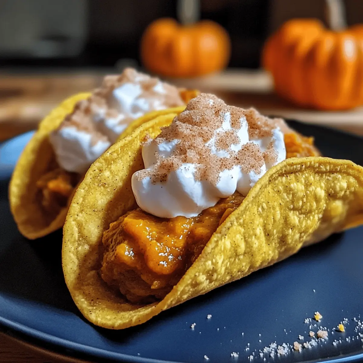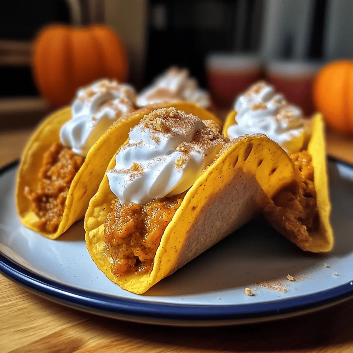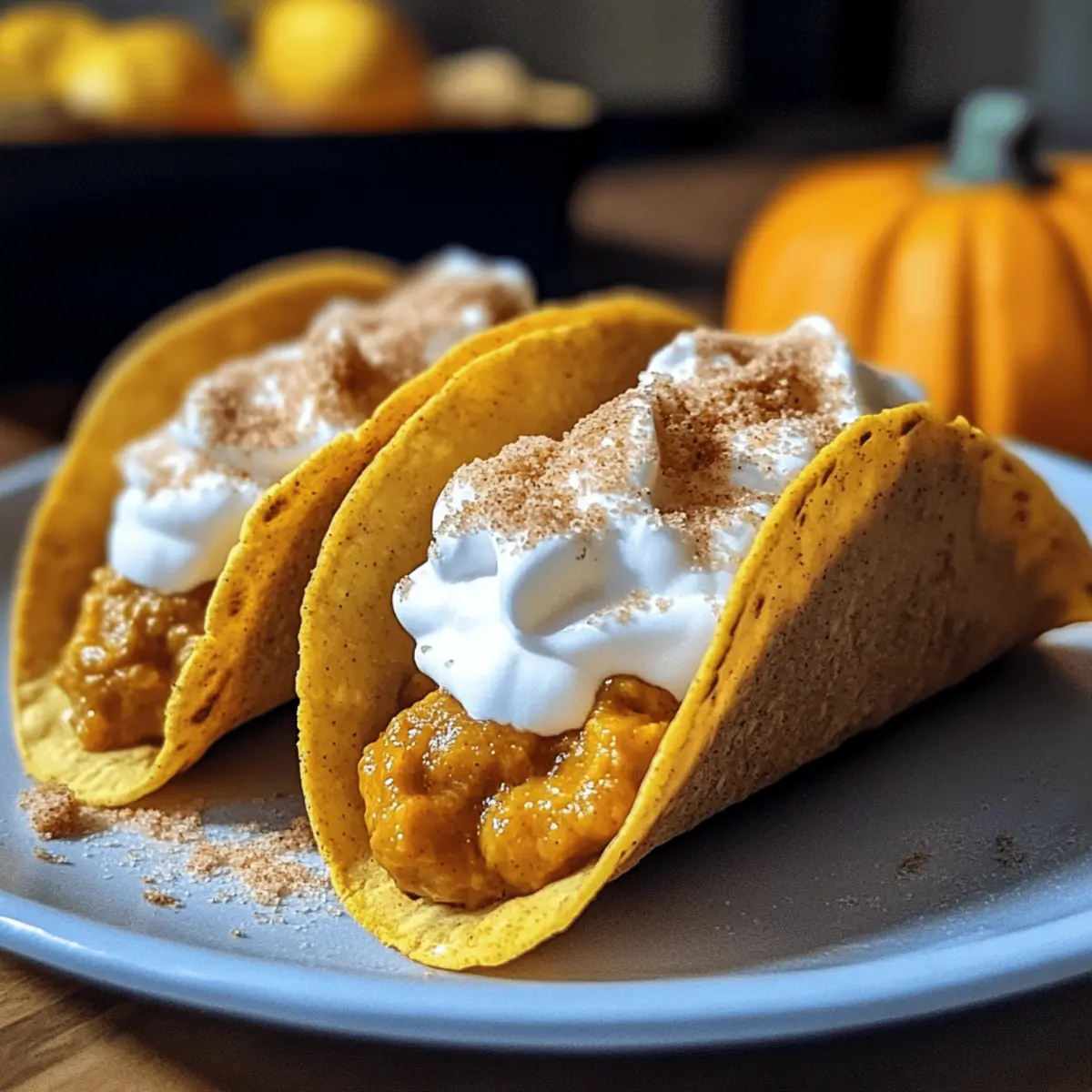 Jump to Recipe Print RecipeAs I stood in my kitchen, the scent of warm cinnamon wafted through the air, instantly transporting me to cozy autumn gatherings. That’s when I decided to reinvent one of my favorite fall treats by making Pumpkin Pie Tacos. These delightful dessert tacos combine crispy cinnamon-sugar tortillas with a creamy pumpkin filling that’s simply irresistible. Not only are they a fun twist on the traditional pumpkin pie, but they’re also perfect for sharing at Halloween parties or Thanksgiving feasts. Plus, with gluten-free tortilla options available, everyone can enjoy this sweet, hand-held dessert without worry. Are you ready to elevate your fall dessert game and impress your loved ones? Let’s dive into this delicious recipe! Why are Pumpkin Pie Tacos a Must-Try? Unique Fusion: Pumpkin Pie Tacos offer a playful twist on the traditional pumpkin pie, bringing a delightful fusion of flavors and textures. Crispy Delight: Crispy, cinnamon-sugar tortillas envelop a creamy pumpkin filling, making each bite a heavenly experience. Versatile Options: Easily adapt this recipe to create Pumpkin Cheesecake Tacos or try different fillings for a savory alternative. Inclusive Treat: With the option for gluten-free tortillas, everyone can indulge in this festive treat, regardless of dietary preferences. Crowd-Pleaser: Perfect for Halloween parties or Thanksgiving gatherings, these tacos are sure to impress family and friends alike with their unique presentation and delicious flavor. Pumpkin Pie Tacos Ingredients For the Taco Shells • Small Flour Tortillas – These create the perfect shell structure to hold all that delicious filling; swap for gluten-free tortillas to accommodate dietary needs. • Butter – Adds richness and assists in creating crispy shells; for a dairy-free option, use coconut oil. • Granulated Sugar – Sweetens the cinnamon-sugar coating; consider brown sugar for a deeper flavor profile. • Ground Cinnamon – Enhances the flavor of both the shells and filling; feel free to mix in nutmeg or ginger for additional warmth. For the Filling • Canned Pumpkin Puree – The base for the flavorful filling; fresh pumpkin is a wonderful option if you want that homemade taste. • Pumpkin Pie Spice – This blend of spices captures the essence of pumpkin pie perfectly; individual spices (cinnamon, nutmeg, ginger) can be used in a pinch. • Brown Sugar – Adds sweetness and moisture for the filling; honey or agave syrup are great alternatives for those avoiding refined sugars. • Vanilla Extract – Elevates the flavor of the filling; always opt for pure vanilla extract for the best results. • Cream Cheese – Delivers a creamy texture; swap it with plant-based cream cheese for a vegan-friendly option. • Whipped Topping (or Heavy Cream) – Lightens the filling; use a dairy-free whipped cream to keep it allergen-friendly. Optional Toppings • Extra Whipped Cream – A luscious finishing touch for that dessert vibe. • Crushed Graham Crackers – Adds a delightful crunch and enhances the presentation. • Caramel Drizzle – A sweet and sticky upgrade that elevates the overall flavor. • Mini Chocolate Chips – For a hint of chocolatey goodness, these add a fun twist. • Toasted Pecans – Offer a nutty richness and added texture to your tacos, making them irresistible. With these Pumpkin Pie Tacos ingredients, you’re all set to create a stunning and mouth-watering dessert that captures the spirit of fall! Step‑by‑Step Instructions for Pumpkin Pie Tacos Step 1: Make Taco Shells Preheat your oven to 400°F (200°C). Melt some butter and brush it generously on both sides of each tortilla. In a small bowl, mix granulated sugar with ground cinnamon. Coat the tortillas in this cinnamon-sugar mixture, then drape them over an oven rack or place them in a muffin tin. Bake for 6-8 minutes until the tortillas are golden and crispy. Step 2: Prepare Filling In a large mixing bowl, combine canned pumpkin puree, cream cheese, brown sugar, pumpkin pie spice, ground cinnamon, and vanilla extract. Use a hand mixer to blend the ingredients until smooth and creamy, ensuring everything is well incorporated. Gently fold in the whipped topping, creating a light, airy filling. This creamy mixture will elevate your Pumpkin Pie Tacos. Step 3: Fill Shells Once the taco shells have cooled completely, it’s time to fill them. Take a spoonful of the pumpkin filling and carefully spoon it into each crispy taco shell. Aim for a generous portion but avoid overfilling to prevent spillage. These sweet, hand-held treats are coming together beautifully with your delicious pumpkin filling inside! Step 4: Top and Serve To finish off the Pumpkin Pie Tacos, garnish each one with a dollop of whipped cream and an optional sprinkle of crushed graham crackers. Drizzle caramel for added sweetness or sprinkle mini chocolate chips for a fun twist. Let the filled tacos chill in the refrigerator for 15-30 minutes before serving to enhance the flavors and freshness, making them perfect for any festive gathering. Pumpkin Pie Tacos Variations & Substitutions Get ready to make these delightful Pumpkin Pie Tacos even more personal and delicious with a few easy twists! Gluten-Free: Substitute small flour tortillas with gluten-free tortillas to accommodate dietary needs without sacrificing taste. Dairy-Free: Replace butter with coconut oil for the taco shells and use plant-based cream cheese and whipped topping for the filling. Pumpkin Cheesecake: Elevate the dessert experience by adding more cream cheese and mixing in sour cream or Greek yogurt for a cheesecake-like filling. It offers a rich, creamy delight! Sweetener Swap: Use maple syrup or agave nectar in place of brown sugar for a different flavor dimension that complements the pumpkin. Additional Spices: Experiment with flavors by including nutmeg or ginger in your pumpkin filling for a warm, spiced touch that captures fall’s essence. Savor