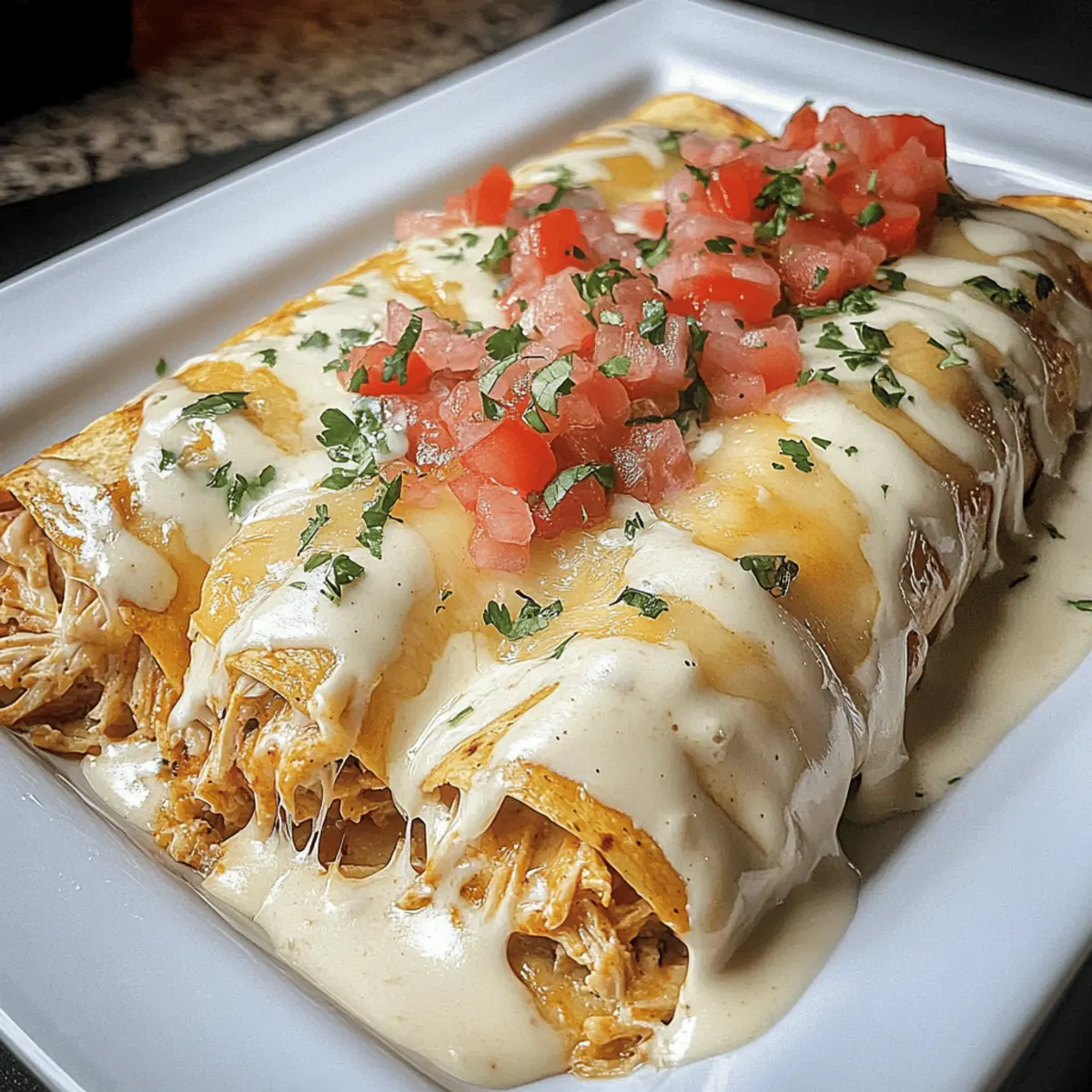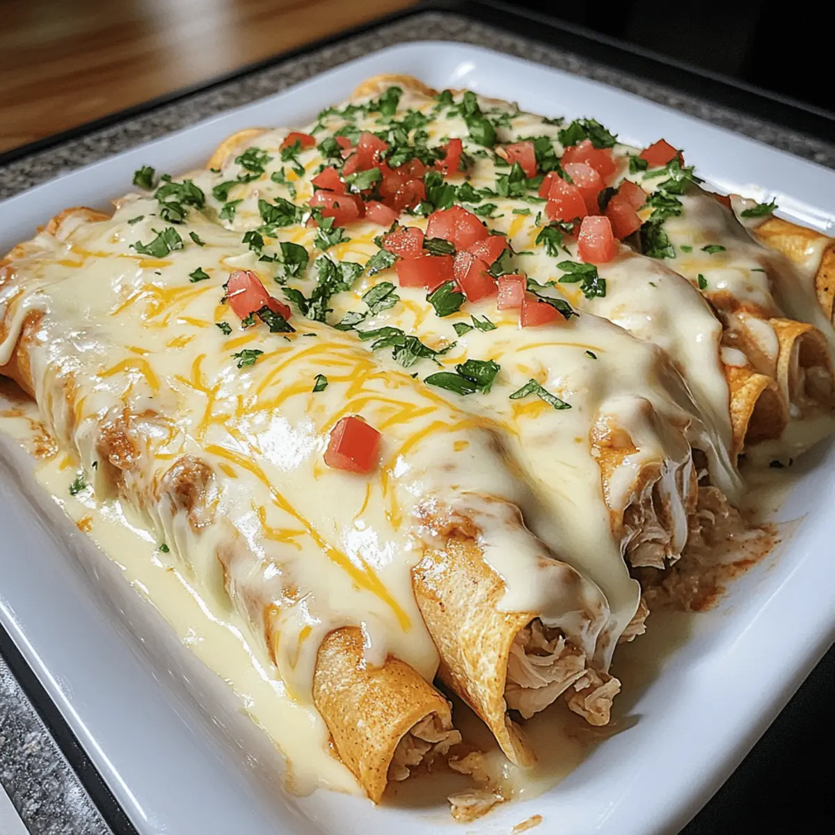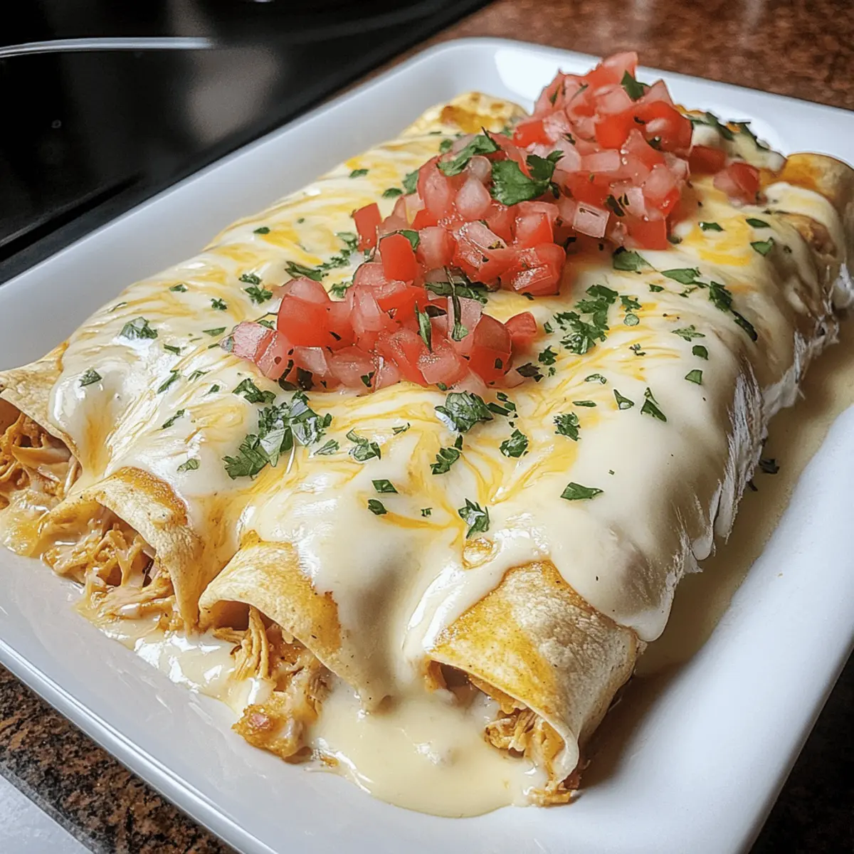 Jump to Recipe Print RecipeOne bite of these Cheesy Queso Chicken Enchiladas, and you’ll feel like you’ve been transported to a cozy Mexican kitchen, where every dish tells a story. Quick to prepare and utterly satisfying, this recipe transforms weeknight dinners into a flavorful adventure in just 10 minutes. Imagine wrapping tender shredded chicken in warm tortillas, smothering them in creamy Velveeta queso, and watching your family light up at the dinner table. Not only are these enchiladas a sure-fire crowd-pleaser, but their customizable fillings mean you can easily adapt them to suit everyone’s tastes. Want to switch it up? A few simple variations can bring in new proteins or toppings that will keep dinnertime exciting! So, are you ready to turn your kitchen into a flavorful Mexican fiesta? Let’s dive into this delightful recipe! Why Are These Enchiladas So Addictive? Comforting Flavors: Each bite of these Queso Chicken Enchiladas envelops you in warm, cheesy goodness, thanks to the rich Velveeta queso that melts beautifully over the top. Quick Prep Time: With just 10 minutes of prep, you’ll have dinner on the table in no time, making it perfect for busy weeknights. Customizable Options: Tailor the recipe to your family’s preferences—think shredded beef, turkey, or even a mix of veggies for a healthier spin. Family-Friendly Appeal: Kids and adults alike can’t resist these gooey, cheesy delights, ensuring dinner is enjoyed by all! Pair them with sides like guacamole and pico de gallo for a complete meal. Make Ahead: Prep ahead and freeze for those nights when you need a quick meal—just pop them in the oven and enjoy! Queso Chicken Enchiladas Ingredients For the Filling Shredded Chicken – Provides a protein-packed base; feel free to swap with diced beef, turkey, or lamb. Taco Seasoning – Adds a delightful burst of flavor; homemade versions ensure you can control the spice levels. Sour Cream – Contributes creaminess and moisture; substitute Greek yogurt for a lighter twist. Shredded Cheddar Cheese – Enhances richness; opt for sharp varieties for an intensified taste. Chopped Green Chilies – Adds a mild kick and flavor; jalapeños can be used for those who crave heat. For the Queso Sauce Velveeta Cheese – Creates a luxuriously creamy sauce; you can also use other melting cheeses like Monterey Jack or Pepper Jack. Diced Tomatoes with Green Chilies – Introduces texture and moisture; choose a brand without added sugar for optimal flavor. For Assembling Tortillas – Holds everything together; corn tortillas are a great gluten-free option. Topping Suggestions Fresh Avocado – Adds a creamy texture; pick ripe avocados for best flavor. Cilantro – Provides a fresh, herby finish; if you’re not a fan, parsley can work as a substitute. Diced Jalapeños – For those who enjoy extra spice; they’re a fun way to personalize your plate. Dive into these Queso Chicken Enchiladas, and make your weeknight dinners not just quick but truly exciting! Step‑by‑Step Instructions for Queso Chicken Enchiladas Step 1: Combine Filling In a large bowl, mix together the shredded chicken, taco seasoning, sour cream, shredded cheddar cheese, and chopped green chilies. Stir until the mixture is well combined and creamy. This delicious filling sets the foundation for your Queso Chicken Enchiladas. Allow it to sit for a moment while you prepare the queso sauce. Step 2: Prepare Queso Sauce In a medium saucepan, add the Velveeta cheese and the can of diced tomatoes with green chilies (un-drained). Heat over medium-high heat, stirring frequently until the cheese has fully melted and the mixture becomes smooth and creamy. Once finished, set aside a little of the queso sauce for topping, and keep the rest warm to pour over the enchiladas. Step 3: Assemble Enchiladas Lay out the tortillas on a clean surface or plate. Spoon about ½ to ¾ cup of the chicken mixture onto each tortilla, spreading it evenly. Carefully roll the tortillas up, making sure they’re tightly packed to prevent the filling from spilling out. Place the rolled enchiladas seam-side down in a greased 9×13 casserole dish. Step 4: Bake Preheat your oven to 350°F (175°C). Pour the warm queso sauce over the arranged enchiladas, ensuring they are generously covered. Bake in the preheated oven for 20–25 minutes, or until the sauce is bubbly and the edges of the tortillas begin to turn golden. This is when your Queso Chicken Enchiladas will start smelling irresistible! Step 5: Serve Once baked, remove the enchiladas from the oven and let them cool for a few minutes. Serve hot, garnished with your choice of fresh avocado, cilantro, or diced jalapeños. The creamy layers of the queso sauce combined with the tasty filling are bound to bring smiles around the dinner table! What to Serve with Queso Chicken Enchiladas Dive into a world of flavors by pairing your cheesy delights with complementary sides. Guacamole: Fresh and creamy, it adds a cool contrast to the warm, cheesy enchiladas. Pico de Gallo: This vibrant salsa brings a zesty punch that brightens the dish, balancing richness beautifully. Mexican Rice: Fluffy and fragrant, this side offers a delightful texture and absorbs those delicious queso drippings. Refried Beans: Creamy and savory, they bring heartiness to the meal and a dose of traditional flavor. Corn on the Cob: Charred and sweet, it brings a pop of freshness and a touch of fun to your plate. Chips and Salsa: Perfect for snacking before the main event, they add crunch and a fiesta feel to the dinner. Fresh Cilantro Salad: Lightly dressed with lime, this salad adds a refreshing note that enhances everything on your plate. Margaritas: A tangy lime margarita pairs wonderfully, complementing the cheesy goodness with its citrusy brightness. Flan: End on a sweet note with this creamy, caramel-topped dessert that teases the taste buds. Make Ahead Options These Queso Chicken Enchiladas are perfect for meal prep ent
