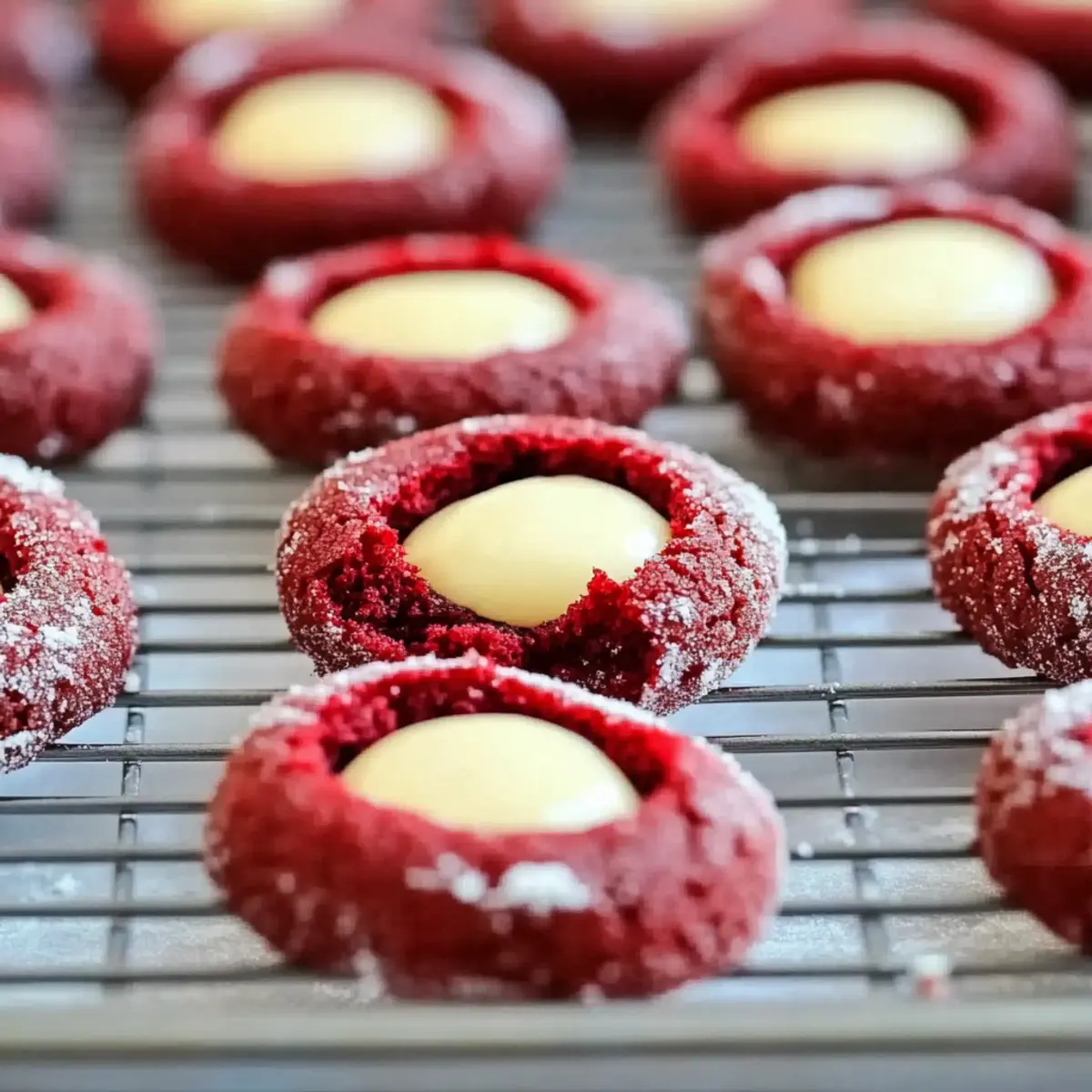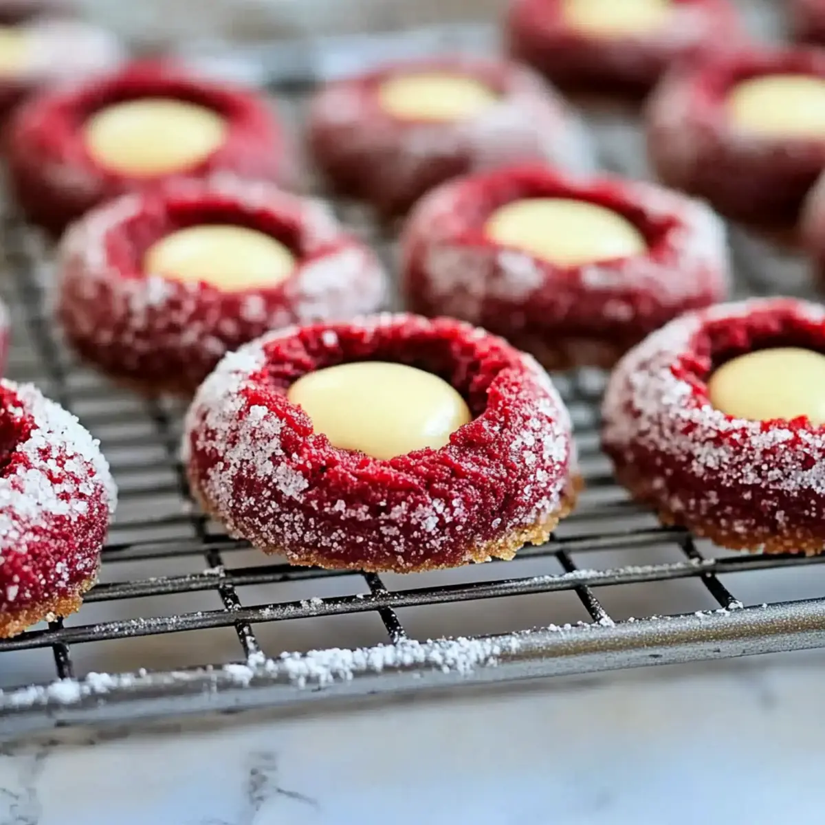 Jump to Recipe Print RecipeAs I adjusted the last bit of red food coloring into the dough, I couldn’t help but marvel at how these Red Velvet Thumbprint Cookies with Cream Cheese would brighten any table. This delightful twist on a classic dessert not only dazzles the eye with its vibrant hue but also tantalizes the taste buds, blending rich chocolate and creamy frosting in every bite. They’re perfect for impressing guests at festive gatherings or simply for indulging yourself during a cozy evening at home. With quick prep time and a luxurious flavor, these cookies make for a crowd-pleasing treat without too much fuss. So, who’s ready to add a splash of color and sweetness to their baking repertoire? Why Make Red Velvet Thumbprint Cookies? Irresistible, these Red Velvet Thumbprint Cookies are not just visually appealing; they’re packed with rich flavor! Quick to prepare, you’ll have a delicious treat in no time, making them ideal for impromptu gatherings. Versatile options like different food coloring or nut add-ins keep things exciting for any festive event. Moist and chewy, each bite offers a delightful surprise with creamy cheese filling, reminiscent of a soft cookie-meets-cake. Want to explore more mouthwatering treats? Check out our Cream Cheese Salami for a savory option or indulge in Red Velvet Cheesecake for an unforgettable dessert! Red Velvet Thumbprint Cookies Ingredients For the Cookie Dough Unsalted Butter – Provides richness and moisture, ensuring a delightful cookie texture. Granulated Sugar – Sweetens the dough and aids in achieving the perfect cookie structure. Large Egg – Binds all ingredients together while adding essential moisture. Vanilla Extract – Enhances the overall flavor; opt for pure vanilla for the best results. Cocoa Powder – Contributes to the rich chocolate flavor of your Red Velvet Thumbprint Cookies. Red Food Coloring – Gives those iconic vibrant red hues; gel food coloring offers better results. All-Purpose Flour – Acts as the primary structural element, keeping the cookies firm yet soft. Baking Powder – A leavening agent that creates a light and airy texture in your cookies. Salt – Balances the sweetness and amplifies all the flavors present in the cookie. For the Cream Cheese Filling Cream Cheese – Adds a tangy flavor that perfectly complements the sweetness of the cookies. Powdered Sugar – Sweetens the cream cheese filling while giving it a smooth texture. These delightful Red Velvet Thumbprint Cookies are sure to be a hit at your next gathering! Enjoy the vibrant flavors and inviting appearance that will leave your guests wanting more. Step‑by‑Step Instructions for Red Velvet Thumbprint Cookies with Cream Cheese Step 1: Preheat and Prepare Begin by preheating your oven to 350°F (175°C) and line a baking sheet with parchment paper to prevent sticking. This initial step ensures your Red Velvet Thumbprint Cookies will bake evenly and come out perfectly. As the oven heats, gather your mixing bowls and beaters, setting the stage for creating a delightful cookie dough. Step 2: Cream Butter and Sugar In a large mixing bowl, combine softened unsalted butter and granulated sugar, using a hand mixer or stand mixer on medium speed. Cream the mixture until it’s light and fluffy, which should take about 3-4 minutes. Once that’s achieved, add in one large egg and a splash of vanilla extract to enrich the flavor, mixing until well combined. Step 3: Incorporate Cocoa and Color In a small bowl, mix together cocoa powder and red food coloring until fully blended, creating a rich paste. Gradually add this vibrant mixture into the butter-sugar mixture, ensuring everything is combined thoroughly. This essential step gives your Red Velvet Thumbprint Cookies their signature hue and deep flavor, making your dough visually captivating. Step 4: Combine Dry Ingredients Next, in another bowl, whisk together all-purpose flour, baking powder, and salt. Gradually add this dry mixture to your wet ingredients, stirring until just combined. Be careful not to overmix, as this can affect the texture of your cookies. The dough should be soft and slightly sticky, ready for shaping. Step 5: Shape the Cookies Using your hands, roll the dough into one-inch balls and place them onto the prepared baking sheet. Leave enough space between each ball for even baking. Once all the dough is shaped, gently press your thumb into the center of each ball to create an indentation that will hold the cream cheese filling later. Step 6: Prepare the Cream Cheese Filling In a separate bowl, combine cream cheese and powdered sugar, mixing until smooth and creamy. This filling adds a wonderful tang to your cookies. It’s essential to achieve a lump-free texture here, as this will impact the final presentation of your Red Velvet Thumbprint Cookies. Step 7: Fill and Bake Carefully fill each thumbprint indentation with the cream cheese mixture, avoiding any overflow. Once filled, place the baking sheet in the preheated oven and bake for 12-15 minutes, or until the edges are set and the cookies slightly puff up. Keep an eye on them; the cookies should have a soft center and a gentle crispness around the edges. Step 8: Cool Before Serving Once baked, remove the cookies from the oven and let them cool on the baking sheet for about 5 minutes. This step allows them to firm up a bit and makes transferring them easier. After cooling slightly, transfer the cookies to a wire rack to cool completely before serving, allowing flavors to meld beautifully. Make Ahead Options These Red Velvet Thumbprint Cookies with Cream Cheese are perfect for meal prep, allowing you to streamline your baking for busy occasions! You can prepare the dough and refrigerate it for up to 48 hours. Simply roll the dough into balls and keep them wrapped in plastic wrap to prevent drying out. The cream cheese filling can also be made ahead of time and stored in an airtight container in the fridge for up to 3