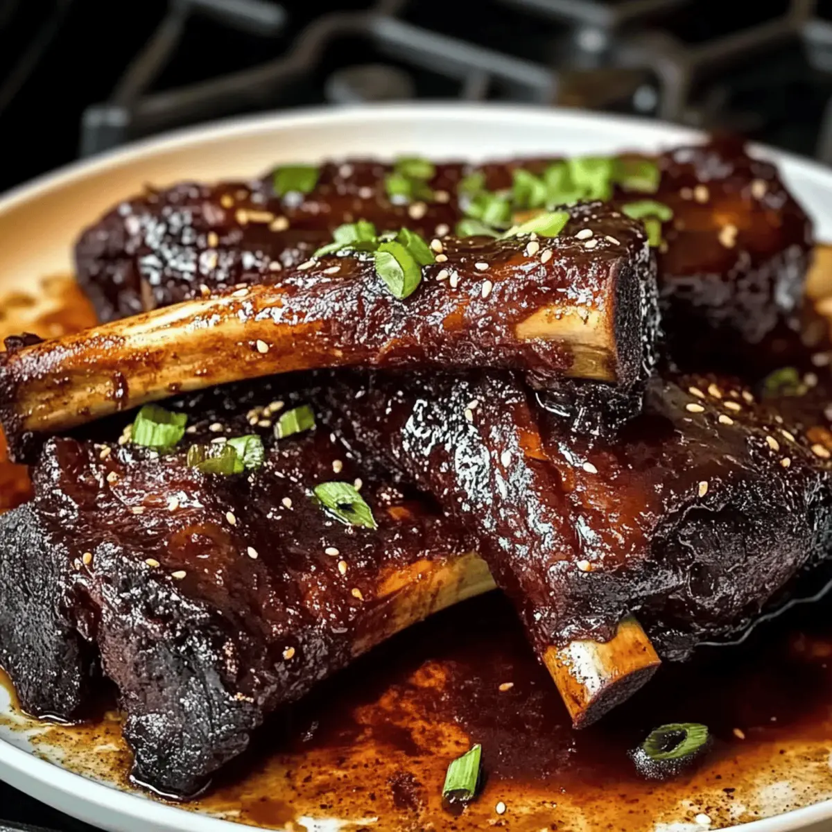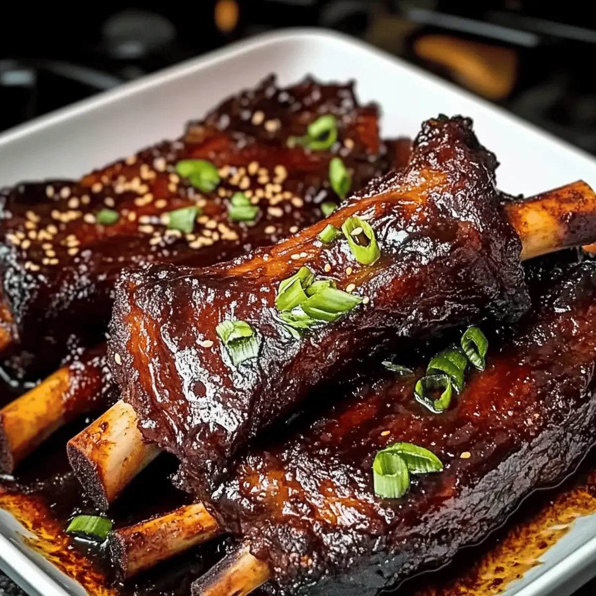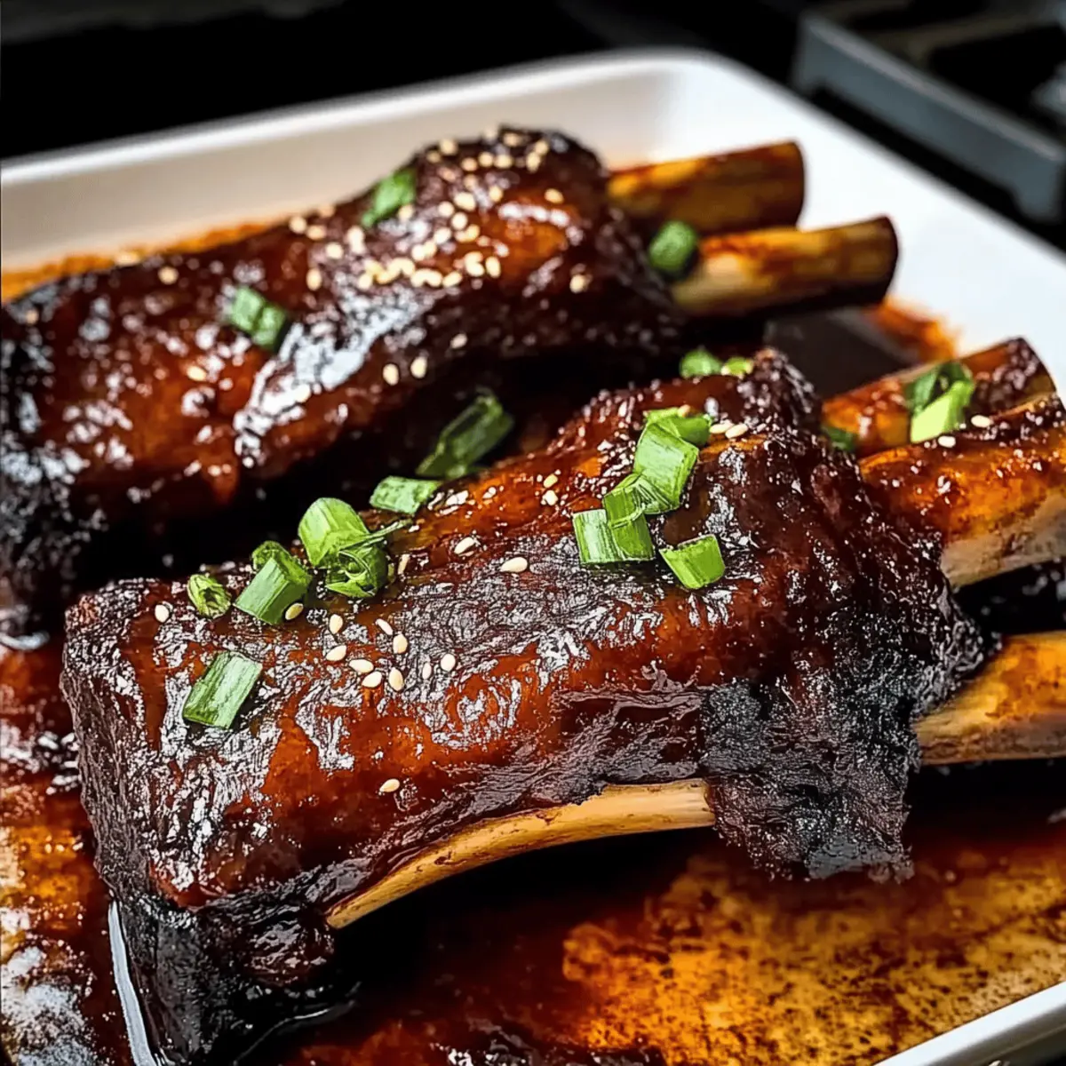 Jump to Recipe Print RecipeAs I stood by the stove, the sweet aroma of Caramelized Slow Roast Asian Beef Short Ribs wafted through the kitchen, instantly transporting me to bustling night markets filled with tantalizing street food. There’s something magical about slow cooking, especially when it results in tender, fall-off-the-bone goodness that takes center stage at any meal. This dish is not only a comforting hug on a plate but also a crowd-pleaser that showcases a delightful harmony of savory and sweet flavors. With minimal prep time and a rich glaze that will have everyone begging for more, you’re going to want to add this savory gem to your dinner rotation. Ready to impress your family and friends? Let’s dive into this flavorsome journey together! Why is This Beef Short Rib Recipe Special? Unbeatable Flavors: The combination of soy sauce, brown sugar, and sesame oil melds into a glaze that’s both savory and sweet, making every bite a burst of flavor. Tender Texture: Slow-roasting ensures the meat is incredibly tender, falling off the bone effortlessly, perfect for impressing your guests or enjoying a family meal. Quick Prep Time: With minimal preparation, you can set it up and let your oven work its magic, freeing you to focus on other dishes, like Zucchini Ground Beef or Epic Beef Nachos. Versatile Serving Suggestions: Pair it with steamed rice or stir-fried veggies for a complete meal that satisfies everyone’s cravings. Crowd-Pleaser: This dish is sure to draw compliments and keep everyone coming back for seconds, making it a wonderful addition to any gathering! Roast Asian Beef Short Rib Ingredients • Here’s what you’ll need to create this mouthwatering dish. For the Marinade Beef Short Ribs – Choose well-marbled ones for the most tenderness and flavor. Soy Sauce – This adds a rich umami flavor; low-sodium soy sauce is a lighter option. Brown Sugar – A key ingredient for sweetness and perfect caramelization; coconut sugar can be used as a substitute. Rice Vinegar – Balances the dish with acidity; feel free to use apple cider vinegar in a pinch. Sesame Oil – Imparts a wonderful nutty aroma; grapeseed oil can be used for a lighter taste. Garlic (minced) – Fresh garlic elevates the flavor profile; don’t skimp on this! Fresh Ginger (grated) – Adds warmth and spice; powdered ginger works if you’re in a rush. Black Pepper – Season to taste to enhance the overall flavor of the dish. For the Glaze Cornstarch – Thickens the sauce to a luscious consistency; arrowroot powder is a good alternative. Water – Used to create the cornstarch slurry for thickening. For Garnishing Green Onions (sliced) – Adds a fresh, crisp bite to your final dish. Sesame Seeds – Sprinkle on top for a delightful crunch and visual appeal. Now you’re all set to bring this deliciously savory Roast Asian Beef Short Rib to your table! Step‑by‑Step Instructions for Caramelized Slow Roast Asian Beef Short Rib Step 1: Preheat the Oven Begin by preheating your oven to 300°F (150°C). This low temperature is essential for achieving that tender, fall-off-the-bone texture in your Caramelized Slow Roast Asian Beef Short Rib. While the oven heats up, you can start preparing the marinade to fully infuse the flavors into the beef. Step 2: Prepare the Marinade In a medium bowl, whisk together ½ cup of soy sauce, ¼ cup of brown sugar, ¼ cup of rice vinegar, 2 tablespoons of sesame oil, 4 cloves of minced garlic, 1 tablespoon of grated fresh ginger, and a pinch of black pepper. This aromatic blend will serve as the rich marinade for your beef short ribs, creating a sticky-sweet glaze during the cooking process. Step 3: Marinate the Ribs Place the well-marbled beef short ribs in a large dish and evenly pour the marinade over them. Ensure the ribs are fully coated for maximum flavor. Cover the dish with plastic wrap and let it marinate in the refrigerator for at least 30 minutes, or ideally overnight for more depth in flavor, allowing the savory notes to permeate the meat. Step 4: Sear the Ribs Heat a tablespoon of oil in a large, heavy-bottomed pot over medium-high heat. Once the oil is shimmering, carefully add the marinated beef short ribs, searing them on all sides for about 2-3 minutes per side, until they are beautifully browned. This step enhances the richness and gives your roast an inviting color. Step 5: Slow Roast the Ribs Once seared, pour the remaining marinade over the beef short ribs in the pot. Cover the pot securely with a lid or foil, and transfer it to the preheated oven. Roast for 3 hours, checking occasionally, until the meat is incredibly tender and yields easily when pierced with a fork. Step 6: Create the Glaze After 3 hours, remove the pot from the oven and take the ribs out. In a small bowl, mix 2 tablespoons of cornstarch with 2 tablespoons of water to form a slurry. Pour this slurry into the pot with the remaining cooking liquid and bring it to a simmer over medium heat for about 5 minutes, stirring constantly until the sauce thickens into a luscious glaze. Step 7: Glaze the Ribs With the glaze ready, brush it generously over the tender beef short ribs. Set the oven to broil and place the ribs back in for 5-10 minutes, keeping an eye on them to ensure the glaze caramelizes without burning. You’ll know they’re ready when a beautiful, sticky sheen forms. Step 8: Rest the Ribs Once caramelized to perfection, remove the ribs from the oven and let them rest for 15 minutes. This resting period allows the juices to redistribute, ensuring moist and flavorful meat when you slice into your Caramelized Slow Roast Asian Beef Short Rib. After resting, slice and serve, garnished with green onions and sesame seeds for an added touch. Roast Asian Beef Short Rib Variations Feel free to personalize this dish with delectable twists that will elevate it even further! Spicy Kick: Add red pepper flakes or sriracha to the marinade for a fiery flavor boost. Aromatic Enhancem