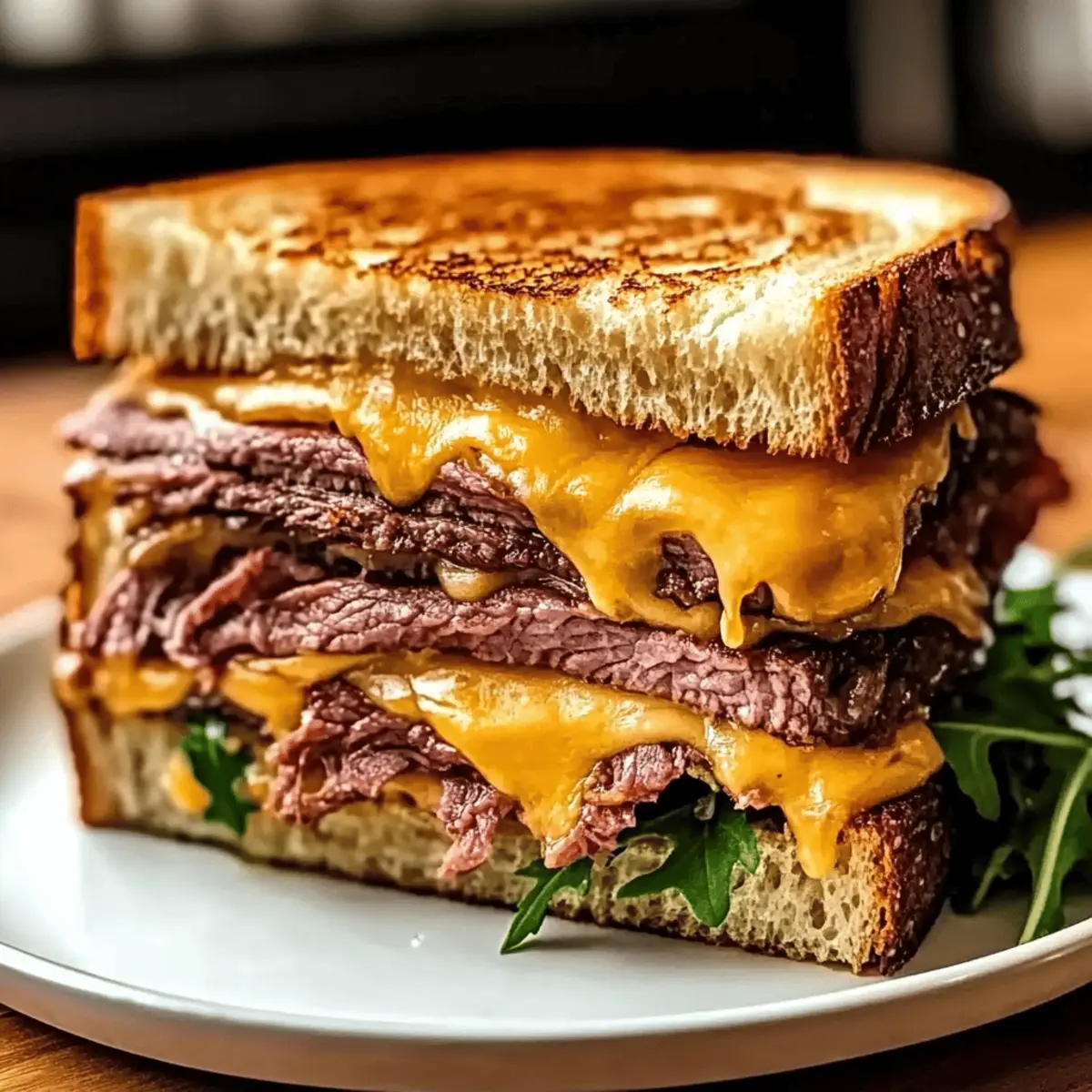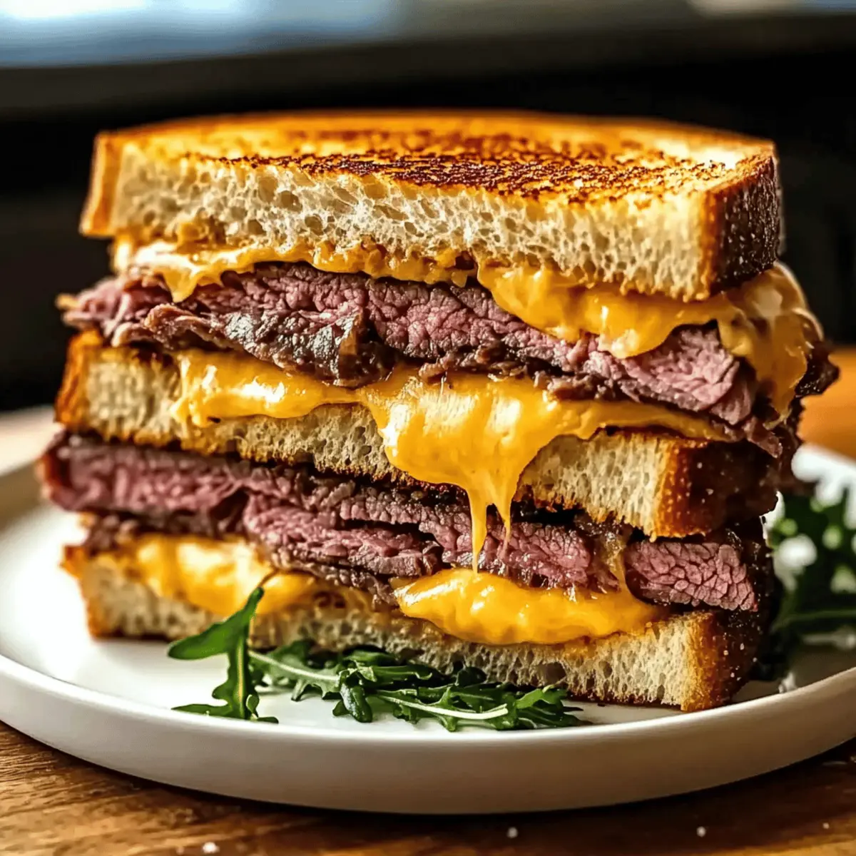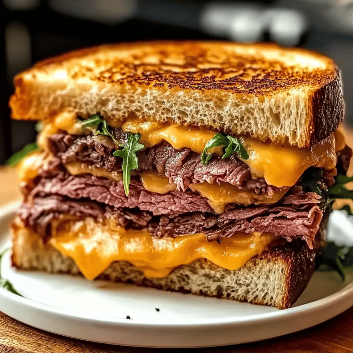 Jump to Recipe Print RecipeAs I stood in my kitchen, the unmistakable aroma of sizzling butter intertwined with savory roast beef brought me right back to my favorite deli from childhood. I couldn’t resist whipping up this Ultimate Roast Beef & Cheddar Melt Sandwich, where crispy sourdough meets gooey, melted cheddar in a comforting embrace. This quick sandwich recipe is not only a delightful crowd-pleaser, but it also transforms lunchtime into something extraordinary. In under 15 minutes, you’ll create an easy lunch option that feels both indulgent and satisfying. Ready to channel your inner gourmet chef and elevate your sandwich-making game? Let’s dive into this delicious creation together! Why is this sandwich a must-try? Simplicity: You’ll love how easy it is to whip up this Roast Beef & Cheddar Melt Sandwich, making it perfect for busy weekdays. Mouthwatering: The harmony of crispy sourdough with gooey cheddar and flavorful roast beef creates an irresistible taste sensation. Customizable: Whether you prefer adding Dijon mustard or switching to turkey or ham, the variations are endless! Quick & Efficient: Ready in under 15 minutes, this sandwich is a lifesaver for lunch on the go or a late-night craving. Crowd-Pleaser: It’s a satisfying meal that everyone will love—pair it with a side of potato chips or a simple salad for the win! If you’re intrigued by more comforting delights, check out the Ricotta Beef Stuffed shells or whipped up some Epic Beef Nachos for your next gathering! Roast Beef & Cheddar Melt Sandwich Ingredients • Experience the simple, comforting elements behind this delicious sandwich! For the Bread • Sourdough Bread – Use crusty artisan bread for an extra crunch that holds the filling well. For the Filling • Roast Beef – This savory protein is the heart of the sandwich; substitute with turkey or ham for variety. • Sharp Cheddar Cheese – Melts beautifully for a creamy texture; try Gruyère or mozzarella for a twist. • Dijon Mustard – Optional but adds a zesty kick; whole grain mustard can offer a different flavor profile. For Cooking • Unsalted Butter – Essential for toasting to a golden brown; olive oil works for a dairy-free option. • Salt and Pepper – Enhance all the flavors with these basic seasonings. For Garnish • Fresh Arugula or Spinach – Optional for a touch of color and freshness; it complements the richness of the sandwich. With these simple ingredients, you’ll whip up a Roast Beef & Cheddar Melt Sandwich that not only satisfies but becomes a beloved staple in your kitchen! Step‑by‑Step Instructions for Roast Beef & Cheddar Melt Sandwich Step 1: Preheat the Skillet Begin by preheating a large non-stick skillet over medium heat. This is the perfect temperature to achieve a golden-brown crust on your Roast Beef & Cheddar Melt Sandwich without burning the bread. Give it a few minutes to warm up, allowing the skillet to become evenly heated. Step 2: Prepare the Bread While the skillet heats, take two slices of crusty sourdough bread and spread 1 tablespoon of unsalted butter on one side of each slice. The butter will create a crispy, golden exterior when grilled. If you prefer, you can also use olive oil for a dairy-free option, ensuring each slice is evenly coated. Step 3: Assemble the Sandwich Once the skillet is hot, place one slice of bread butter-side down in the skillet. For an added burst of flavor, spread a thin layer of Dijon mustard on the unbuttered side. Layer your roast beef generously on top, followed by two slices of sharp cheddar cheese, creating a melty core that the whole family will love. Step 4: Top and Cook the First Side Carefully place the second slice of sourdough bread on top, with the buttered side facing up. Cook the sandwich for 3-5 minutes, watching closely as the underside turns golden brown and the cheese begins to melt. The aroma wafting from your skillet will be irresistible! Step 5: Flip the Sandwich When the first side is golden and the cheese starts melting, use a spatula to gently flip the sandwich. Cook the other side for another 3-5 minutes, ensuring it becomes equally crispy. If needed, press down lightly to help the cheese melt fully. Step 6: Check for Doneness After flipping, keep an eye on the sandwich to ensure both sides reach a perfect golden-brown and the cheese is completely melted. The ideal sandwich will have a crispy exterior, with gooey cheddar creating a delightful contrast against the succulent roast beef. Step 7: Slice and Serve Once cooked, carefully remove the Roast Beef & Cheddar Melt Sandwich from the skillet and allow it to cool slightly on a cutting board. Use a sharp knife to slice it in half or quarters for easy serving. The sight of melted cheese stretching as you cut will make your mouth water! How to Store and Freeze Roast Beef & Cheddar Melt Sandwich Fridge: Store leftovers in an airtight container for up to 3 days to maintain freshness. Heat them up the next day for a quick and comforting lunch. Freezer: If you’d like to save your sandwiches, wrap them tightly in plastic wrap, then foil, and freeze for up to 1 month. Thaw in the fridge before reheating. Reheating: For best results, reheat in a skillet over medium heat to revive that crispy crust and gooey cheddar. Alternatively, use a microwave, but the texture may be softer. Make-Ahead Tips: Consider prepping your ingredients ahead of time; keep sliced bread, cheese, and roast beef separate in the refrigerator and assemble when ready for the ultimate Roast Beef & Cheddar Melt Sandwich experience! Roast Beef & Cheddar Melt Sandwich Variations Feel free to get creative and make this Roast Beef & Cheddar Melt Sandwich your own delicious masterpiece! Grilled Chicken: Swap out the roast beef for sliced grilled chicken for a lighter option that still packs a punch. Different Cheeses: Try provolone or pepper jack for added spice, giving your sandwich a delightful twist that tantalizes the taste buds