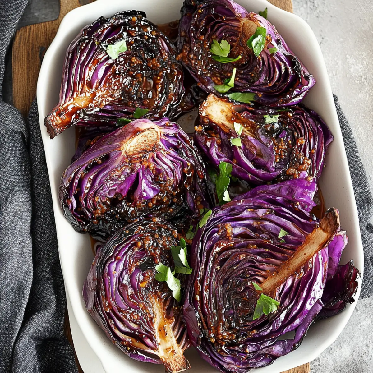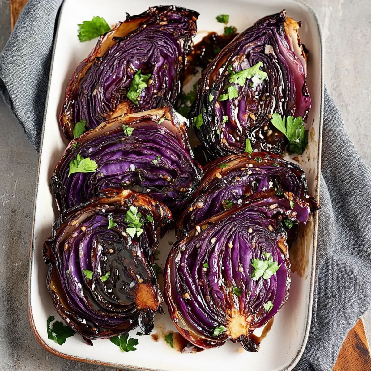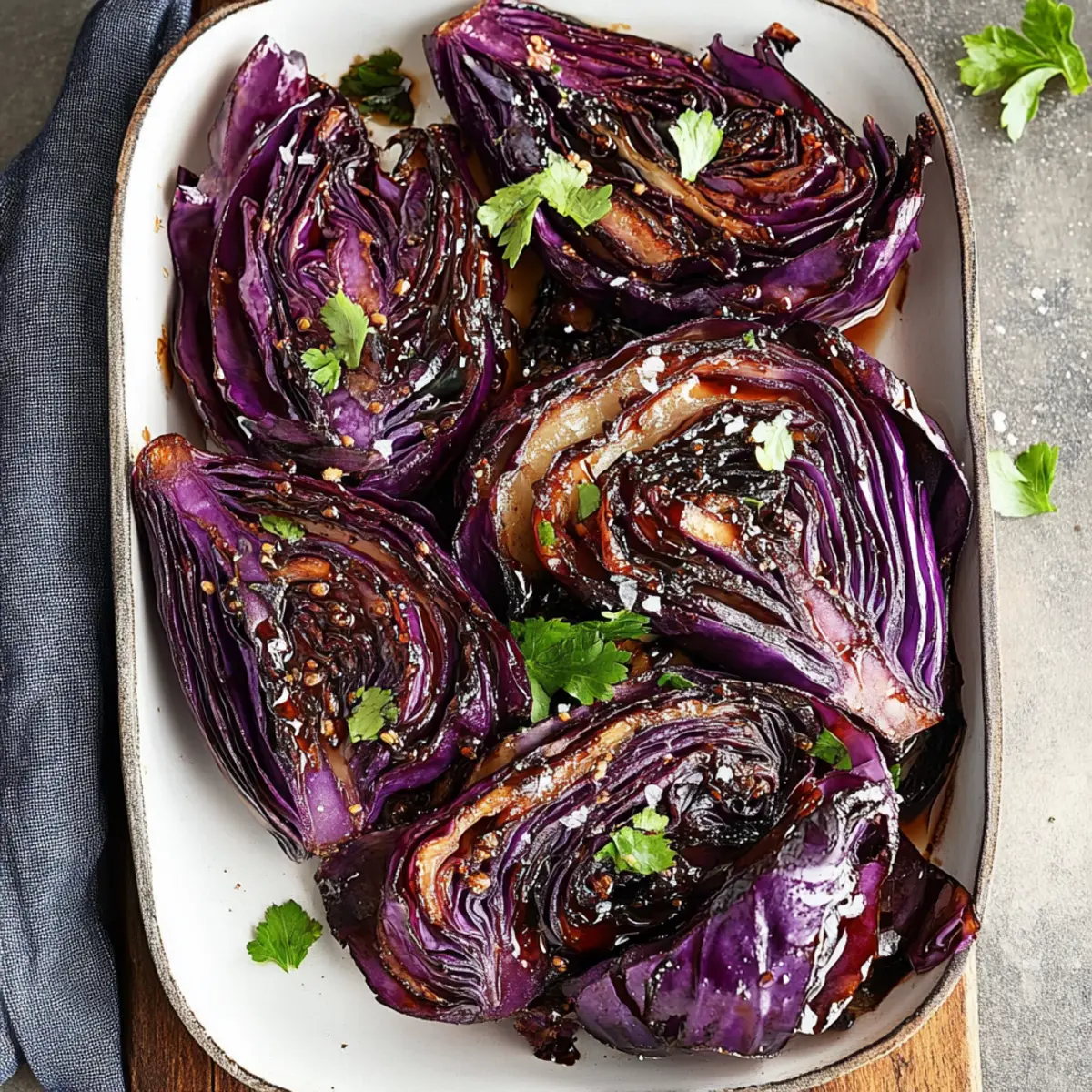 Once the cabbage is beautifully tender and the outer leaves are crispy, remove it from the oven and let it cool slightly. Sprinkle the remaining spice mix over the top and finish with a touch of chopped parsley for freshness. Your Roasted Balsamic Red Cabbage is now ready to shine as an irresistible side dish that complements any meal!