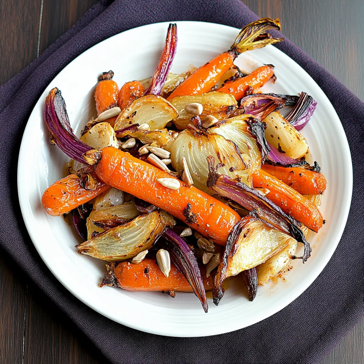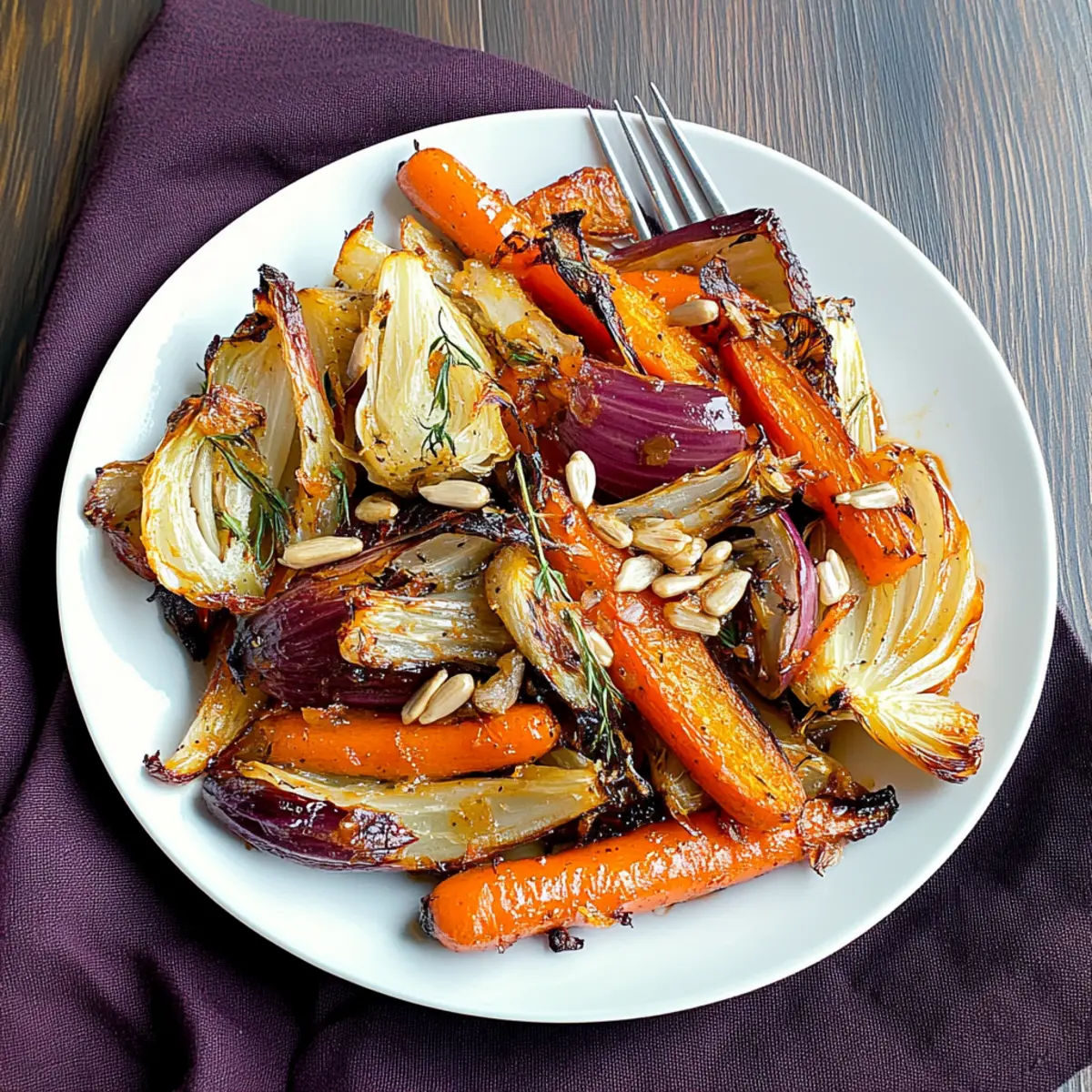 Jump to Recipe Print RecipeAs the aroma of roasting vegetables fills my kitchen, I can’t help but feel transported to a sun-drenched Mediterranean garden. That’s the magic of my Spicy Roasted Fennel and Carrots! This delightful dish brings together the sweet, earthy flavors of tender roasted fennel and vibrant carrots, accented by a satisfying crunch from sunflower seeds. Perfect for a quick weeknight dinner or as an exciting addition to your weekend get-together, this vegetarian recipe is not only speedy—it’s also brimming with health benefits. Who says a side dish can’t steal the show? Ready to bring a burst of color and flavor to your table with this irresistible dish? Why is This Dish a Must-Try? Quick Preparation: Whip up this colorful dish in just 30 minutes—perfect for busy weeknights. Flavor Explosion: The sweet caramelization of fennel and carrots combined with zesty sunflower seeds creates a truly addictive taste sensation. Health Benefits: Naturally vegetarian and packed with vitamins and minerals, it’s a guilt-free indulgence. Versatile Serving: Whether as a standalone side or tossed into a fresh salad, it adapts effortlessly to your meal. Elevate your culinary repertoire and serve alongside some Garlic Roasted Vegetables for a more robust veggie plate! Crowd Pleaser: This dish is sure to impress guests and family alike—who wouldn’t love a side that’s as beautiful as it is delicious? Roasted Fennel and Carrots Ingredients • Get ready to gather your kitchen essentials for this delightful dish! For the Vegetables Fennel Bulb – Adds a sweet, anise-like flavor; for a different texture, try substituting with celery. Carrots – Provide natural sweetness and vibrant color; parsnips are a great alternative. Red Onion – Imparts a slightly sweet taste when roasted; yellow onion gives a milder flavor. For the Roasting Olive Oil – Essential for roasting and enriching flavors; avocado oil can replace it for higher heat tolerance. Sea Salt & Black Pepper – Enhances all flavors; adjust to your taste preference. For the Crunch Raw Sunflower Seeds – Delivers a crunchy, nutty element; consider using pumpkin seeds for a twist. For the Spice Dried Chili Flakes – Adds heat; adjust based on your spice preference. Smoked Paprika – Contributes a smoky depth; sweet paprika can offer a milder version. For the Citric Touch Ground Coriander – Introduces citrusy notes that brighten the dish; feel free to omit if you’re fresh out. Apple Cider Vinegar – Provides acidity and brightness; lemon juice is a refreshing substitute. Fresh Lemon Juice – Balances sweetness with its acidity; lime juice can also work in a pinch. Step‑by‑Step Instructions for Spicy Roasted Fennel and Carrots Step 1: Preheat the Oven Begin by preheating your oven to 425°F (220°C). This high temperature is essential for roasting the fennel and carrots to achieve that delicious caramelization. While the oven heats, gather your vegetables and baking sheet, preparing to create a beautiful medley that will tantalize your taste buds. Step 2: Prepare the Vegetables On your baking sheet, slice the fennel bulb, carrots, and red onion into uniform pieces to ensure even roasting. Drizzle them with 1 tablespoon of olive oil and generously season with sea salt and black pepper. Use your hands to toss everything together until the vegetables are well-coated, showcasing their vibrant colors and tantalizing aromas. Step 3: Roast the Vegetables Place the baking sheet in the preheated oven and roast the fennel and carrots for 20 minutes. Keep an eye on them as they bake; you’re looking for that lovely golden-brown color and tender texture. This initial roasting helps develop the rich flavors while softening the vegetables beautifully. Step 4: Adjust and Continue Roasting After 20 minutes, remove the baking sheet from the oven. Carefully transfer the onion to a bowl and set it aside. Give the fennel and carrots a gentle stir, allowing them to mix, then return them to the oven for an additional 5 minutes. This final roasting will enhance the caramelization, making them irresistibly tasty. Step 5: Toast the Sunflower Seeds Meanwhile, heat the remaining tablespoon of olive oil in a small saucepan over low heat. Add the raw sunflower seeds, dried chili flakes, smoked paprika, and ground coriander. Toast these ingredients for about 2 minutes, stirring frequently until you smell the nutty aroma. This step adds a crunchy topping that elevates the roasted fennel and carrots. Step 6: Combine and Dress the Vegetables Once the sunflower seeds are ready, combine them in a bowl with apple cider vinegar and fresh lemon juice. This mixture will add a bright tang to balance the sweetness of the vegetables. Gently drizzle it over the roasted fennel and carrots, toss everything together, and season with additional salt and pepper if needed to suit your taste. Step 7: Garnish and Serve Finally, sprinkle the reserved fennel fronds over the roasted fennel and carrots for a burst of color and flavor. Serve this spectacular Spicy Roasted Fennel and Carrots warm as a standout side dish or mixed into salads for a delightful contrast in textures and tastes. Enjoy the compliments! Expert Tips for Spicy Roasted Fennel and Carrots Uniform Cuts: Ensure the vegetables are cut uniformly for even roasting; this avoids some pieces becoming overly soft while others remain crunchy. Mind the Toasting: Use low heat when toasting sunflower seeds to prevent burning; keeping a close eye will help you achieve that perfect nuttiness without bitterness. Mix It Up: Feel free to roast additional vegetables like bell peppers or zucchini for a colorful mix that enhances the overall flavor and presentation of your roasted fennel and carrots. Adjust the Spice: Don’t hesitate to adjust the amount of dried chili flakes based on your spice preference; start with a small amount and taste as you go! Freshness Matters: For the best flavor, use fresh lemon 