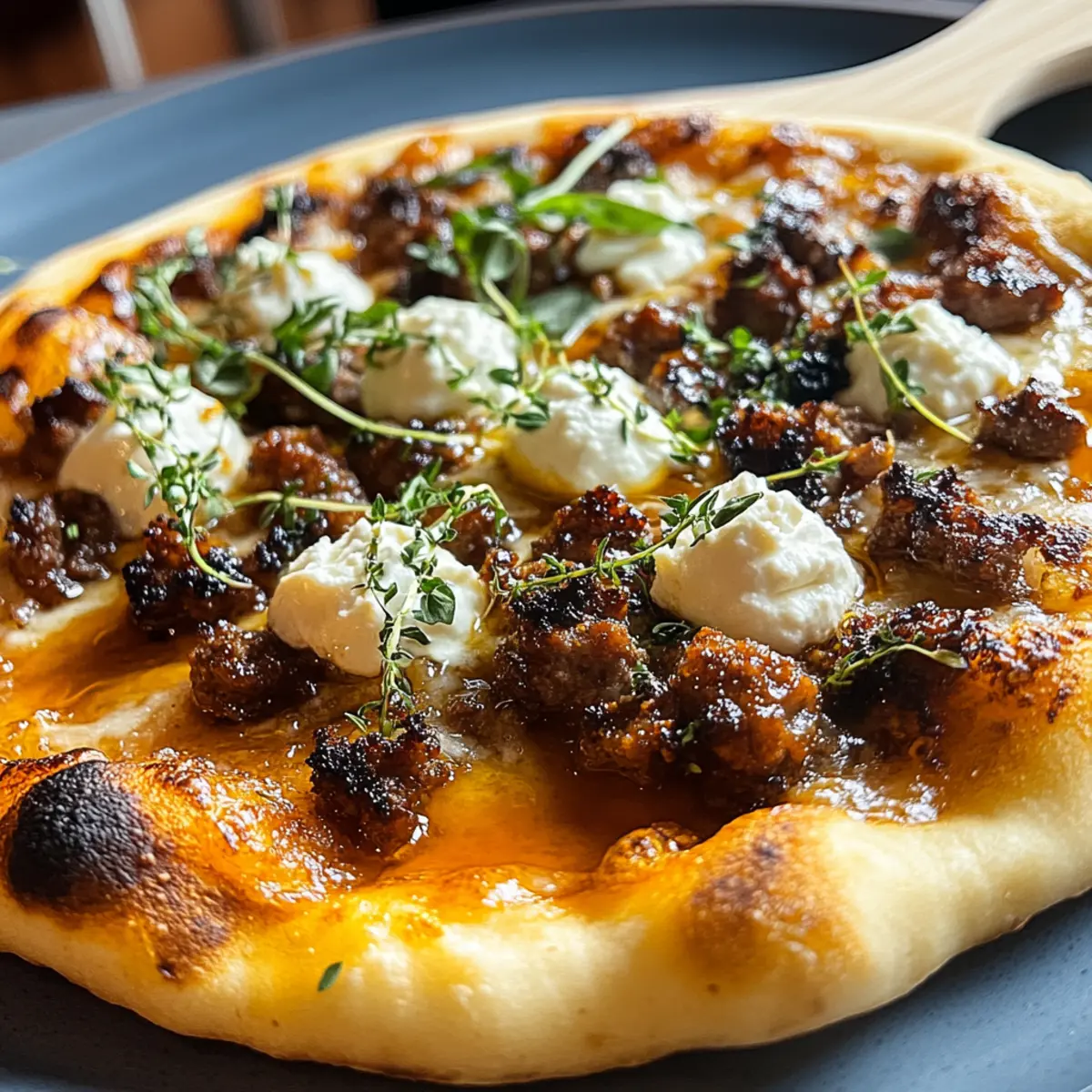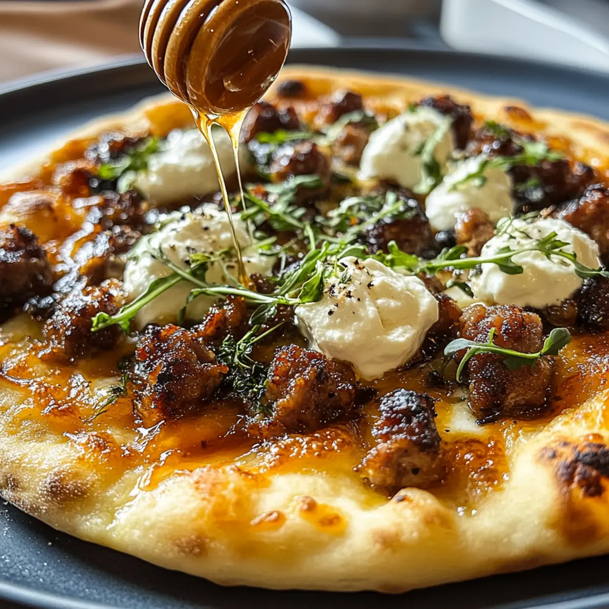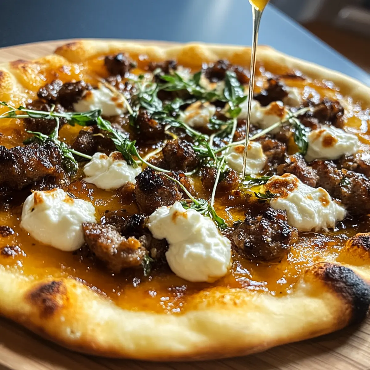 Jump to Recipe Print RecipeAs I was flipping through my favorite food magazine, one recipe caught my eye and sparked a sweet vision in my mind: Sausage Ricotta Honey Hot Pizza. This dish harmoniously marries the boldness of savory Italian sausage with the creaminess of ricotta, all topped off with a drizzle of sweet honey and a dash of hot sauce to ignite your taste buds. What makes this pizza truly special is its quick prep time—perfect for those busy weeknights or impromptu gatherings with friends. Plus, it’s easily customizable for various dietary needs, accommodating gluten-free or plant-based lifestyles without sacrificing flavor. So, are you ready to whip up a gourmet pizza that feels like it came straight from your favorite pizzeria, but in under 30 minutes? Let’s dive into this irresistible recipe! Why is this pizza a must-try? Flavor Explosion: The delightful combination of savory sausage, creamy ricotta, and a hint of sweet honey creates a unique taste that excites your palate. Quick & Easy: With just 27 minutes of prep time, this meal is perfect for busy weeknights or spontaneous gatherings, providing gourmet quality without the hassle. Versatile Base: Using naan flatbreads allows for endless customization—try different toppings like caramelized onions or go for a gluten-free version with cauliflower crust. Crowd-Pleaser: This dish appeals to all types of eaters, from traditionalists to those seeking plant-based alternatives, ensuring everyone will leave happy. Inspired Pairings: Complement this pizza masterpiece with a fresh garden salad or cocktails for an impressive dining experience—perfect for entertaining friends! Ingredients • Sausage Ricotta Honey Hot Pizza Ingredients For the Pizza Italian Sausage – Adds hearty, savory flavor; choose between mild or spicy for your preferred kick. Ricotta Cheese – Provides a creamy contrast; dollop on instead of spreading for delightful creamy bites. Shredded Mozzarella Cheese – Creates a gooey texture; about 2 cups ensures the perfect melty topping. Pizza Sauce – Serves as a flavorful base; opt for garlic and herb-infused for extra richness. Hot Honey Mixture – Blends sweetness and spice; mix 2 tablespoons of honey with hot sauce for a delicious drizzle. Stonefire Naan Flatbreads – The quick and sturdy base that eliminates the need for dough and bakes beautifully. Olive Oil – Brush on the flatbreads to enhance texture and prevent sogginess. For Serving Fresh Basil Leaves – Adds a fragrant finish; optional but elevates the pizza’s presentation and flavor. This inviting Sausage Ricotta Honey Hot Pizza is sure to impress, blending the best elements for a gathering or a cozy night in! Step‑by‑Step Instructions for Sausage Ricotta Honey Hot Pizza Step 1: Preheat the Oven Begin by preheating your oven to 450°F (230°C). This step ensures that your Sausage Ricotta Honey Hot Pizza will achieve that perfect, crispy crust. If you’re using a grill, set it to medium heat around 375°F. While the oven heats, gather your naan flatbreads and prepare the toppings. Step 2: Prepare the Naan Flatbreads Lightly brush both sides of the naan flatbreads with olive oil, ensuring an even coating. This will prevent the bread from becoming soggy during baking and give it a beautiful golden color. Place the oiled flatbreads on a baking sheet lined with parchment paper or directly onto the grill if you’re grilling. Step 3: Spread the Pizza Sauce Using a spoon or spatula, spread about 1/2 cup of pizza sauce evenly over the naan flatbreads, making sure to cover the entire surface but leaving a small edge for the crust. The sauce will serve as a flavorful base for your Sausage Ricotta Honey Hot Pizza, setting the stage for delicious melted cheese and toppings. Step 4: Add Shredded Mozzarella Generously sprinkle 2 cups of shredded mozzarella cheese over the pizza sauce, allowing for a nice layer of gooey goodness. Distributing the cheese evenly will ensure that each bite of your pizza is melty and satisfying. Make sure to cover all the sauce for maximum flavor fusion. Step 5: Layer the Italian Sausage Crumble the cooked Italian sausage evenly over the cheese, creating a savory topping for your pizza. If you prefer a bit of extra flavor, consider browning the sausage with fennel and garlic before adding it. This step enhances the richness of the Sausage Ricotta Honey Hot Pizza, giving it an irresistible taste. Step 6: Add Dollops of Ricotta Now, take your creamy ricotta cheese and dollop it across the pizza. Avoid spreading it out; the goal is to have pockets of ricotta that create delightful creamy bursts when you bite into your finished slice. The ricotta adds a luxurious texture and balances the savory notes of the sausage beautifully. Step 7: Season the Pizza Sprinkle kosher salt, cracked pepper, and crushed red pepper flakes over the toppings for added flavor. This simple seasoning step elevates your Sausage Ricotta Honey Hot Pizza, bringing out the fresh ingredients and enhancing your pizza’s overall profile. Step 8: Bake or Grill Place your assembled pizza in the preheated oven for 12 minutes, or grill it for 12-15 minutes until the crust is golden and the cheese is bubbling. Keep an eye on it to prevent burning; you want a beautifully crispy crust and perfectly melted cheese. Step 9: Prepare the Hot Honey Drizzle While the pizza bakes, mix 2 tablespoons of honey with your chosen hot sauce in a small bowl. This sweet and spicy drizzle will elevate the flavors of your Sausage Ricotta Honey Hot Pizza once it’s out of the oven, adding a delightful finishing touch that ties all the elements together. Step 10: Finish and Serve Once baked to perfection, remove the pizza from the oven and drizzle the hot honey mixture over the top. Optionally, garnish with fresh basil leaves for a pop of color and flavor. Slice your Sausage Ricotta Honey Hot Pizza and serve it warm, ready for friends and family to enjoy! Expert Tips for Sausa