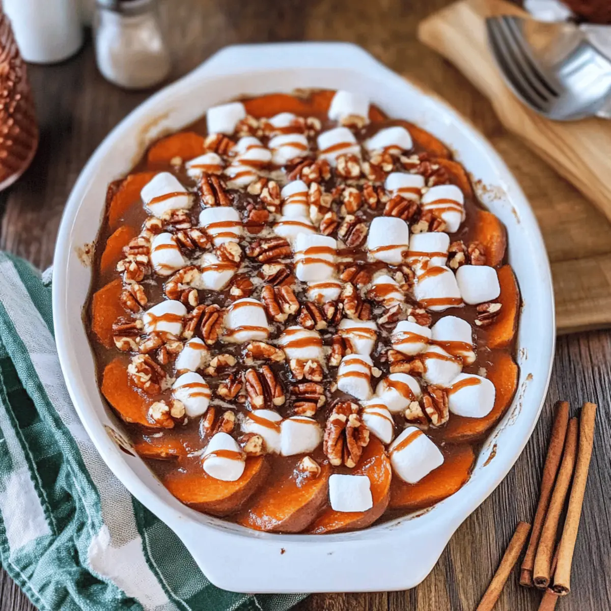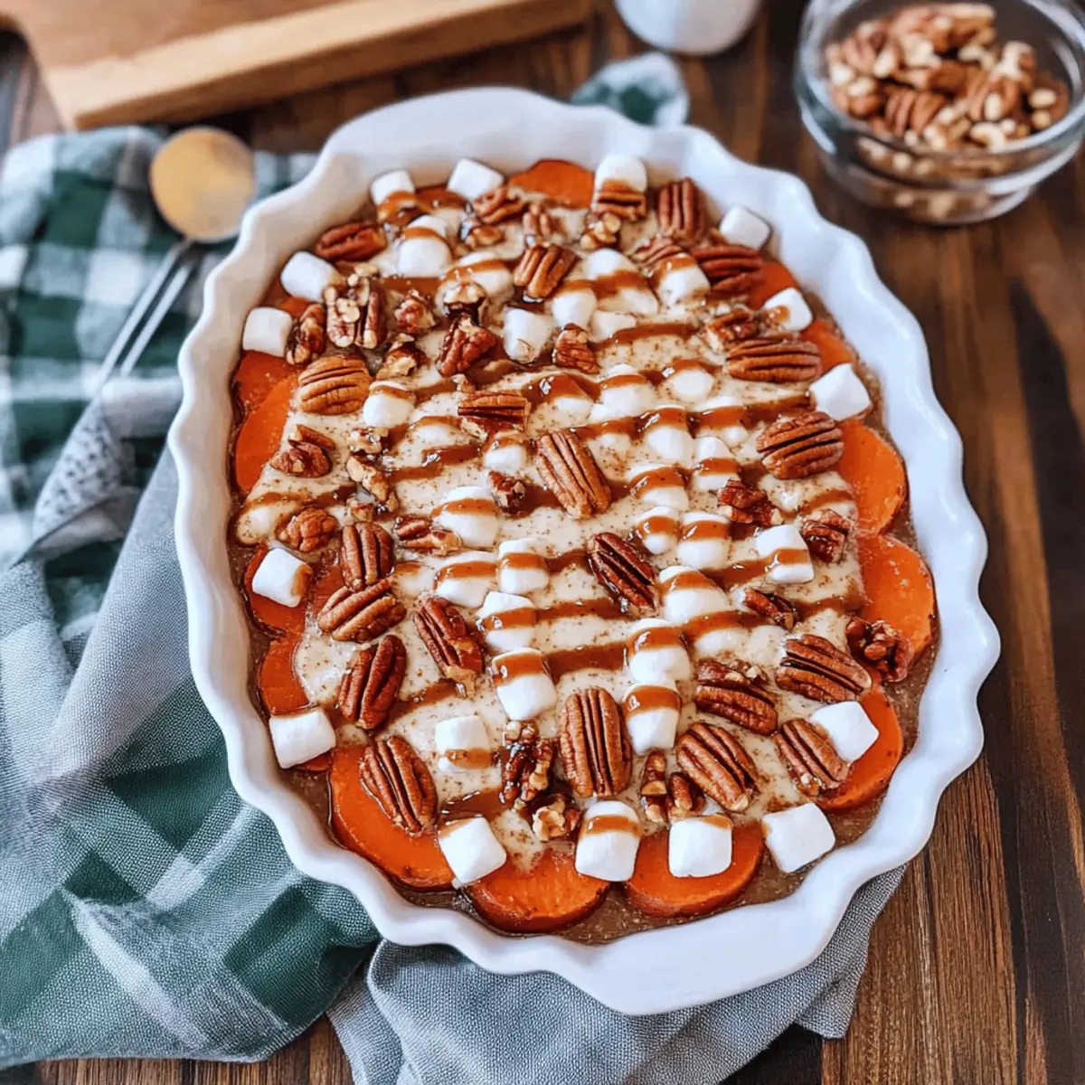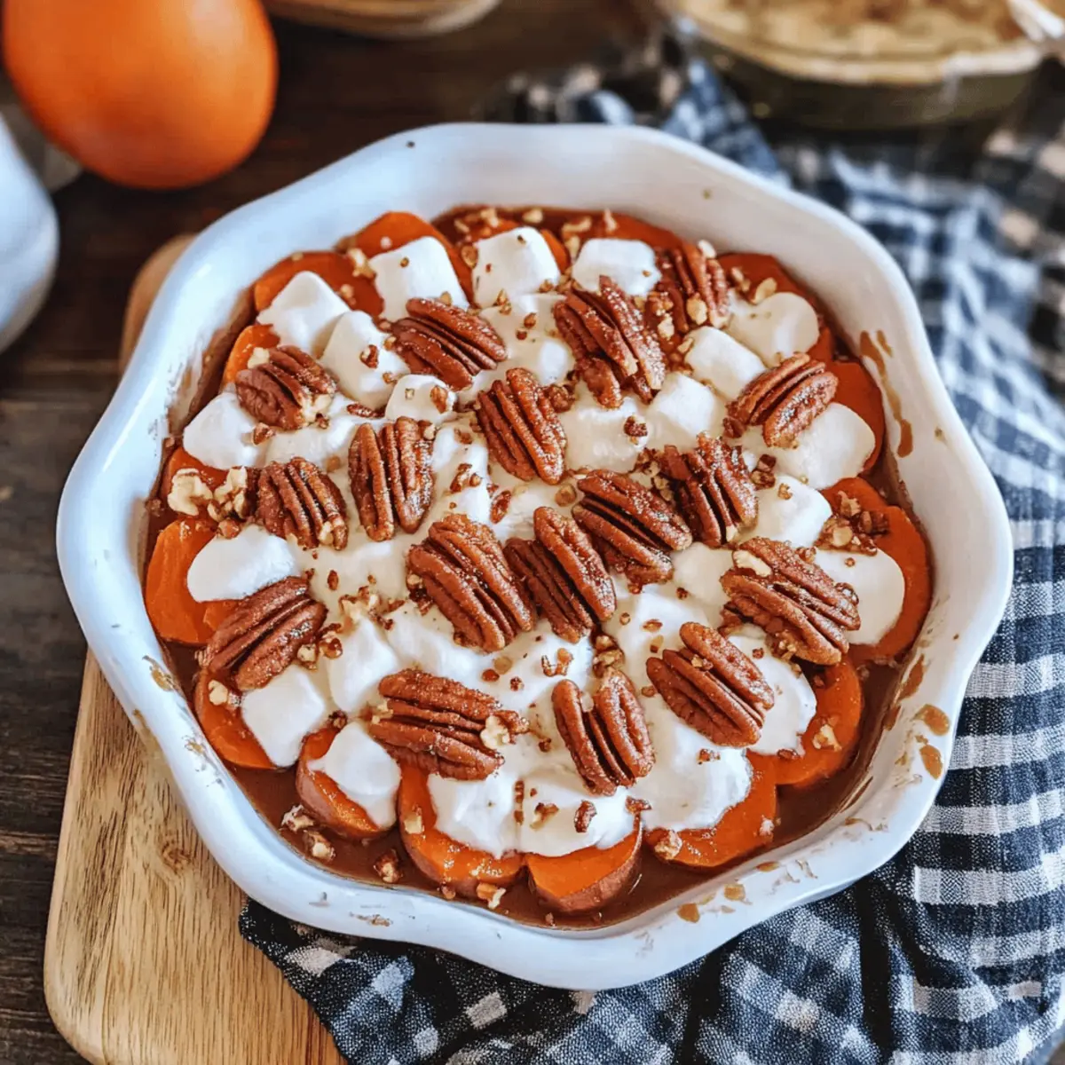 Jump to Recipe Print RecipeAs I pulled out the beautifully layered dish from the oven, the warm aroma of cinnamon and brown sugar wrapped around me like a cozy hug. These Scalloped Sweet Potatoes, with their tender medallions nestled in a rich sauce, are a beloved addition to my holiday table. Whether it’s Thanksgiving or Christmas, this recipe brings together not just flavors but memories, making it a classic side dish full of seasonal spirit. Not only is it a crowd-pleaser with its sweet marshmallow and crunchy pecan topping, but it also comes together surprisingly easily—perfect for helping you reclaim your evenings from fast food fatigue. So, if you’re ready to elevate your festive feasting, let’s dive into how to create these deliciously comforting Scalloped Sweet Potatoes that will leave your guests asking for seconds! What’s your favorite way to dress up sweet potatoes? What makes these scalloped sweet potatoes special? Delicious layers: Each bite reveals thin, tender medallions of sweet potatoes perfectly layered in a rich, buttery sauce. Irresistible topping: With gooey mini marshmallows and crunchy pecans, your taste buds will celebrate the sweet and nutty contrast. Effortless preparation: This easy-to-follow recipe requires minimal cooking skills, freeing up time for you to enjoy the festivities. Holiday essential: Perfect for Thanksgiving or Christmas, these Scalloped Sweet Potatoes bring warmth and cheer to any gathering, making them a must-have on your holiday table. Serve with ease: Pair it alongside classics like Garlic Butter Potatoes or Cheesy Ranch Potatoes for a memorable meal that truly shines! Scalloped Sweet Potatoes Ingredients • Ready to dive into this delicious recipe? For the Sweet Potato Layer Sweet Potatoes – Provide the base and natural sweetness for the dish. Use 5-6 medium sweet potatoes, peeled and cut into thin medallions. Unsalted Butter – Adds richness and flavor to the sauce. Substitute with salted butter but reduce added salt by ¼ teaspoon. Brown Sugar – Enhances sweetness and creates the sweet sauce. Light or dark brown sugar can be used, based on preference. Water – Helps create the sauce consistency. Use as needed for dissolving sugar and butter. Ground Cinnamon – Imparts warmth and sweetness. Essential for holiday flavor profiles. Ground Cloves – Adds a distinct spicy note that complements the sweetness. Can be substituted with allspice in a pinch. Ground Nutmeg – Provides a warm, nutty flavor. Use freshly grated nutmeg for a more intense flavor if available. Salt – Balances the sweetness and enhances flavor. Use sparingly if using salted butter. For the Topping Chopped Pecans – Offers crunch and a nutty flavor. Walnuts can be used as an alternative. Mini Marshmallows – Adds a sweet, gooey layer and festive touch. Add extra marshmallows if desired for a sweeter finish. Step‑by‑Step Instructions for Scalloped Sweet Potatoes Step 1: Preheat the Oven Begin by preheating your oven to 400°F (200°C). This initial step ensures that your Scalloped Sweet Potatoes will cook evenly and perfectly. Once the oven is hot, it will create a beautifully warm environment for the layers to blend and flavors to develop. Step 2: Prepare the Sweet Potatoes Peel and meticulously slice 5-6 medium sweet potatoes into thin medallions using a mandoline slicer. Aim for uniform thickness to ensure even cooking throughout the dish. As you slice, the vibrant orange of the sweet potatoes will brighten up your kitchen, setting the stage for a delicious meal. Step 3: Make the Sweet Sauce In a small saucepan, combine a generous amount of unsalted butter, brown sugar, and a splash of water along with your spices—ground cinnamon, nutmeg, cloves, and salt. Heat over medium, stirring until the butter melts and everything is well combined, about 5 minutes. The rich aroma will fill the air, highlighting the festive spirit of your scalloped dish. Step 4: Layer the Sweet Potatoes In a baking dish, arrange half of the sweet potato medallions in an overlapping pattern. Once you have the first layer laid out, brush about three-quarters of your delicious sauce over the top. This will infuse the medallions with flavor while they bake, making each bite a sweet indulgence. Step 5: Bake the Covered Dish Cover the baking dish tightly with foil and place it in the preheated oven. Bake for 45-50 minutes, or until the sweet potatoes are tender when pierced with a fork. The foil helps to trap steam, allowing the sweet potatoes to soften beautifully, creating a scrumptious base for your Scalloped Sweet Potatoes. Step 6: Add the Final Touches Once the sweet potatoes are tender, carefully remove the foil and drizzle the remaining sauce over the top. Sprinkle with chopped pecans and mini marshmallows for that classic sweet topping. This colorful contrast not only enhances the flavor but makes the dish visually appealing for serving. Step 7: Broil to Perfection Switch your oven setting to broil and return the dish to the oven for another 1-2 minutes. Watch closely as the marshmallows turn golden and toasty, creating that irresistible gooey layer. This final broiling step adds an exciting visual texture and enhances the overall flavor profile of your Scalloped Sweet Potatoes. Step 8: Let it Rest Once broiled to perfection, remove the dish from the oven and let it cool for 10-15 minutes. This resting time allows the flavors to settle and makes it easier to serve. The warm, inviting aroma of the Scalloped Sweet Potatoes will entice everyone at the table, ready for a memorable serving. What to Serve with Best Scalloped Sweet Potatoes? Imagine your table adorned with cozy, comforting dishes that make everyone feel right at home during the holidays. Spiral Ham: The savory, smoky flavor of a glazed ham beautifully contrasts the sweet notes of the scalloped sweet potatoes, creating a balanced meal. Roasted Turkey: A classic pairing! The juicy turkey alongside the creamy swee