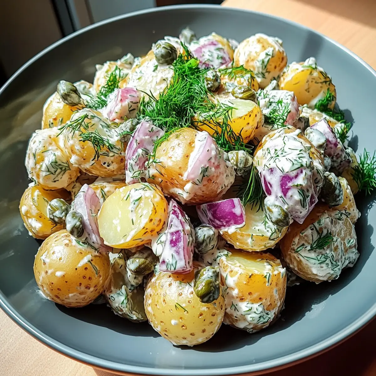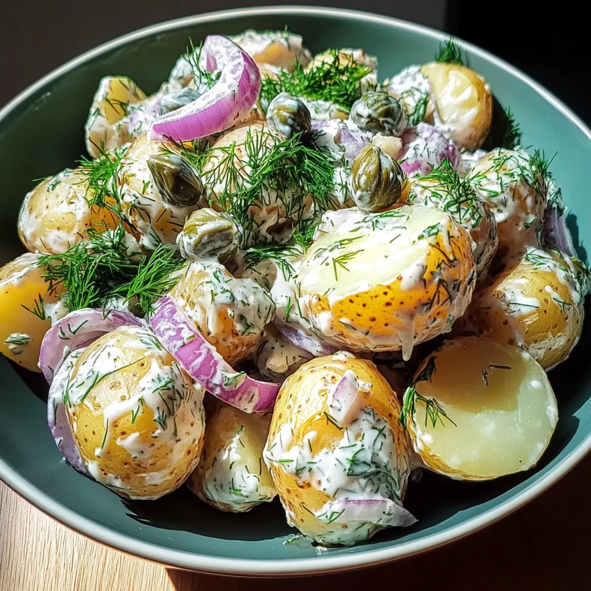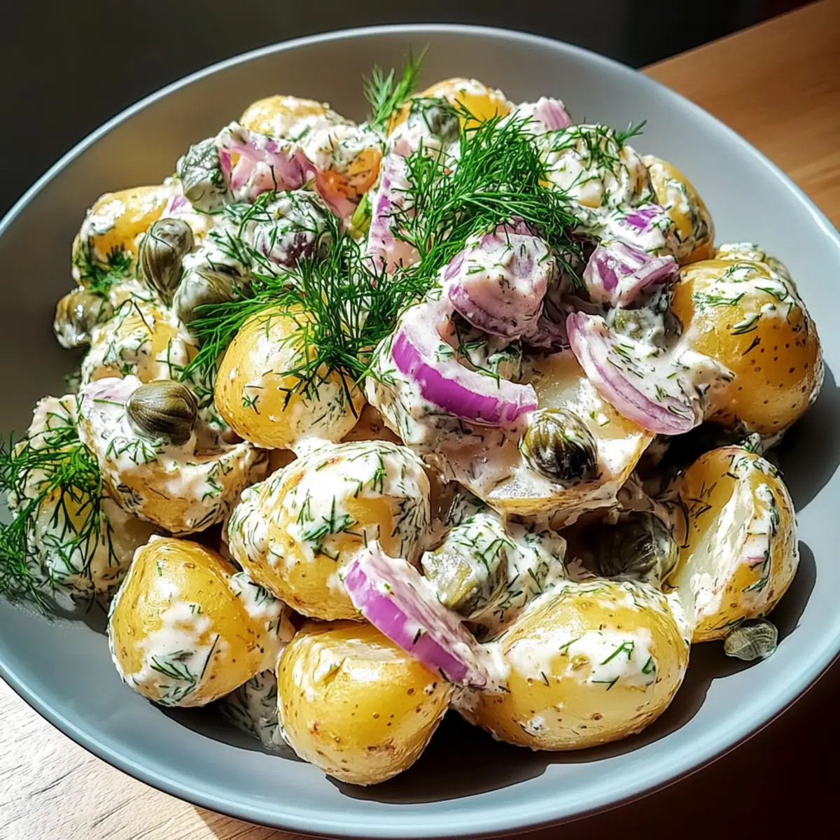 Jump to Recipe Print RecipeAs I was savoring the last vibrant bites of summer, I stumbled upon my new favorite dish: Scandinavian Dill Potato Salad. It’s like a warm hug from the garden, with tender new potatoes mingling playfully in a creamy dressing that dances with the tang of apple cider vinegar and the zest of Dijon mustard. Fresh dill brings a burst of herbaceous delight, while crispy red onion adds just the right crunch. This potato salad isn’t just easy to whip up; it’s also a crowd-pleaser perfect for everything from casual picnics to elegant barbecues. If you’re eager to elevate your summer gatherings with a light, refreshing side, you’ll adore making and enjoying this Scandinavian twist on a classic. Are you ready to discover how simple and satisfying homemade can be? Why is this potato salad a must-try? Freshness: The combination of tender new potatoes and vibrant dill creates a refreshing summer vibe. Easy Preparation: With beginner-friendly steps, you’ll have the perfect side ready in no time! Crowd-Pleaser: Perfect for picnics, barbecues, and family gatherings—everyone will want a second helping. Versatile Options: Feel free to mix in your favorite ingredients, like diced cucumbers or even smoked salmon for a uniquely Scandinavian touch. Creamy Bliss: The creamy dressing, with a hint of tang, is a delightful contrast to the crunchy red onions, making each bite a joy. Elevate your next gathering with this Scandinavian Dill Potato Salad and pair it with a refreshing Summer Berry Salad for a vibrant meal! Scandinavian Dill Potato Salad Ingredients For the Salad • Small New Potatoes – The star of this dish, providing a tender texture that holds its shape beautifully. • Fresh Dill – Adds an anise-like freshness that truly elevates the flavor; dried dill can be used, but the taste will be milder. • Red Onion – Offers a crisp bite and mild sweetness; substitute with green onions for a softer flavor if preferred. • Capers – Provide delightful bursts of briny flavor; can be omitted or replaced with olives for a different twist. For the Creamy Dressing • Sour Cream – Contributes tanginess and creaminess; opt for low-fat or Greek yogurt for a lighter version. • Mayonnaise – Provides richness and helps emulsify the dressing; light mayonnaise is a good alternative for a lighter dish. • Apple Cider Vinegar – Introduces a tangy brightness to the dressing; no substitutes recommended for the best flavor. • Dijon Mustard – Deepens the dressing’s flavor and helps stabilize it; yellow mustard can be a quick substitute in a pinch. • Salt & Black Pepper – Essential for bringing all the flavors together; adjust to taste for the perfect seasoning. Enjoy making this Scandinavian Dill Potato Salad that brings a refreshing twist to any summertime gathering! Step‑by‑Step Instructions for Scandinavian Dill Potato Salad Step 1: Prepare the Potatoes Start by washing the small new potatoes thoroughly under cold running water, then pat them dry with a clean dish towel. Cut each potato into bite-sized pieces, leaving the skins on to retain texture and flavor. The key here is to ensure uniform sizes for even cooking. Step 2: Season and Boil Place the cut potatoes in a large pot and cover them with cold water, adding a generous pinch of salt. Bring the water to a rolling boil over medium-high heat, then reduce to a gentle simmer. Cook the potatoes for about 10-15 minutes, until they are tender when pierced but still hold their shape. Step 3: Make the Dressing While the potatoes are cooking, prepare the creamy dressing. In a mixing bowl, combine sour cream, mayonnaise, apple cider vinegar, and Dijon mustard. Whisk together until smooth and well blended. This will create a rich, tangy dressing that complements the Scandinavian Dill Potato Salad beautifully. Step 4: Season the Dressing Taste the dressing and season it with salt and freshly cracked black pepper. Adjust the flavors to your liking, ensuring it has a nice balance of creaminess and tanginess. This adjustment will elevate the dressing, enhancing the overall taste of the potato salad. Step 5: Cool and Combine Once the potatoes are cooked, drain them in a colander and allow them to cool slightly. In a large mixing bowl, combine the warm potatoes with freshly chopped dill, finely diced red onion, and capers. Gently fold these ingredients together to maintain the potatoes’ shape before incorporating the dressing. Step 6: Chill Pour the creamy dressing over the potato mixture and carefully fold it in until everything is evenly coated. Refrigerate the salad for at least 30 minutes, allowing the flavors to meld together beautifully. This chilling step enhances the taste, making your Scandinavian Dill Potato Salad even more delightful. Step 7: Final Taste Adjustment Right before serving, give the potato salad a gentle stir and taste it again. You may want to add a final sprinkle of salt, pepper, or additional dill to brighten the flavors. This last-minute adjustment ensures your Scandinavian Dill Potato Salad is perfectly seasoned and ready to impress your guests. What to Serve with Scandinavian Dill Potato Salad Create a delightful summer feast with these perfect pairings that elevate your meal experience. Grilled Chicken Skewers: Tender, smoky chicken complements the creamy salad beautifully, offering a satisfying contrast of flavors and textures. Fresh Cucumber Salad: With its cool, crisp bites and tangy vinaigrette, this refreshing salad adds a light and hydrating touch to your meal. Raspberry Lemonade: A thirst-quenching drink that combines sweetness and tartness, perfectly balancing the flavors in the potato salad. Herbed Flatbread: Chewy and aromatic, flatbread brushed with garlic herb butter makes for a delicious vessel to scoop up the salad. Roasted Asparagus: With its tender crunch and earthy flavors, roasted asparagus adds a vibrant color and nutty taste that complements the potatoes nicely